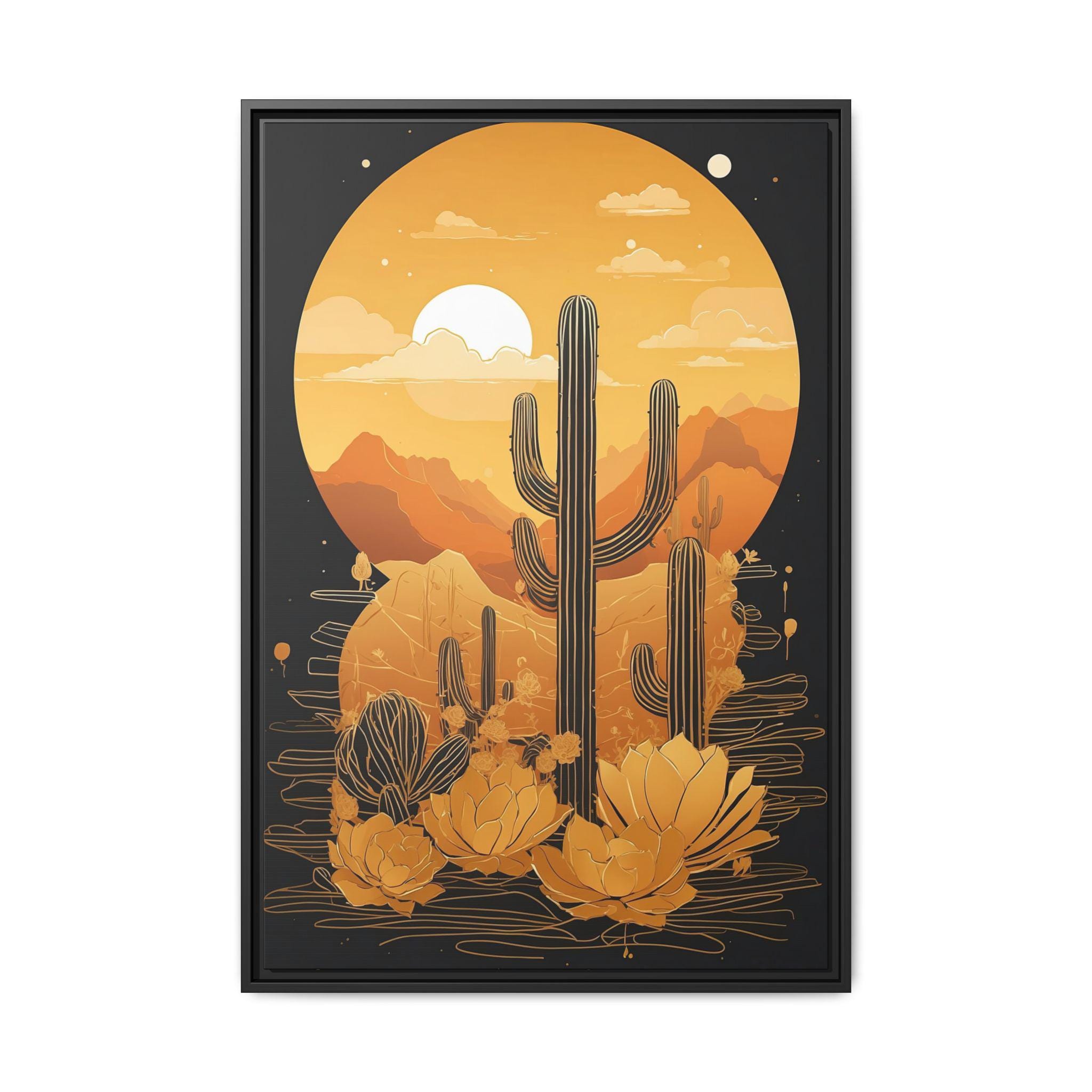 "Golden Sun Cactus" combines clean minimalist cactus line art with a radiant golden sun rising in the background. The simple desert-inspired composition balances warmth and modern design, bringing together geometric precision and organic botanical form.