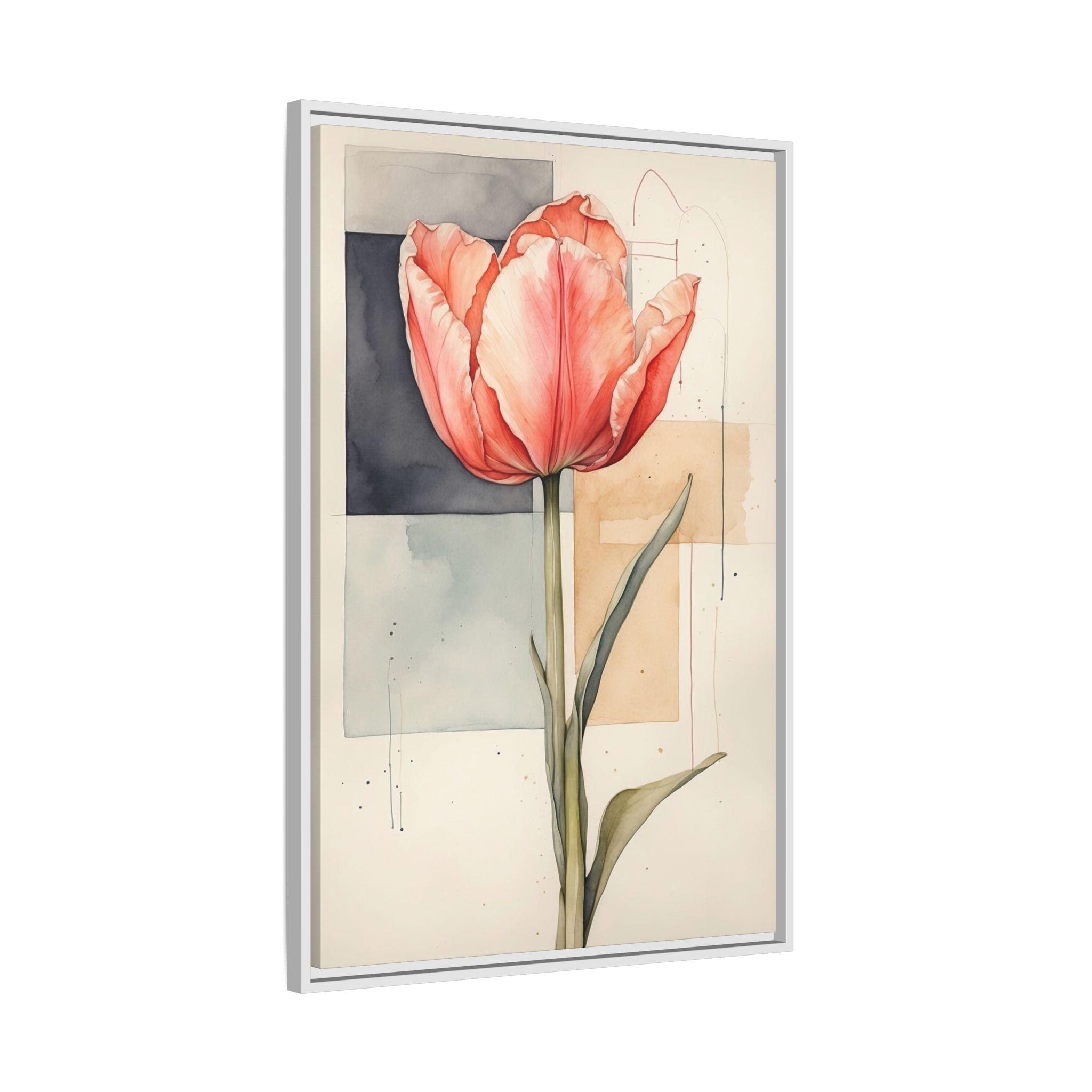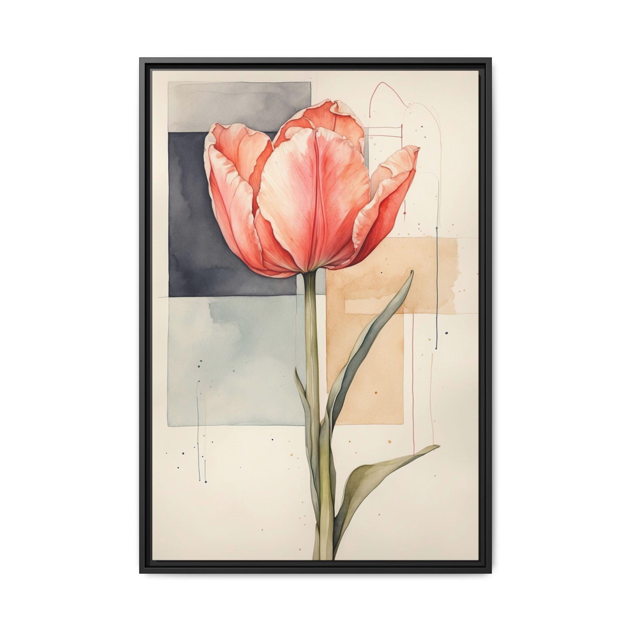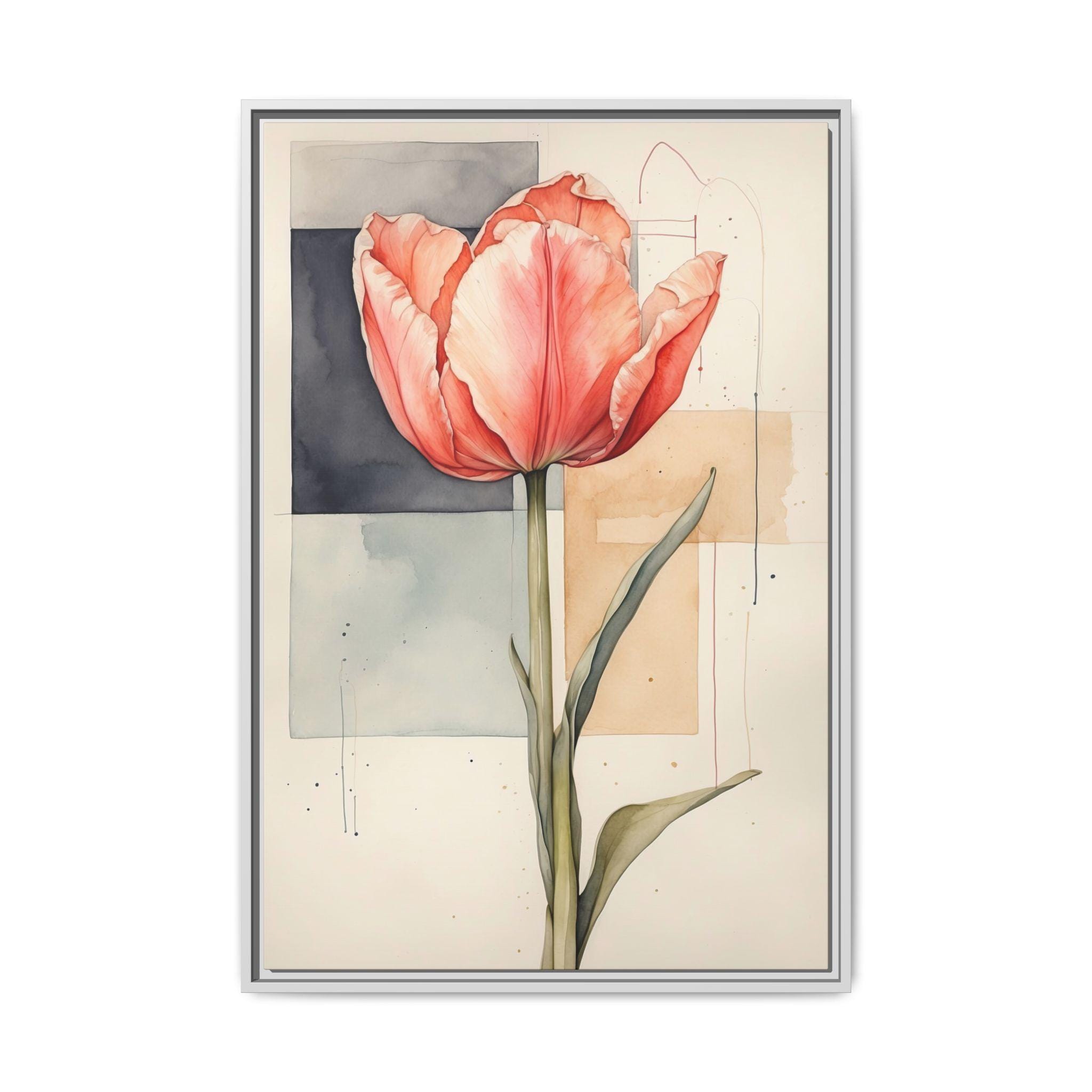 "Tulip Geometry" pairs a delicate continuous line tulip drawing with soft geometric beige squares and subtle watercolor textures. The balanced composition merges organic botanical elegance with modern design, creating a refined and serene visual experience.