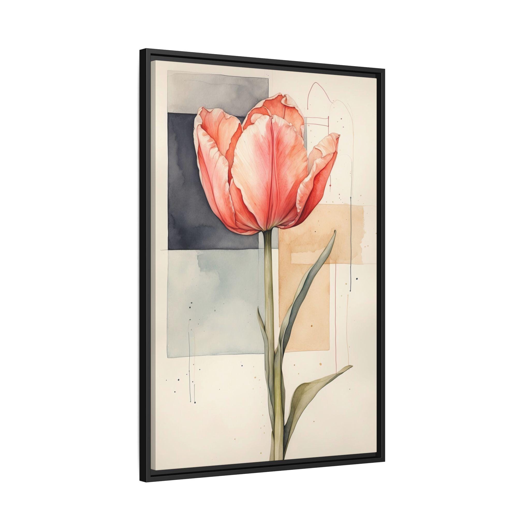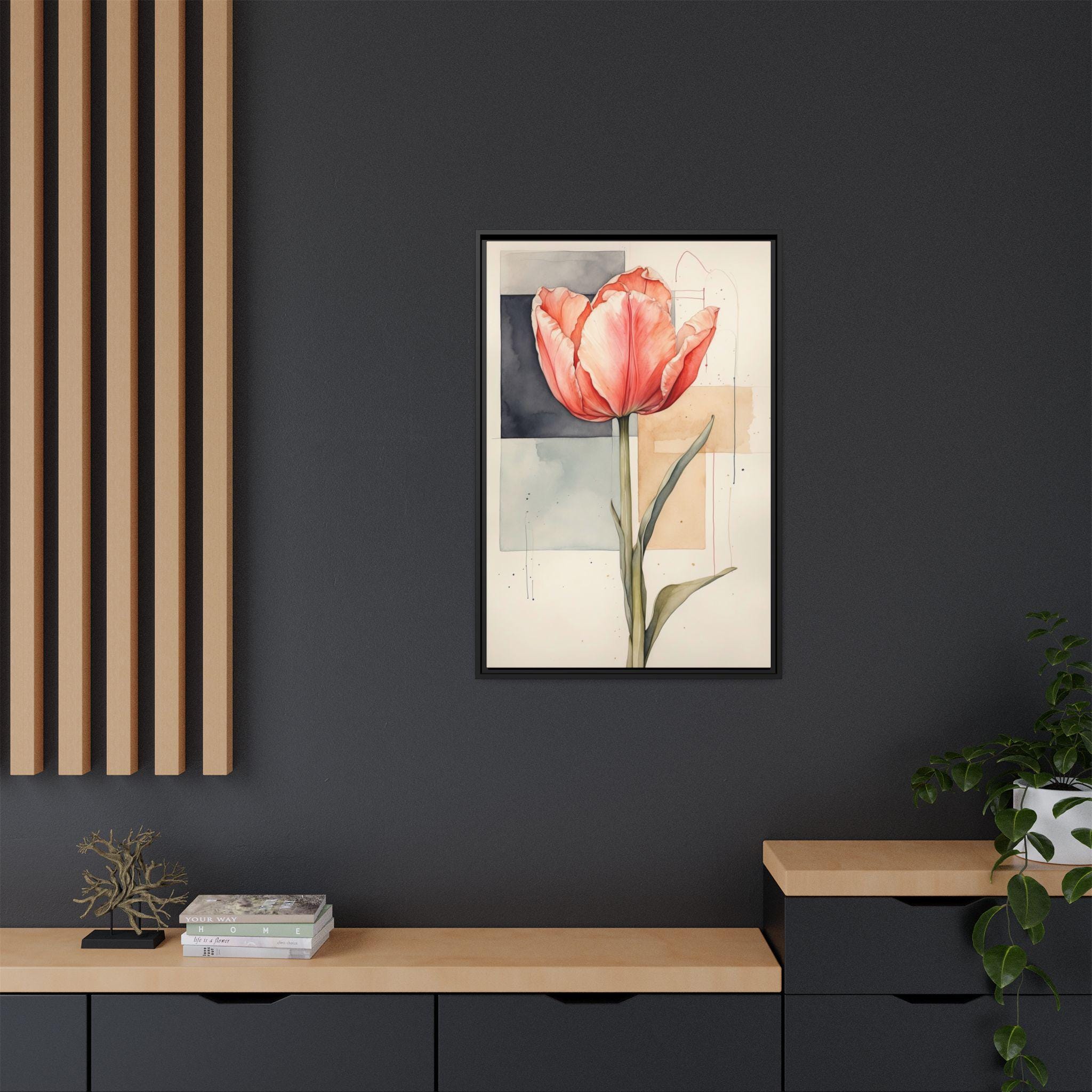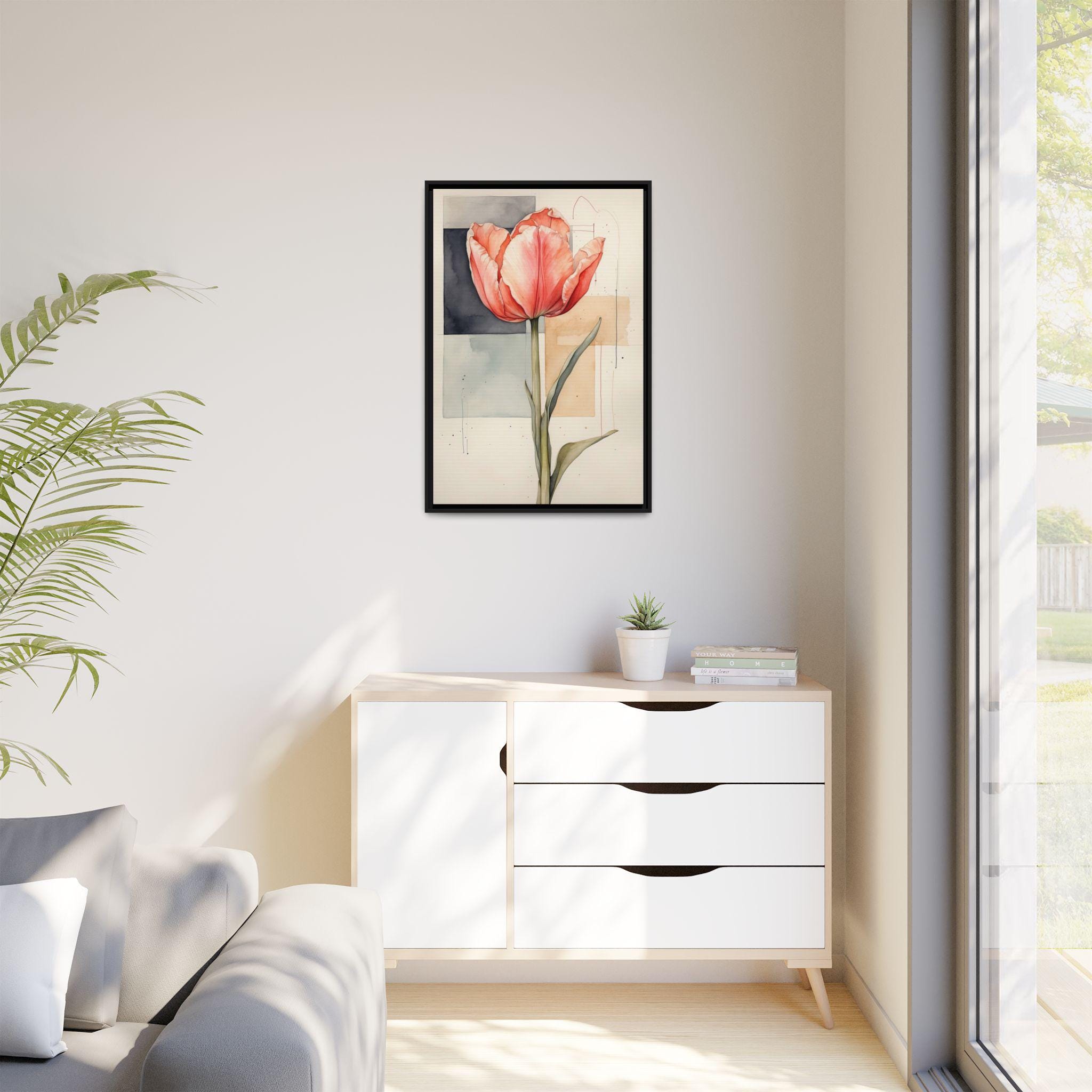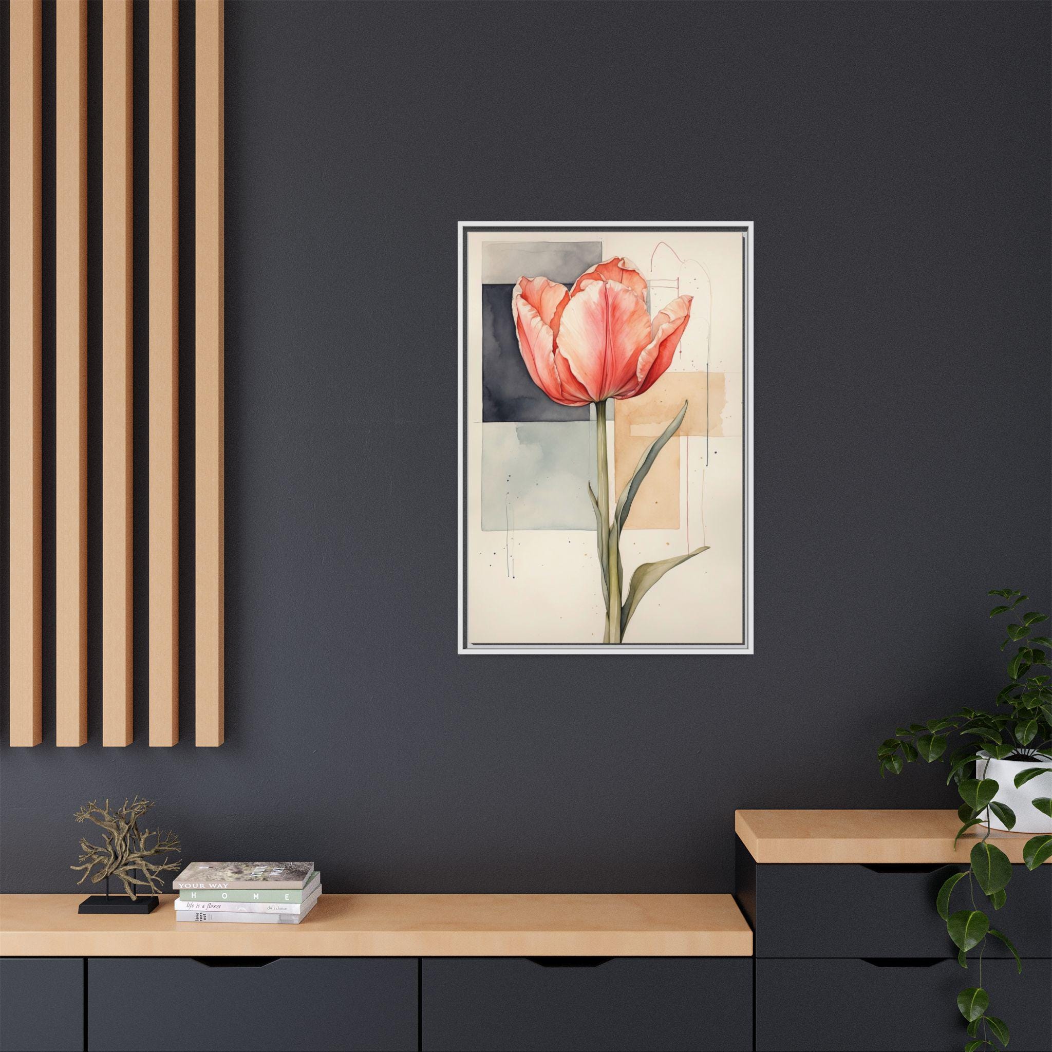 "Tulip Geometry" pairs a delicate continuous line tulip drawing with soft geometric beige squares and subtle watercolor textures. The balanced composition merges organic botanical elegance with modern design, creating a refined and serene visual experience.