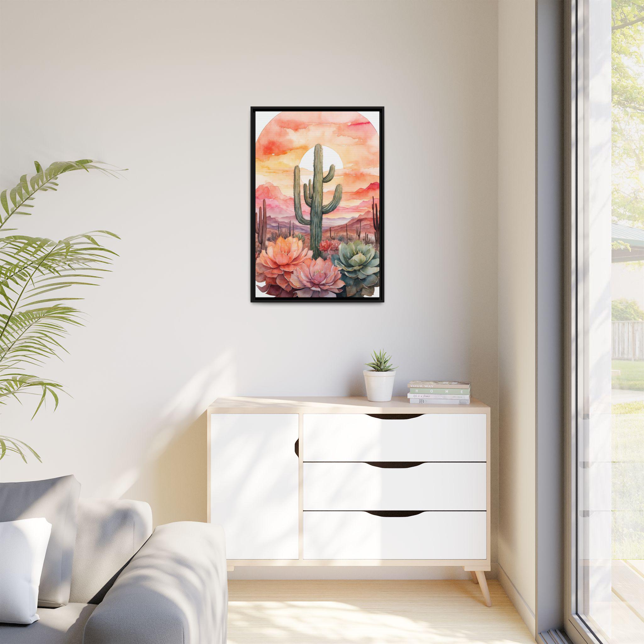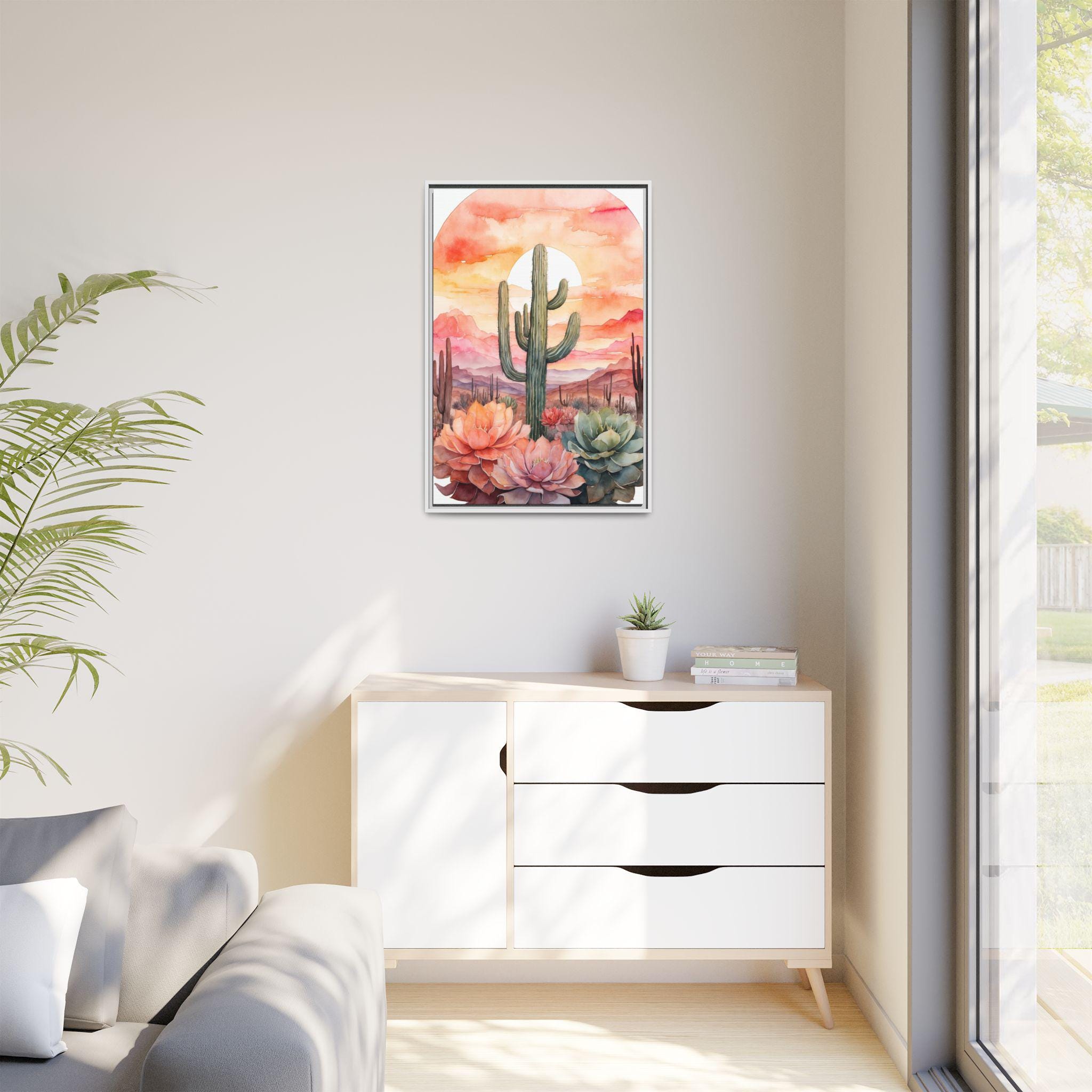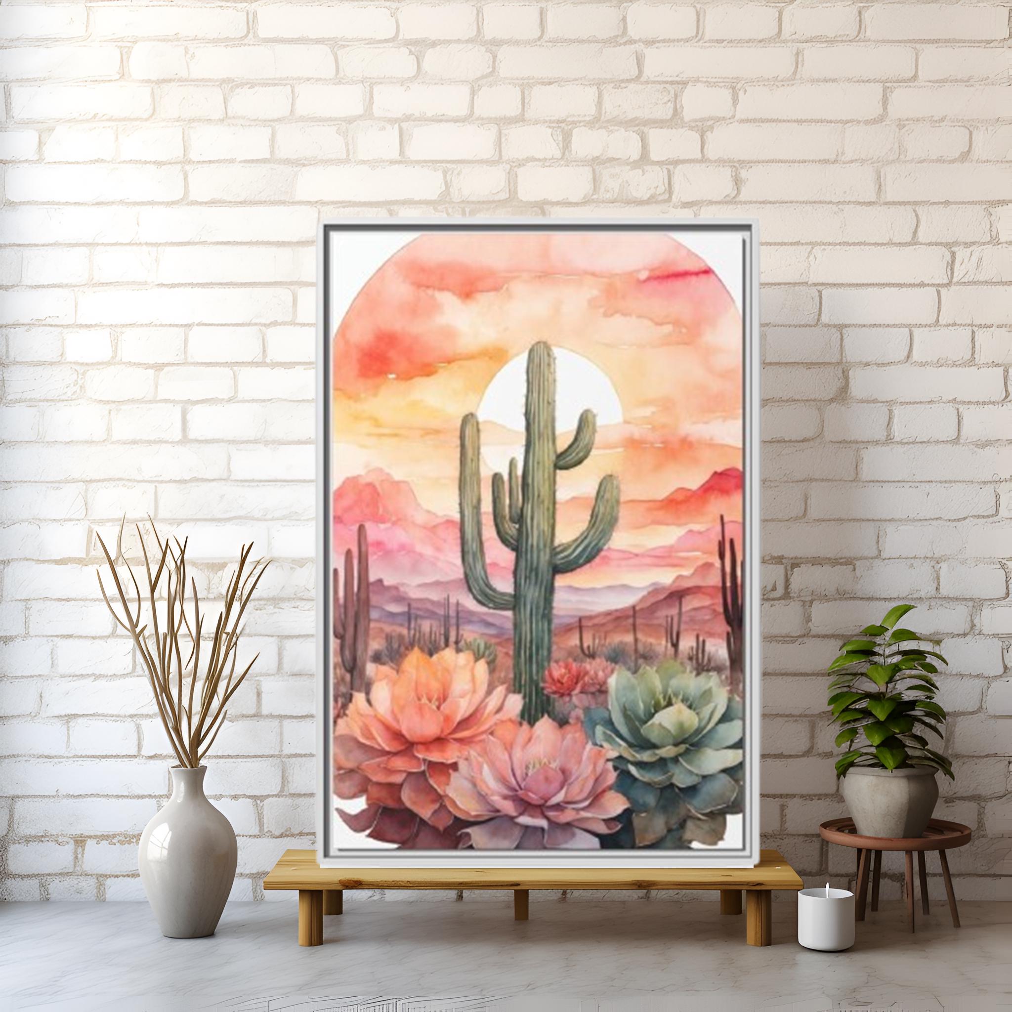 This artwork is perfect for creating a serene and inviting atmosphere in living rooms, bedrooms, or offices. Its versatile palette and modern botanical design make it an easy match for a variety of interior styles, while the cactus motif adds a touch of contemporary desert charm.