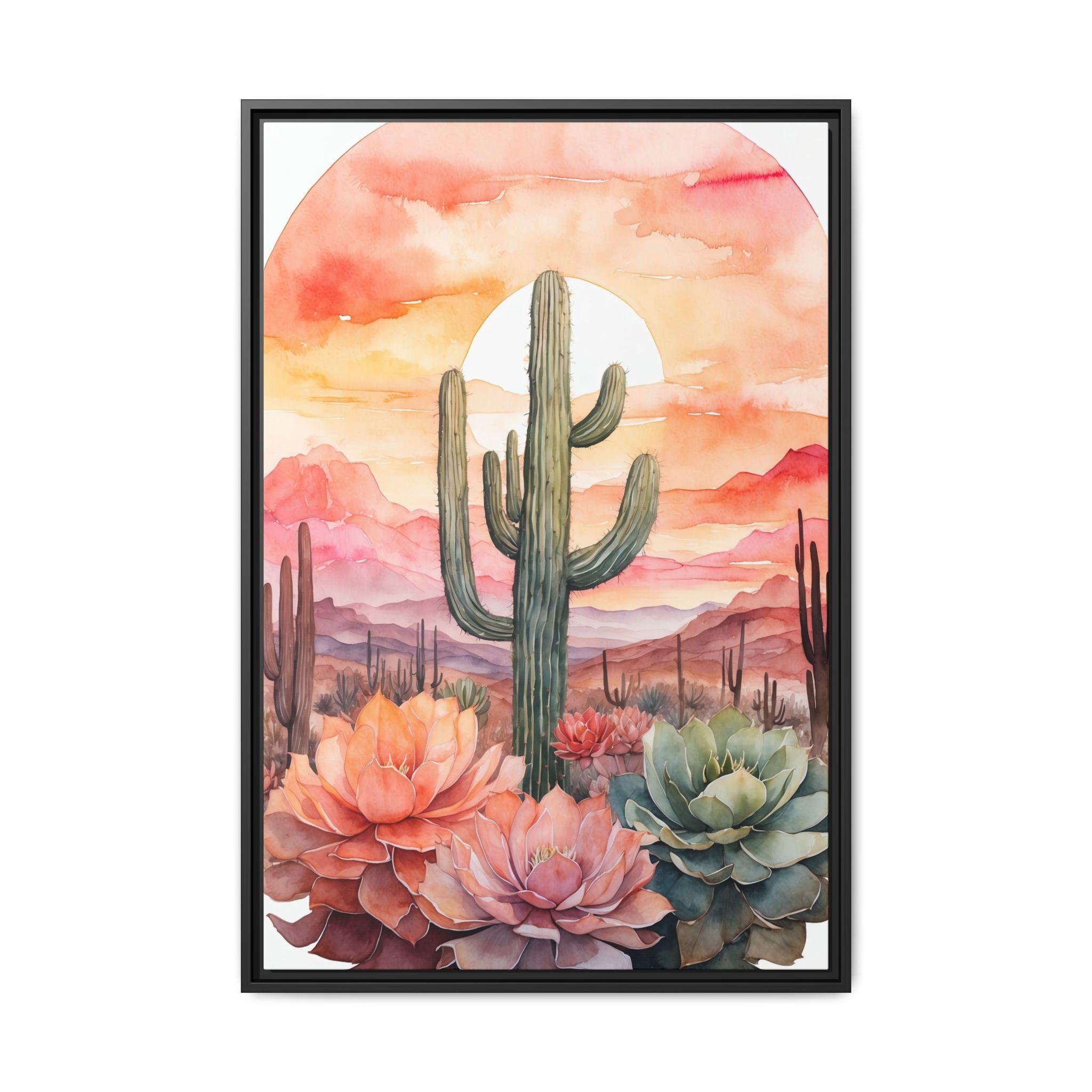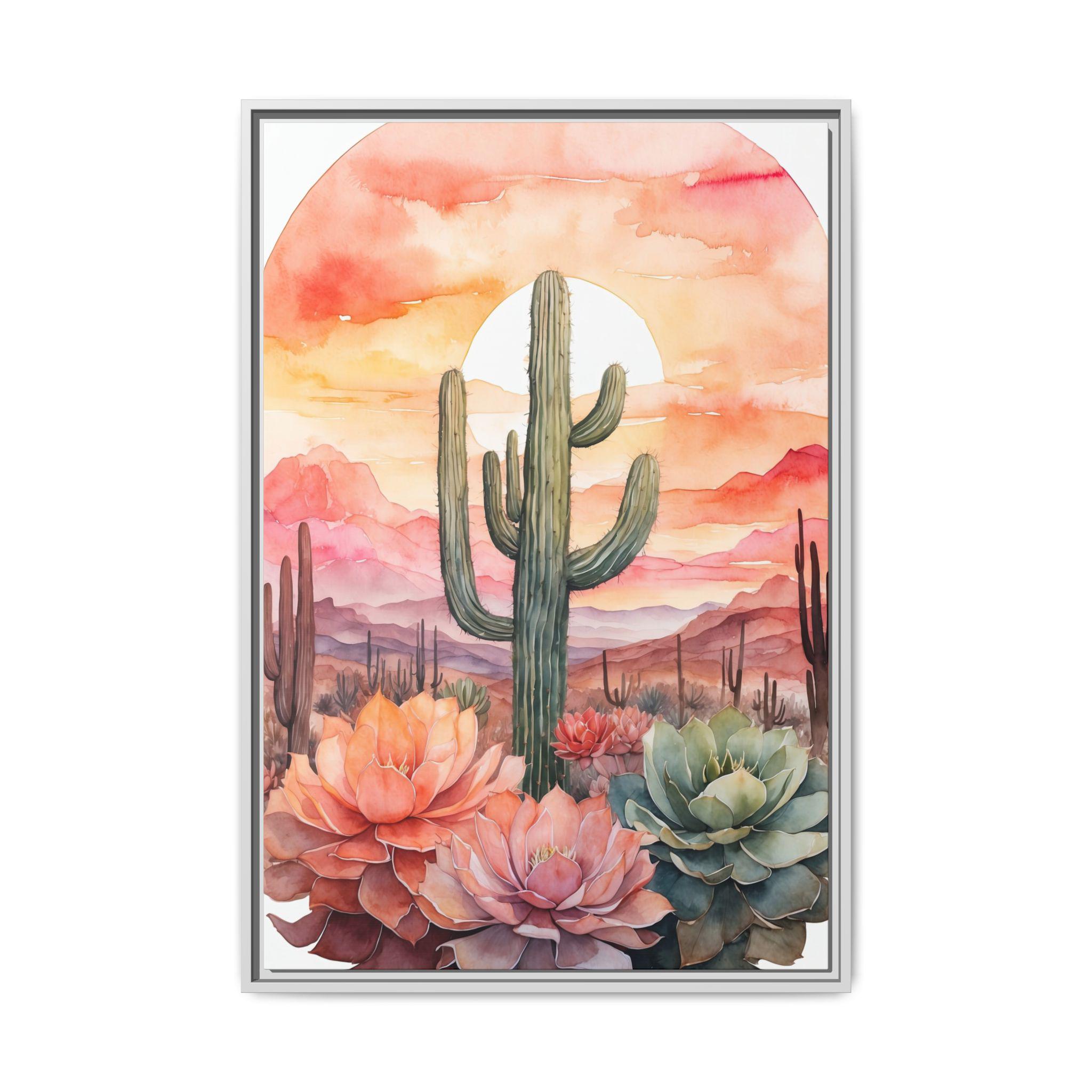 "Sunset Dreams" features a soft gradient watercolor wash in warm sunset tones, overlaid with delicate cactus outlines. The dreamy blend of color and form captures the quiet beauty of desert landscapes, bringing a sense of calm and warmth to any space.