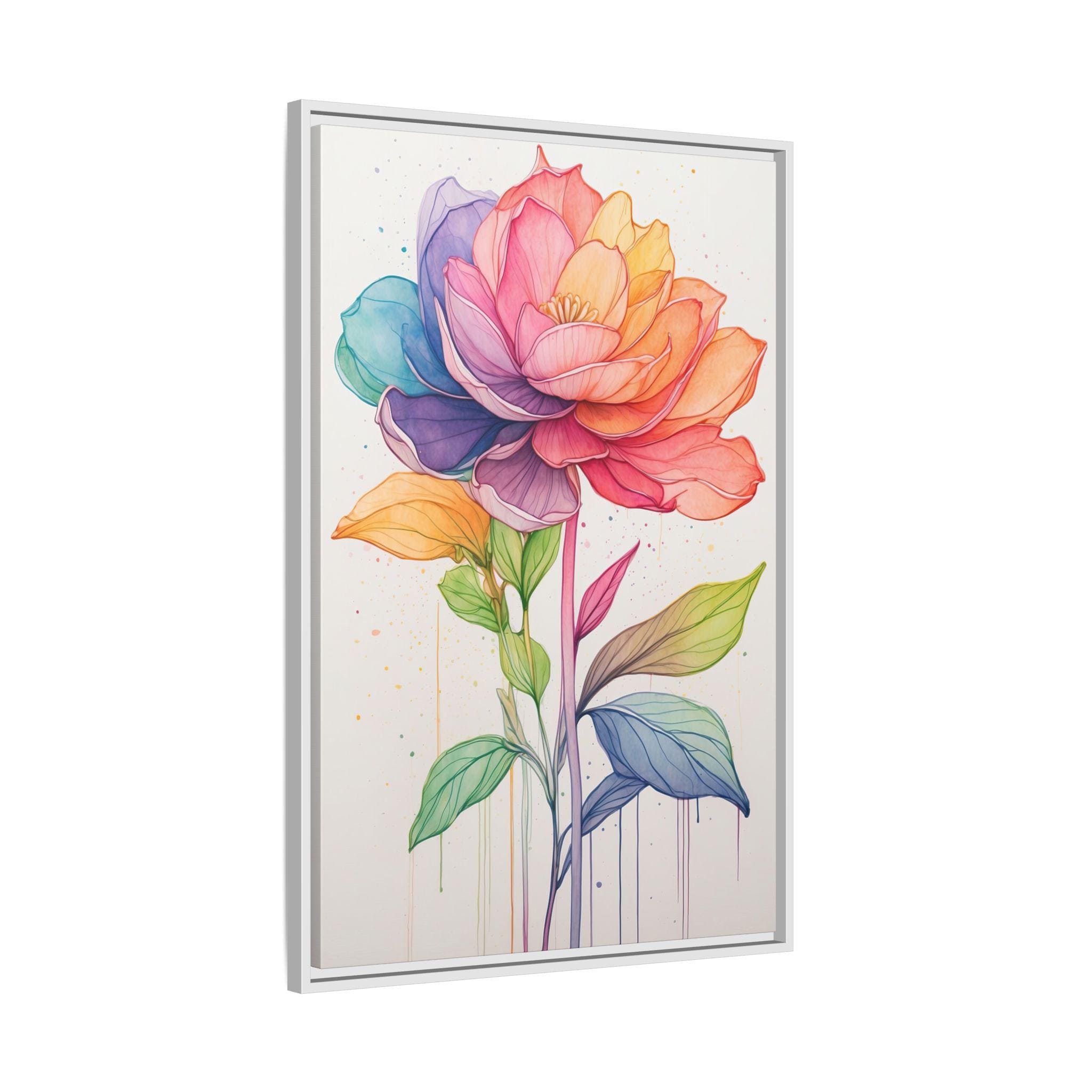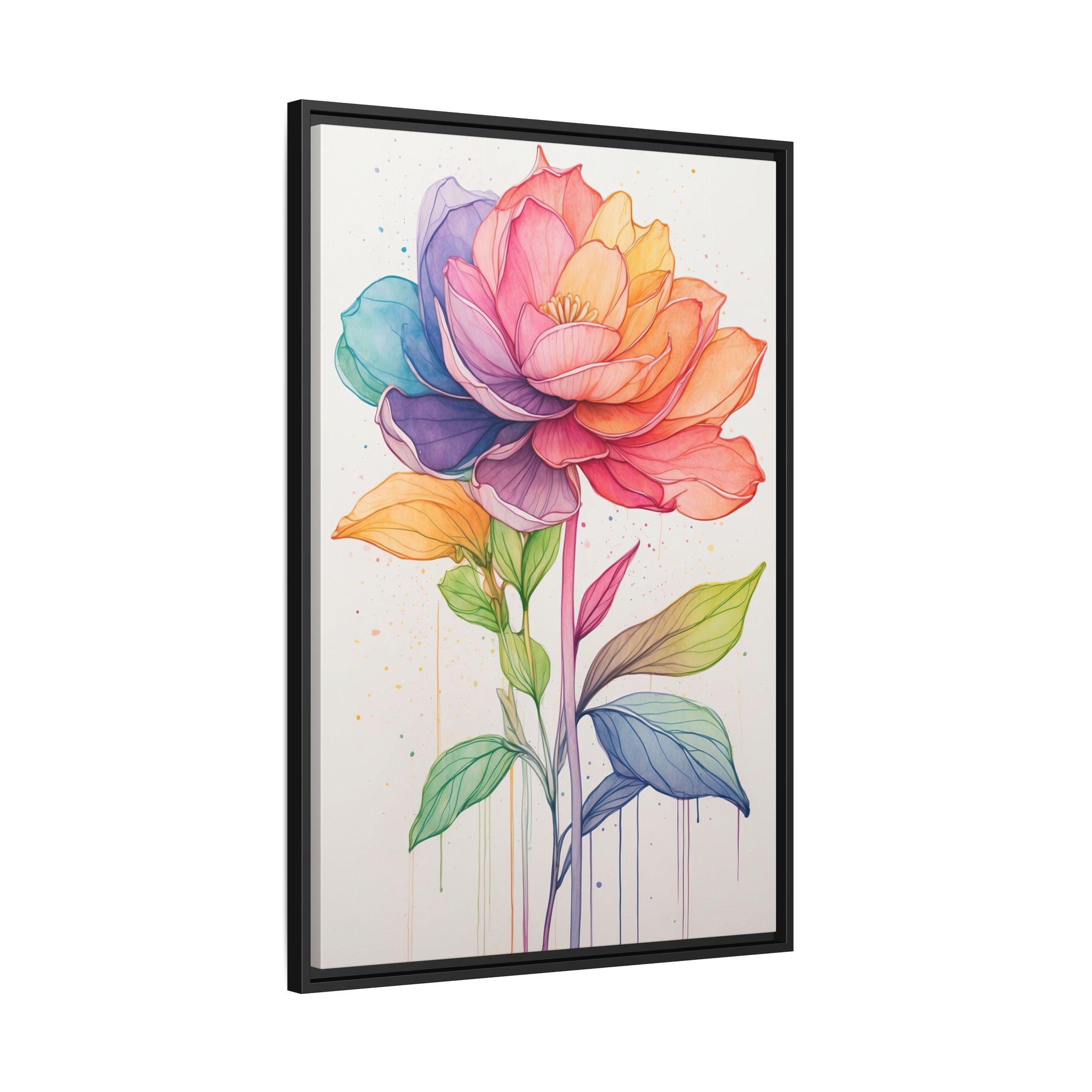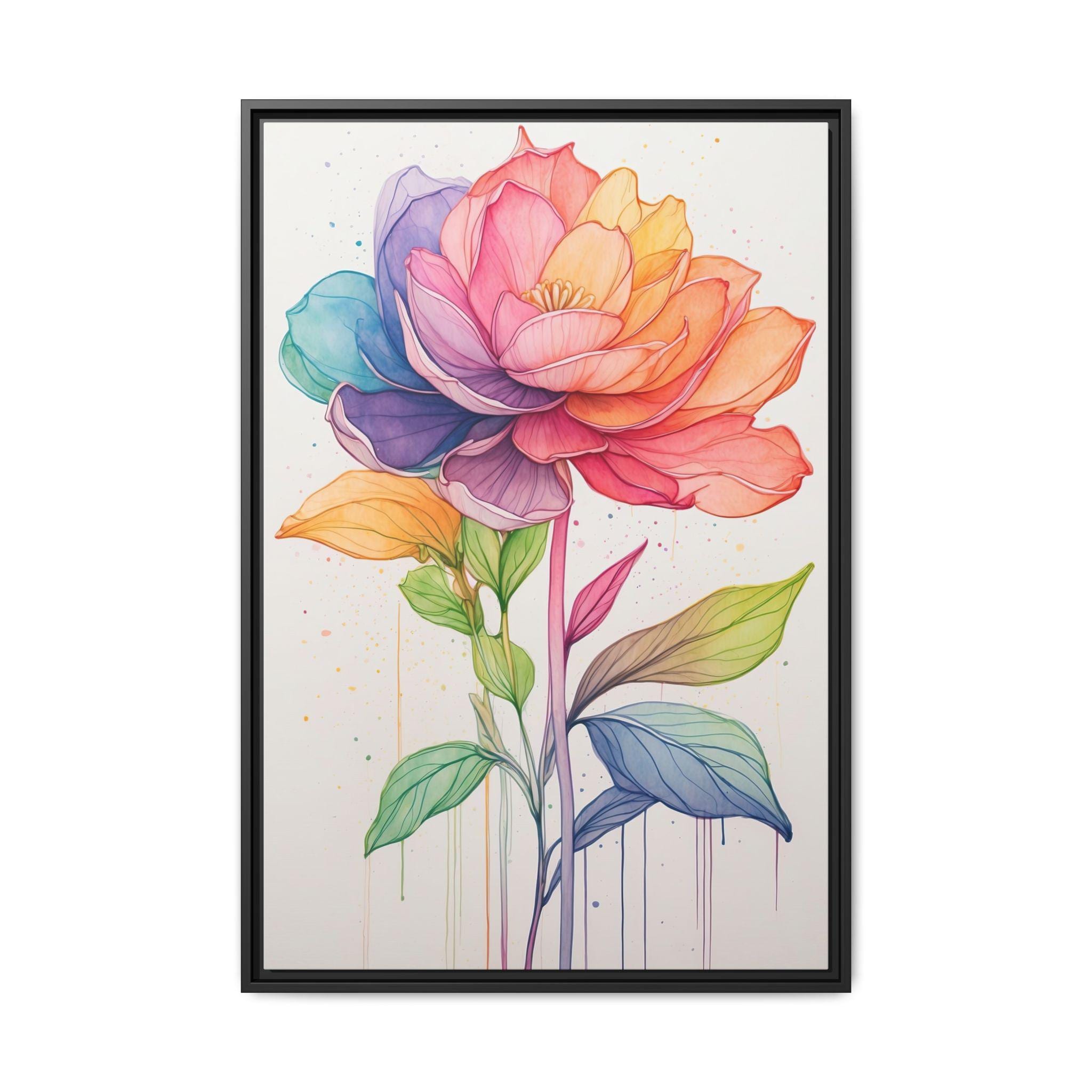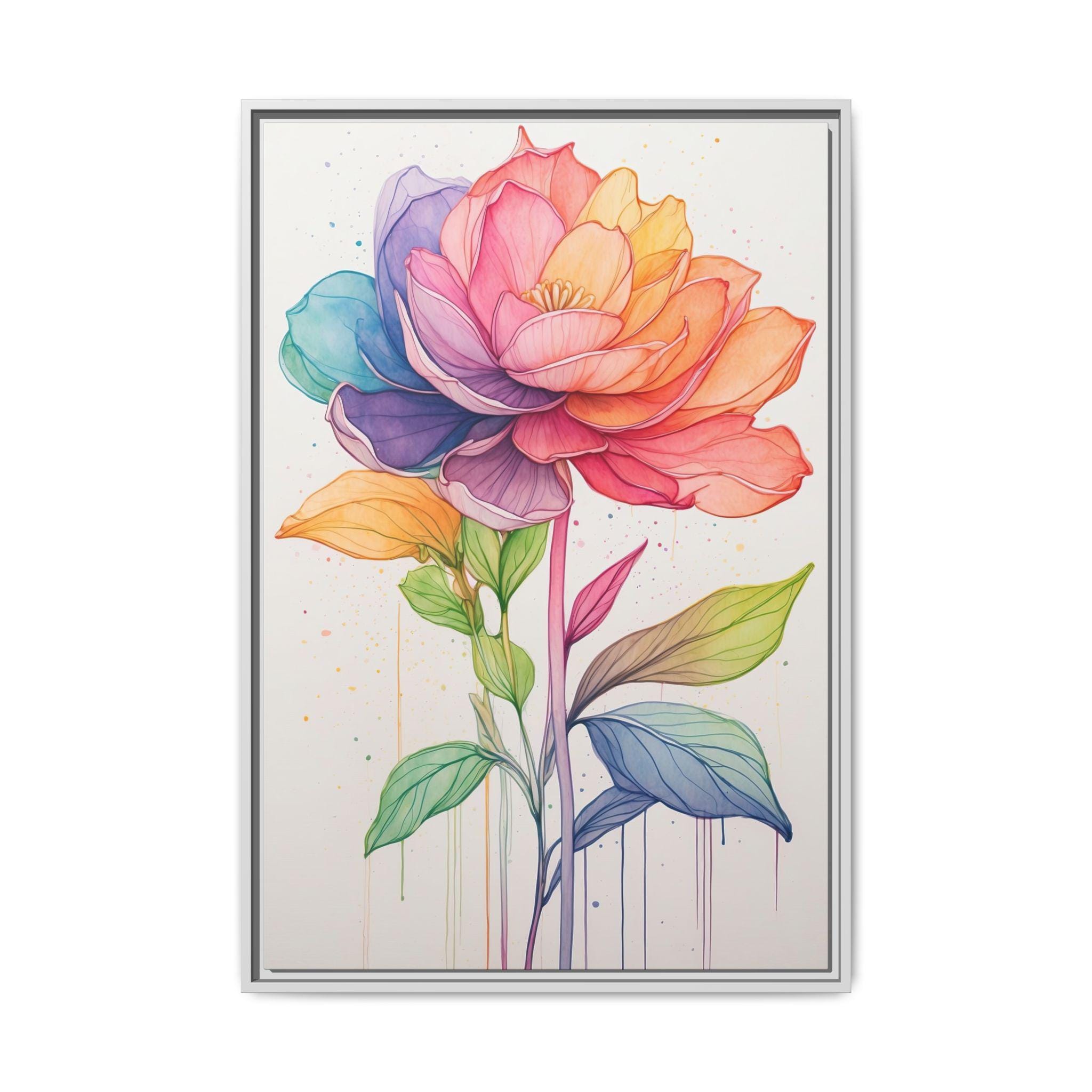 "Rainbow Bloom" features a delicate continuous line flower drawing filled with soft watercolor gradients that span the spectrum of the rainbow. The combination of precise linework and vibrant color creates a modern botanical artwork that is both playful and sophisticated.