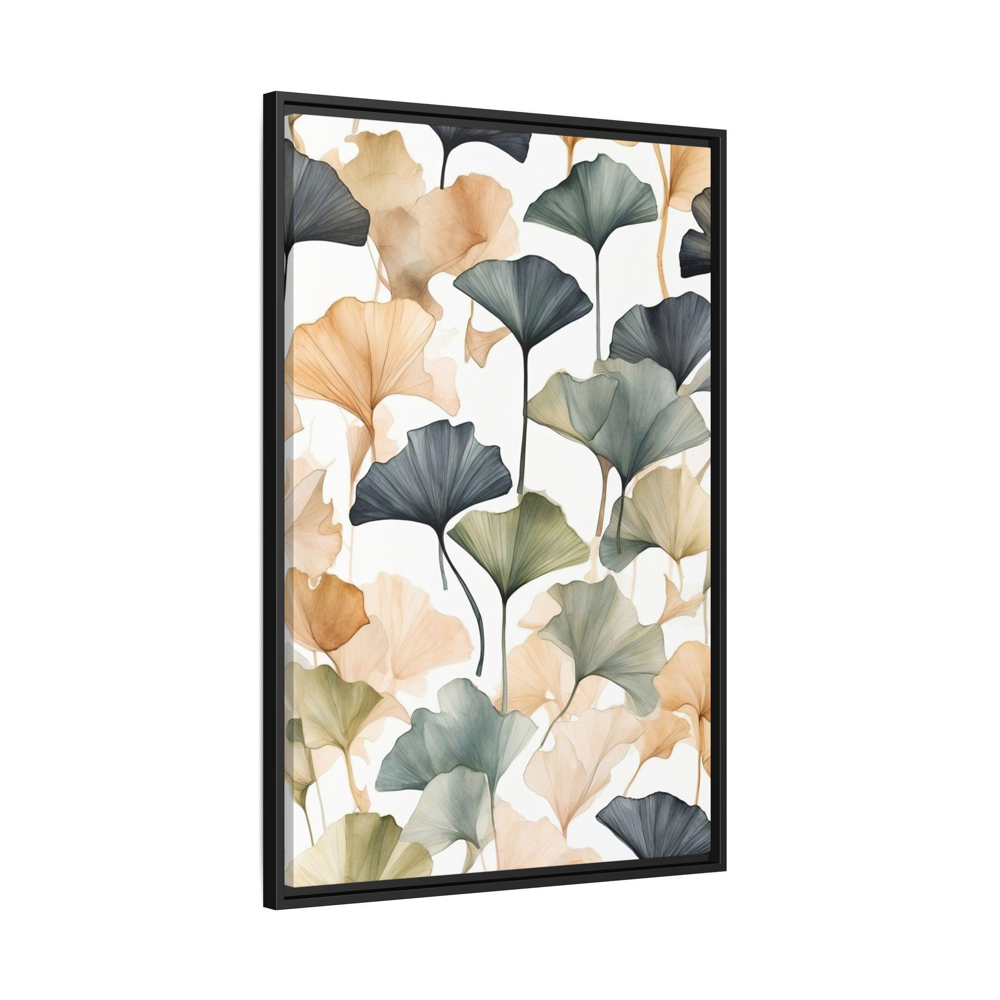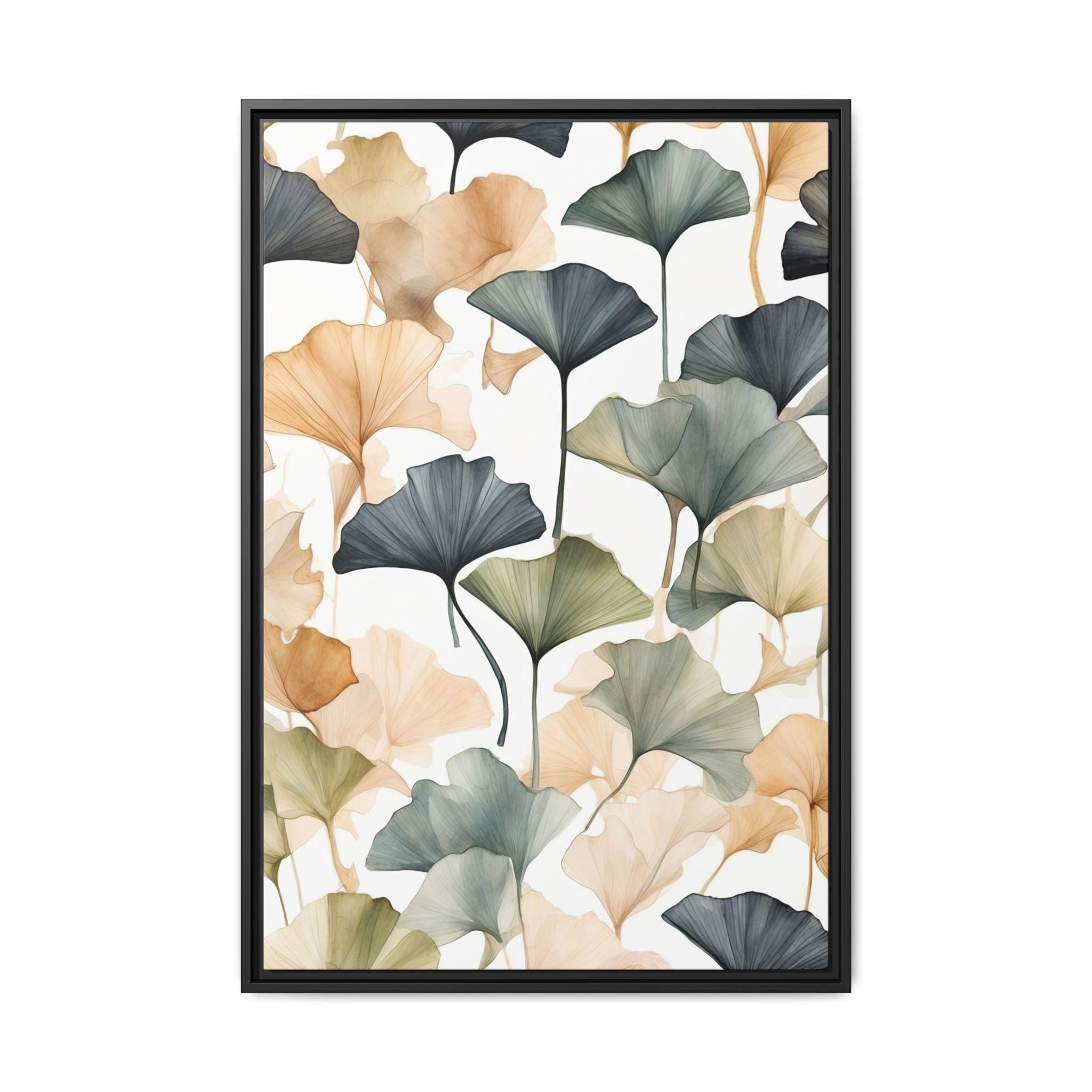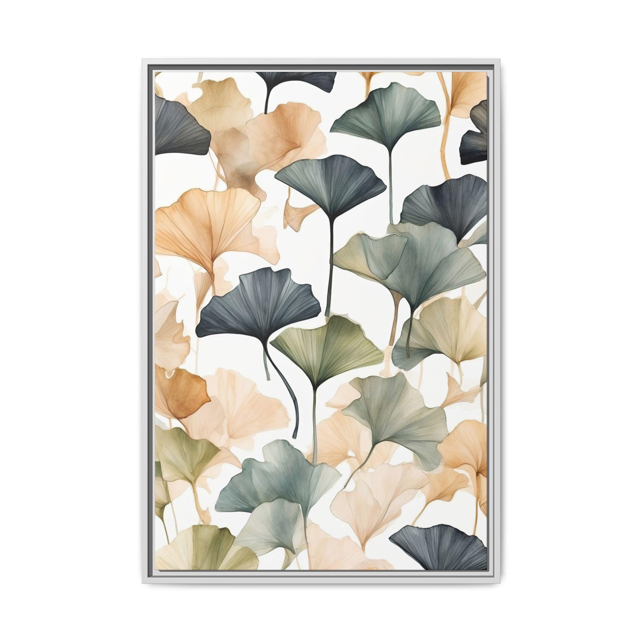 "Golden Ginkgo Drift" presents delicate ginkgo leaf illustrations enhanced by soft watercolor shadows, forming a serene and balanced composition. The minimalist approach emphasizes natural elegance while creating a modern botanical statement piece.