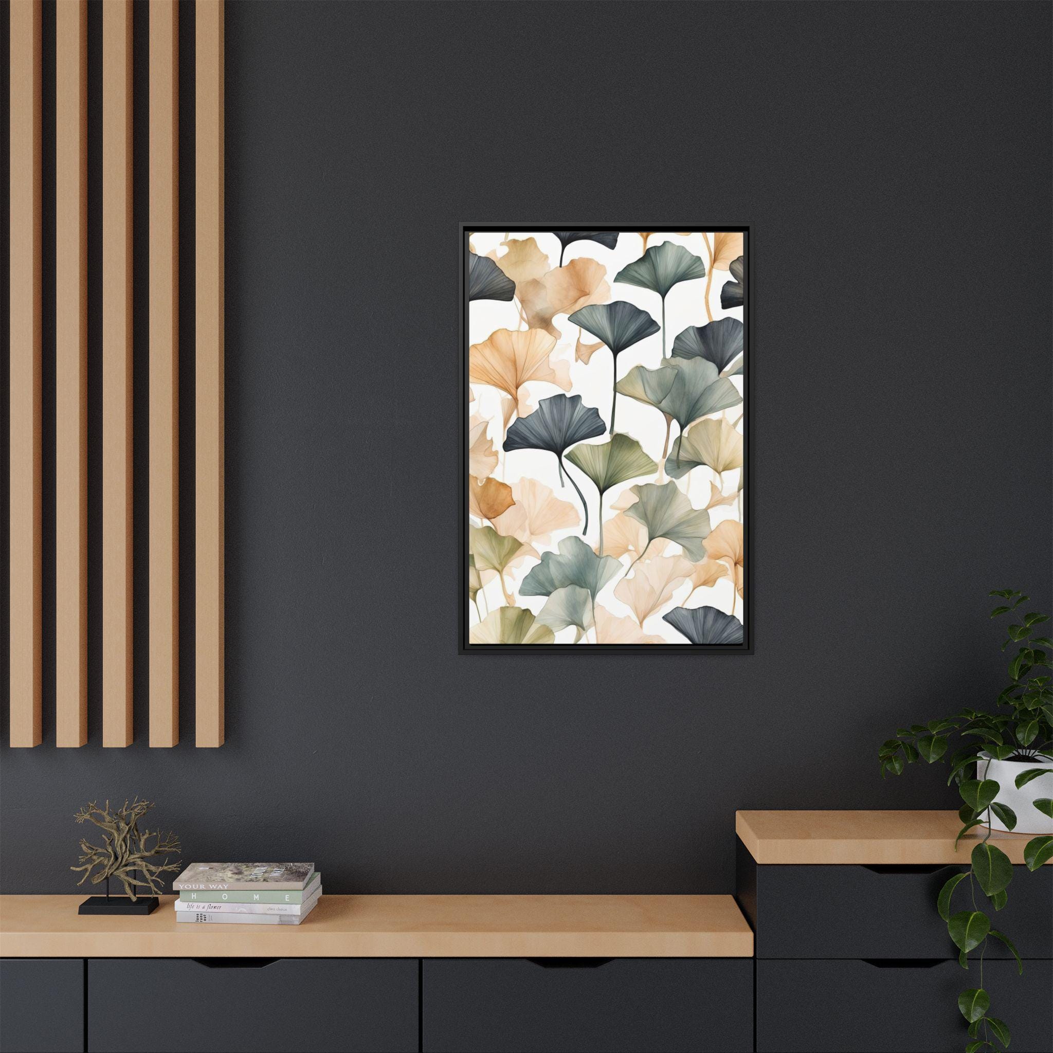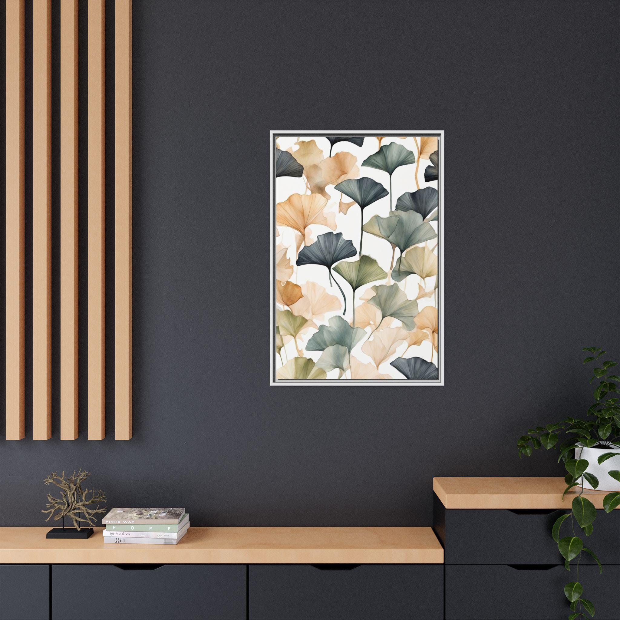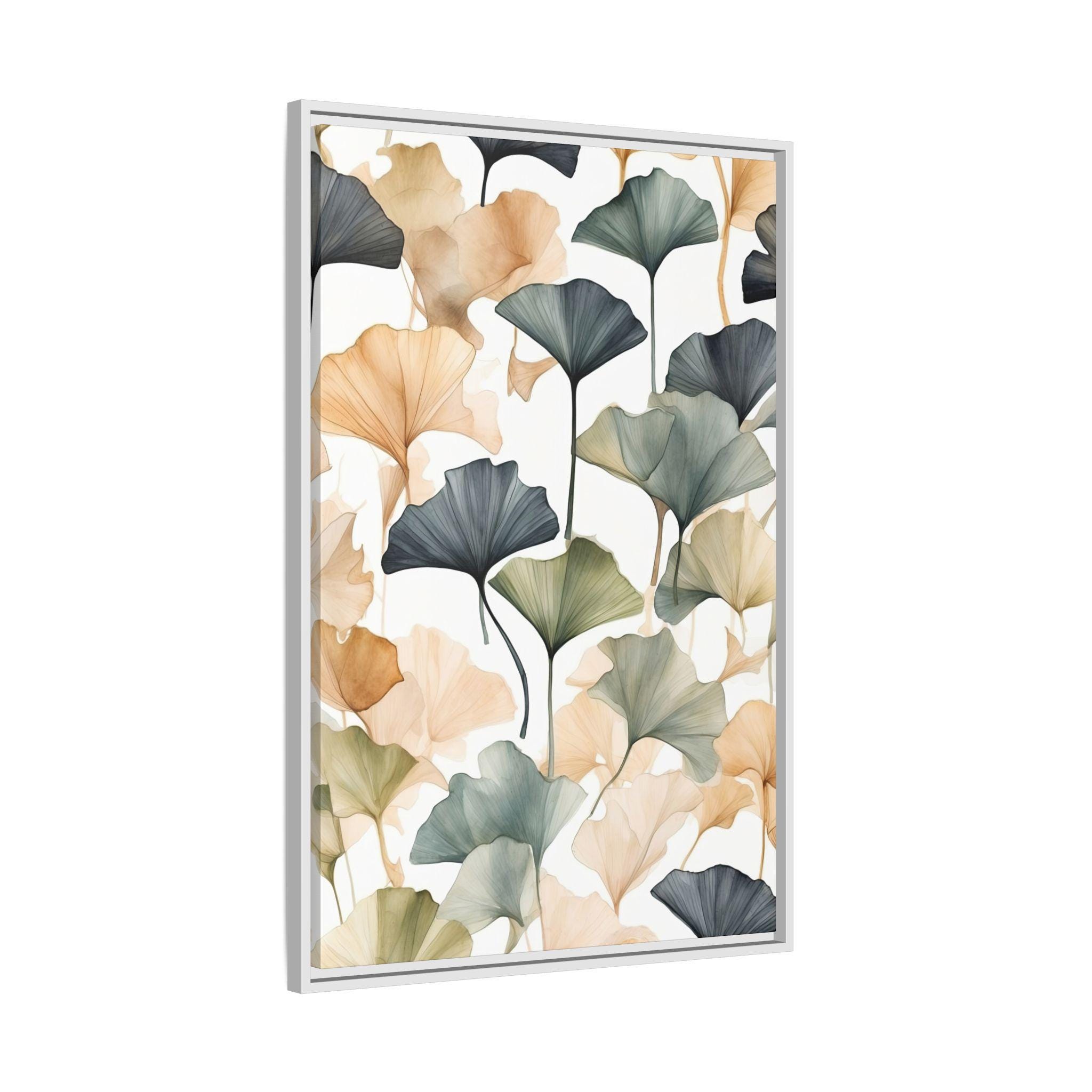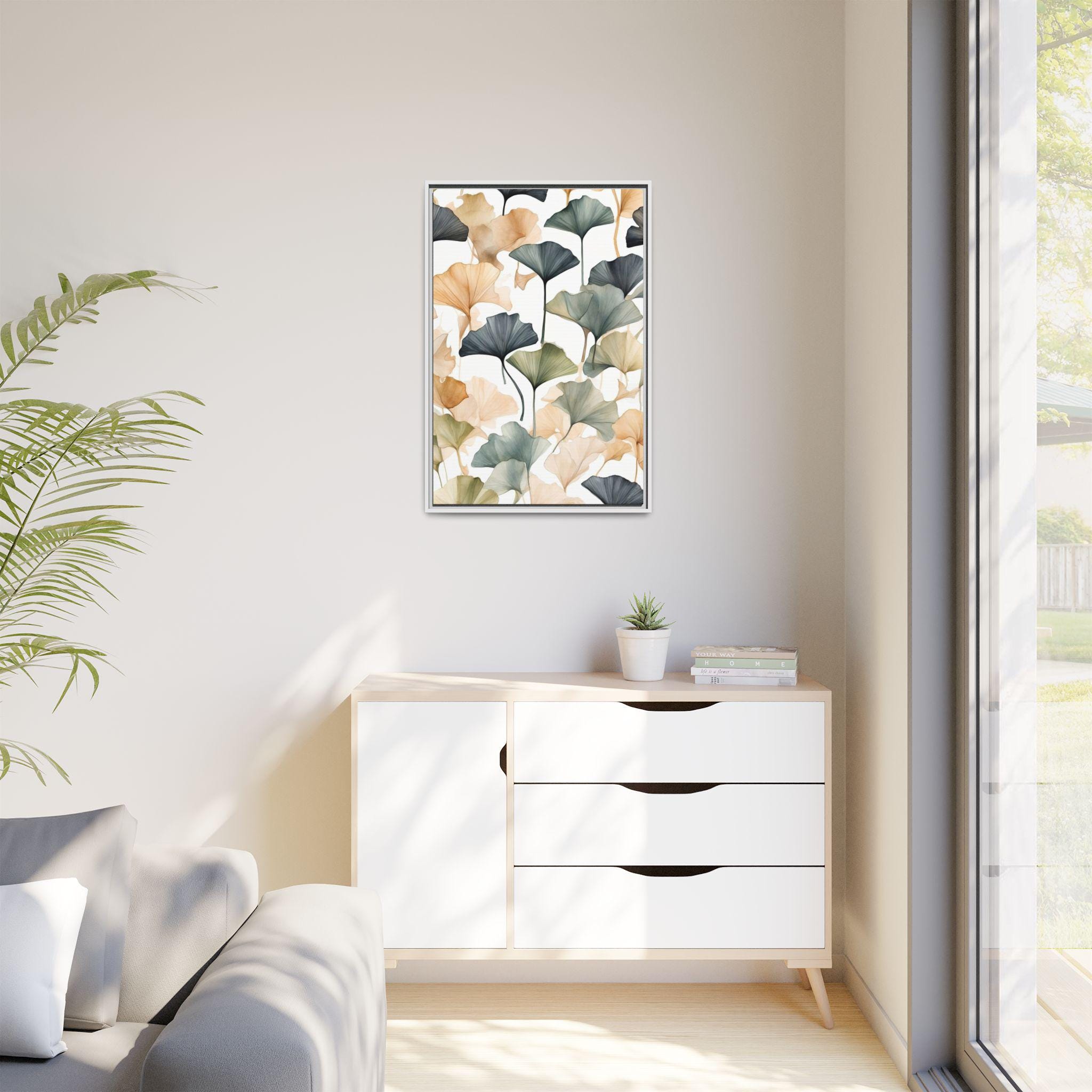 "Golden Ginkgo Drift" presents delicate ginkgo leaf illustrations enhanced by soft watercolor shadows, forming a serene and balanced composition. The minimalist approach emphasizes natural elegance while creating a modern botanical statement piece.