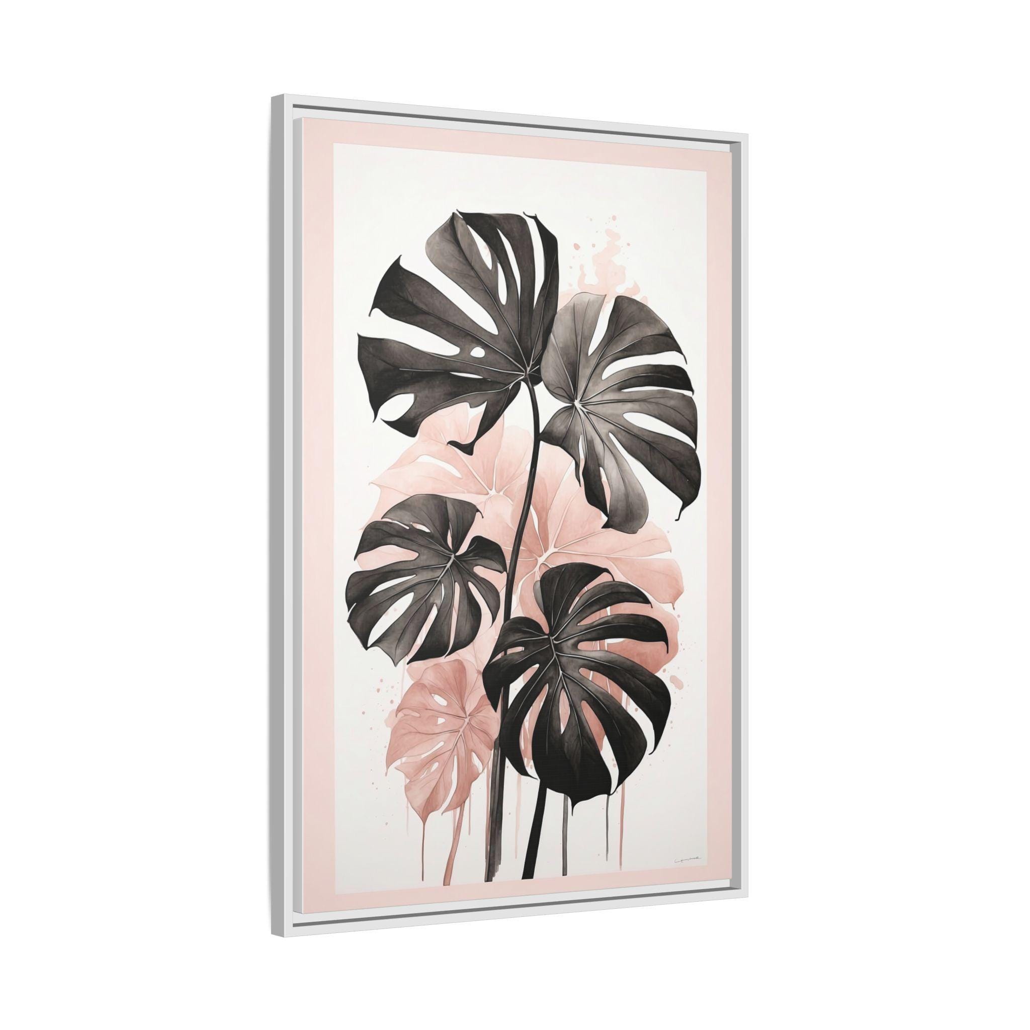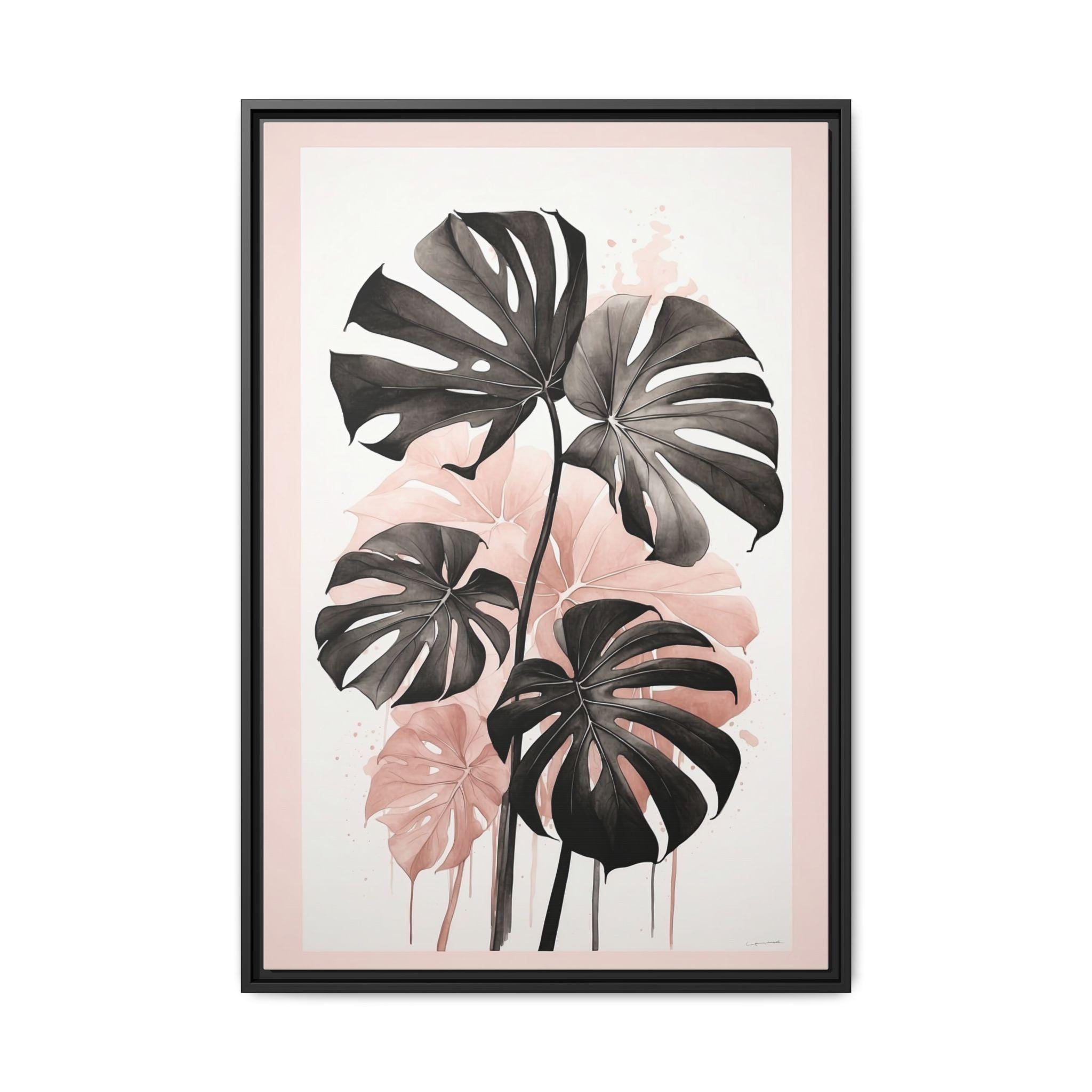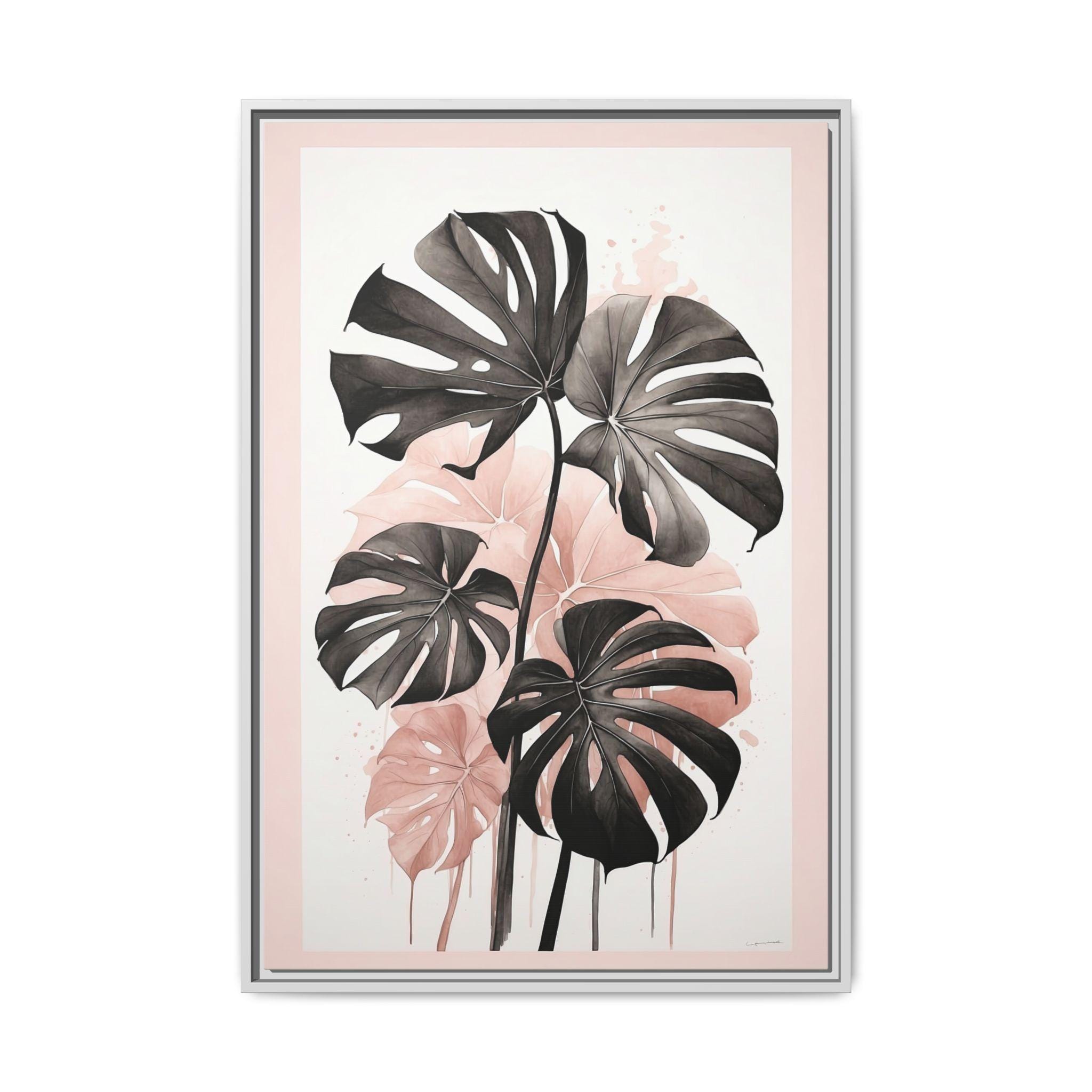 "Blush Monstera" features a monochrome ink sketch of elegant monstera leaves, accented with subtle blush watercolor gradients. The minimalist composition balances abstract background elements with natural botanical forms, creating a refined and modern wall art piece.