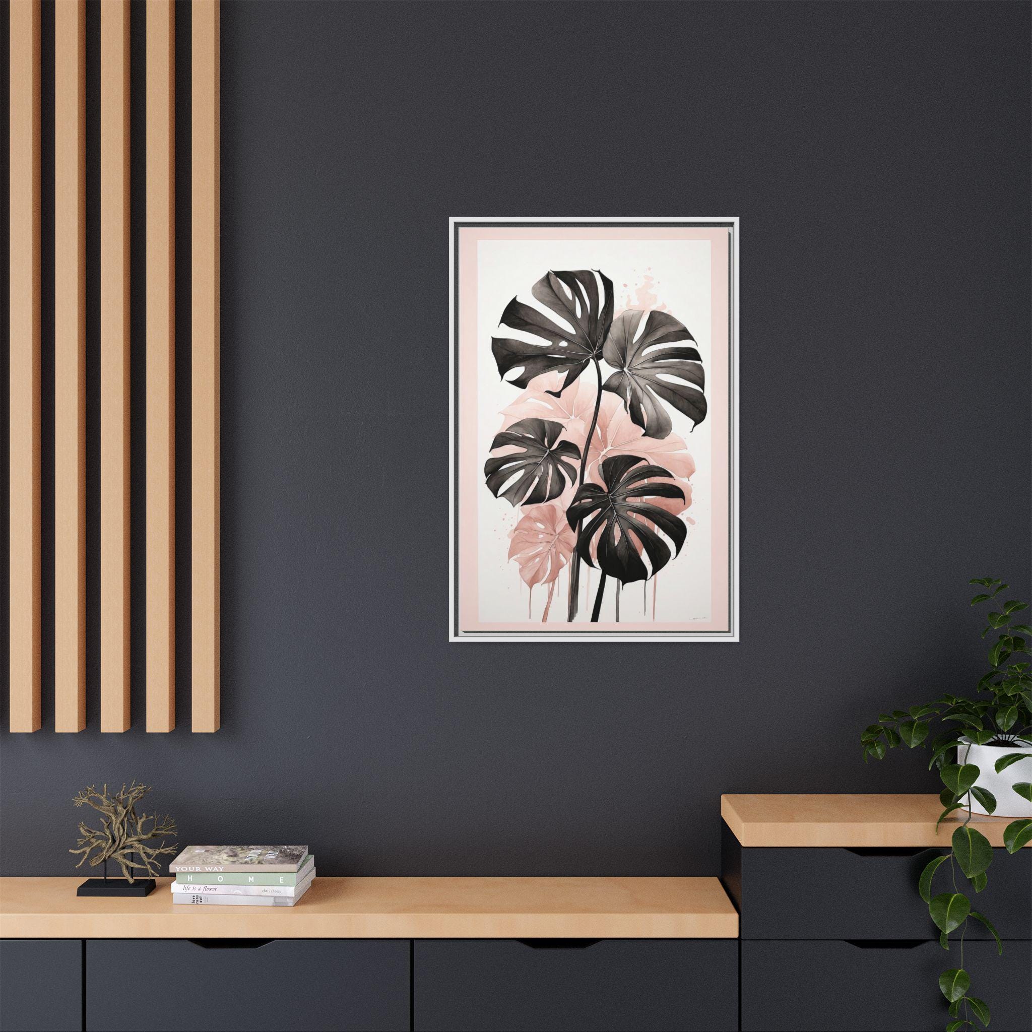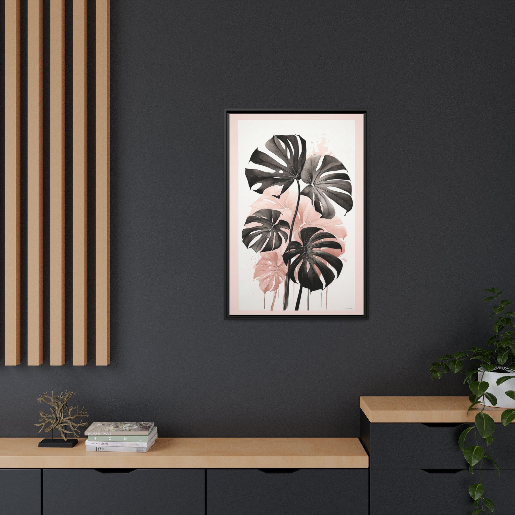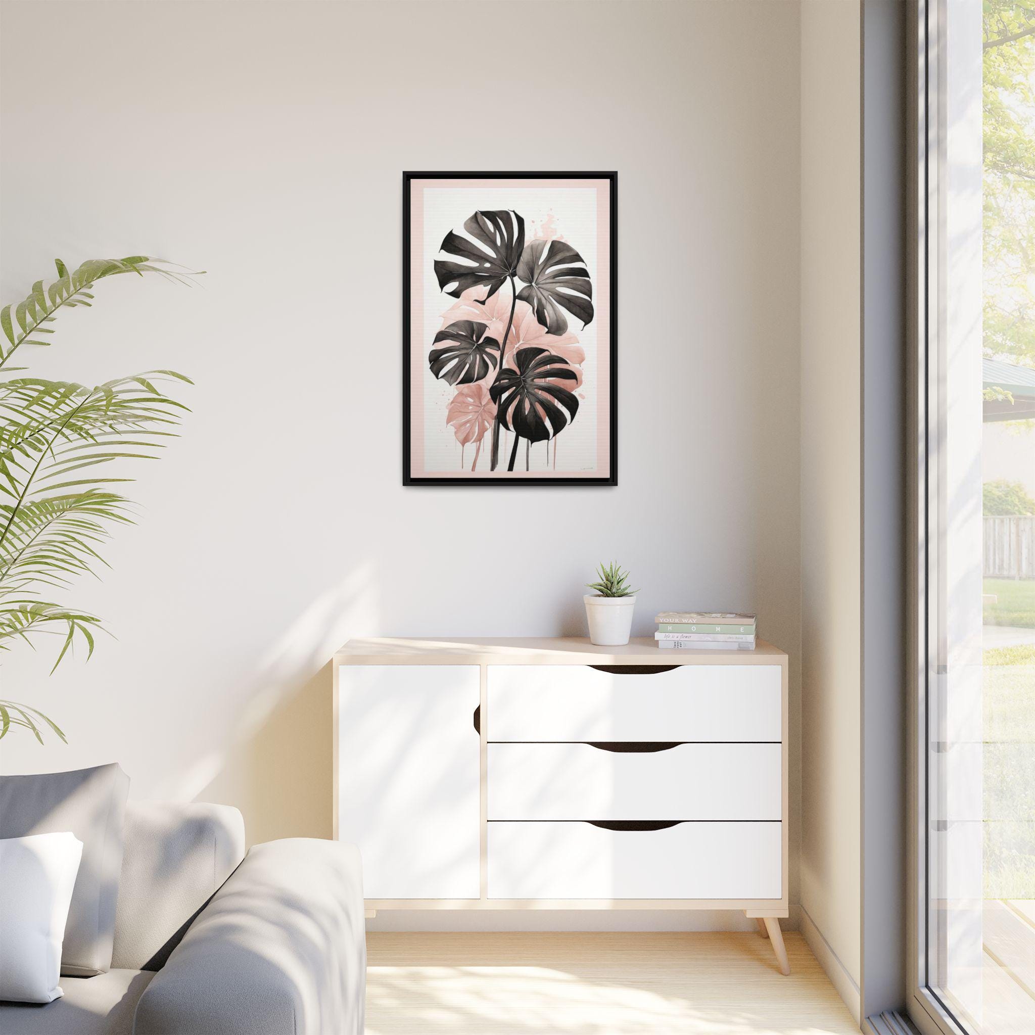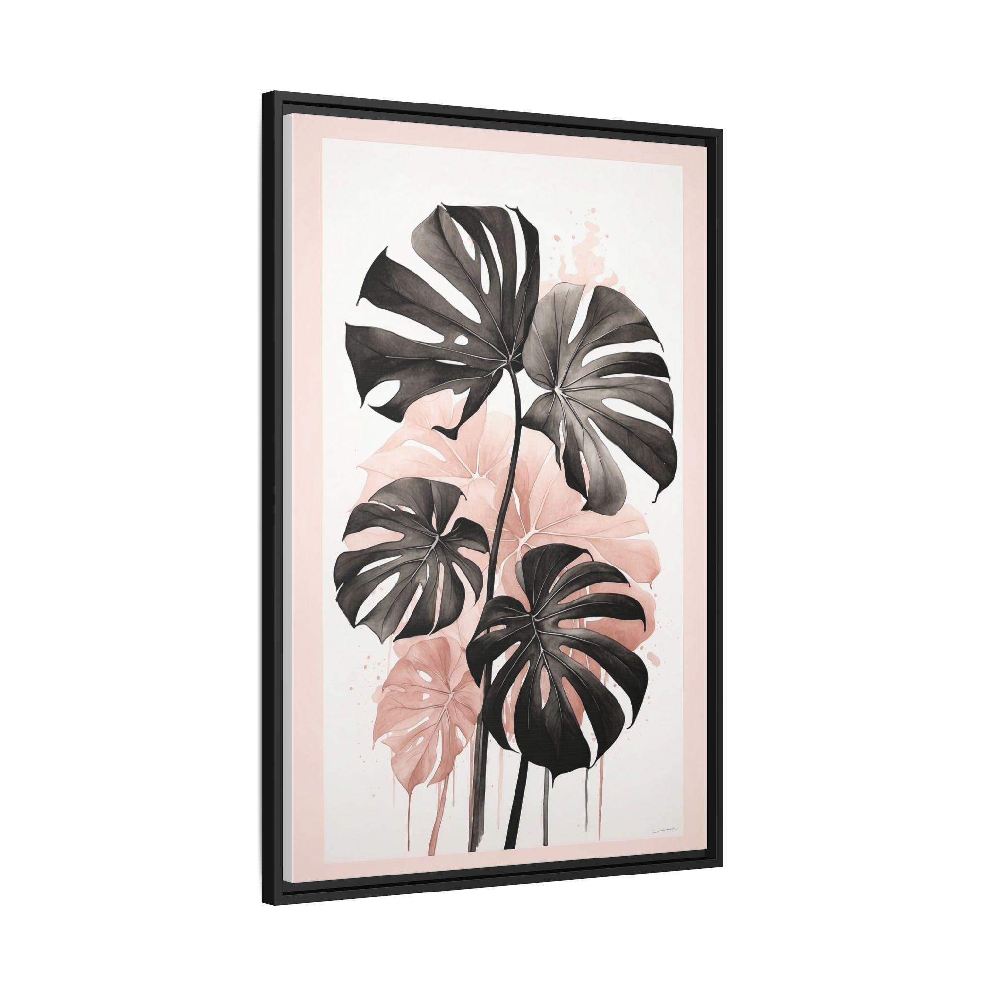 "Blush Monstera" features a monochrome ink sketch of elegant monstera leaves, accented with subtle blush watercolor gradients. The minimalist composition balances abstract background elements with natural botanical forms, creating a refined and modern wall art piece.