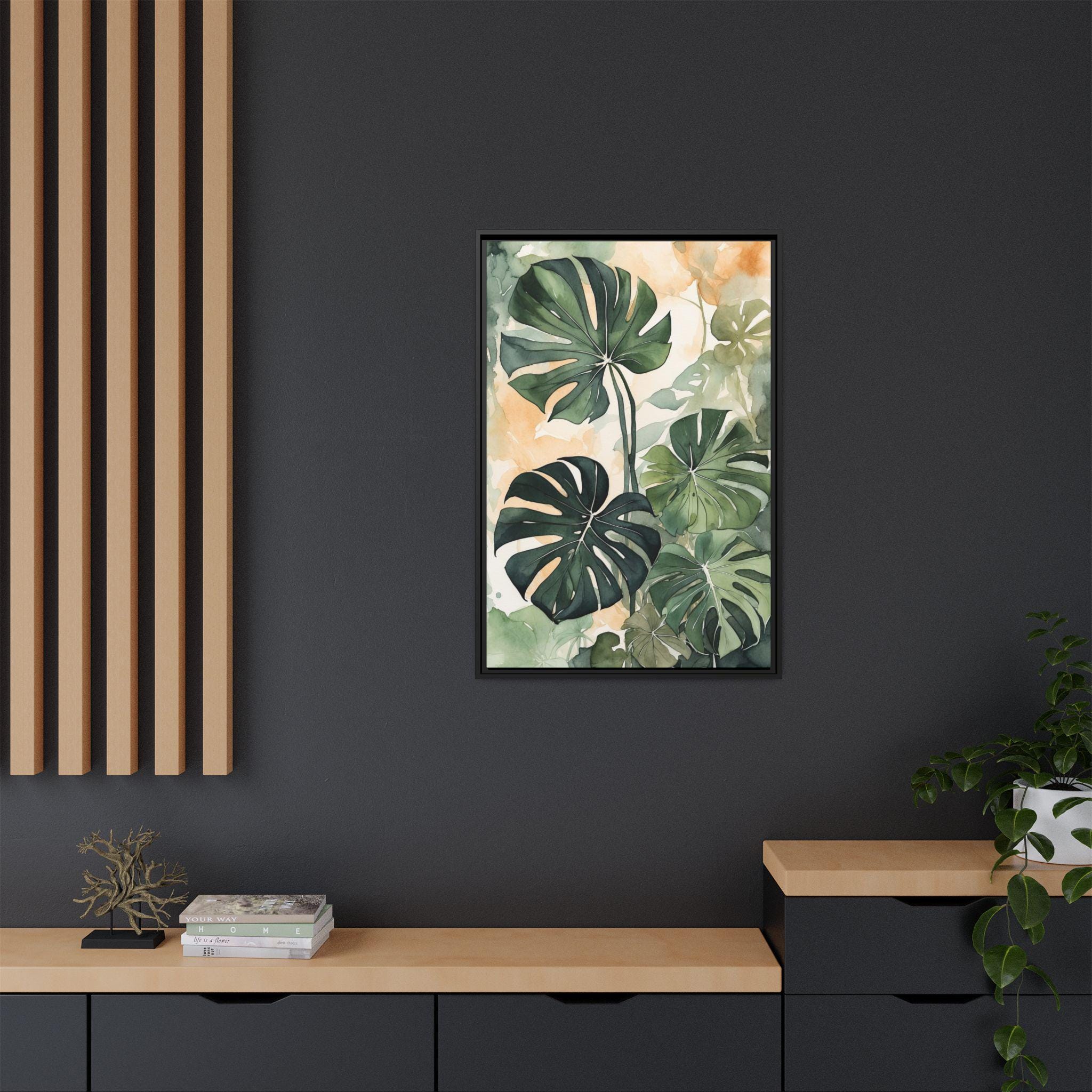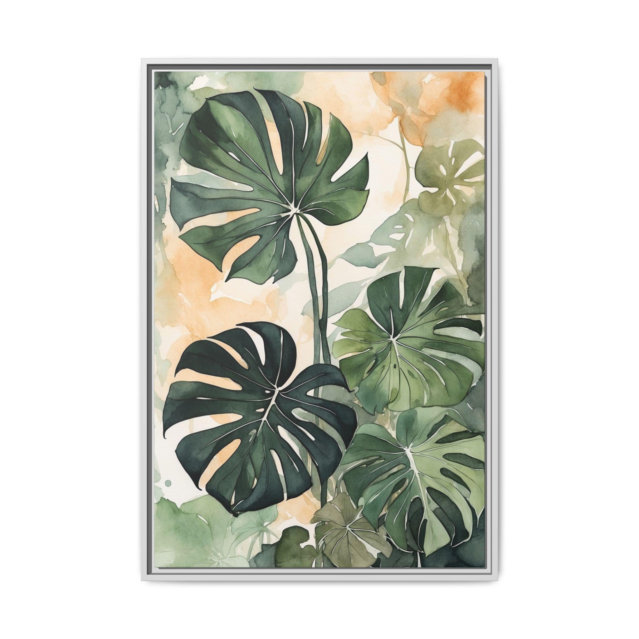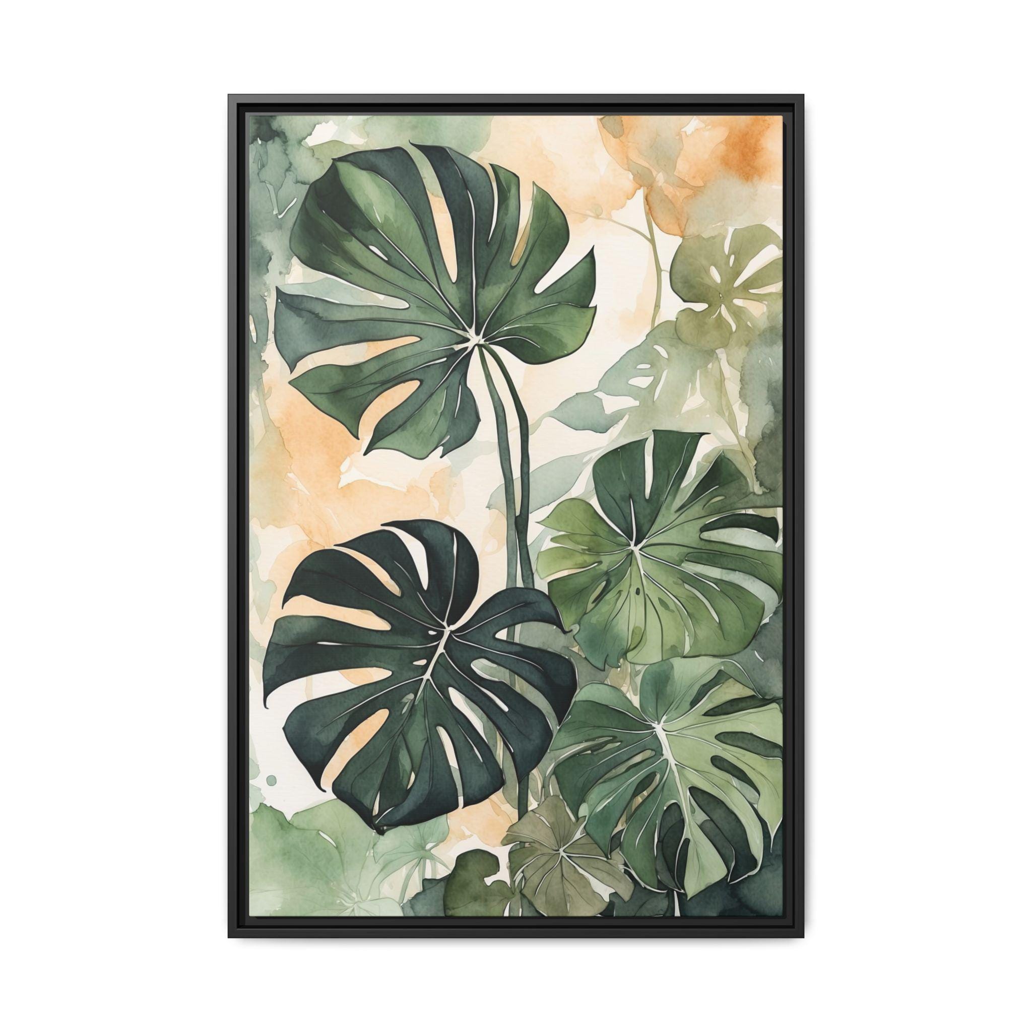 "Earthy Monstera" showcases loose watercolor strokes of monstera leaves over a textured abstract background in an earthy green palette. The composition blends natural botanical beauty with modern abstract design, creating a calming and sophisticated wall art piece.