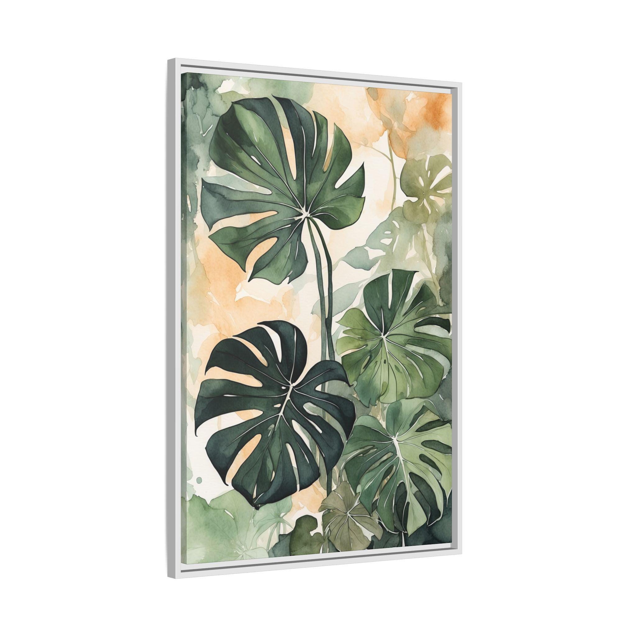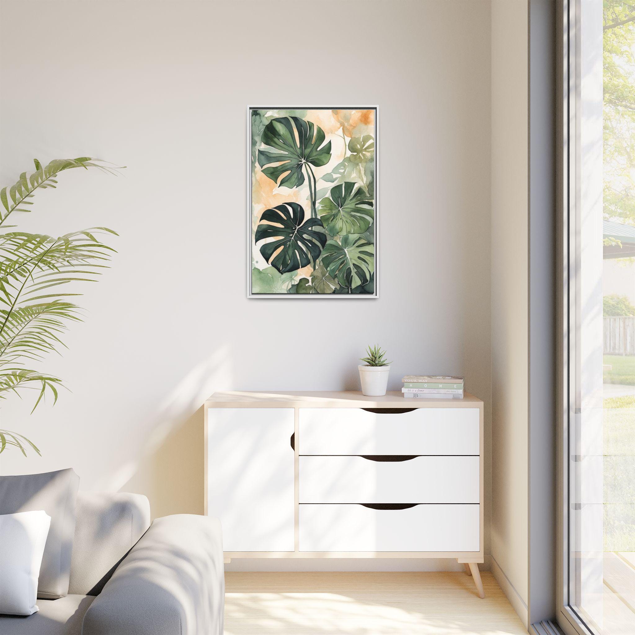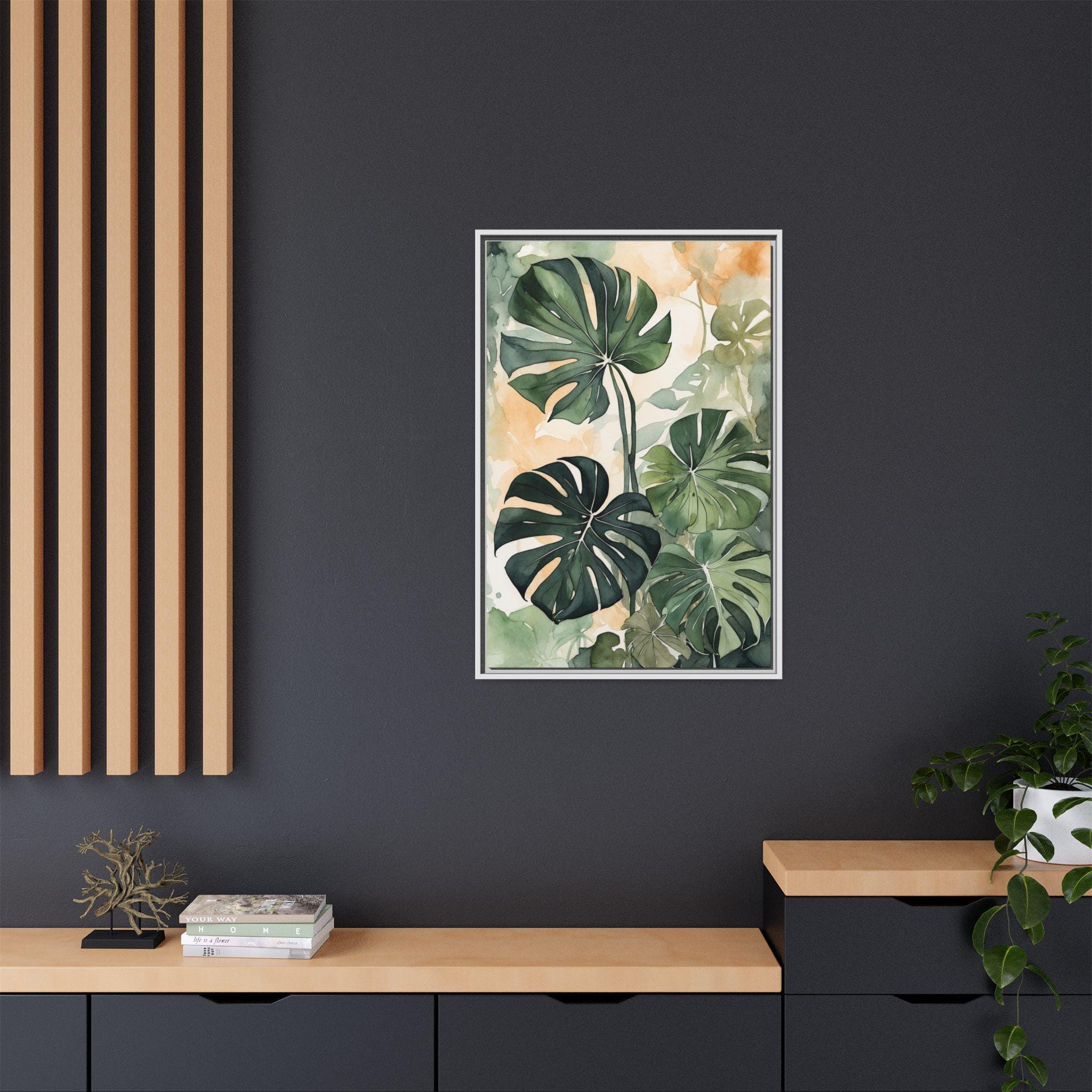 "Earthy Monstera" showcases loose watercolor strokes of monstera leaves over a textured abstract background in an earthy green palette. The composition blends natural botanical beauty with modern abstract design, creating a calming and sophisticated wall art piece.