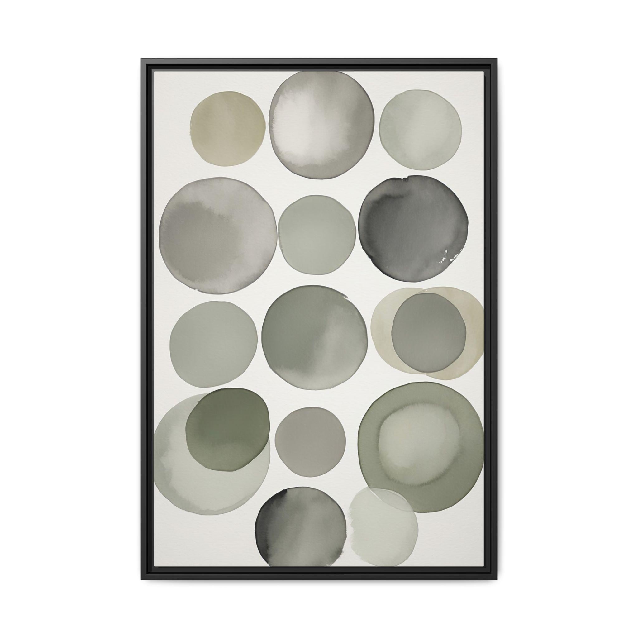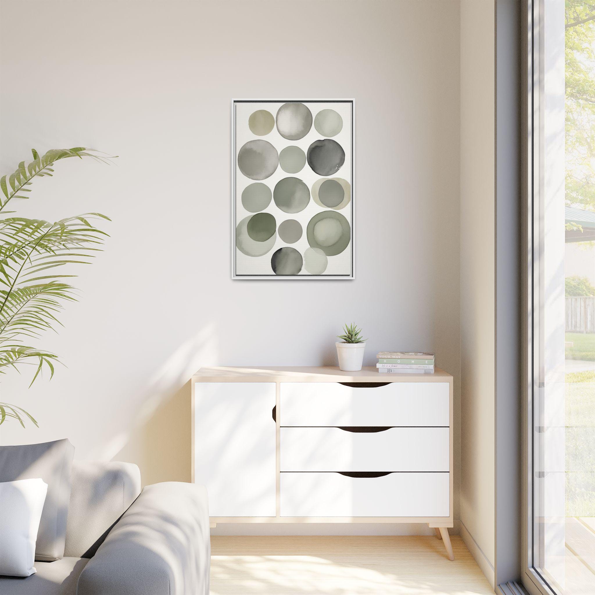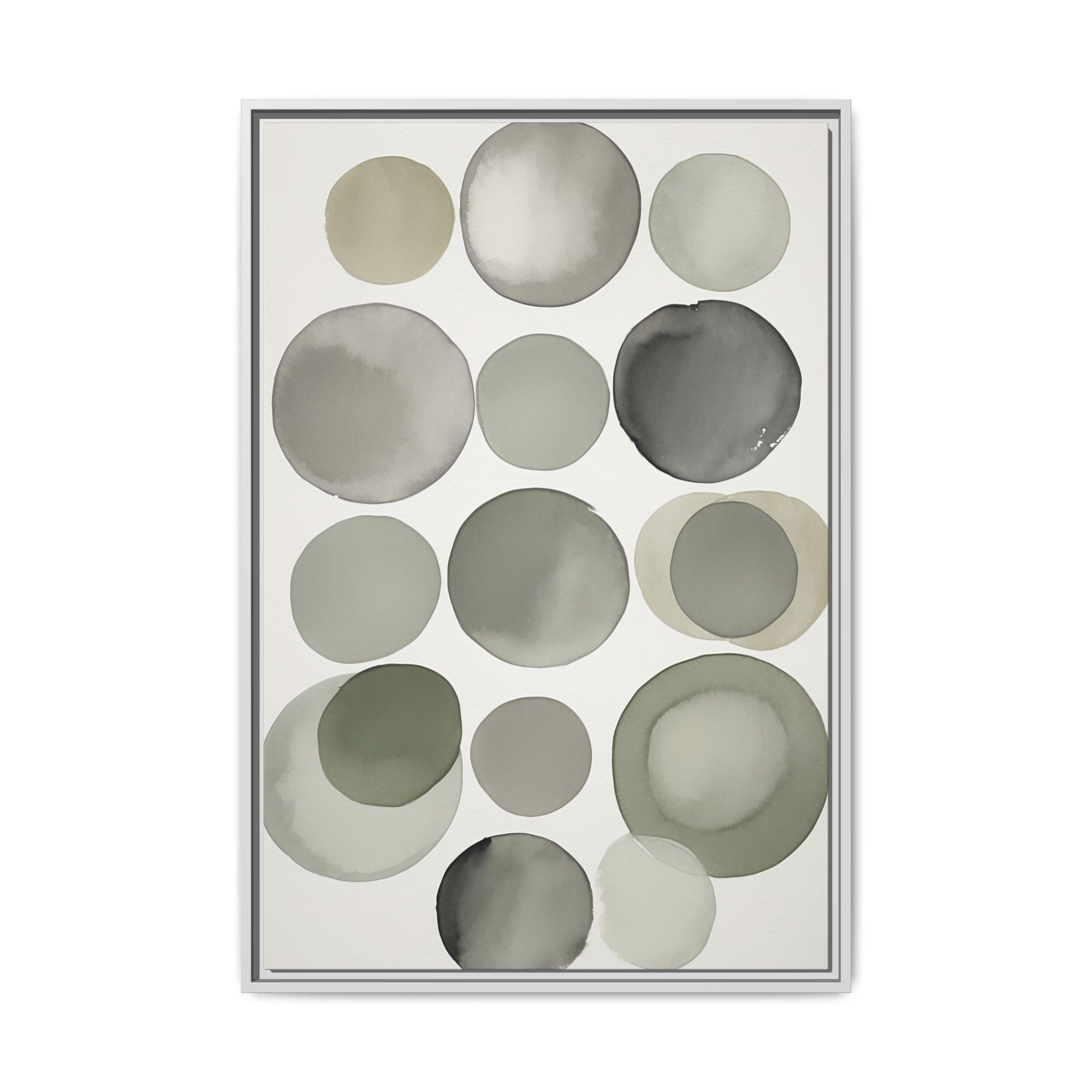 "Muted Harmony" features gentle watercolor brush circles in soft gray, clay, and pale green, accented by a singular botanical leaf overlay. The composition balances abstract modern shapes with organic elegance, creating a tranquil and sophisticated wall piece.