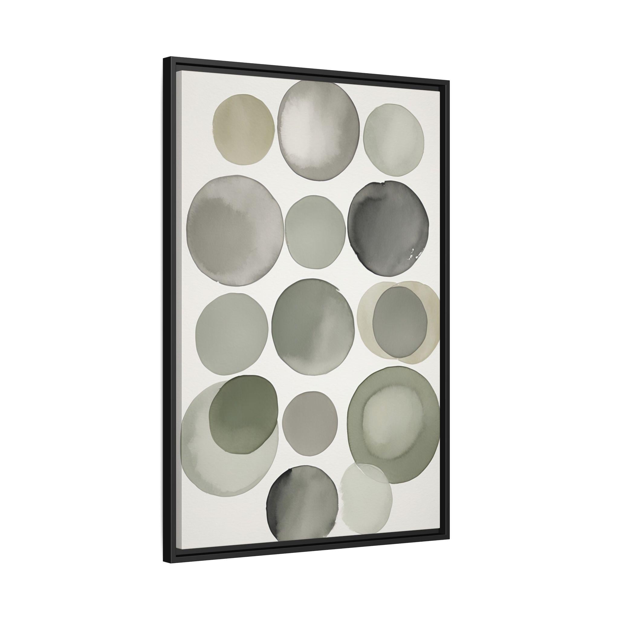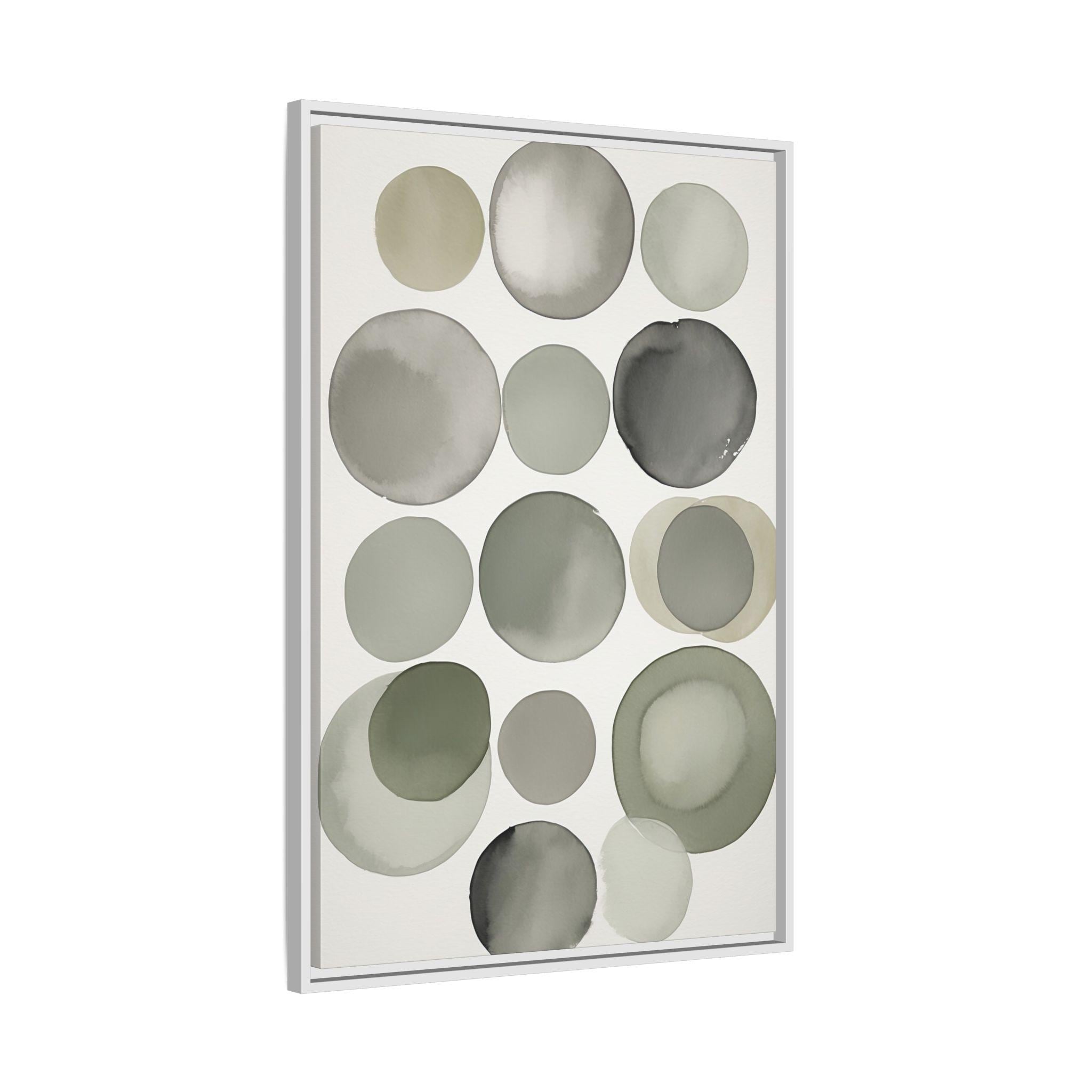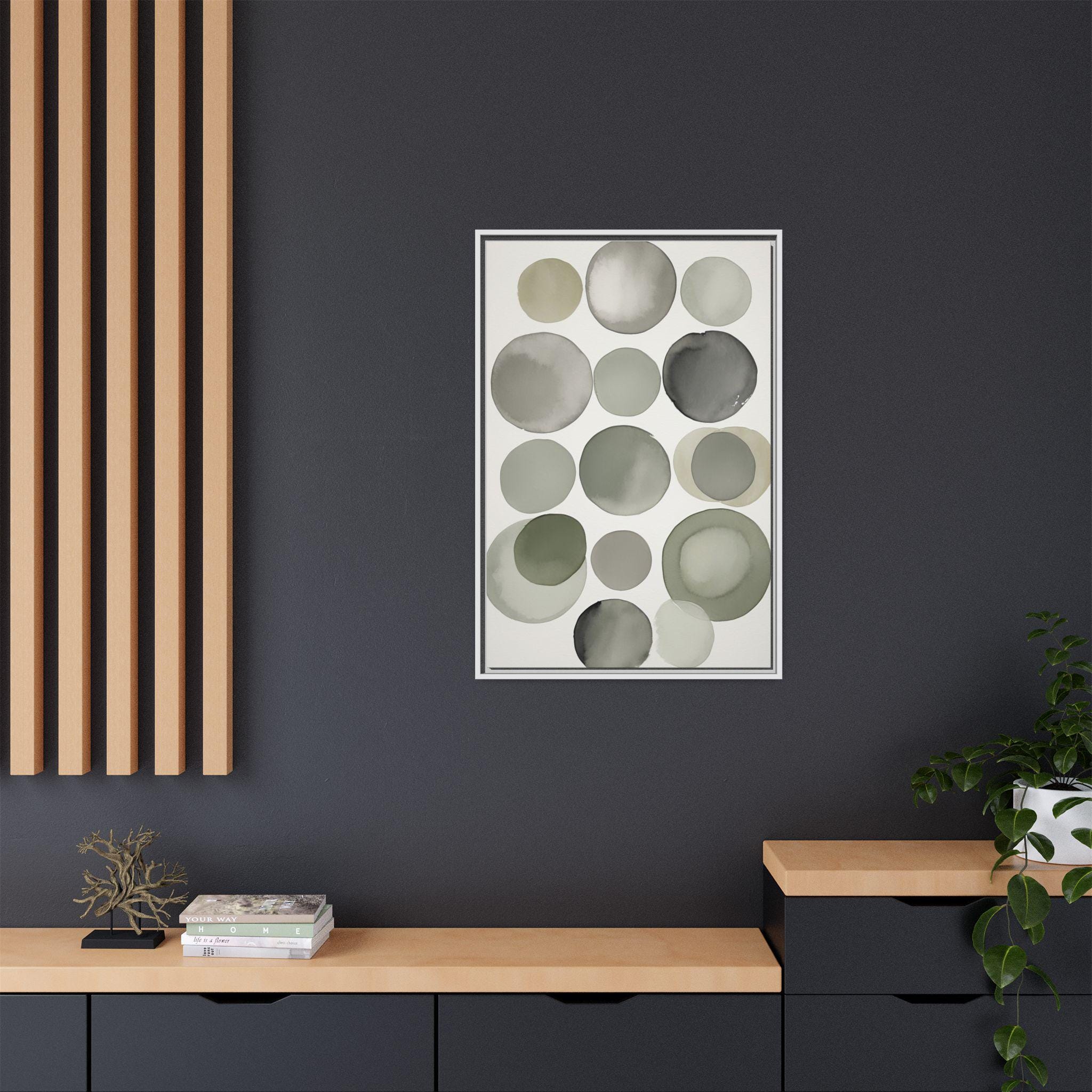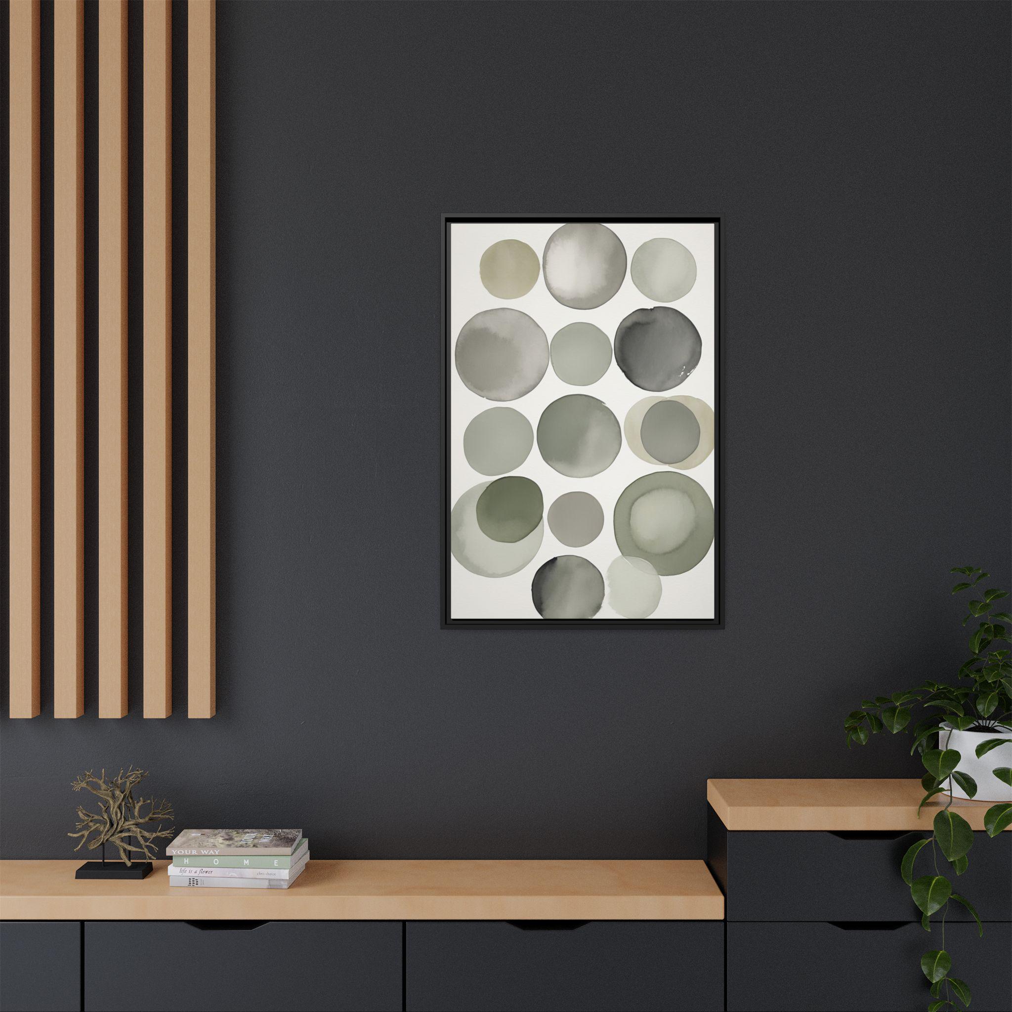 "Muted Harmony" features gentle watercolor brush circles in soft gray, clay, and pale green, accented by a singular botanical leaf overlay. The composition balances abstract modern shapes with organic elegance, creating a tranquil and sophisticated wall piece.