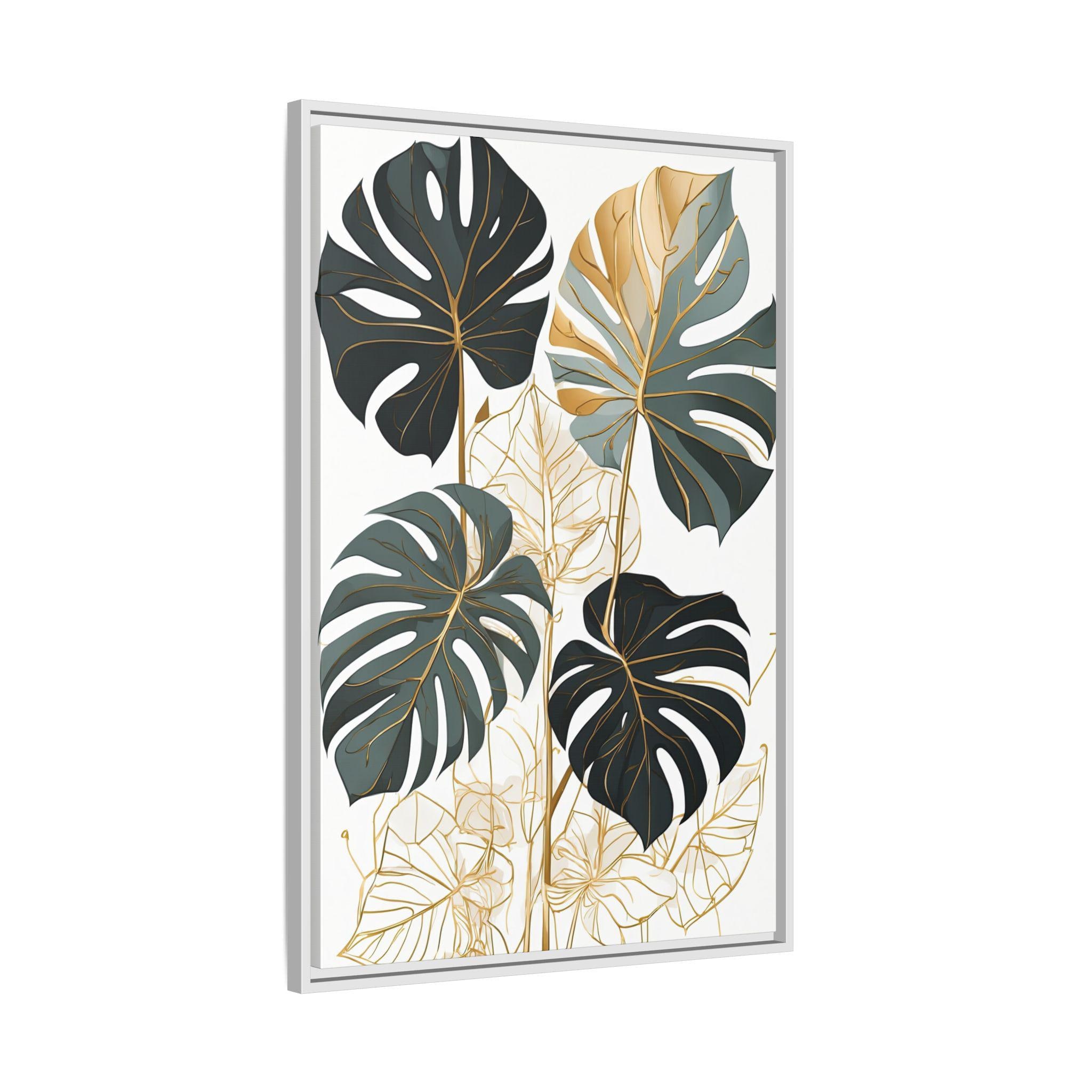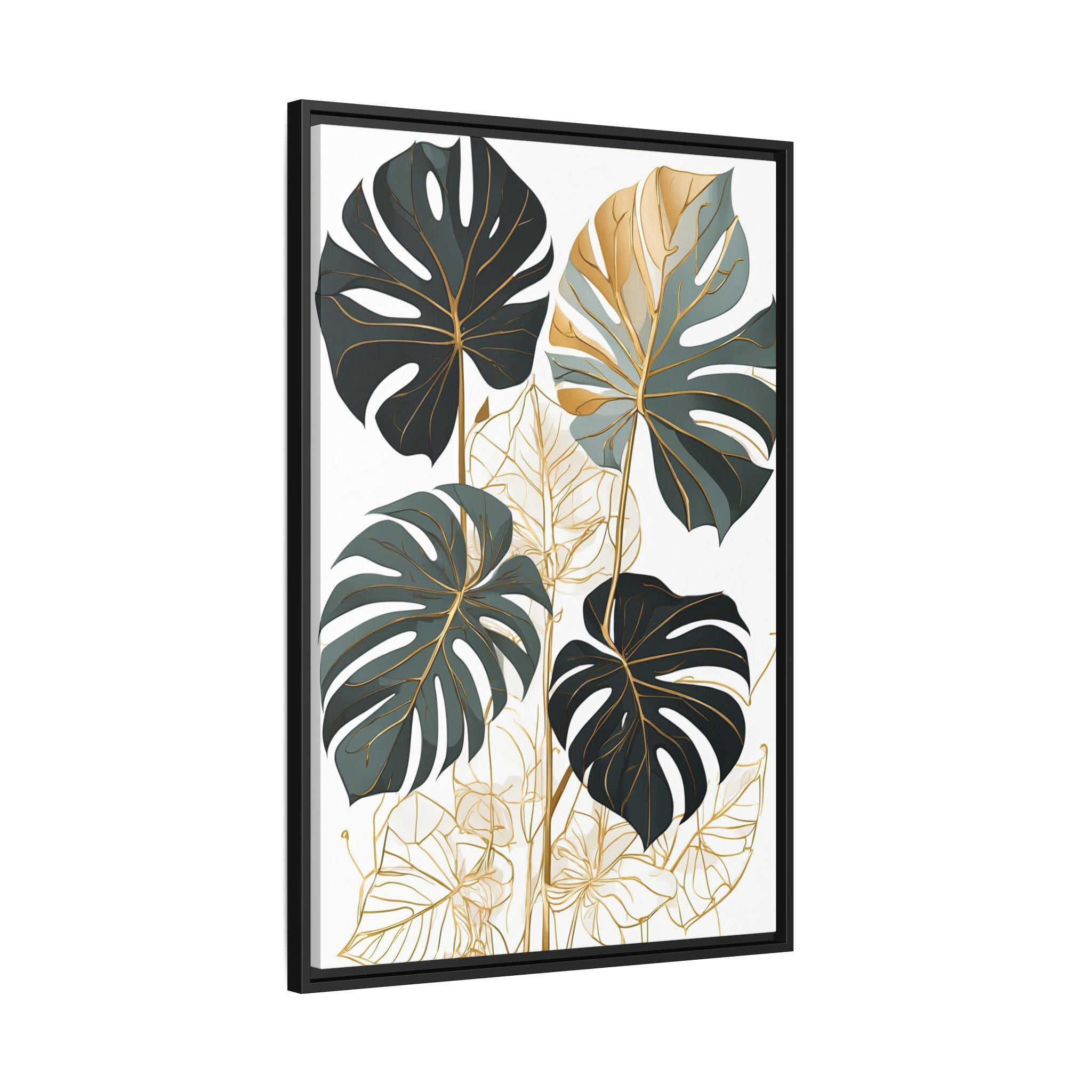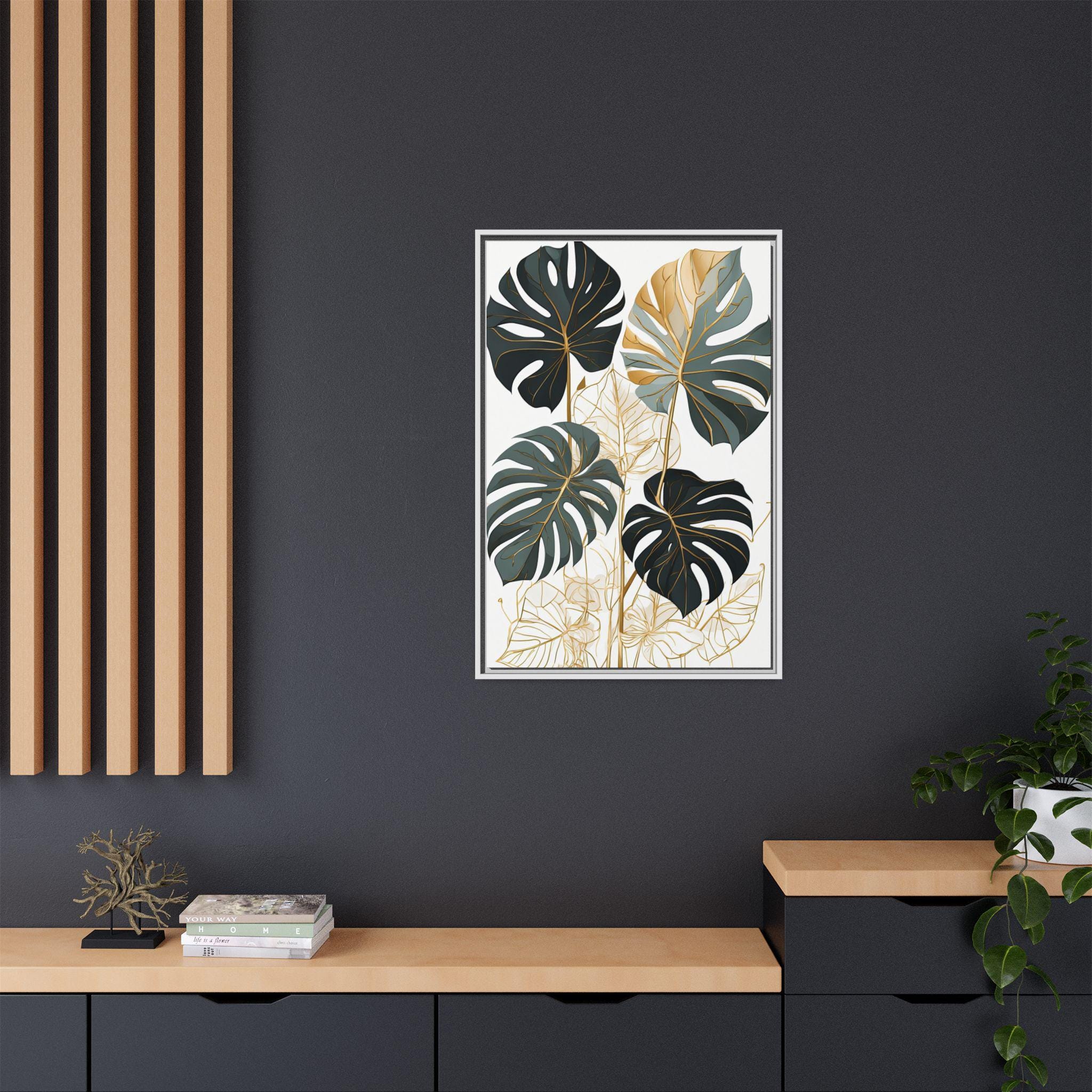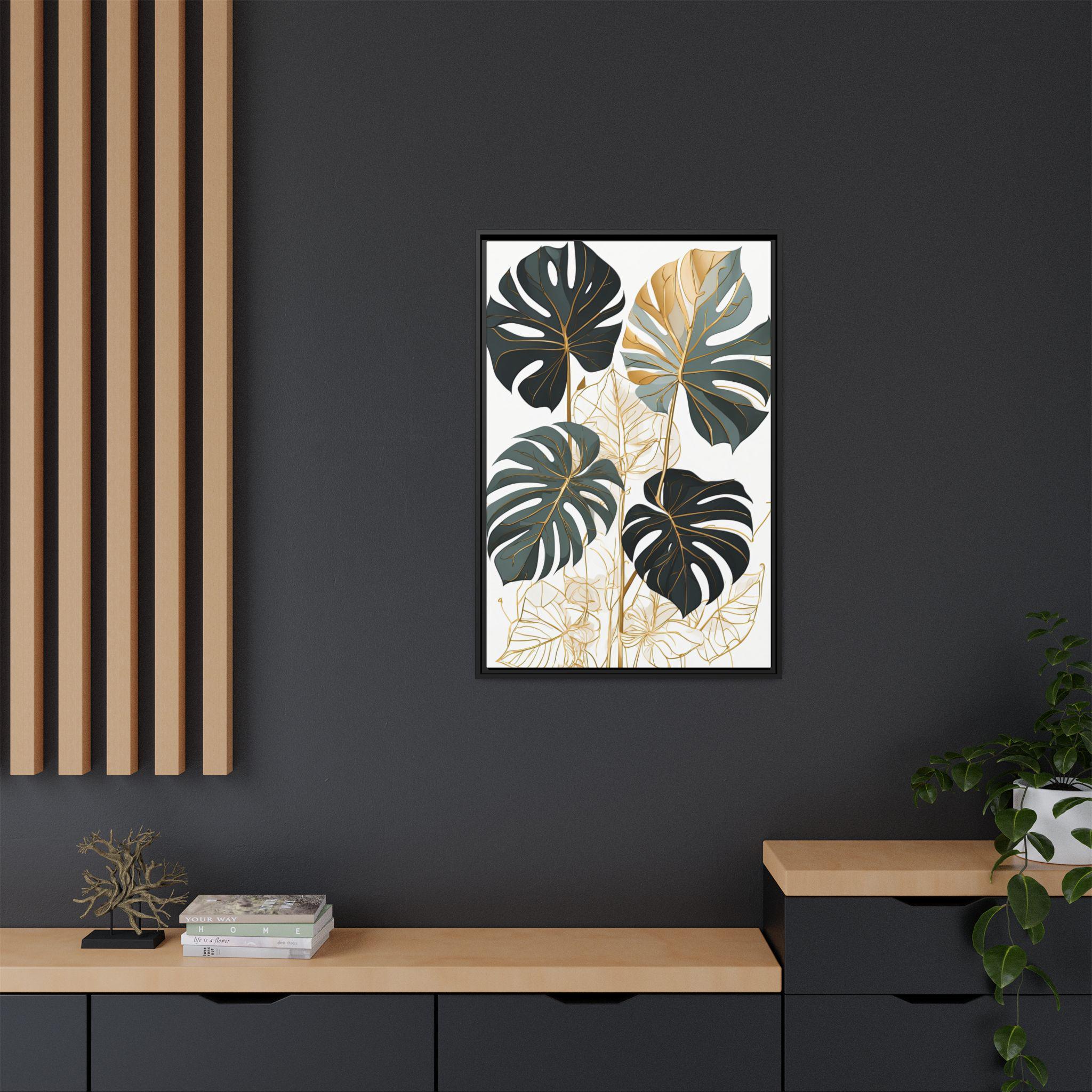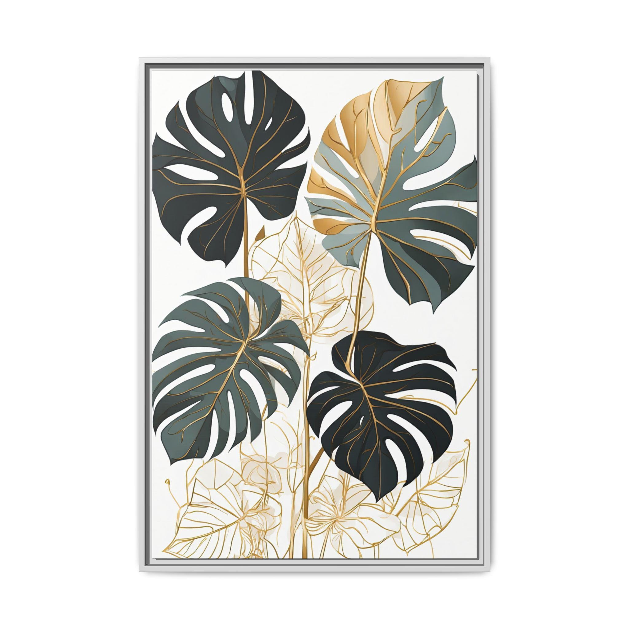 "Golden Monstera" features elegant monstera leaf outlines accented with subtle geometric gold shapes, creating a modern flat digital botanical artwork. The composition combines clean lines and refined details, adding a touch of sophistication and contemporary luxury to any space.