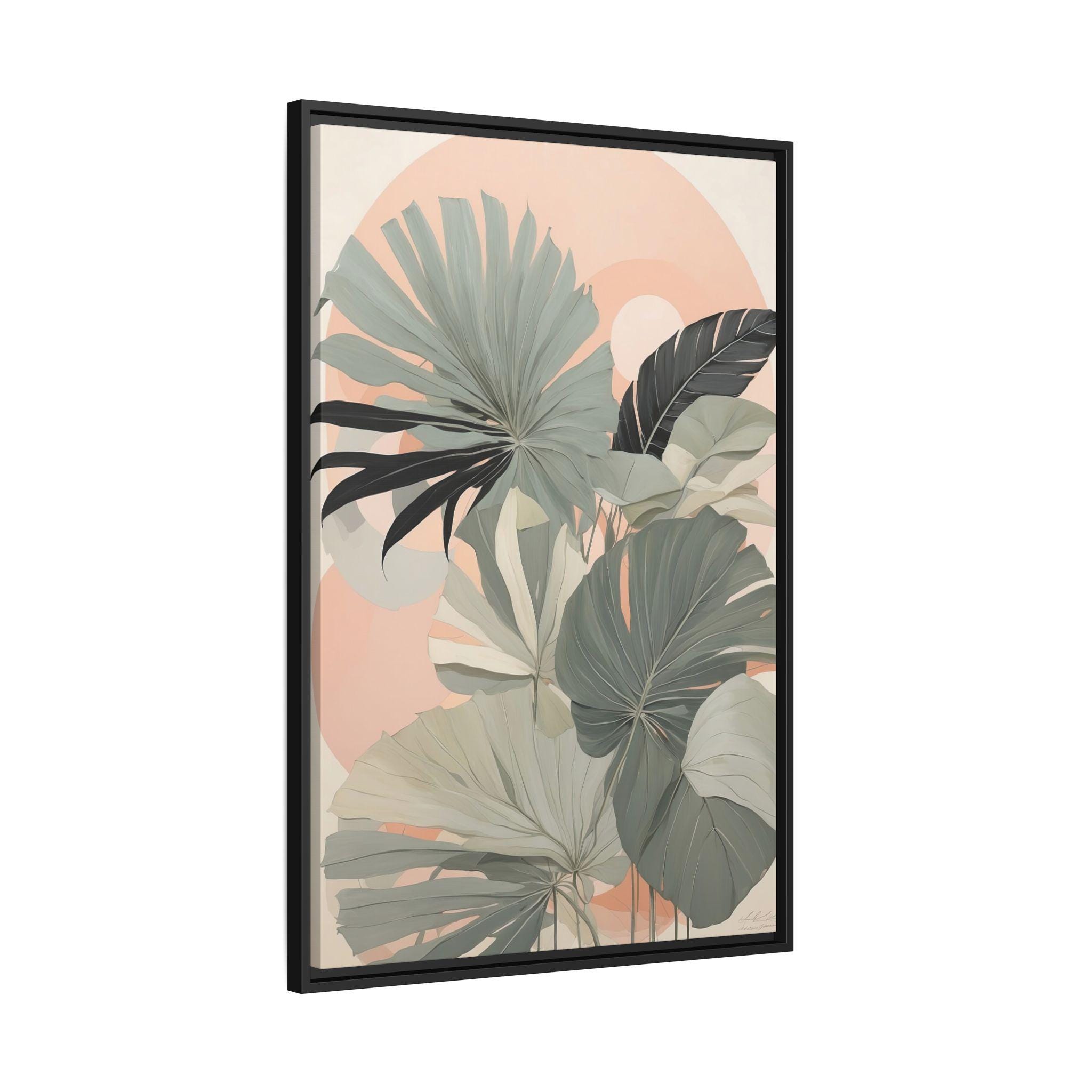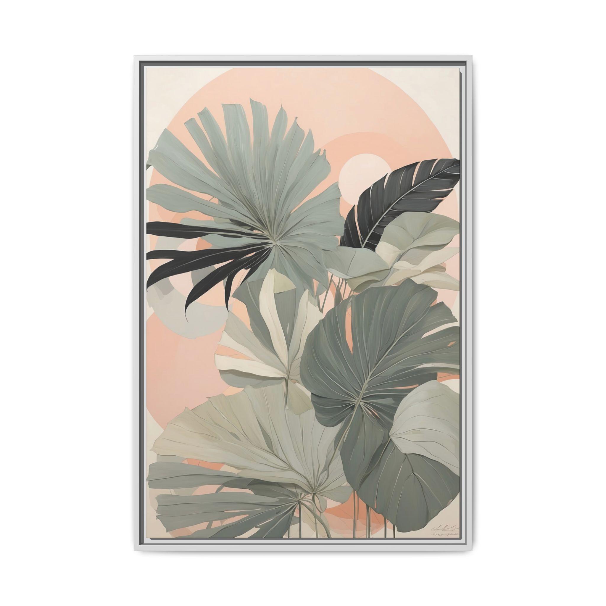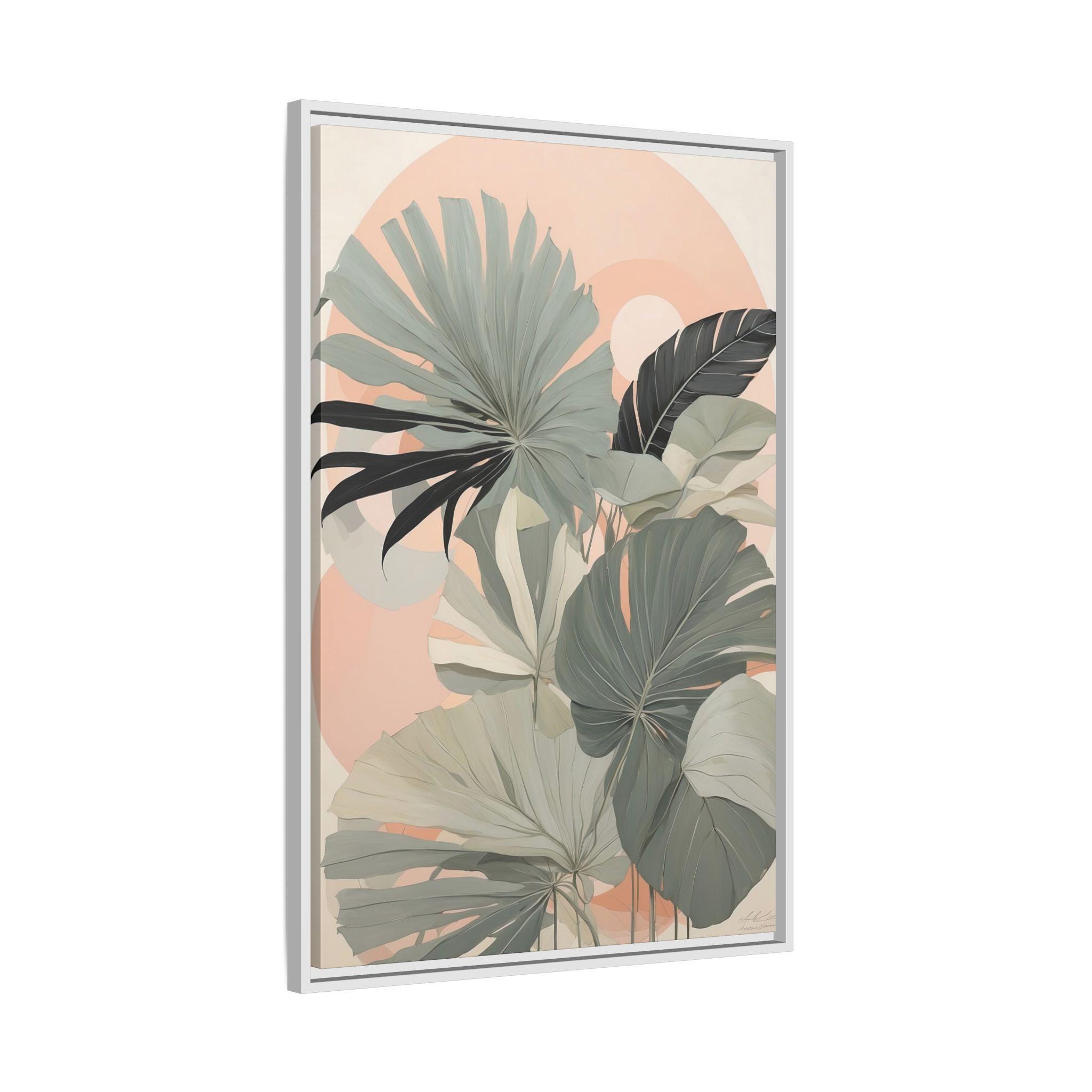 Perfect for modern interiors, this artwork adds gentle sophistication to living spaces, bedrooms, or offices. The pastel tones ensure versatility, while the palm leaf overlays evoke a calm, airy atmosphere ideal for contemporary design.
