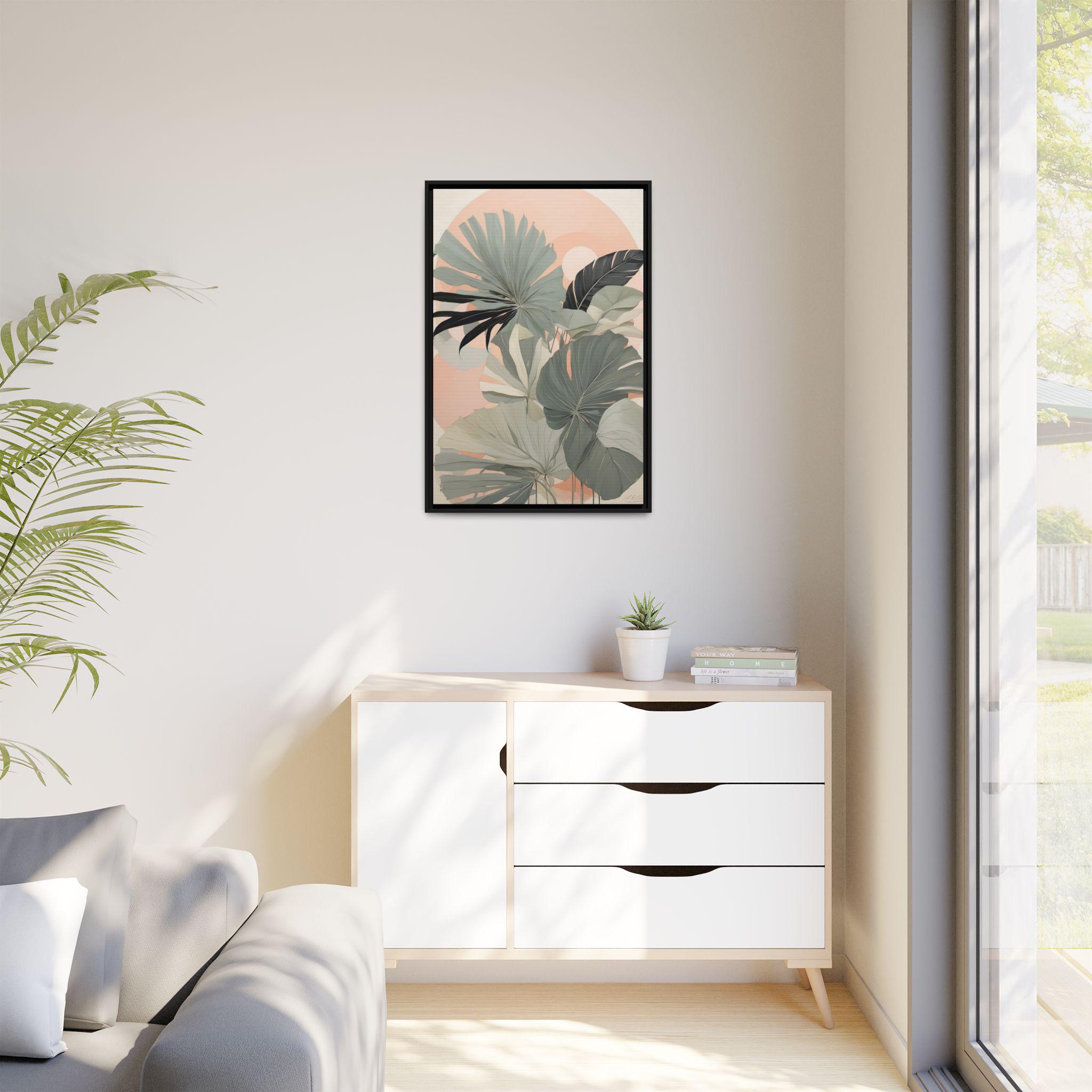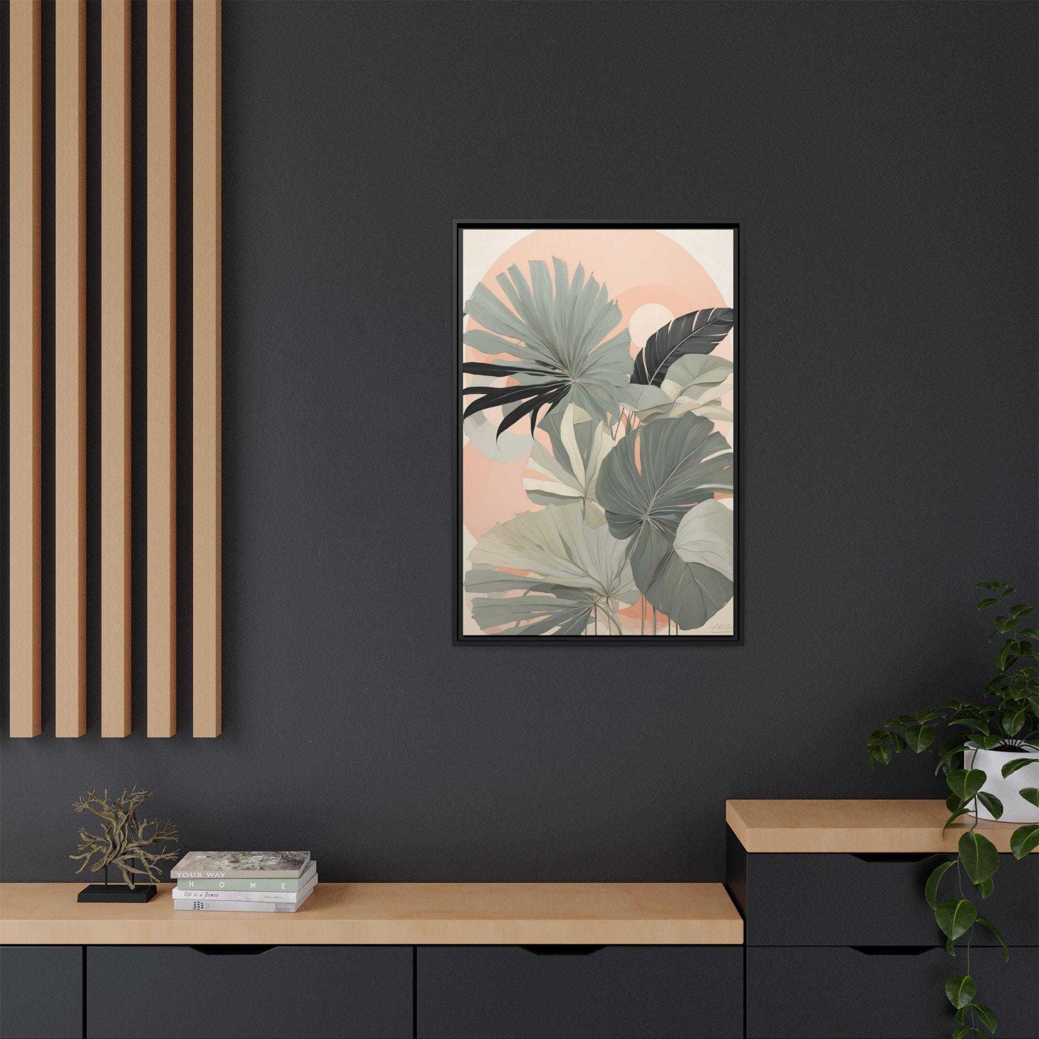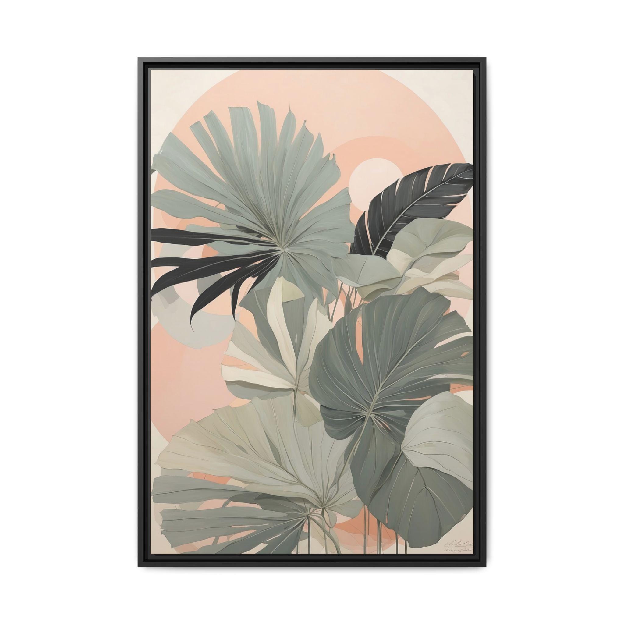 Perfect for modern interiors, this artwork adds gentle sophistication to living spaces, bedrooms, or offices. The pastel tones ensure versatility, while the palm leaf overlays evoke a calm, airy atmosphere ideal for contemporary design.