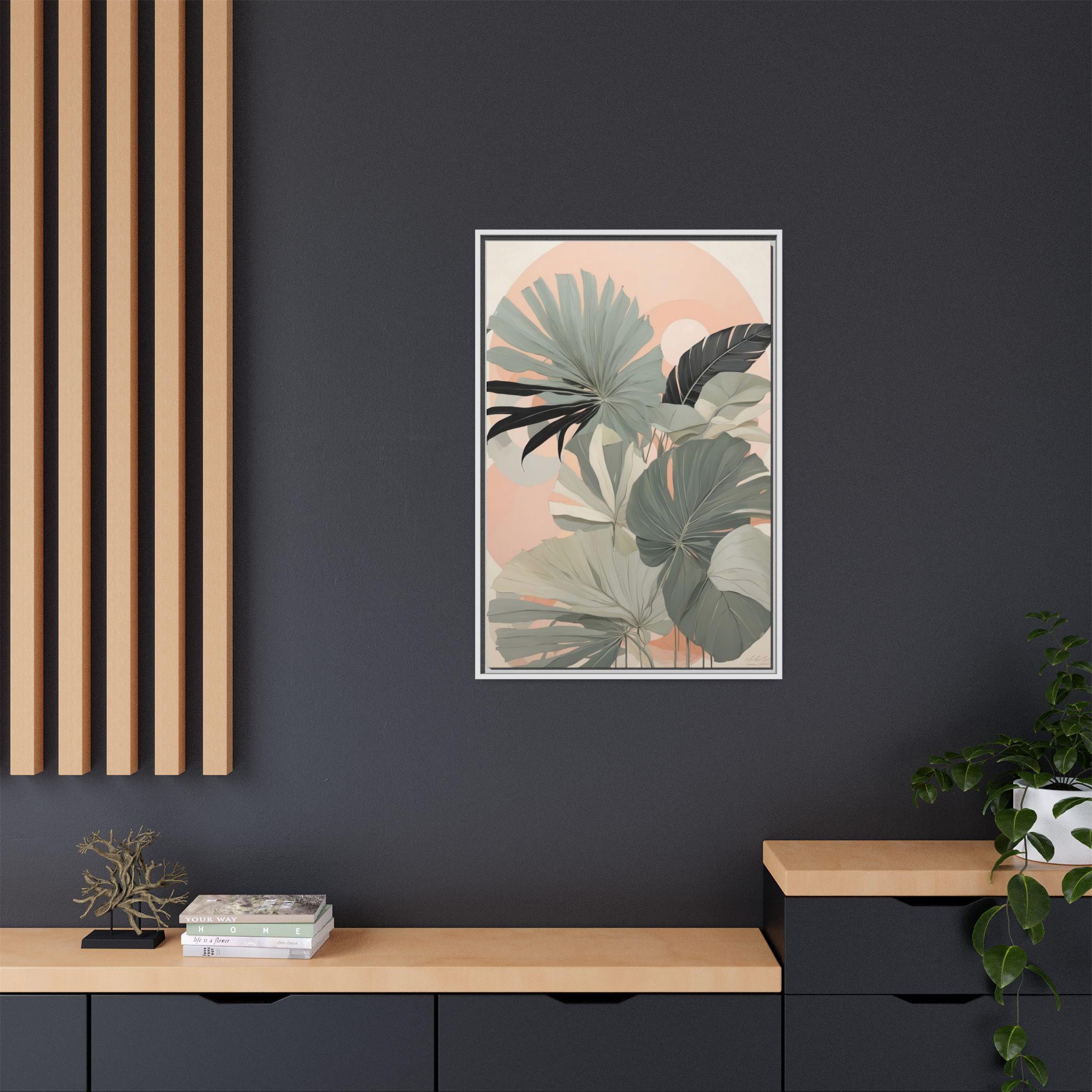 "Sage Horizon" blends the organic elegance of palm leaf silhouettes with the clean precision of pastel geometric half-circles. The light sage and cream palette creates a sense of openness and harmony, bringing together nature’s softness with modern minimal structure. Its composition balances flowing botanical forms against subtle geometry, producing a piece that feels both fresh and timeless.