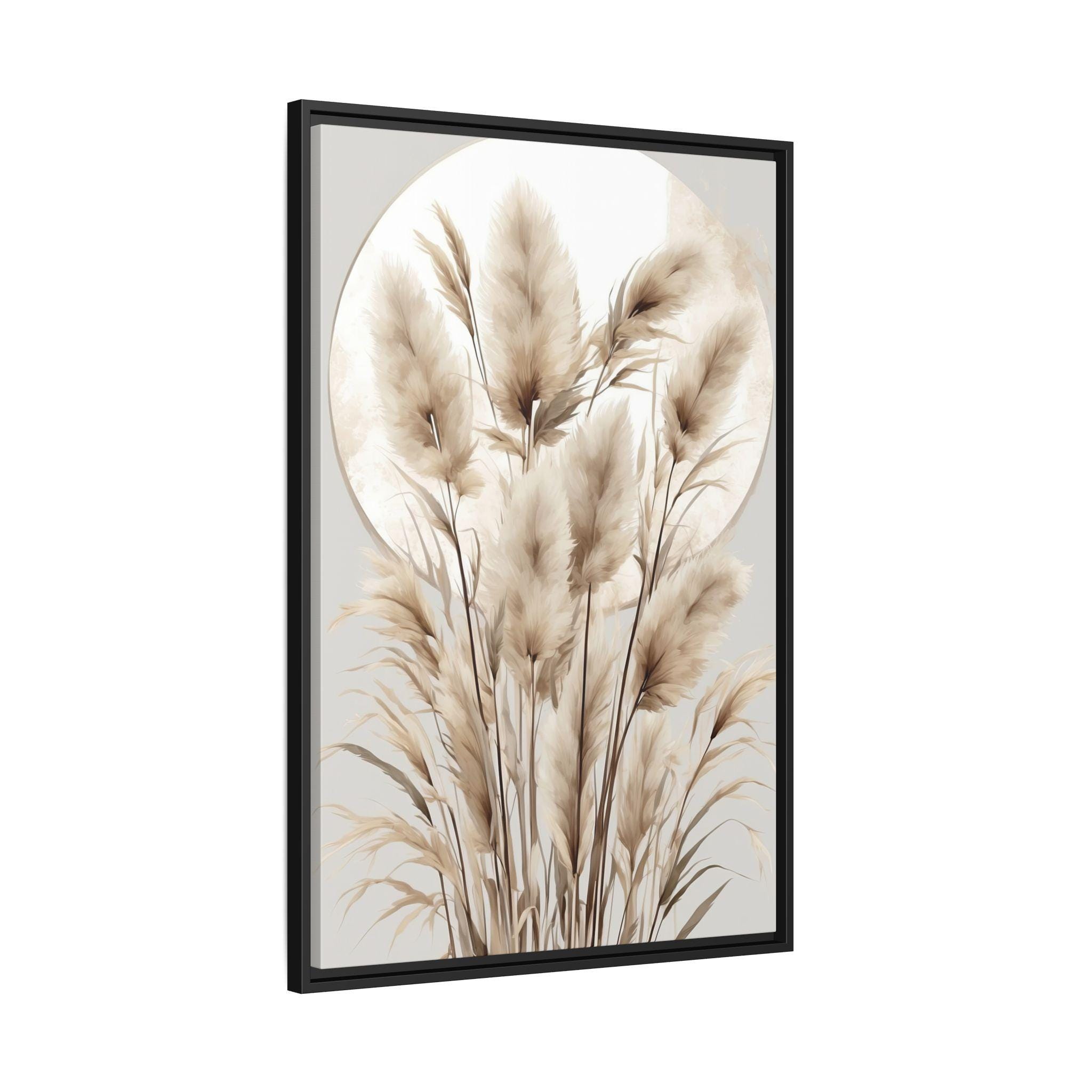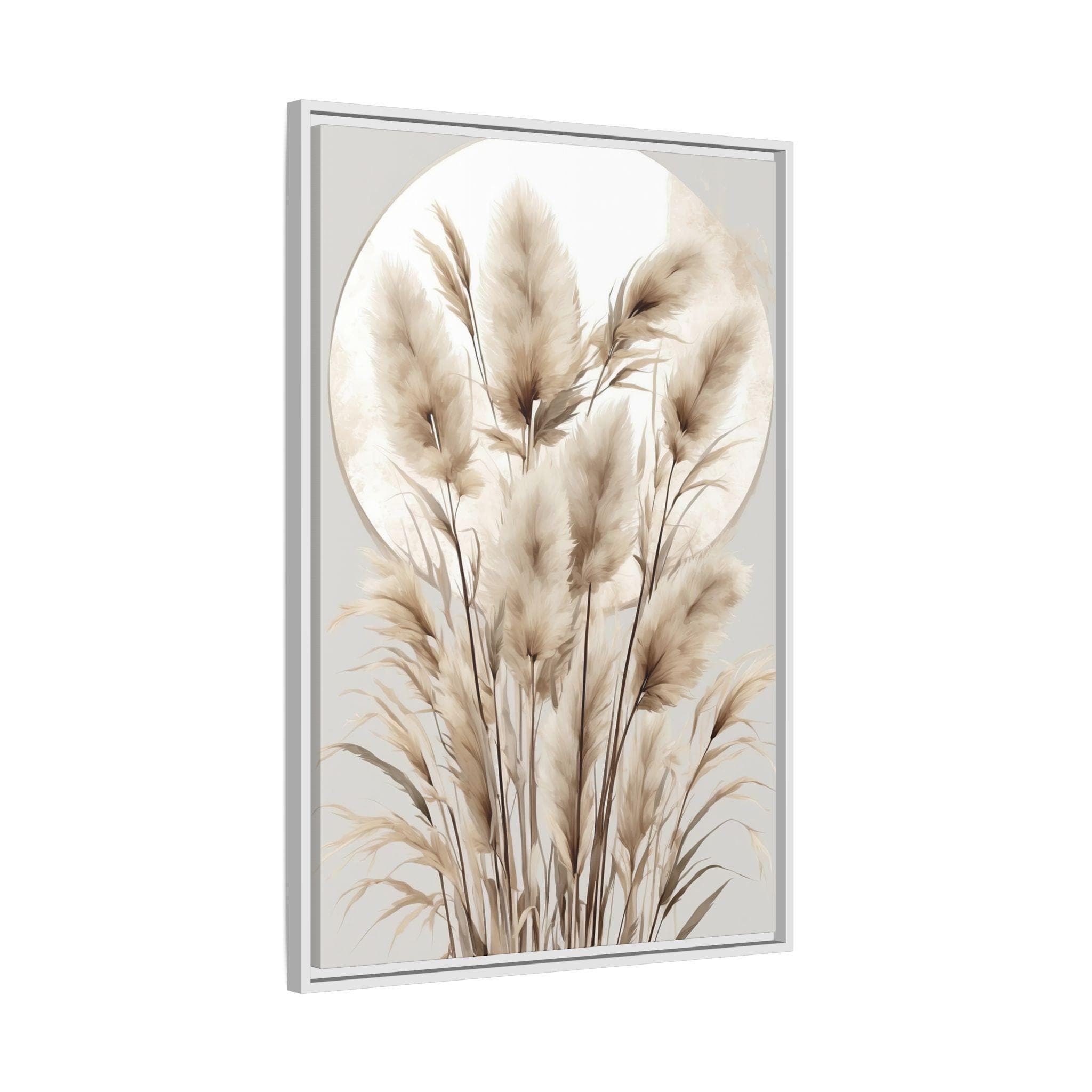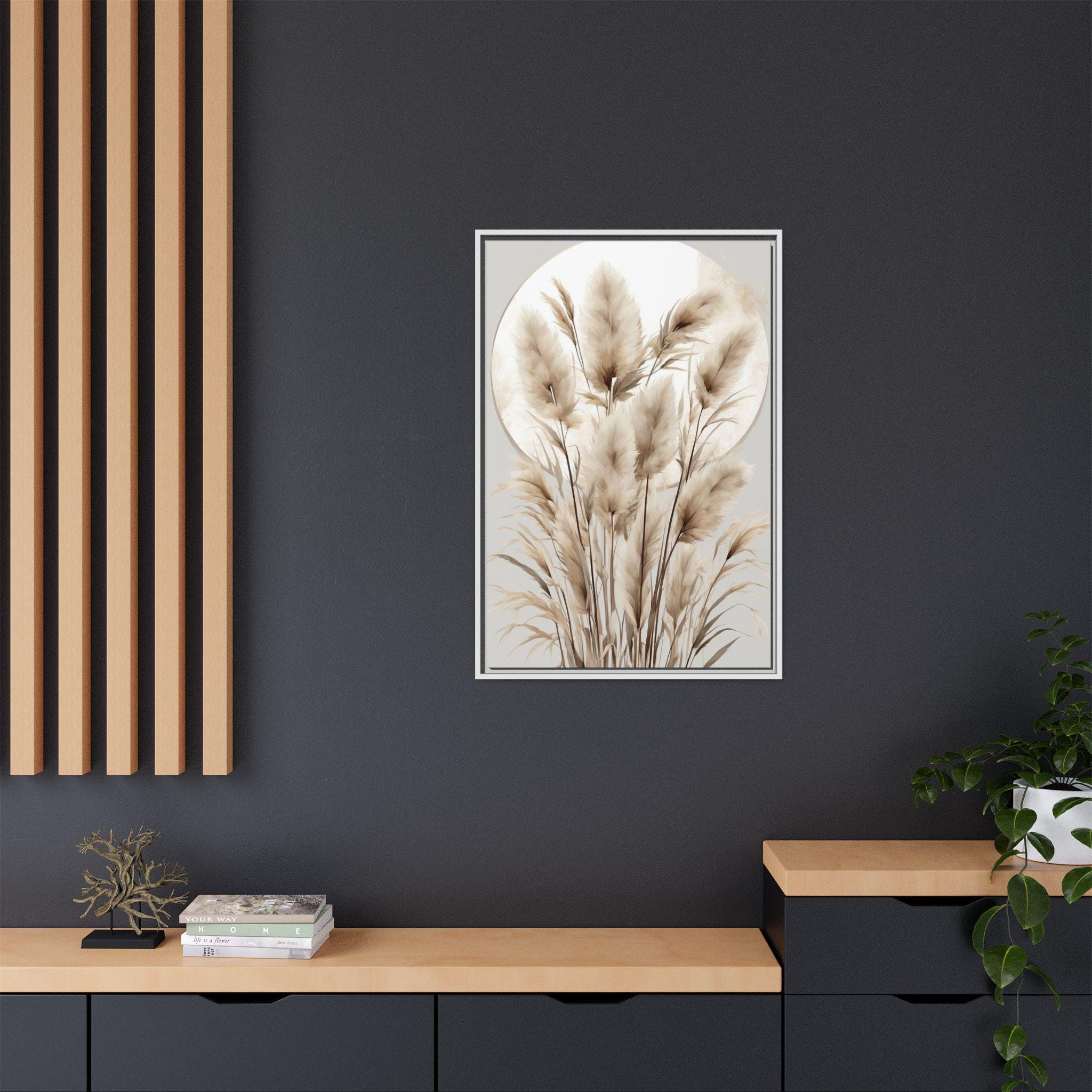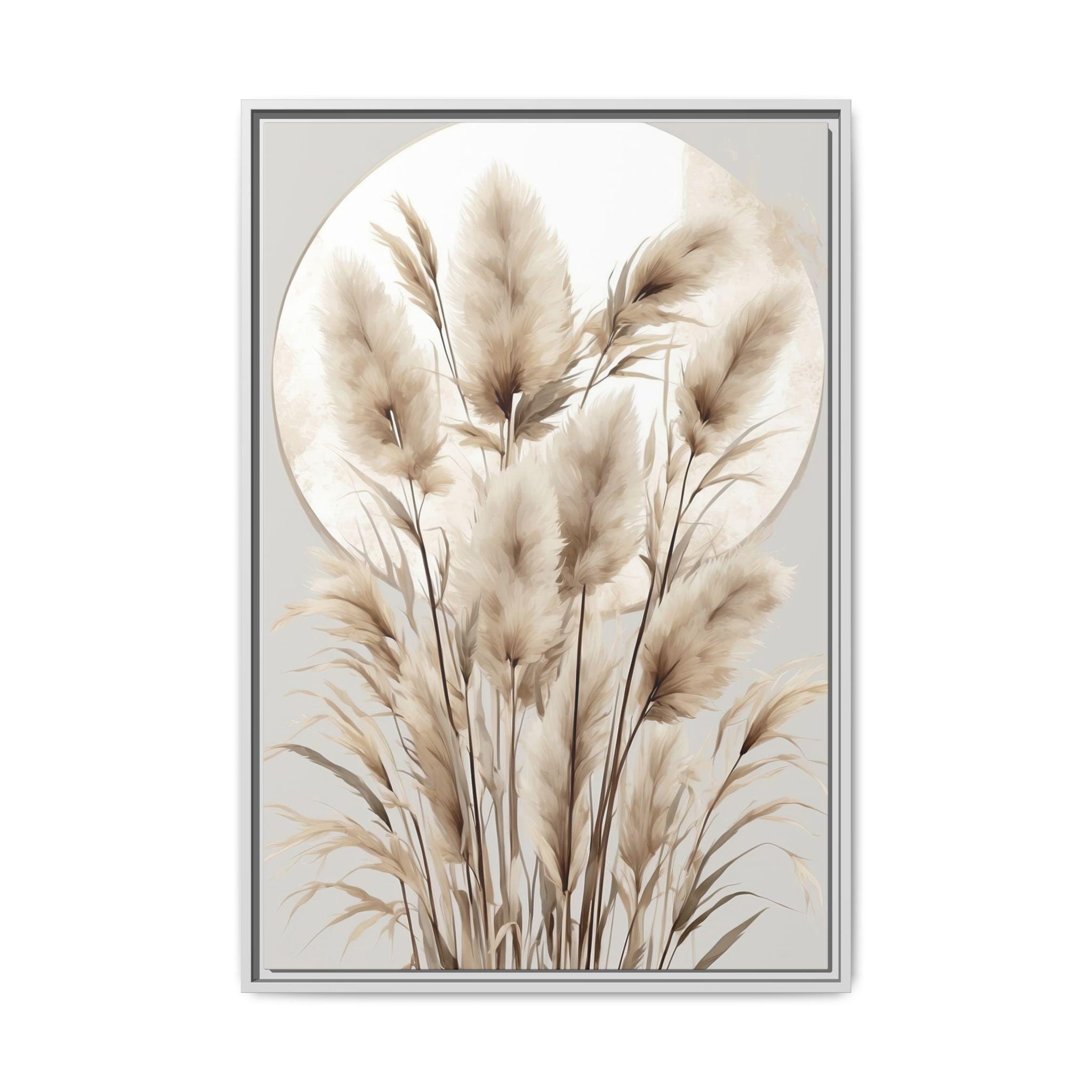 "Moonlight Pampas" blends the airy elegance of stylized pampas grass with the calm structure of pale gray circular forms. The muted beige watercolor tones highlight the soft organic texture of the stems, while the geometric layering creates a subtle sense of rhythm and balance. The result is a design that feels both natural and contemporary, perfect for lovers of botanical minimalism.
