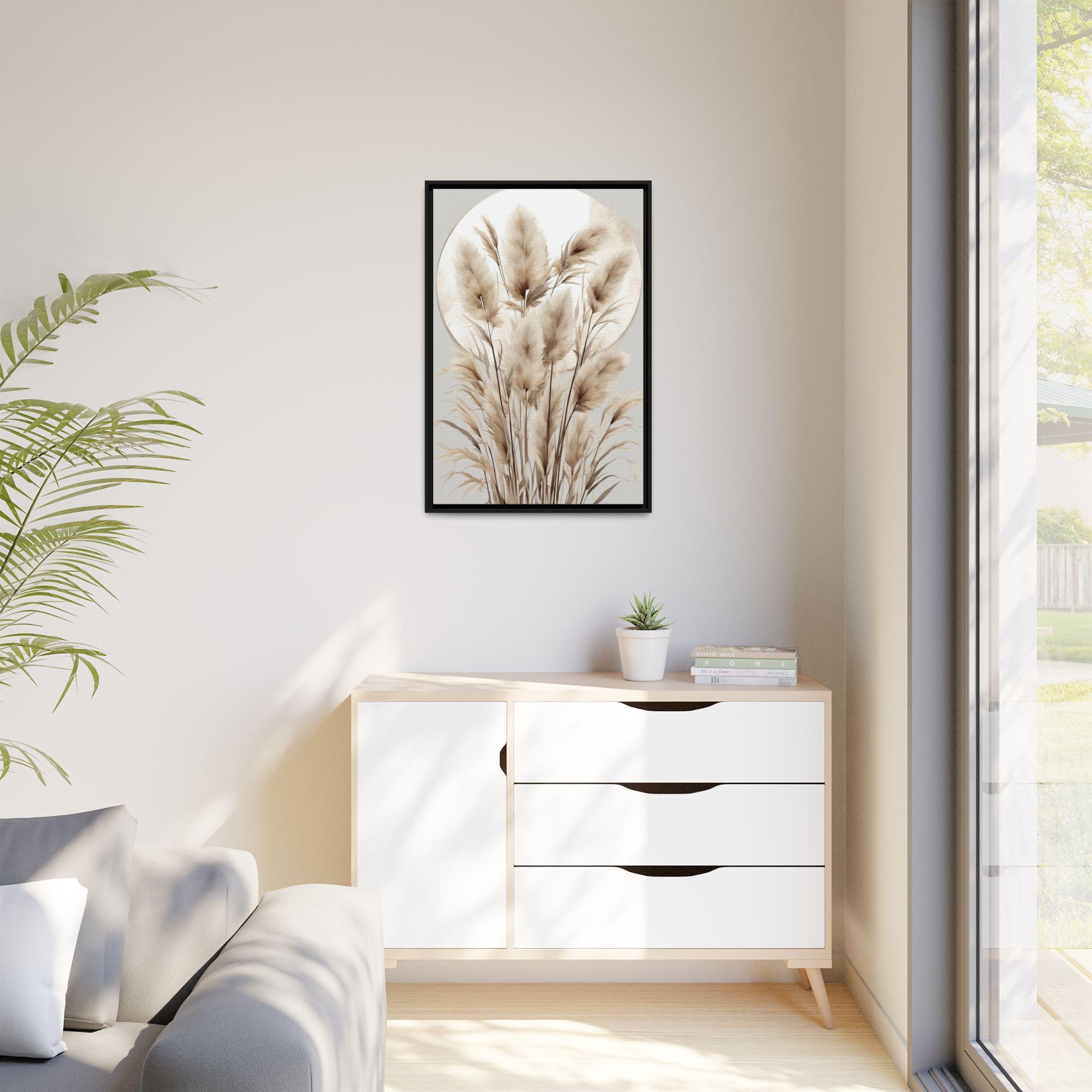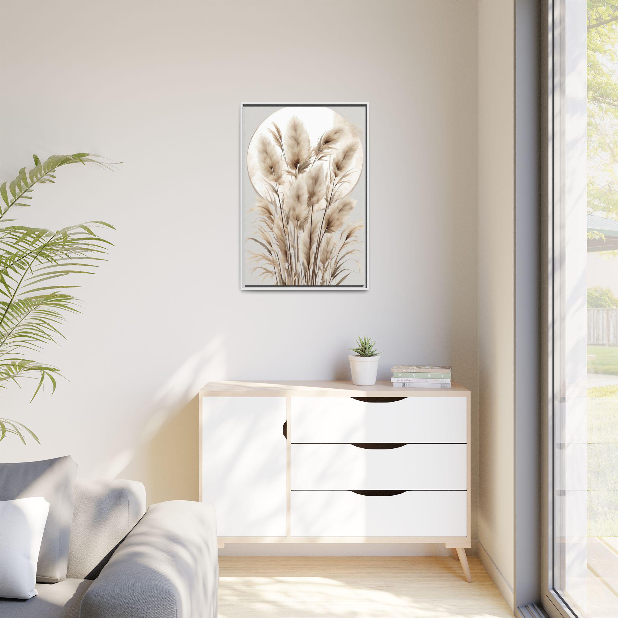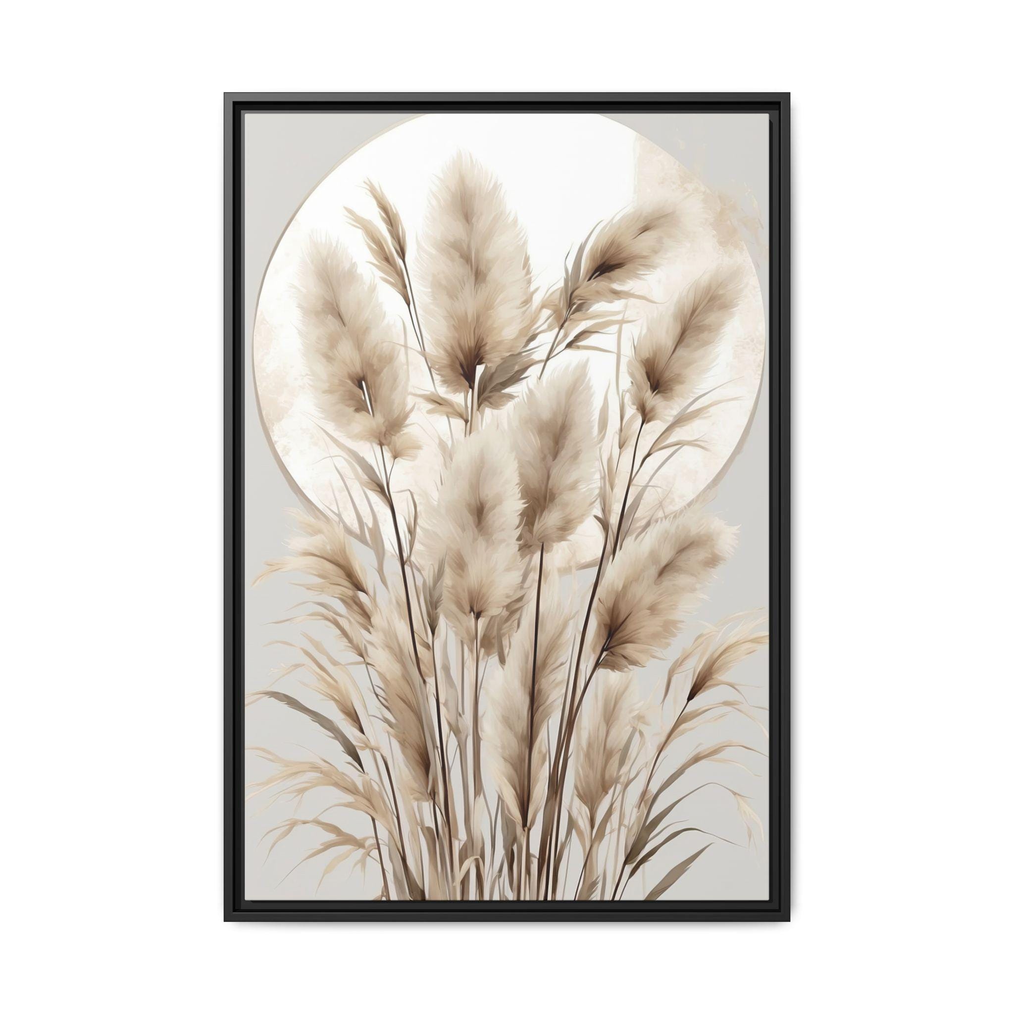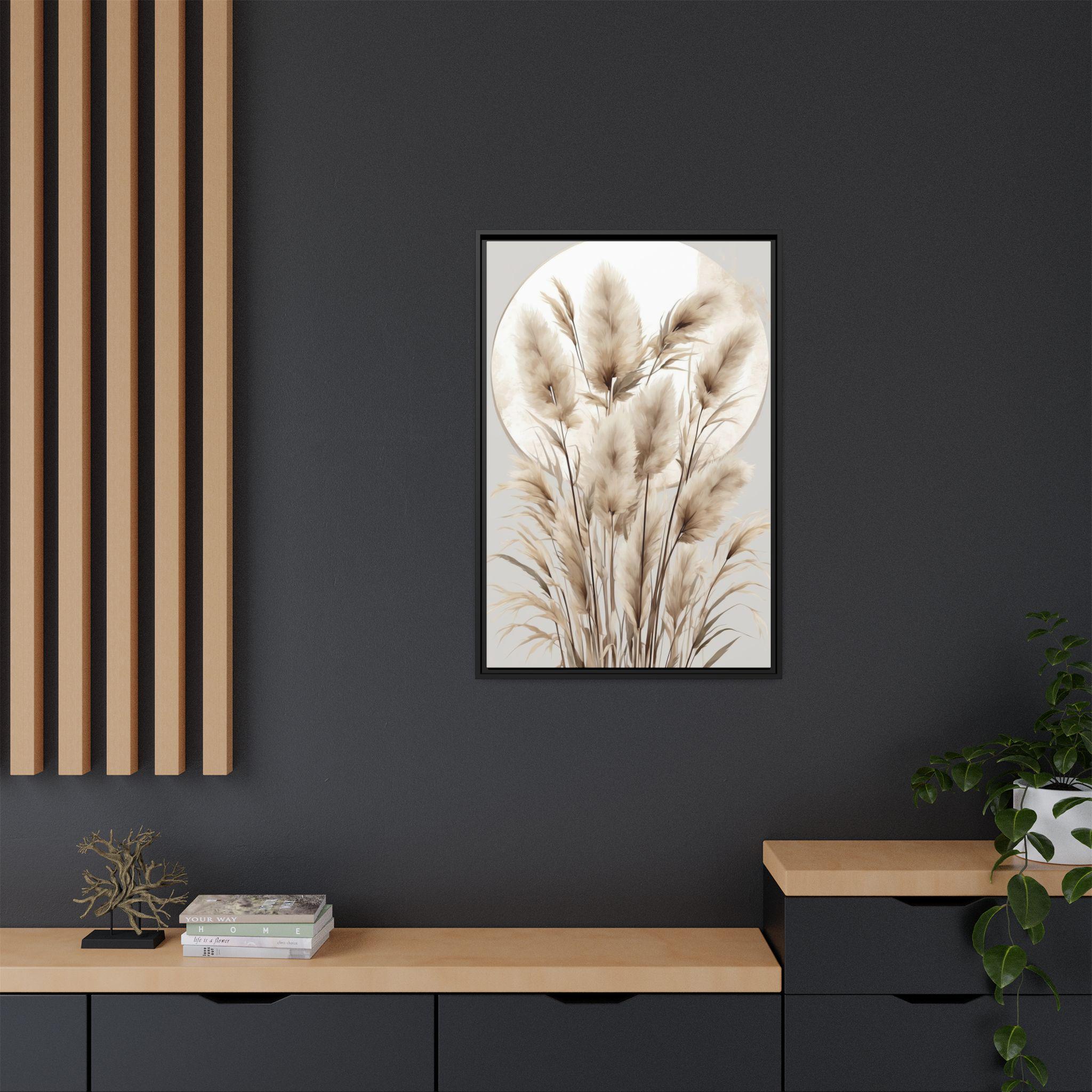 "Moonlight Pampas" blends the airy elegance of stylized pampas grass with the calm structure of pale gray circular forms. The muted beige watercolor tones highlight the soft organic texture of the stems, while the geometric layering creates a subtle sense of rhythm and balance. The result is a design that feels both natural and contemporary, perfect for lovers of botanical minimalism.