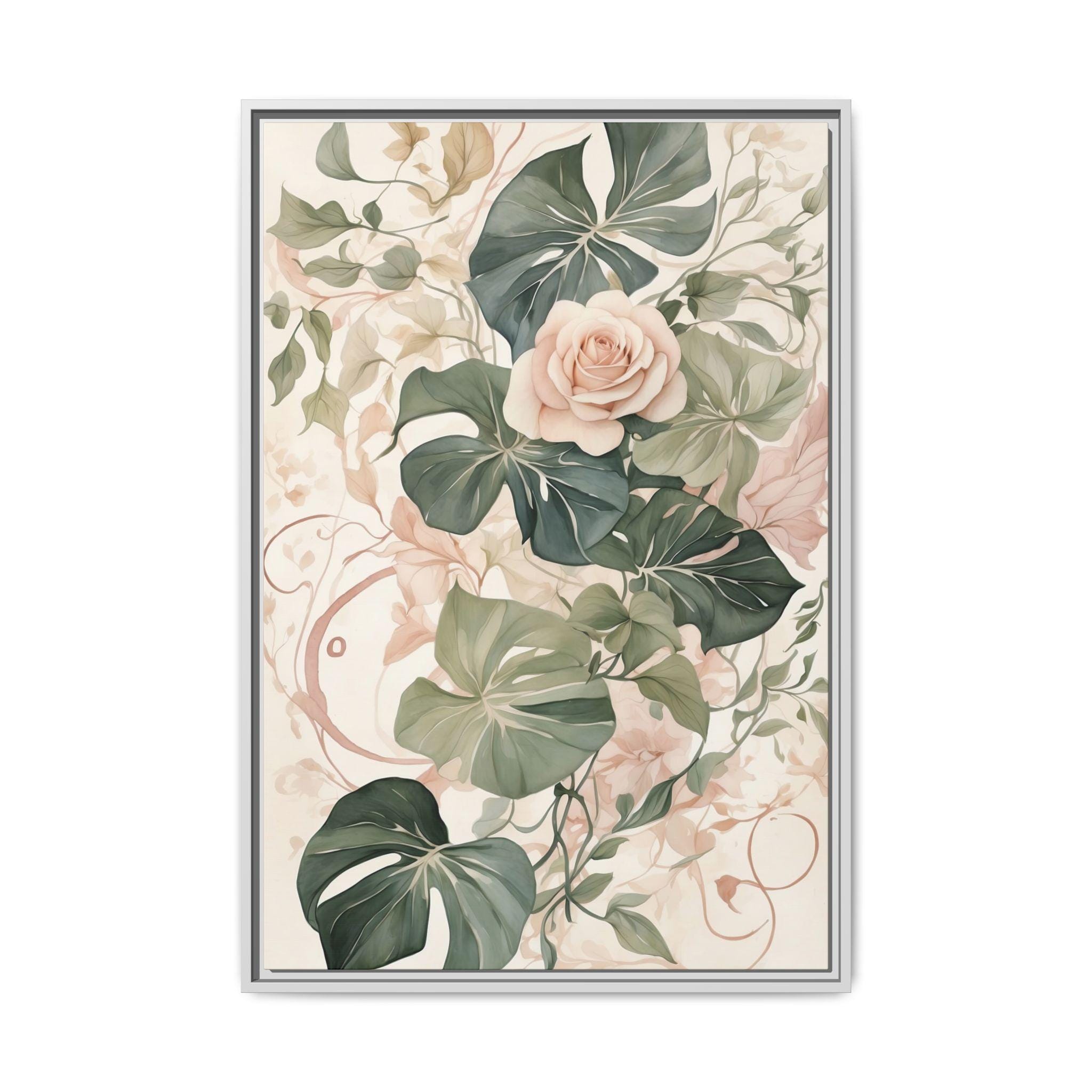 "Emerald Crescendo" showcases the elegant sweep of trailing Pothos vines, forming a loose spiral over a soft watercolor background in cream, sage, and muted coral tones. This contemporary botanical composition blends modern minimalism with natural sophistication, creating a serene and captivating focal point.
