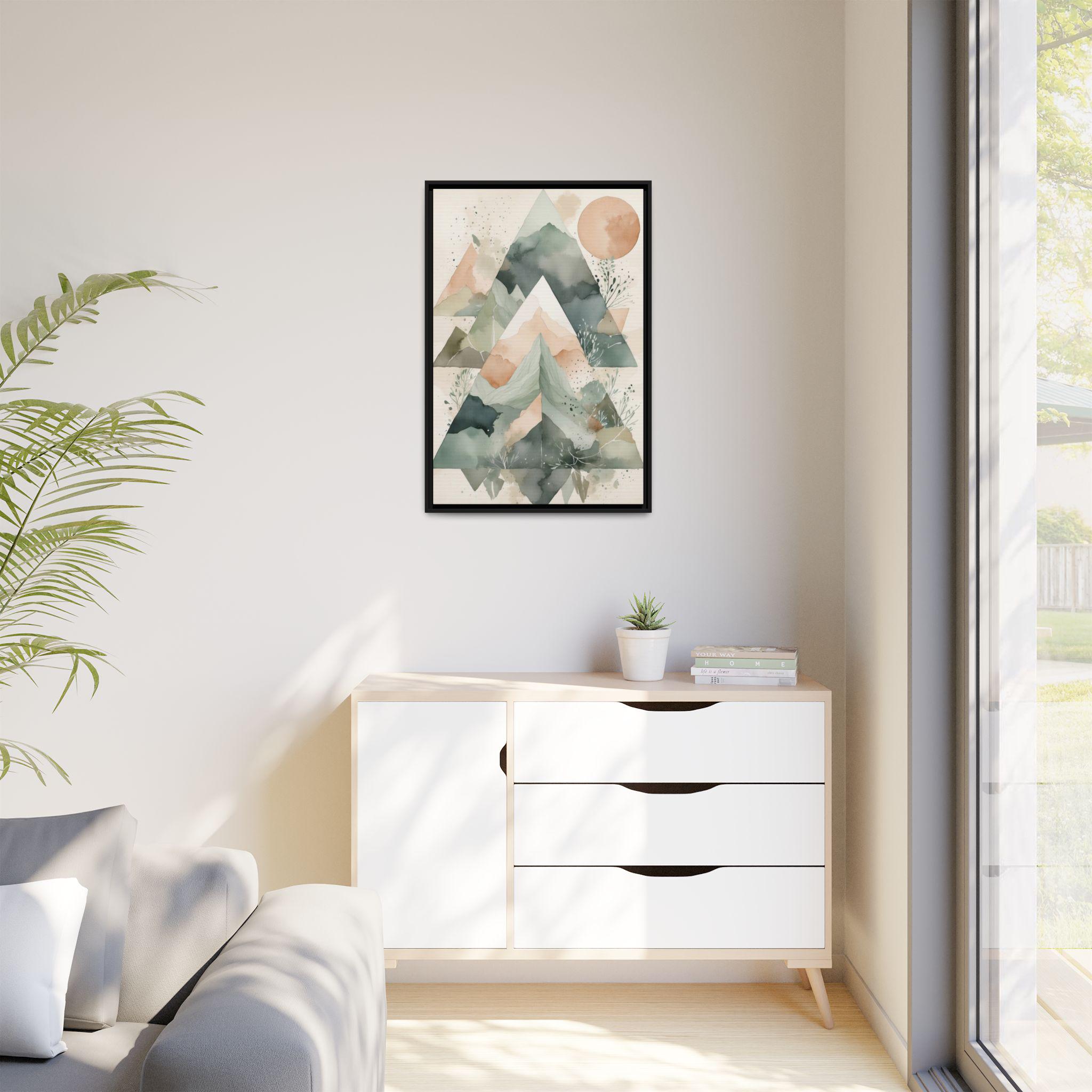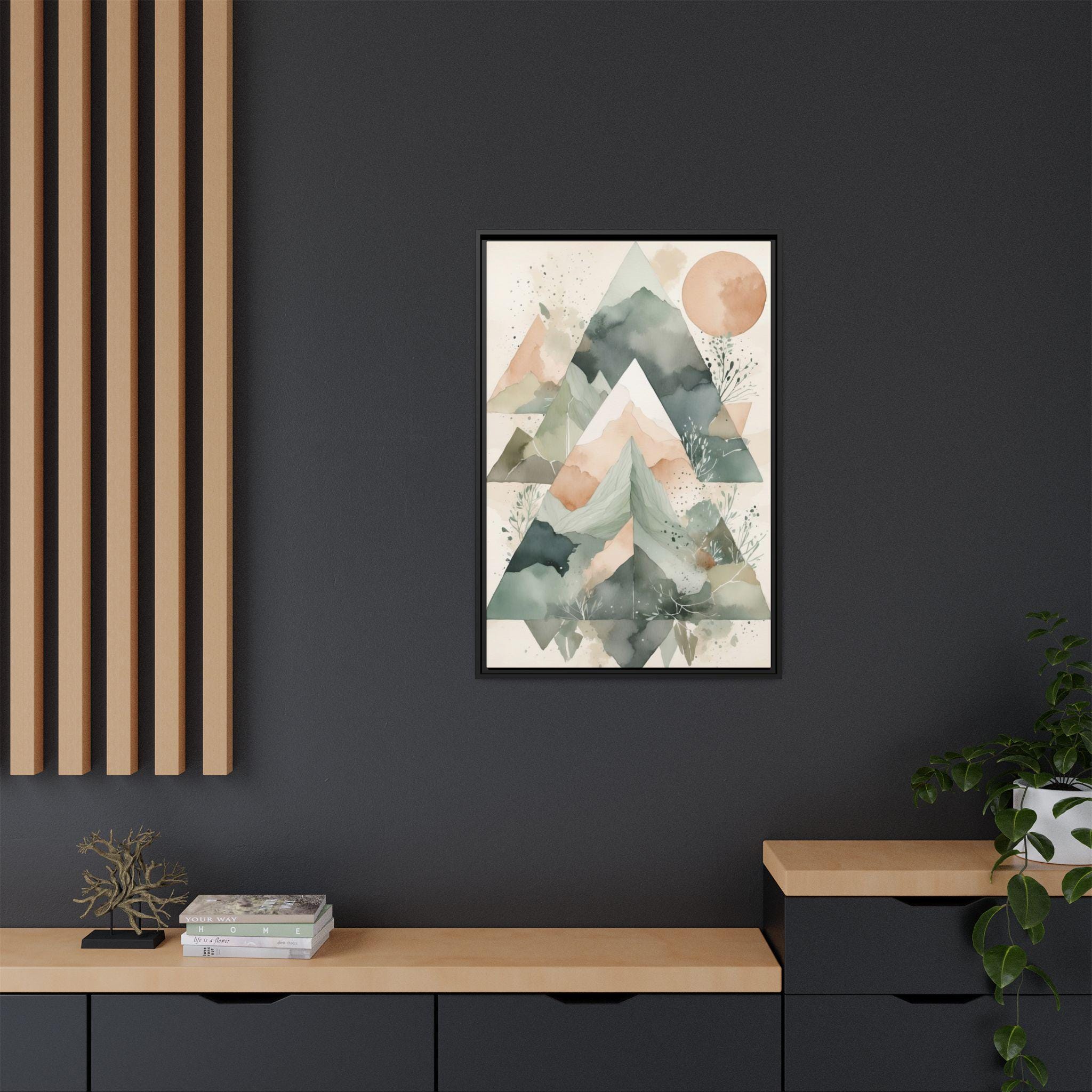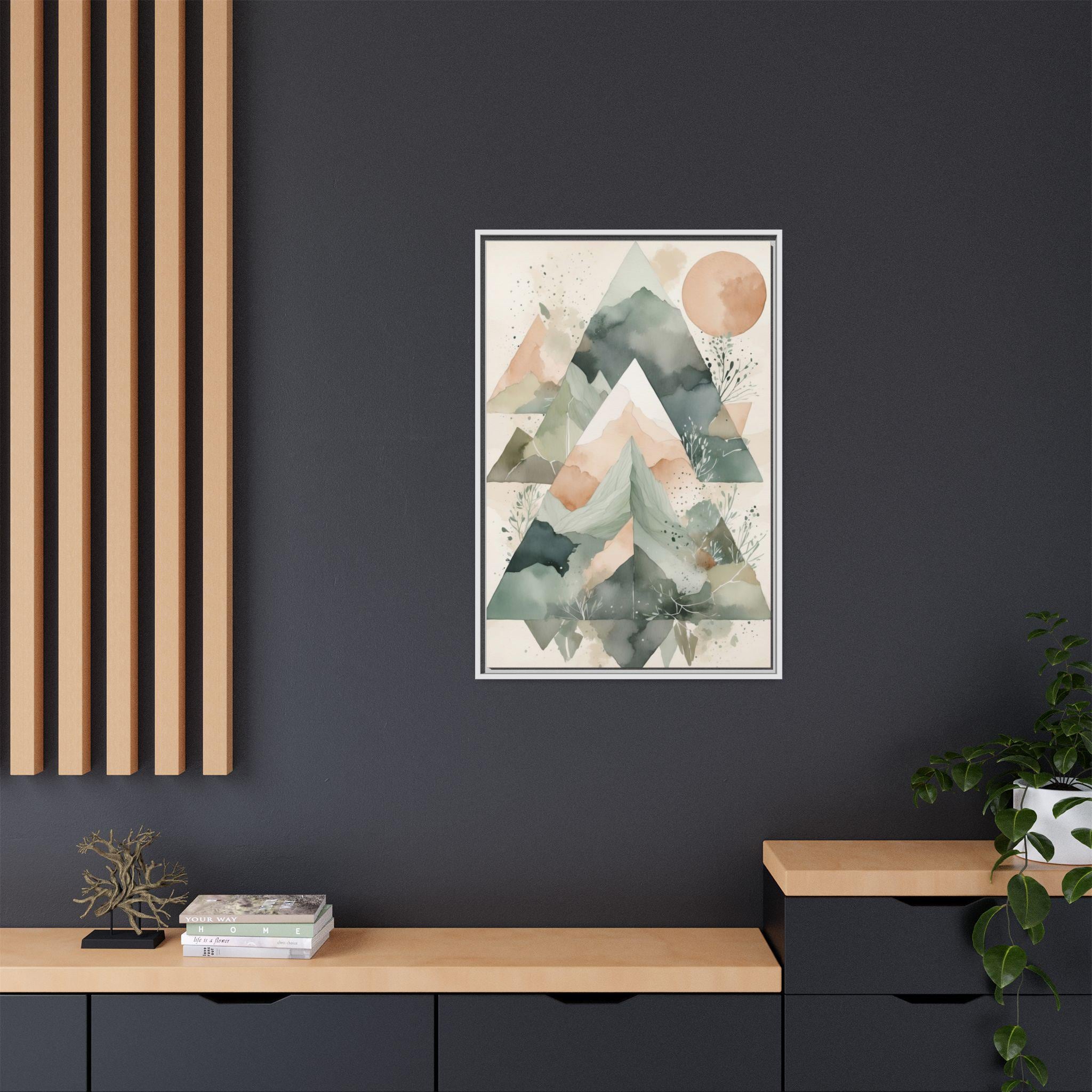 "Eucalyptus Peaks" showcases geometric mountain-like triangles layered with soft eucalyptus watercolor textures in pastel beige and sage hues. The composition merges modern geometric design with botanical elegance, creating a serene and sophisticated artwork.