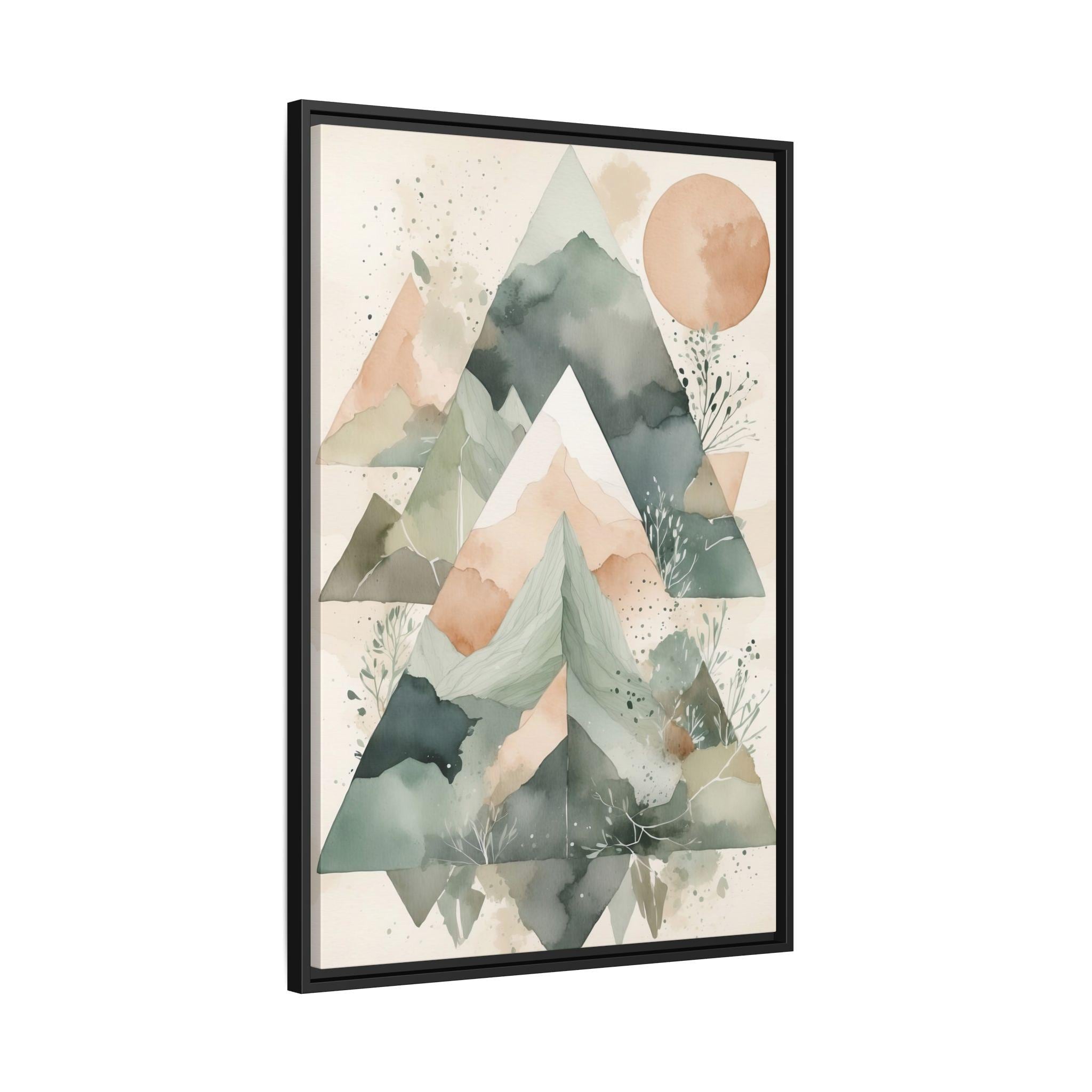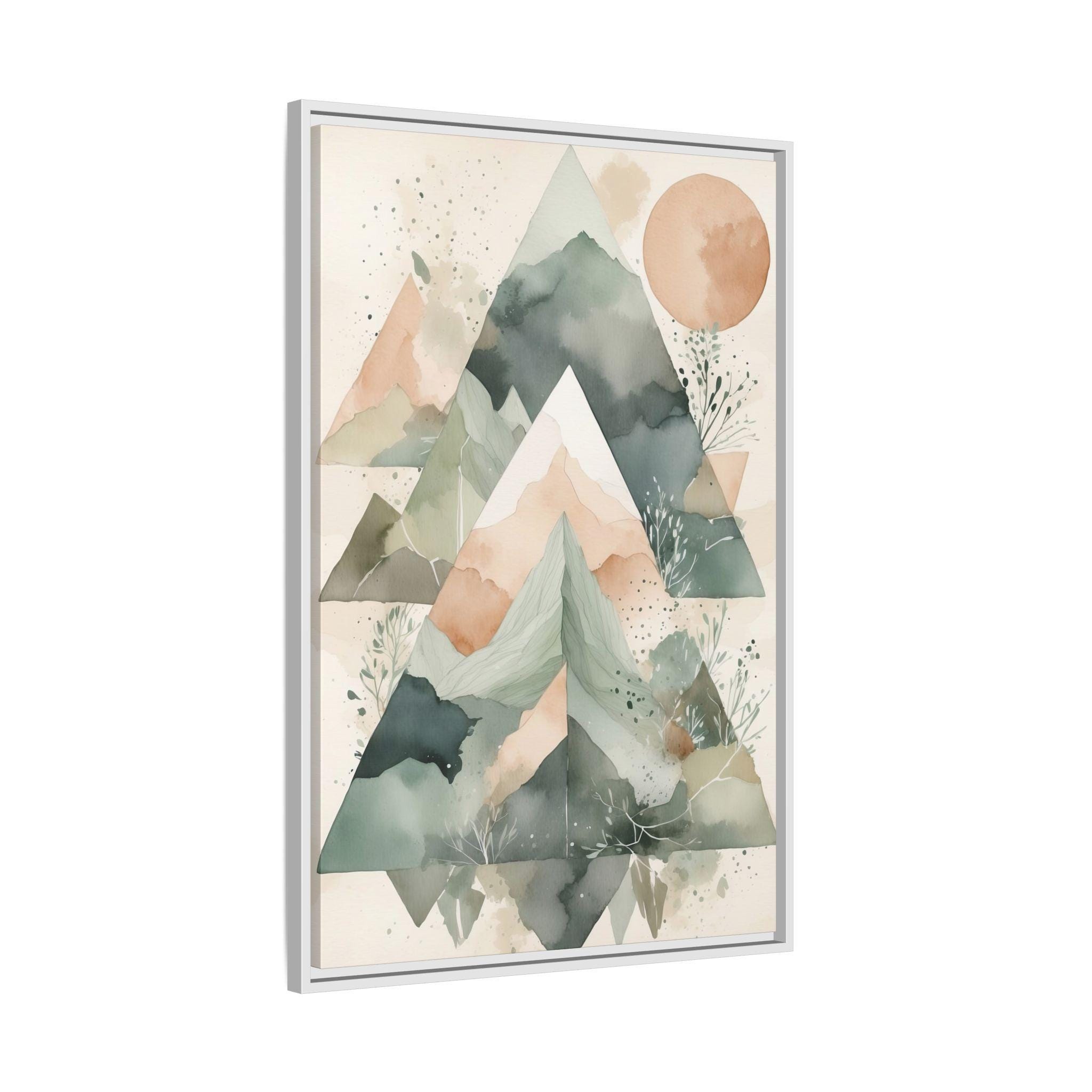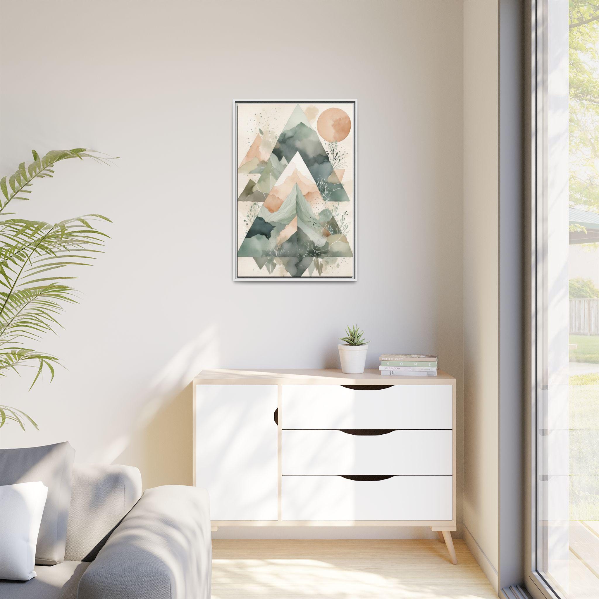"Eucalyptus Peaks" showcases geometric mountain-like triangles layered with soft eucalyptus watercolor textures in pastel beige and sage hues. The composition merges modern geometric design with botanical elegance, creating a serene and sophisticated artwork.