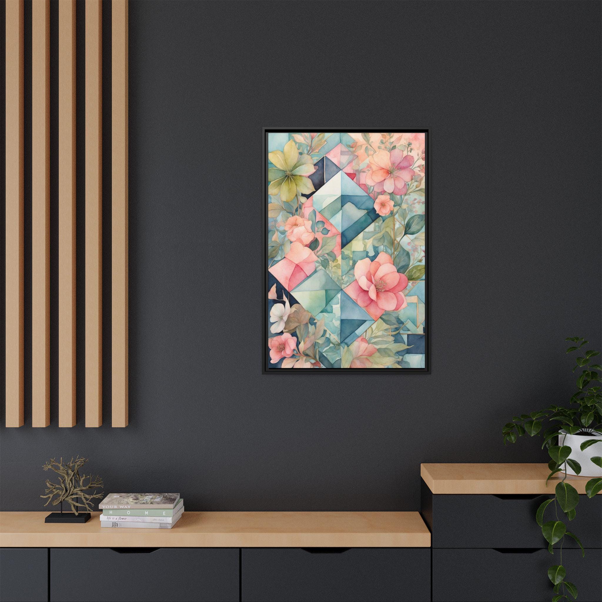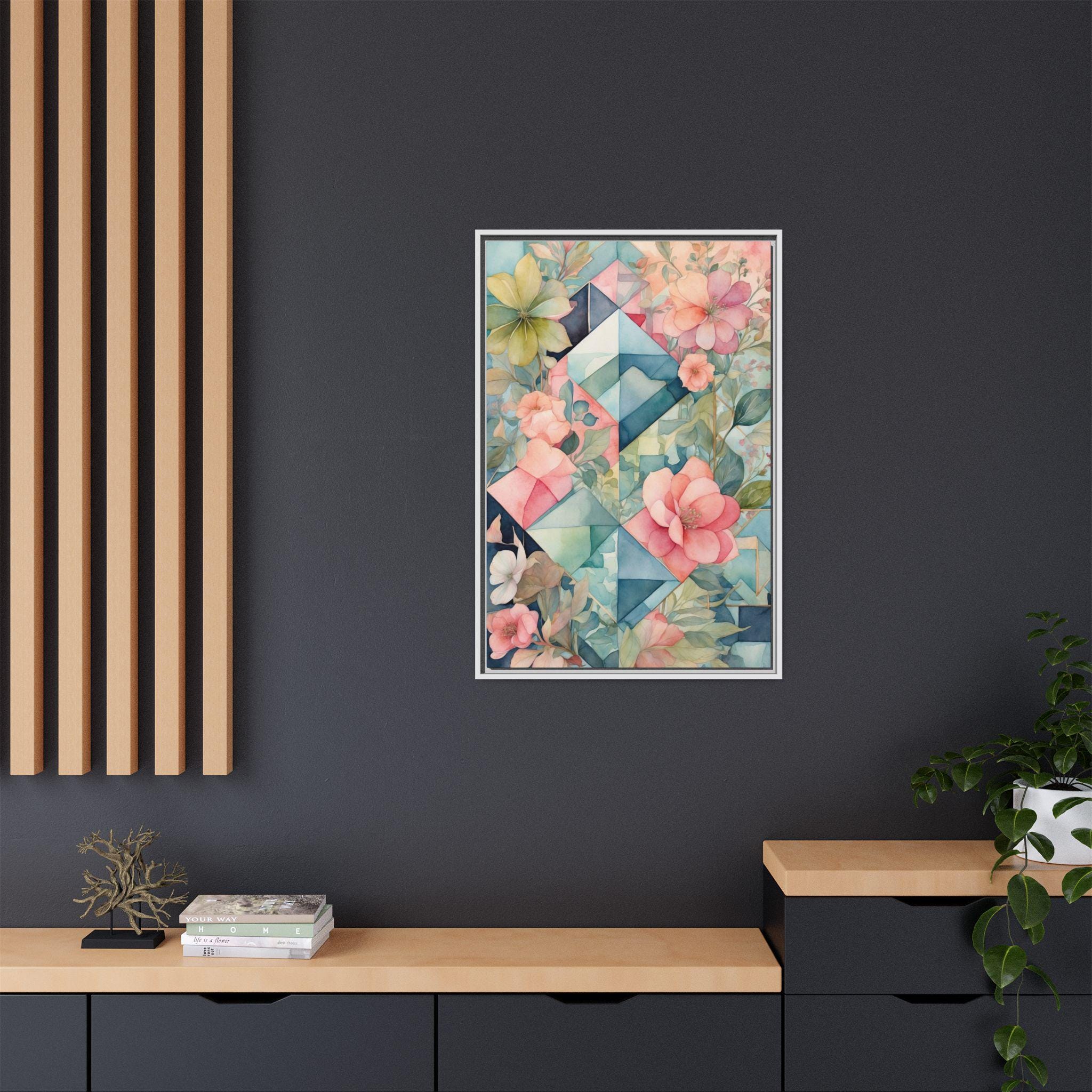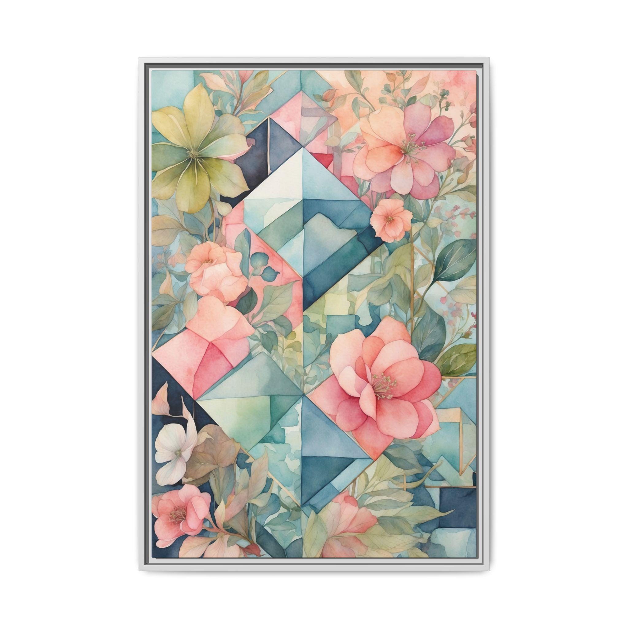 "Floral Cubes" features geometric cube shapes interwoven with delicate floral watercolor patterns in pastel blues, greens, and soft pinks. The composition blends modern geometry with botanical elegance, creating a visually intriguing and sophisticated artwork.