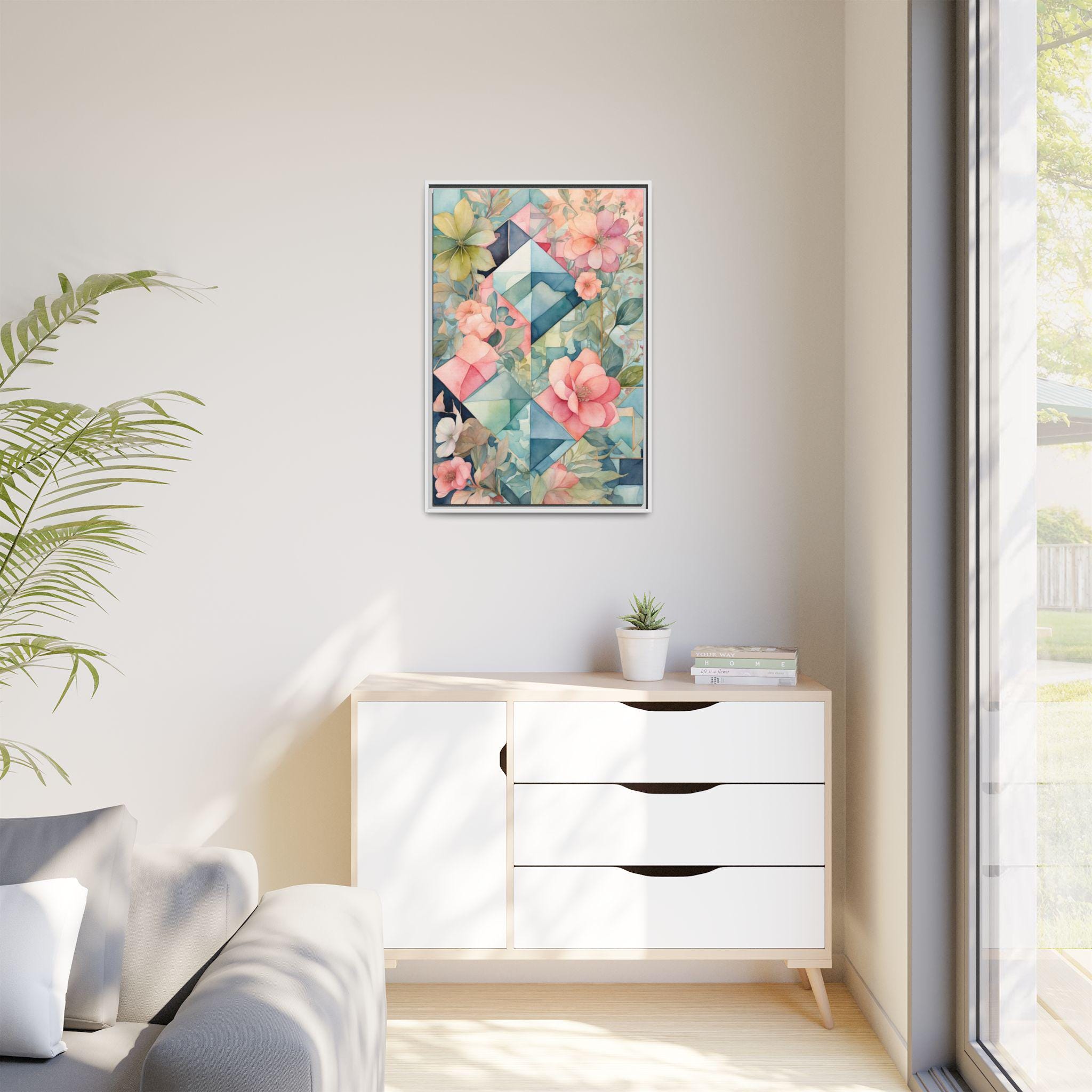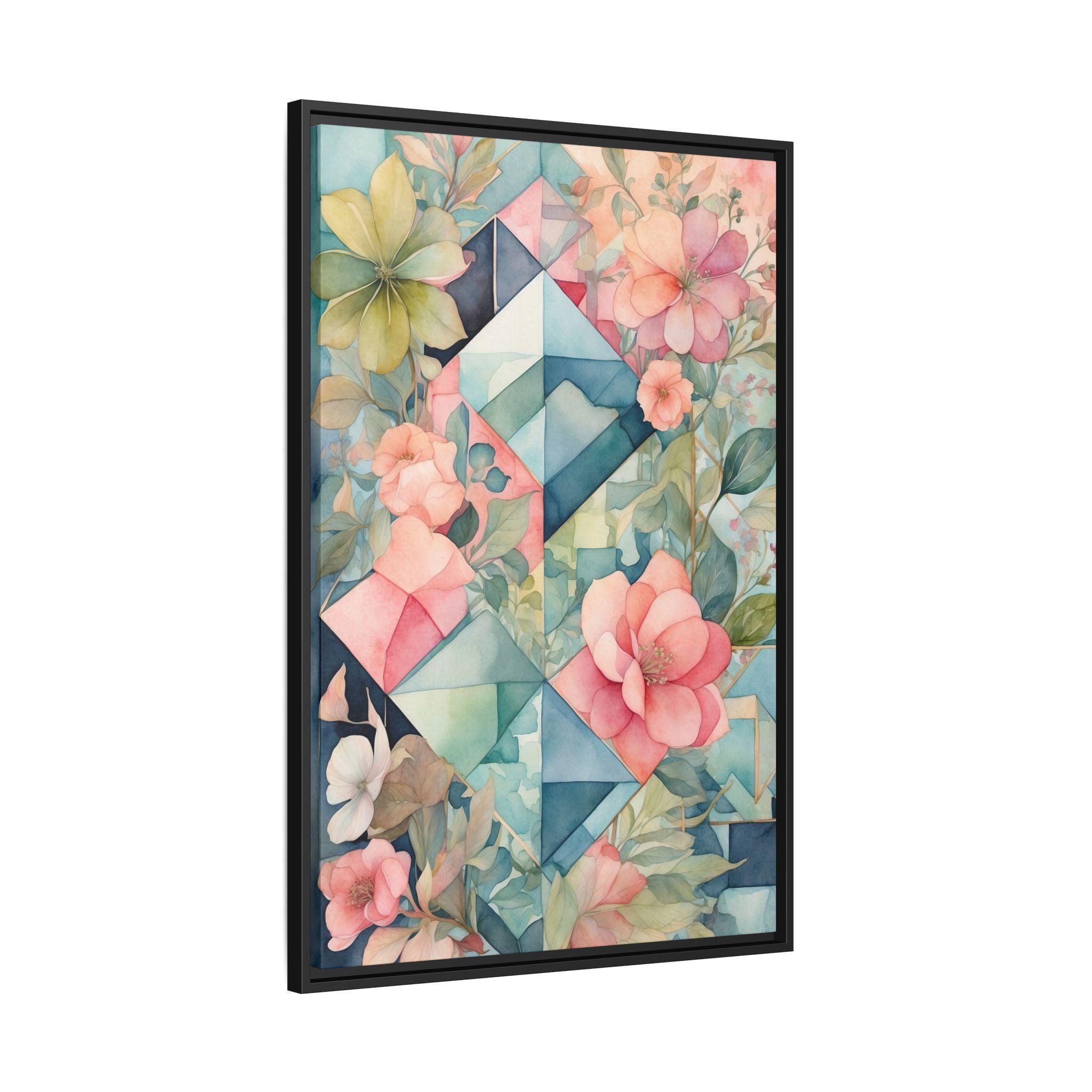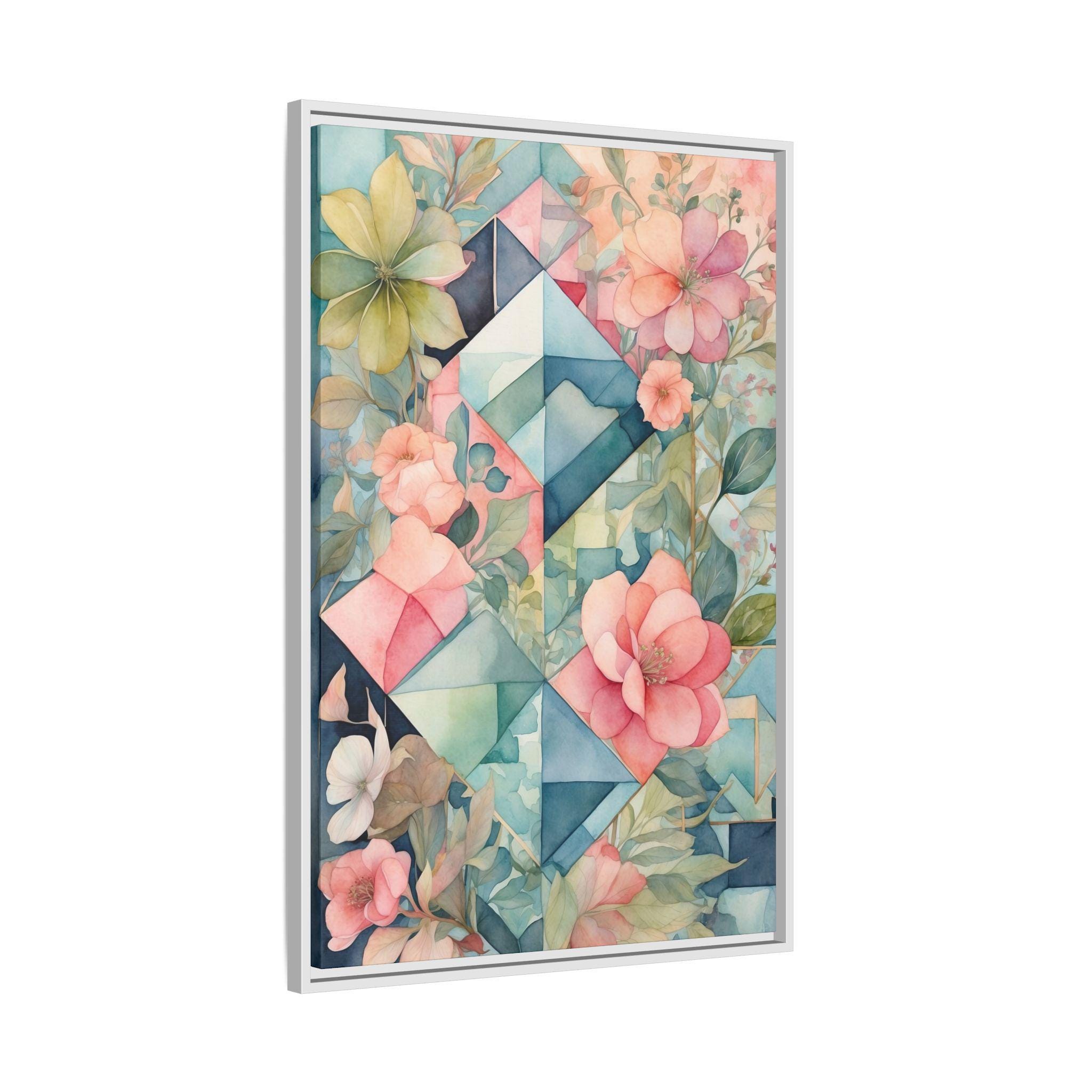 "Floral Cubes" features geometric cube shapes interwoven with delicate floral watercolor patterns in pastel blues, greens, and soft pinks. The composition blends modern geometry with botanical elegance, creating a visually intriguing and sophisticated artwork.