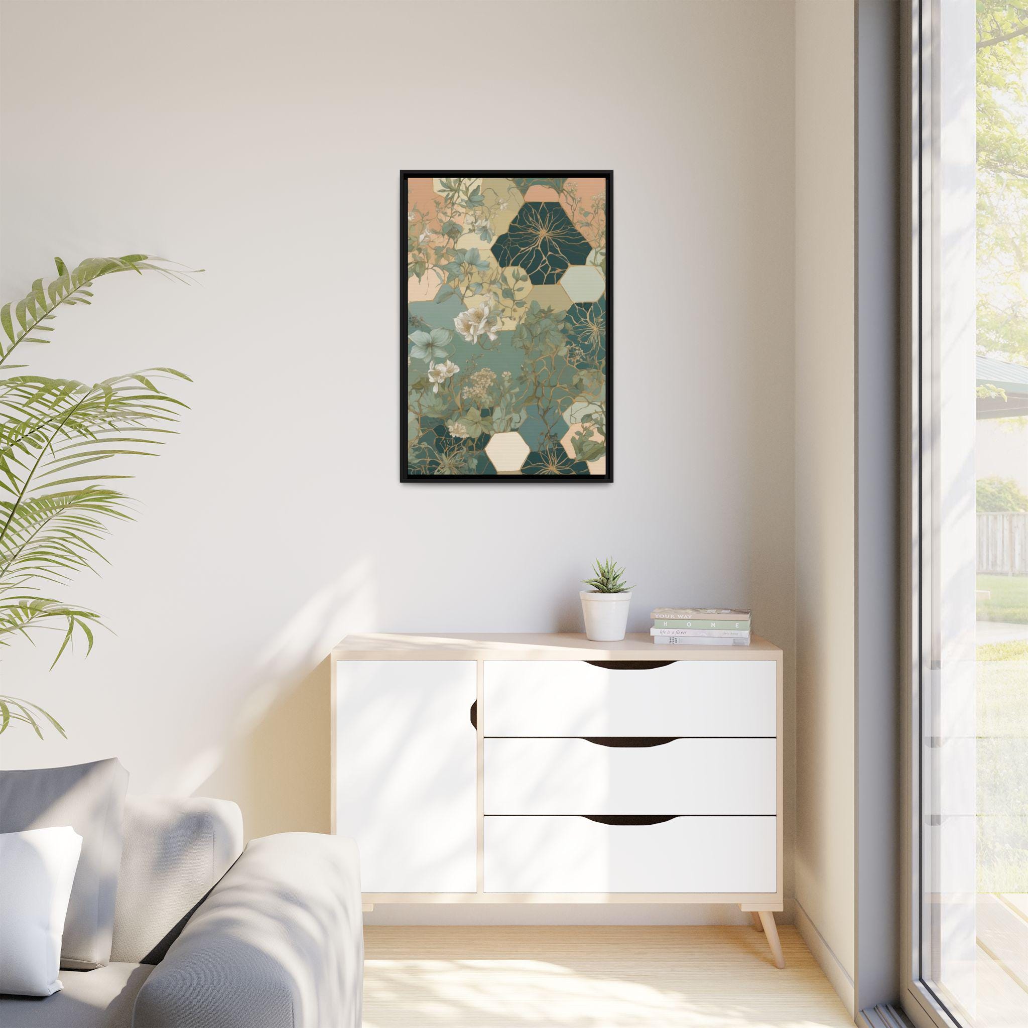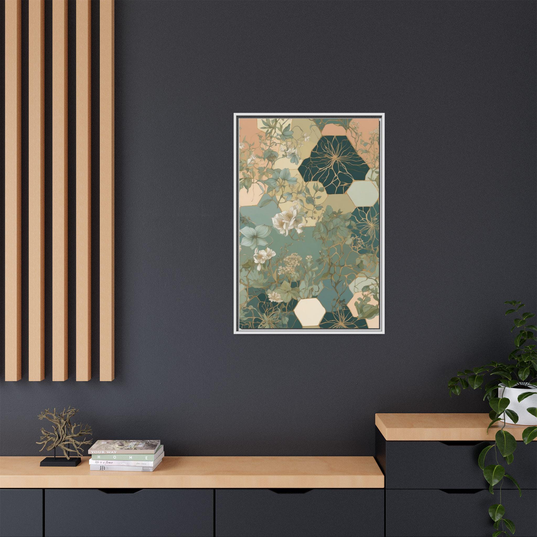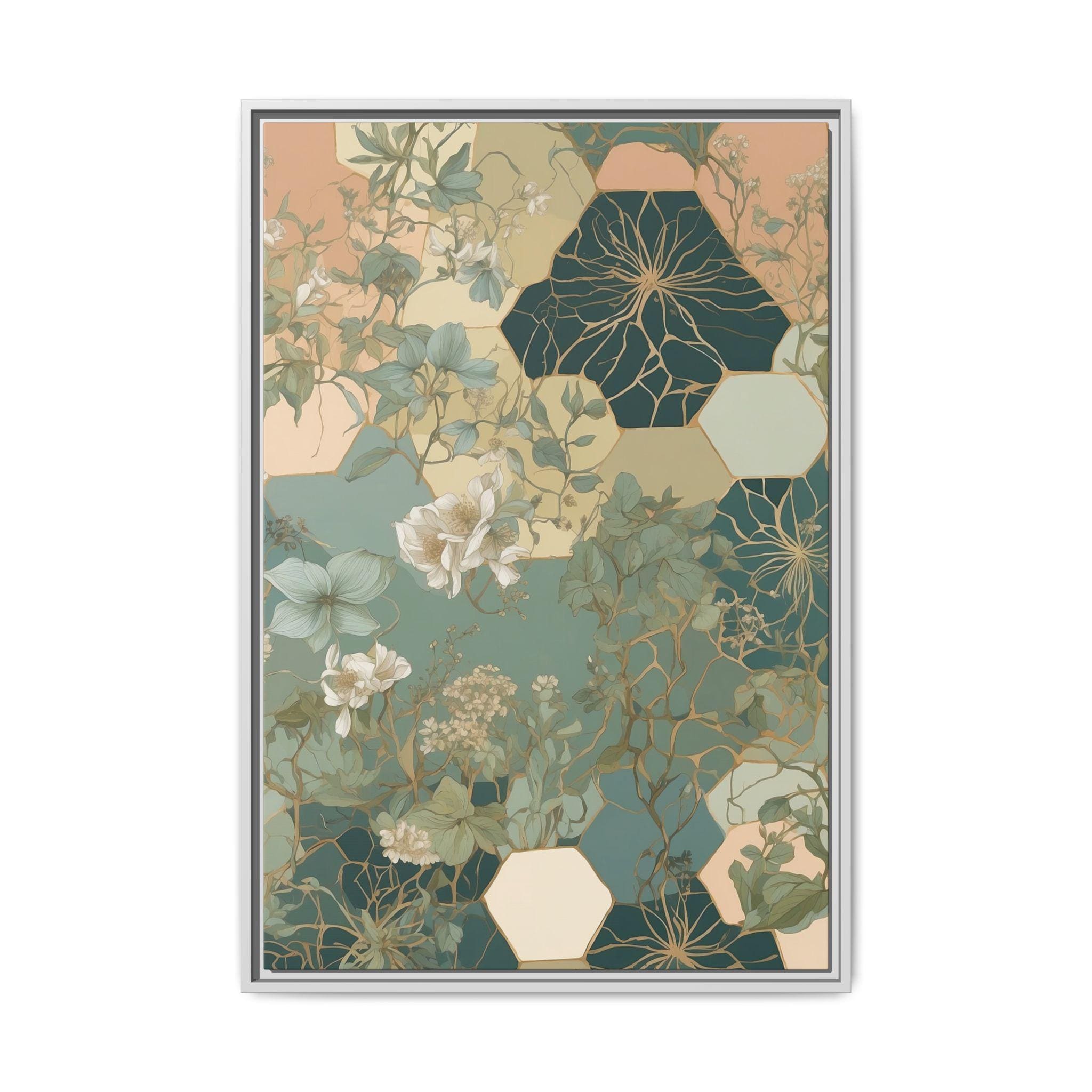 "Honeyed Vines" intertwines delicate botanical vines with abstract honeycomb-inspired hexagonal patterns, creating a modern geometric botanical composition. Muted pastel greens and soft sand tones evoke a calming, organic elegance, blending structure and nature in perfect harmony.