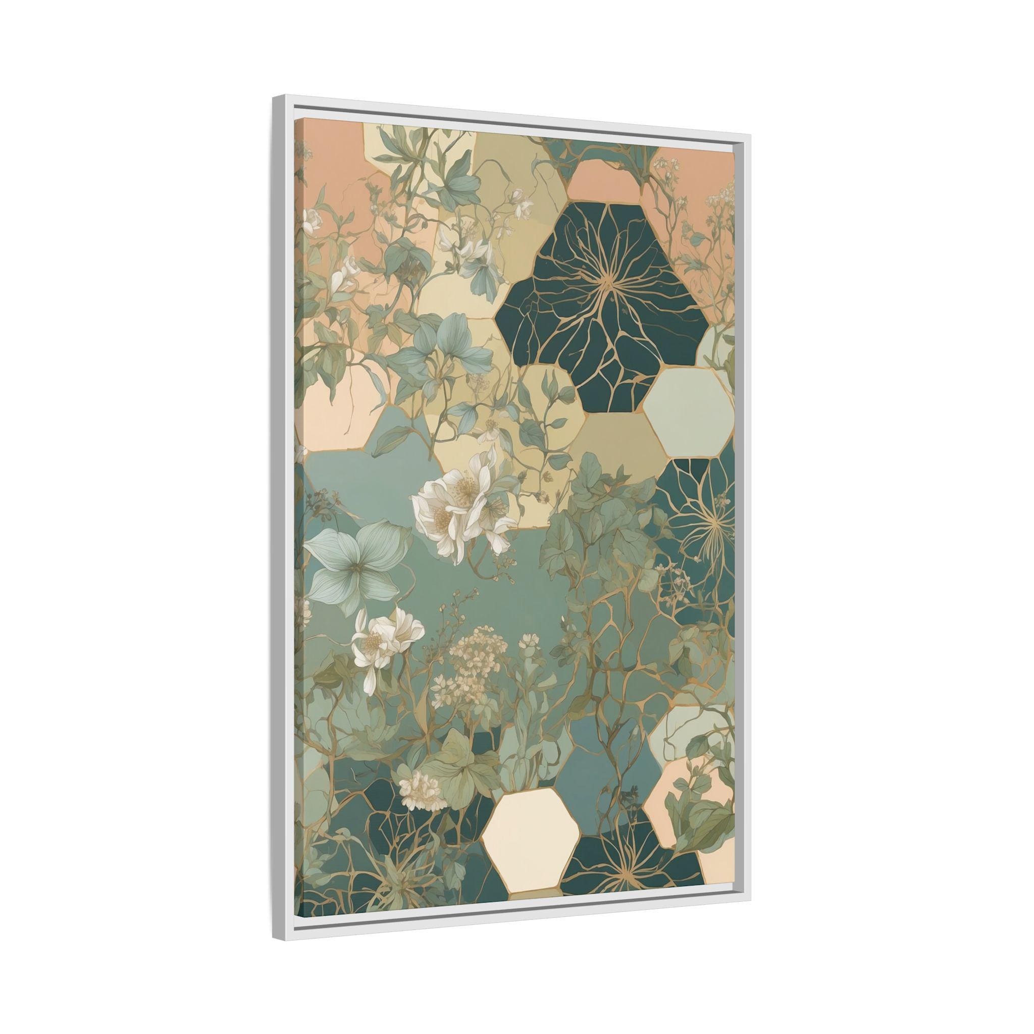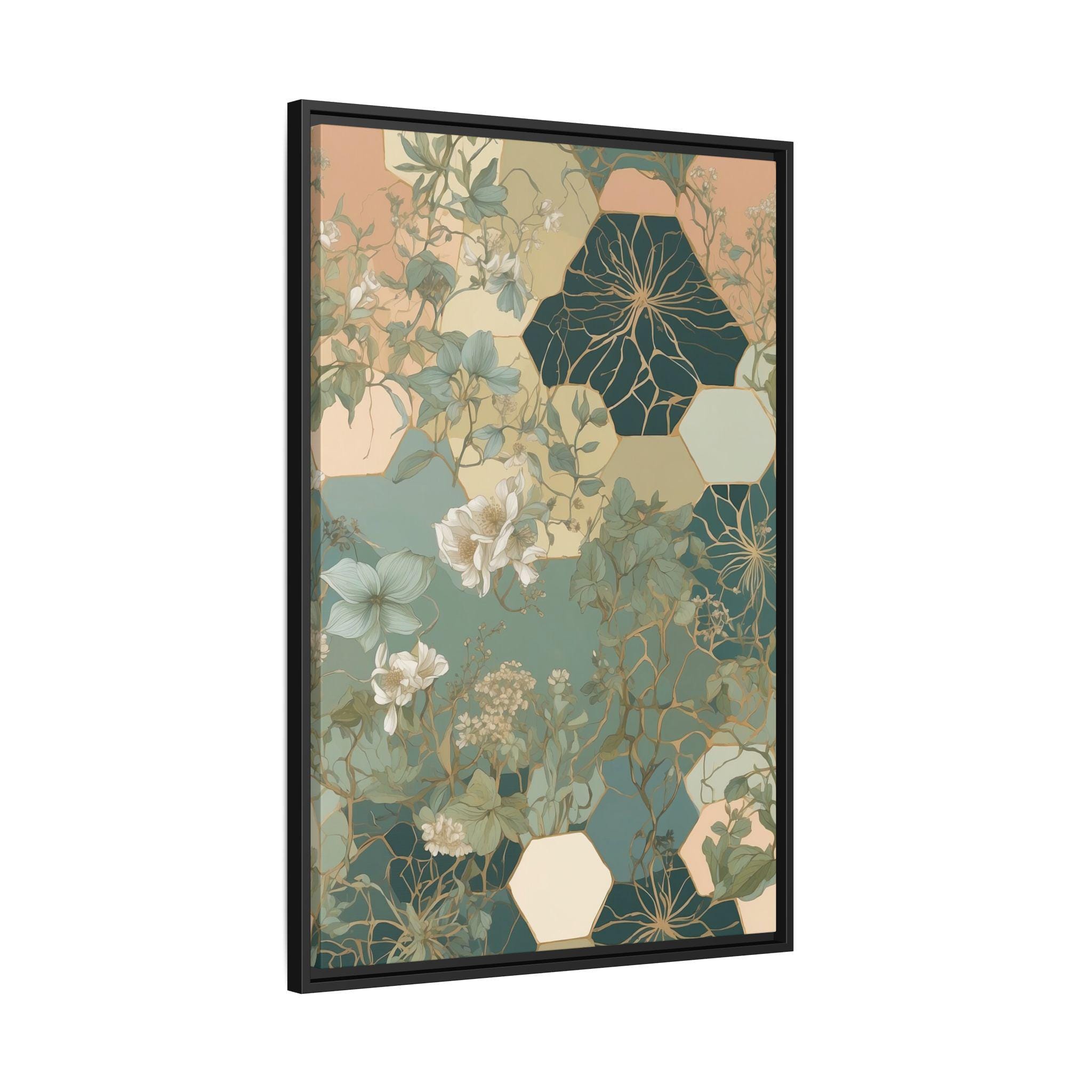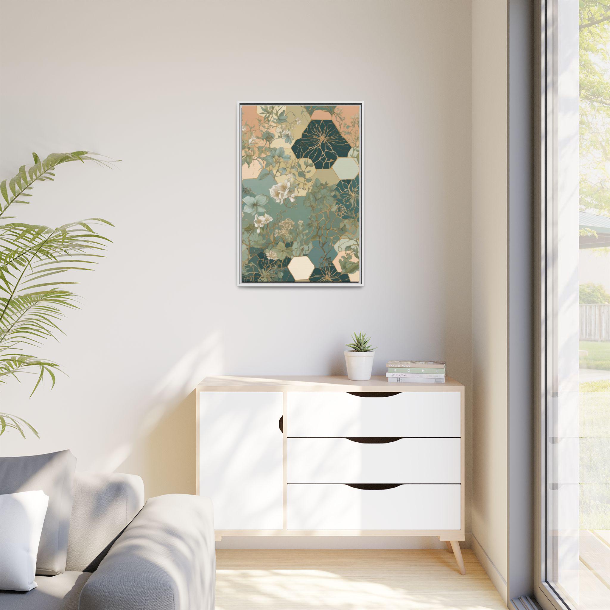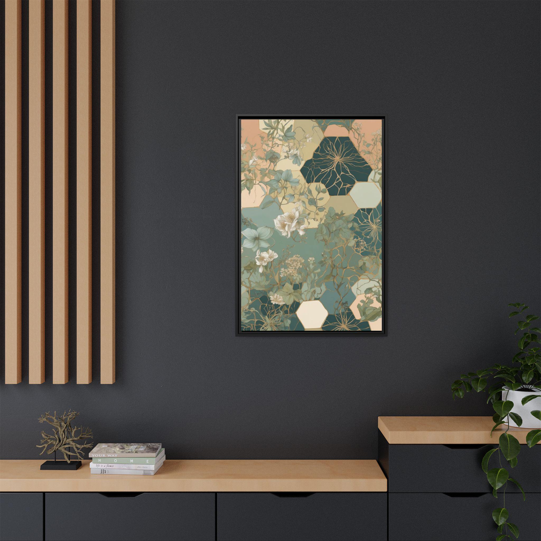 "Honeyed Vines" intertwines delicate botanical vines with abstract honeycomb-inspired hexagonal patterns, creating a modern geometric botanical composition. Muted pastel greens and soft sand tones evoke a calming, organic elegance, blending structure and nature in perfect harmony.