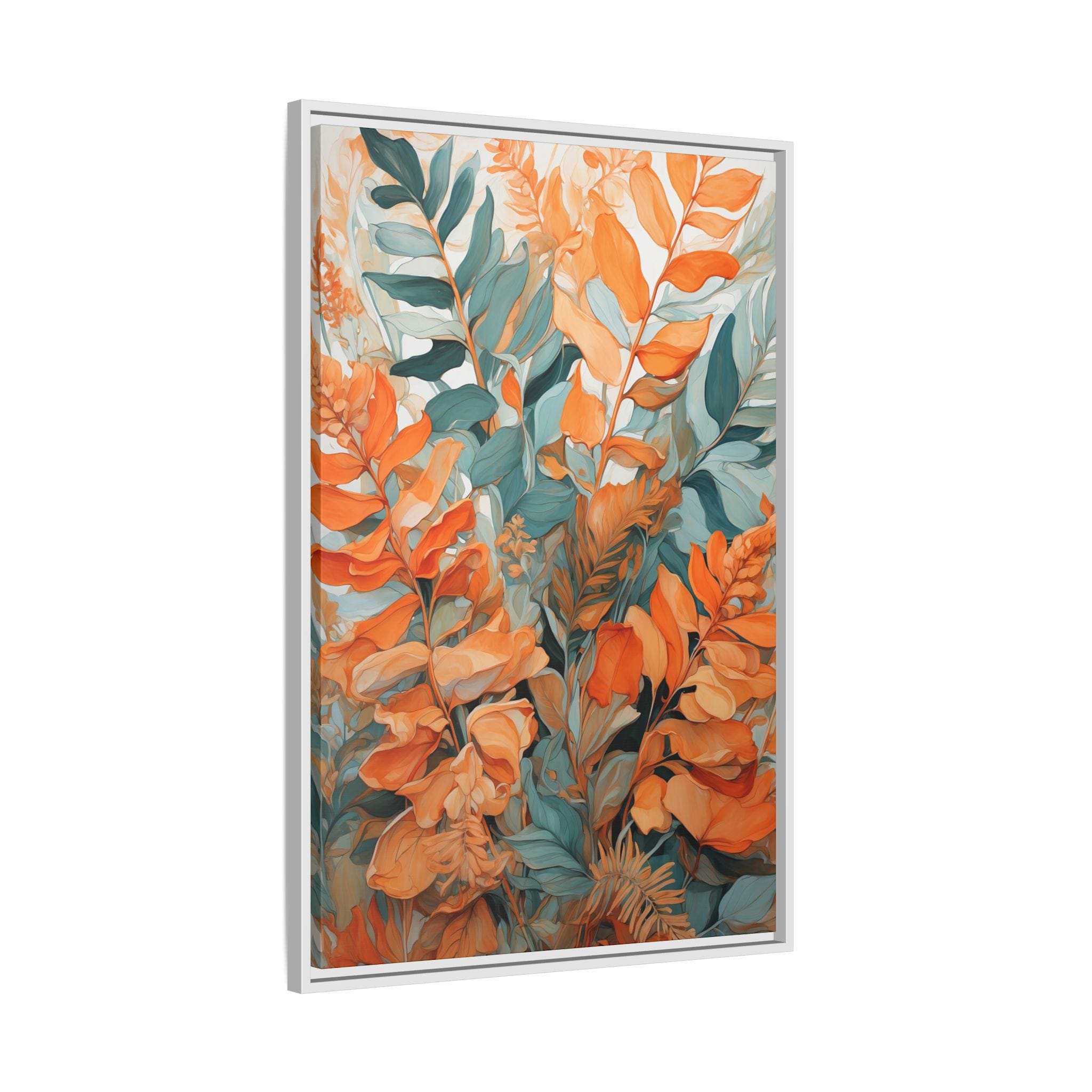 Bring a touch of modern serenity into your home with the "Whispers of Fern" captivating canvas art print. Bold yet soothing brushstrokes of orange and teal create a flowing backdrop, while delicate fern outlines drift gracefully across the surface, adding a sense of calm and connection to nature.