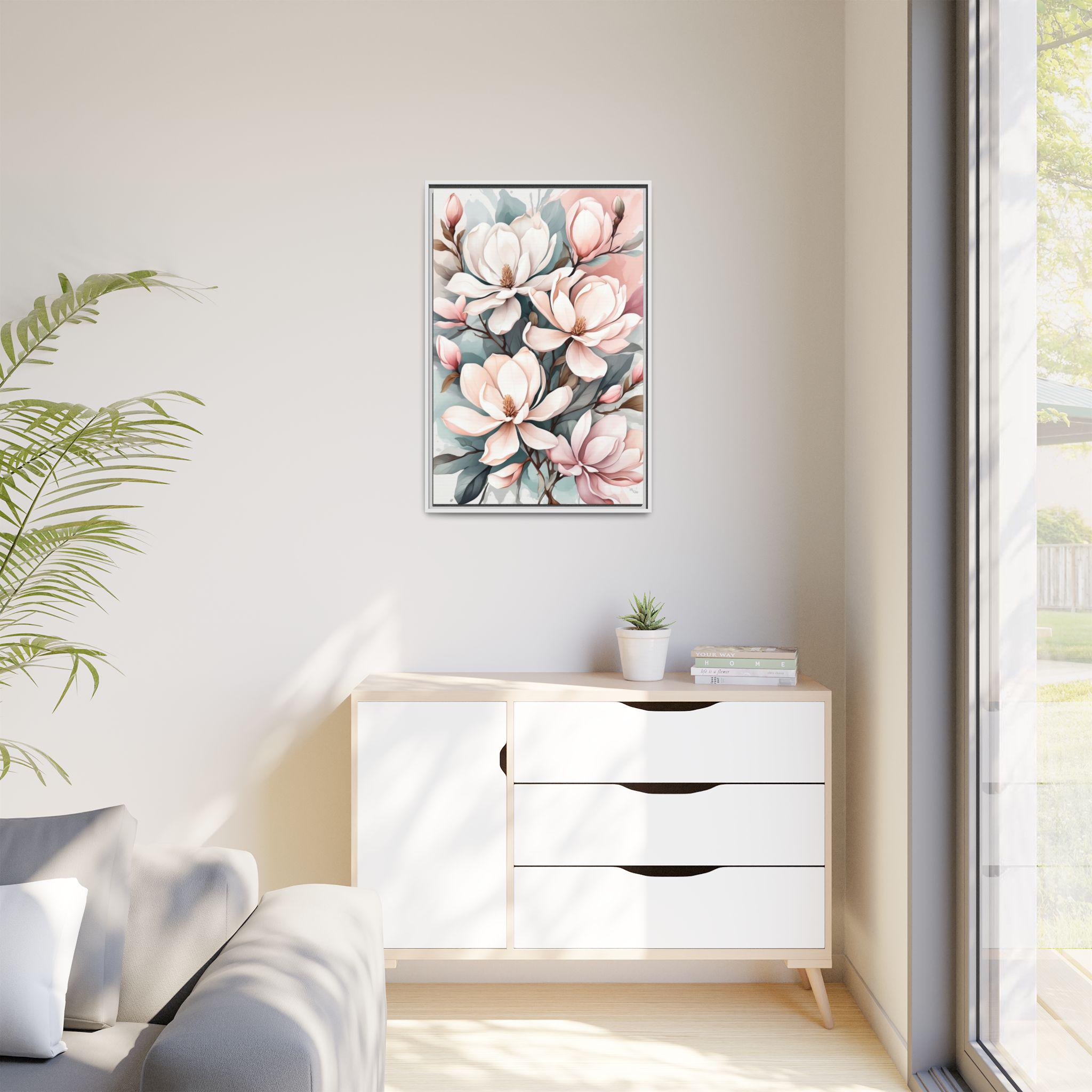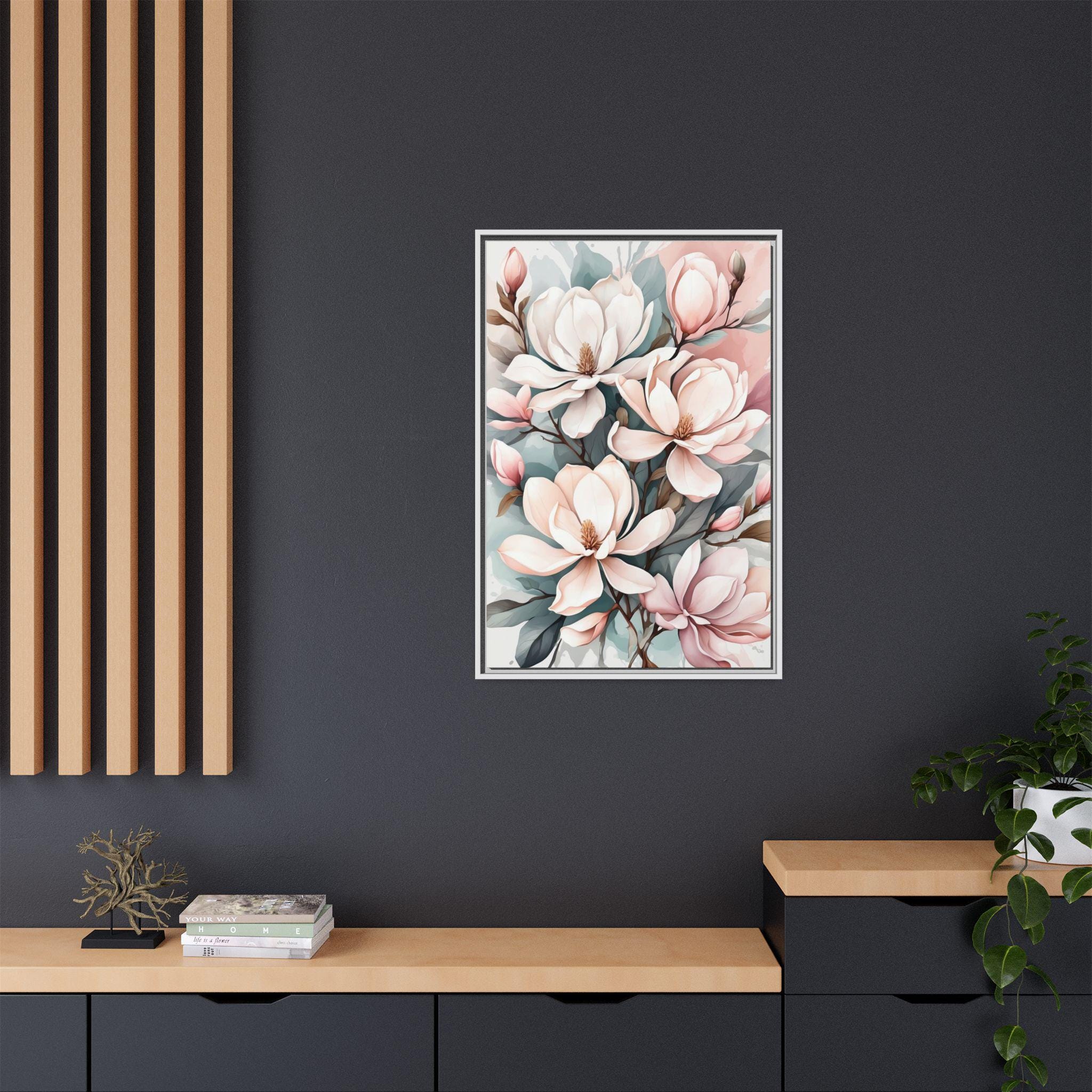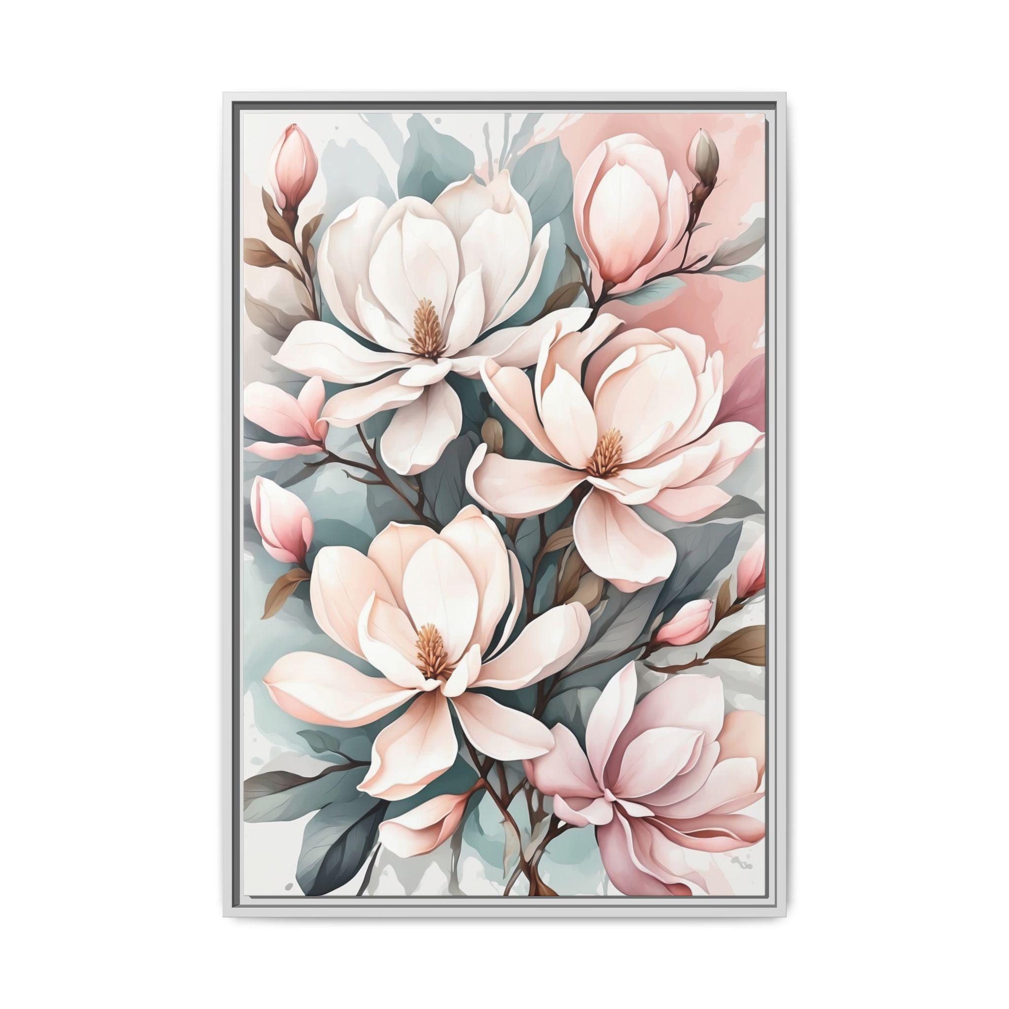 Invite subtle elegance into your home with “Whispering Magnolia”, a modern floral canvas print showcasing soft pastel magnolia blossoms in gentle watercolor against a crisp white background. Its clean, minimal composition embodies serenity and sophistication, perfect for creating a calming focal point in any room.