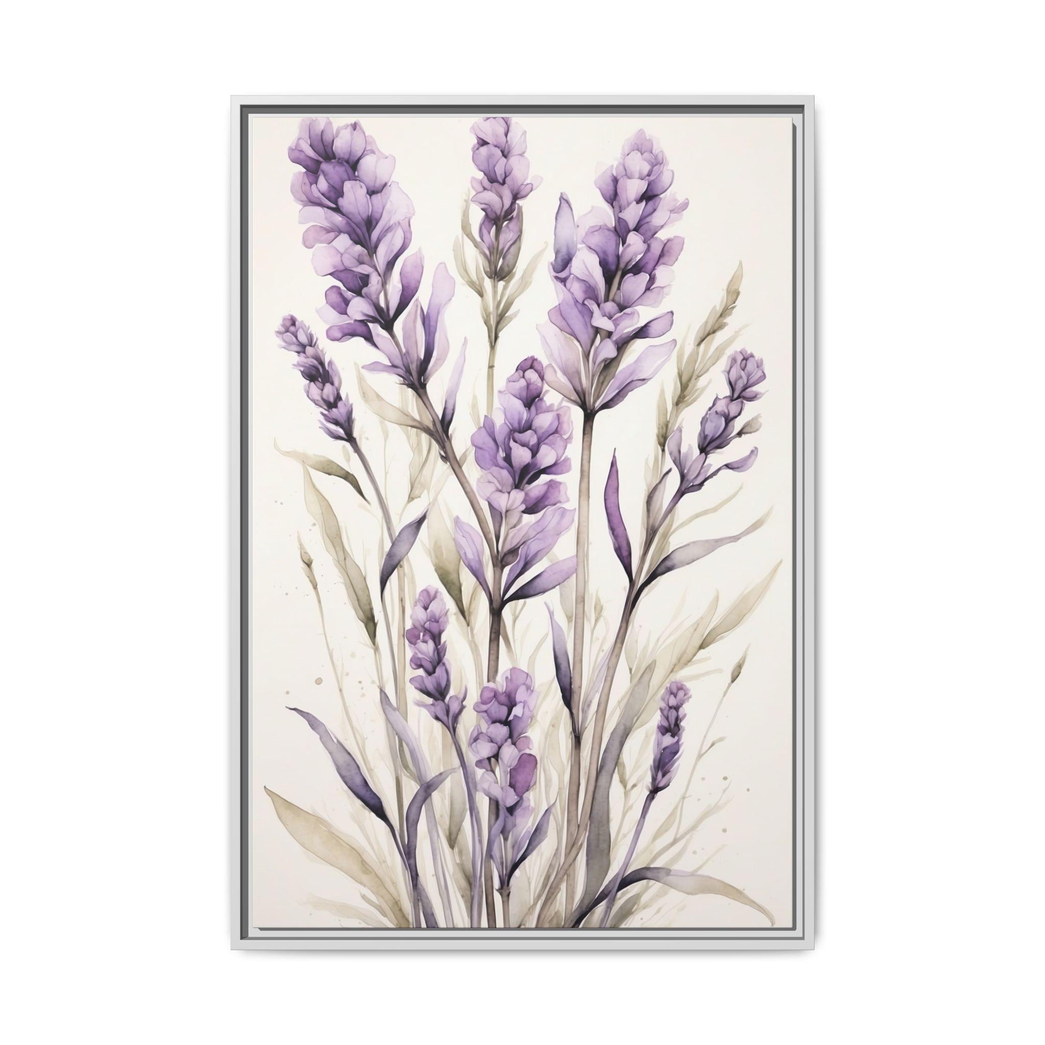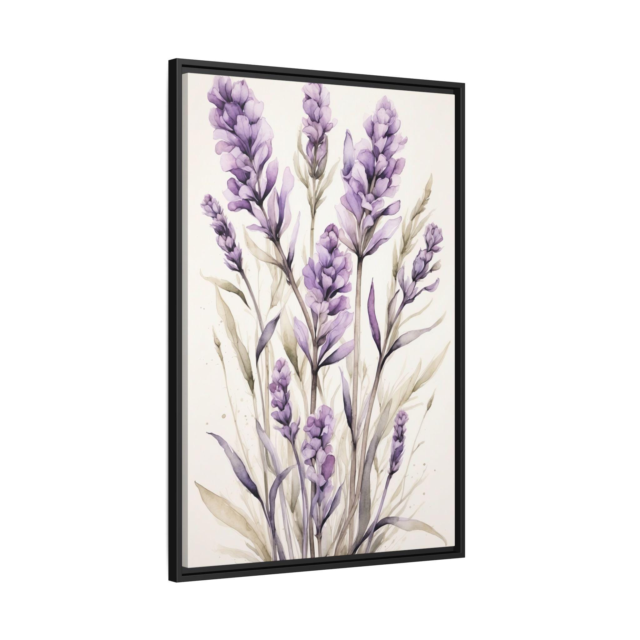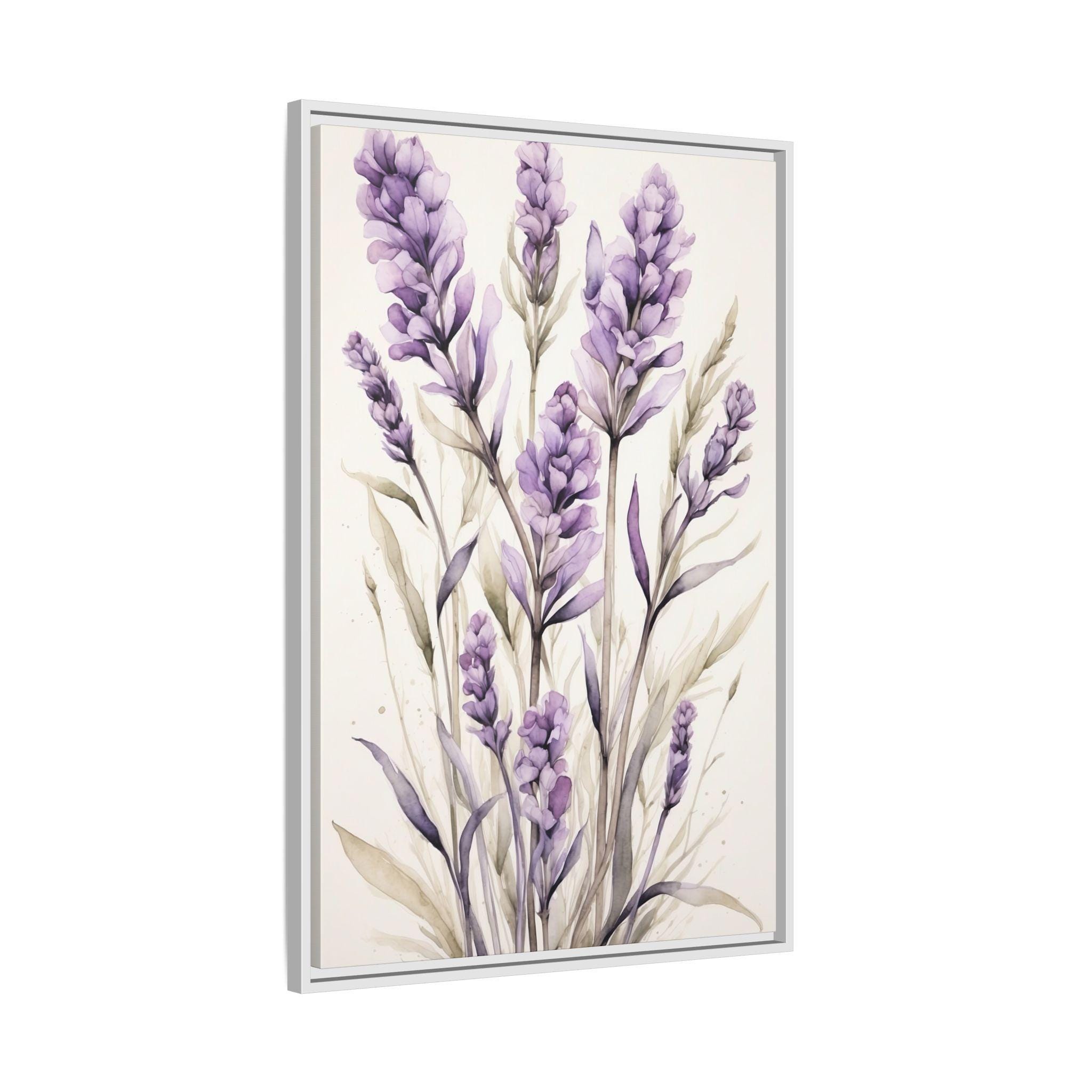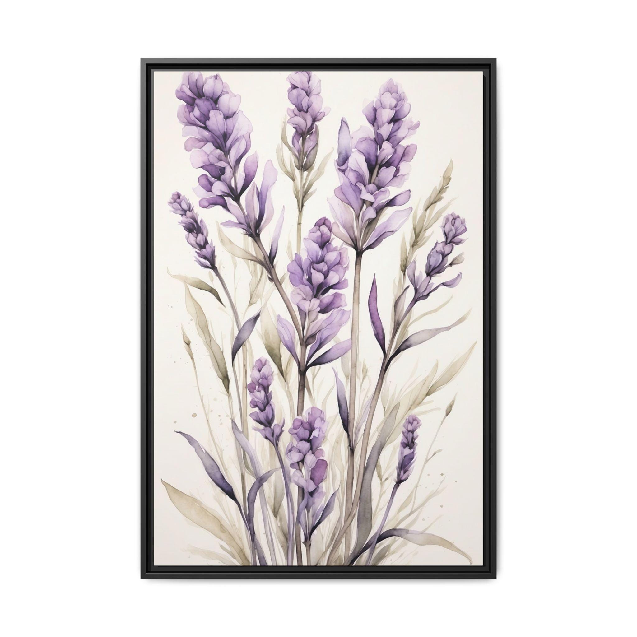 "Lavender Haze" features delicate lavender stems rendered in soft watercolor against a serene cream background. The composition evokes a sense of calm and sophistication, blending natural beauty with modern minimalist design.