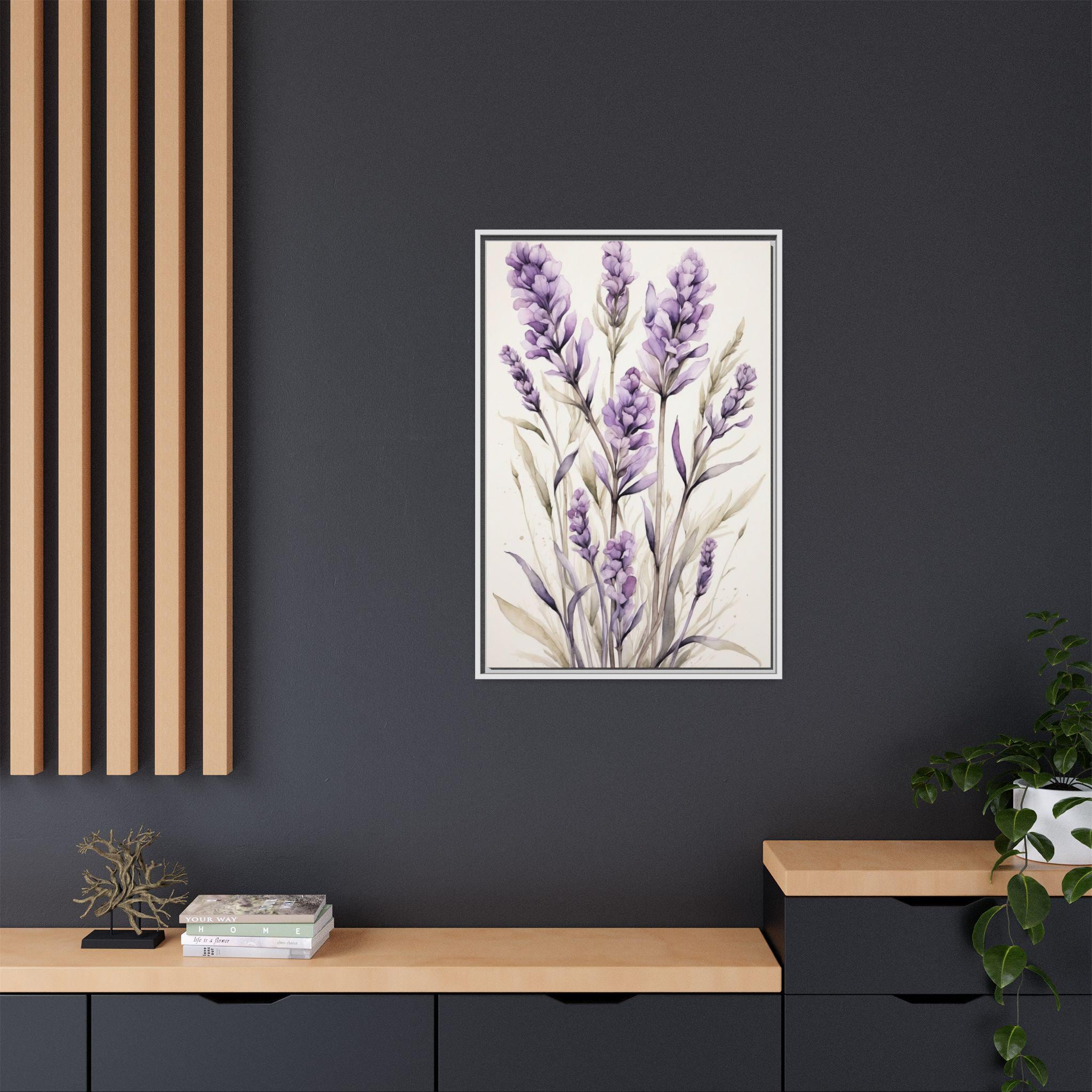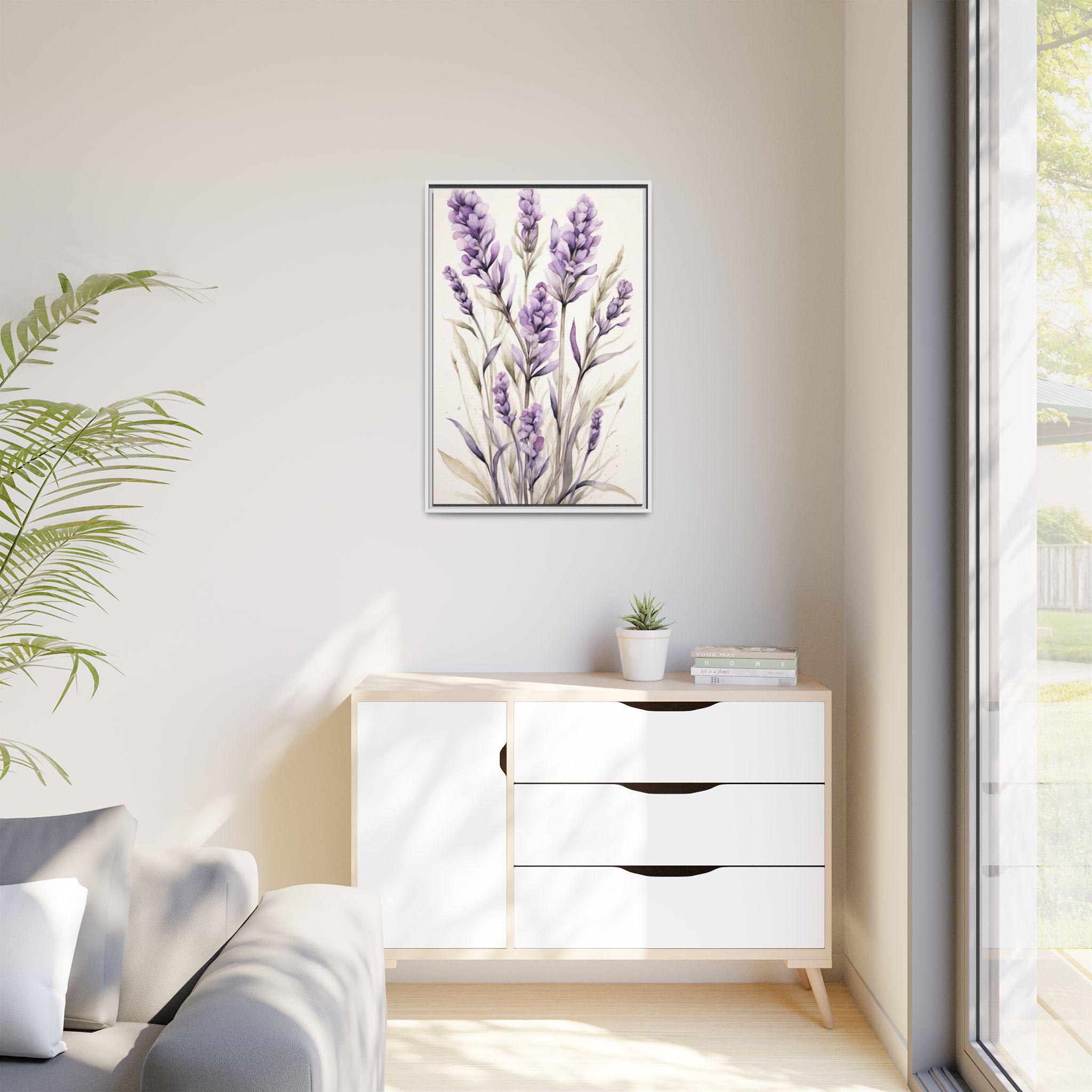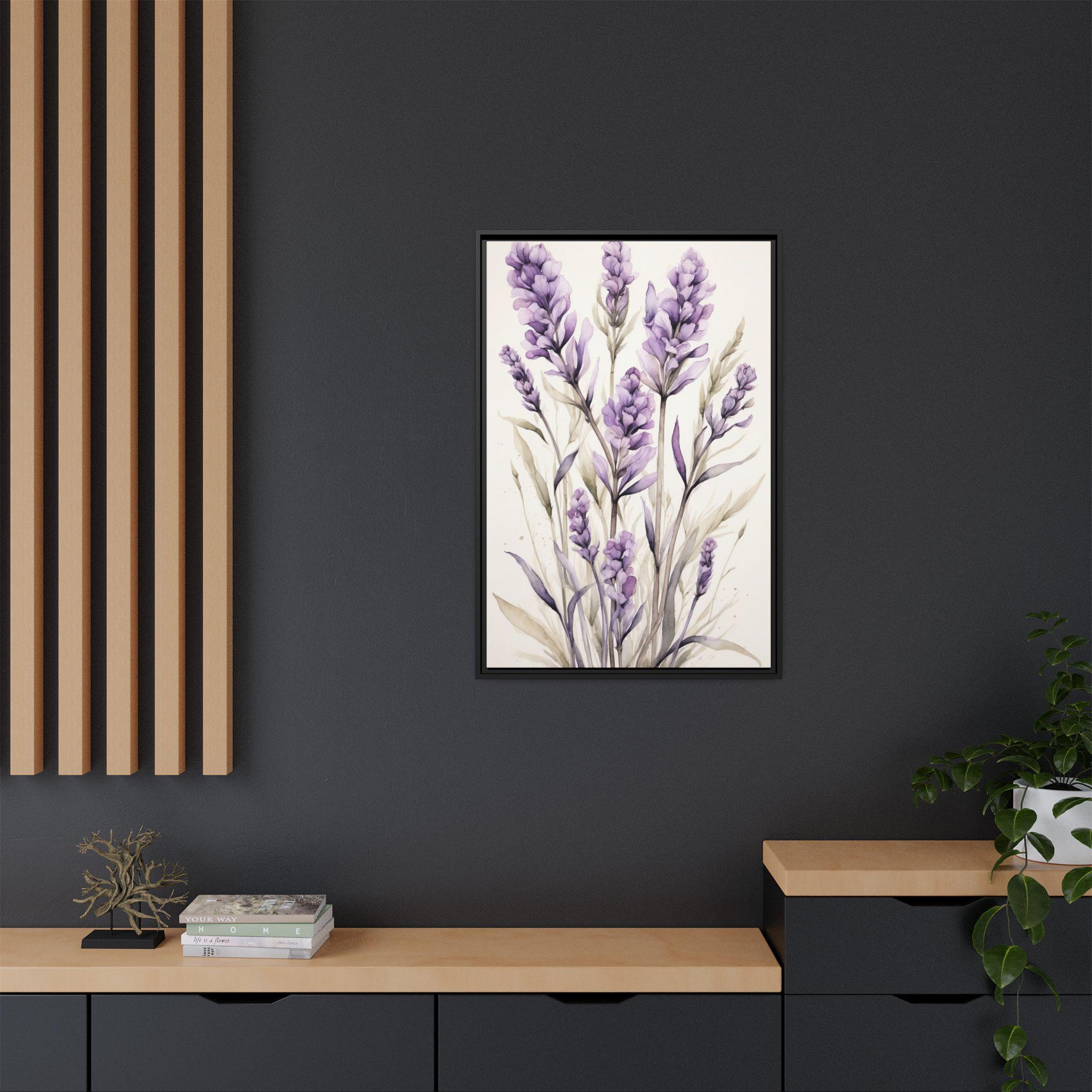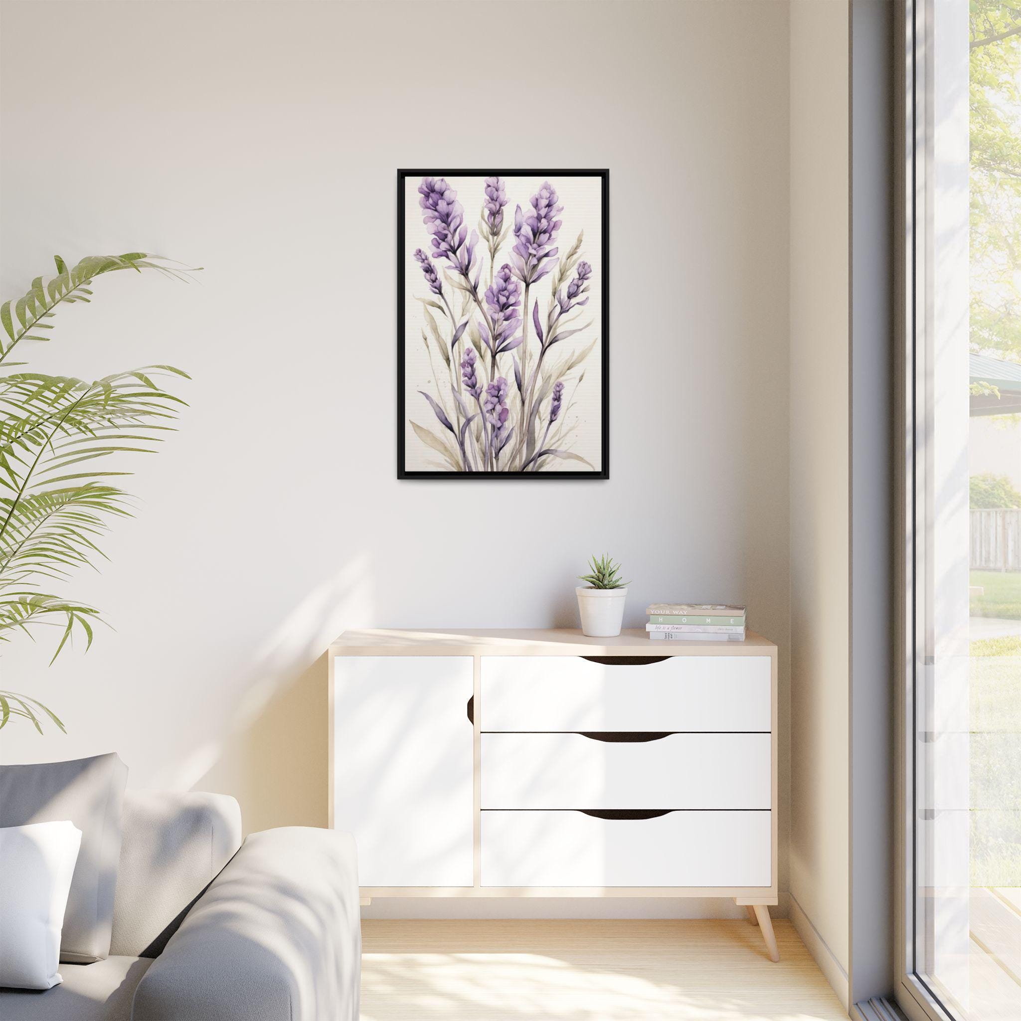 "Lavender Haze" features delicate lavender stems rendered in soft watercolor against a serene cream background. The composition evokes a sense of calm and sophistication, blending natural beauty with modern minimalist design.