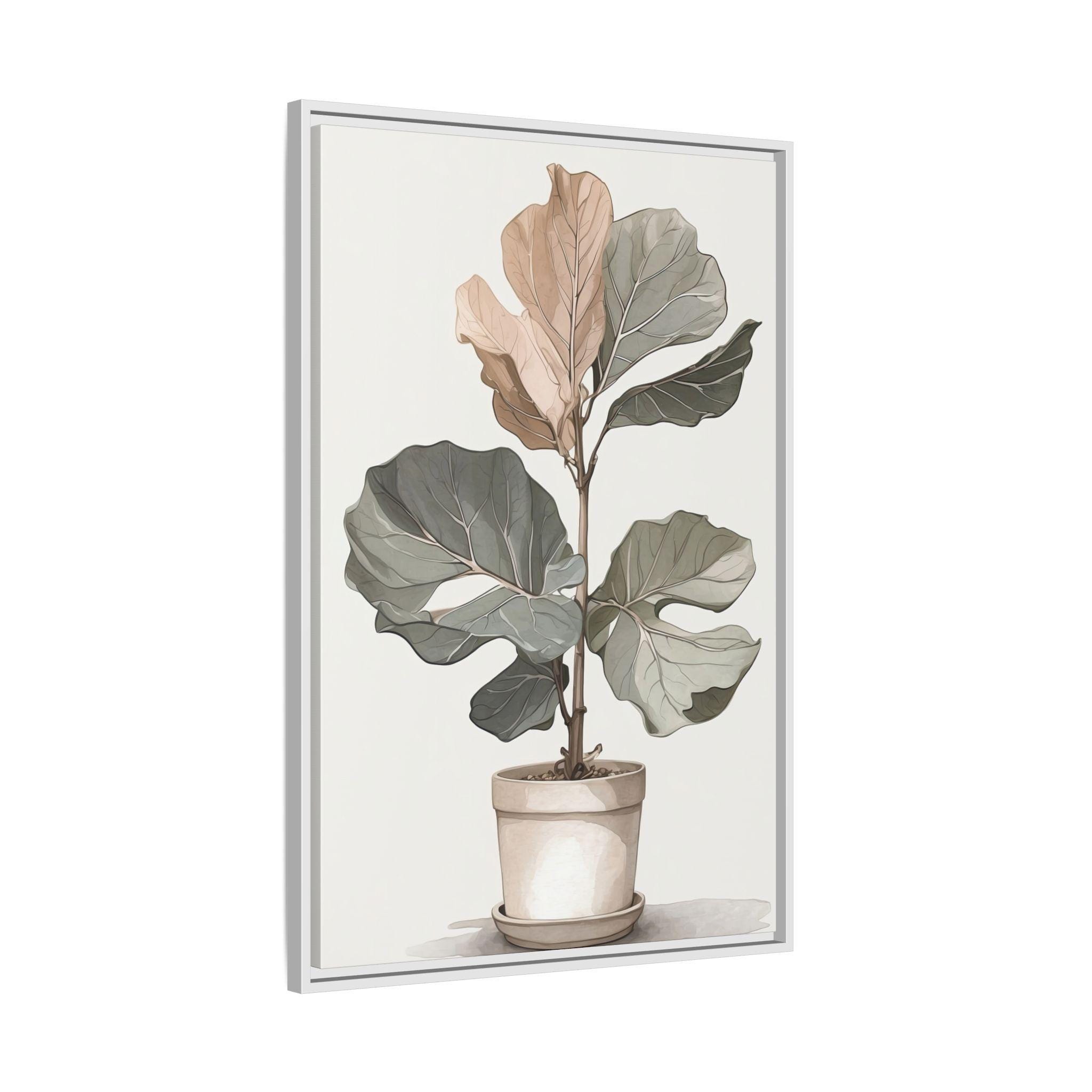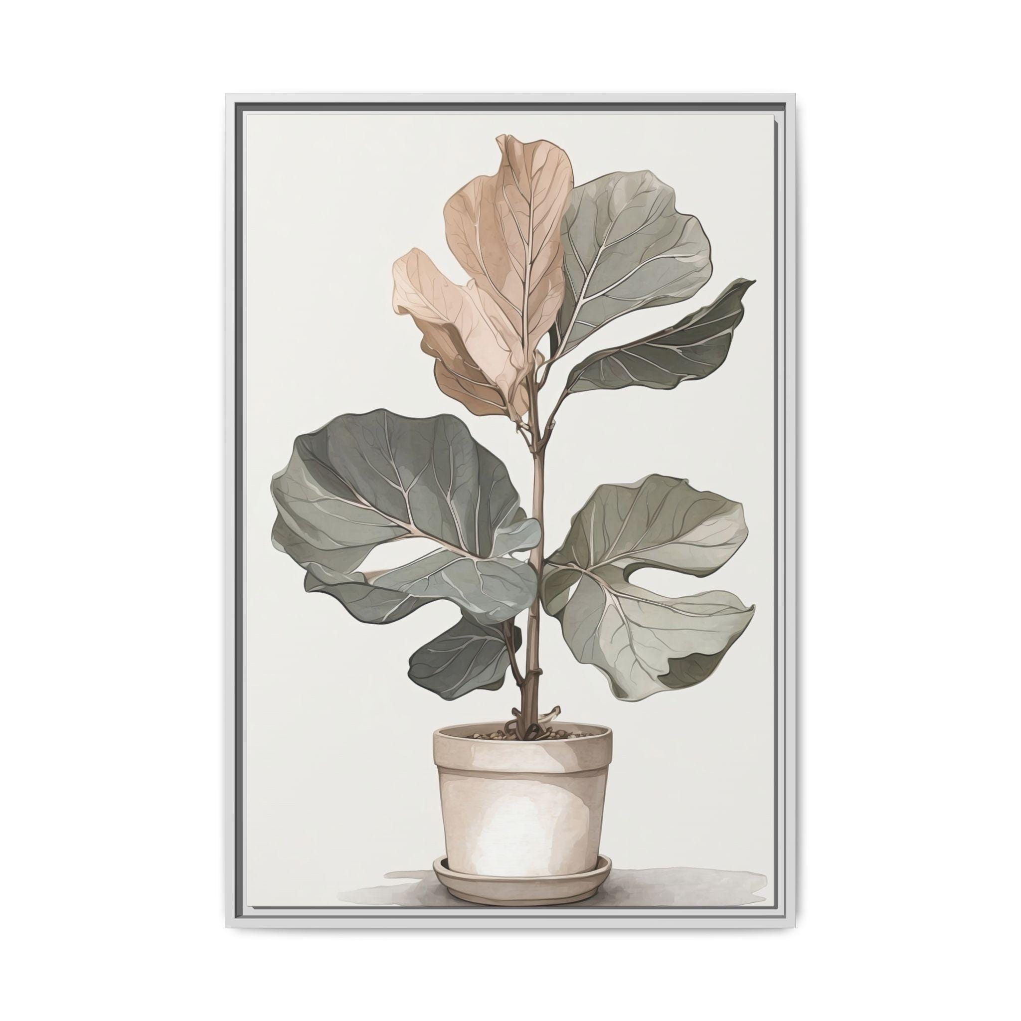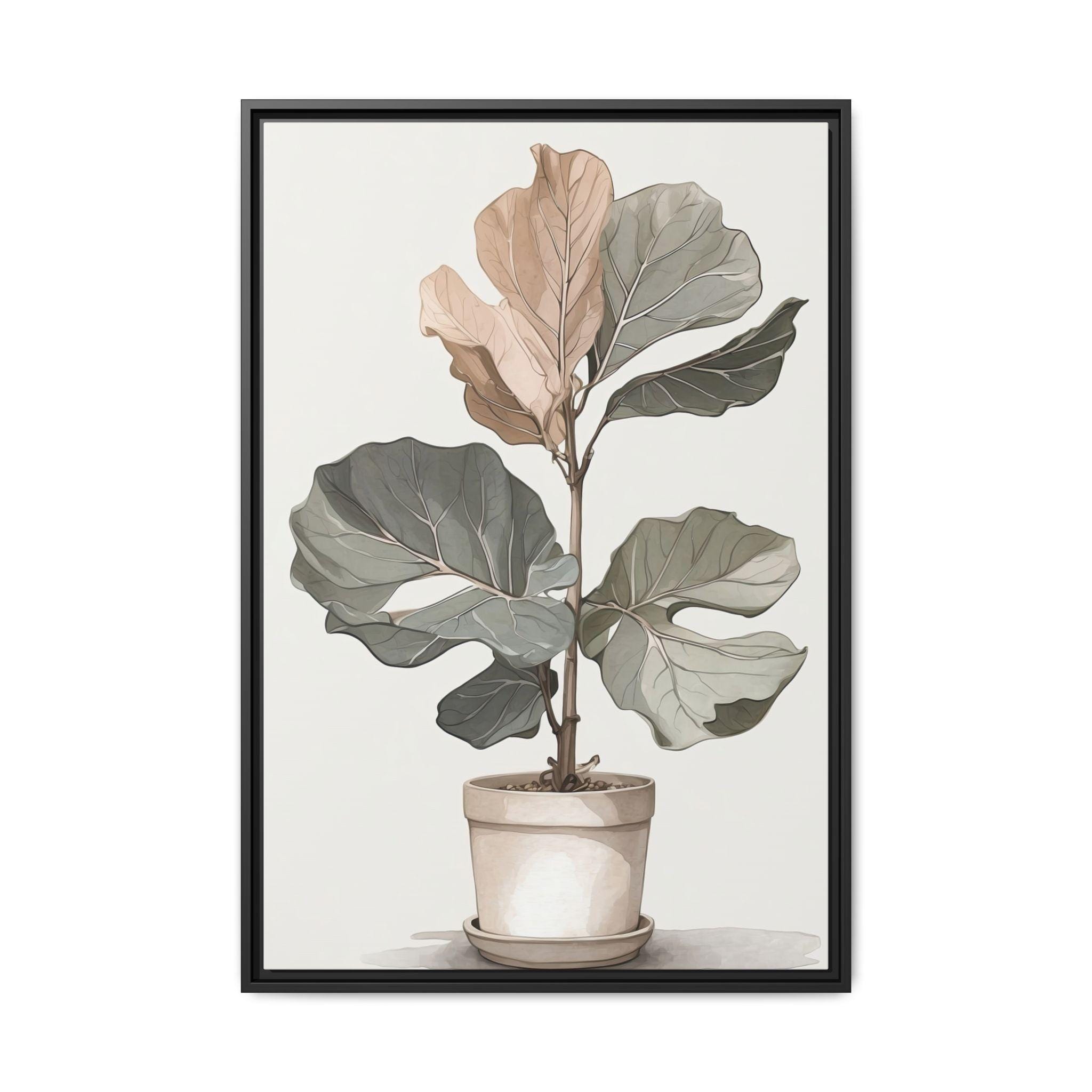 "Fig Reverie" showcases a fiddle-leaf fig rendered in muted neutral tones, combining delicate line drawing with soft watercolor washes. The minimalist composition highlights the natural elegance of the plant while maintaining modern sophistication.