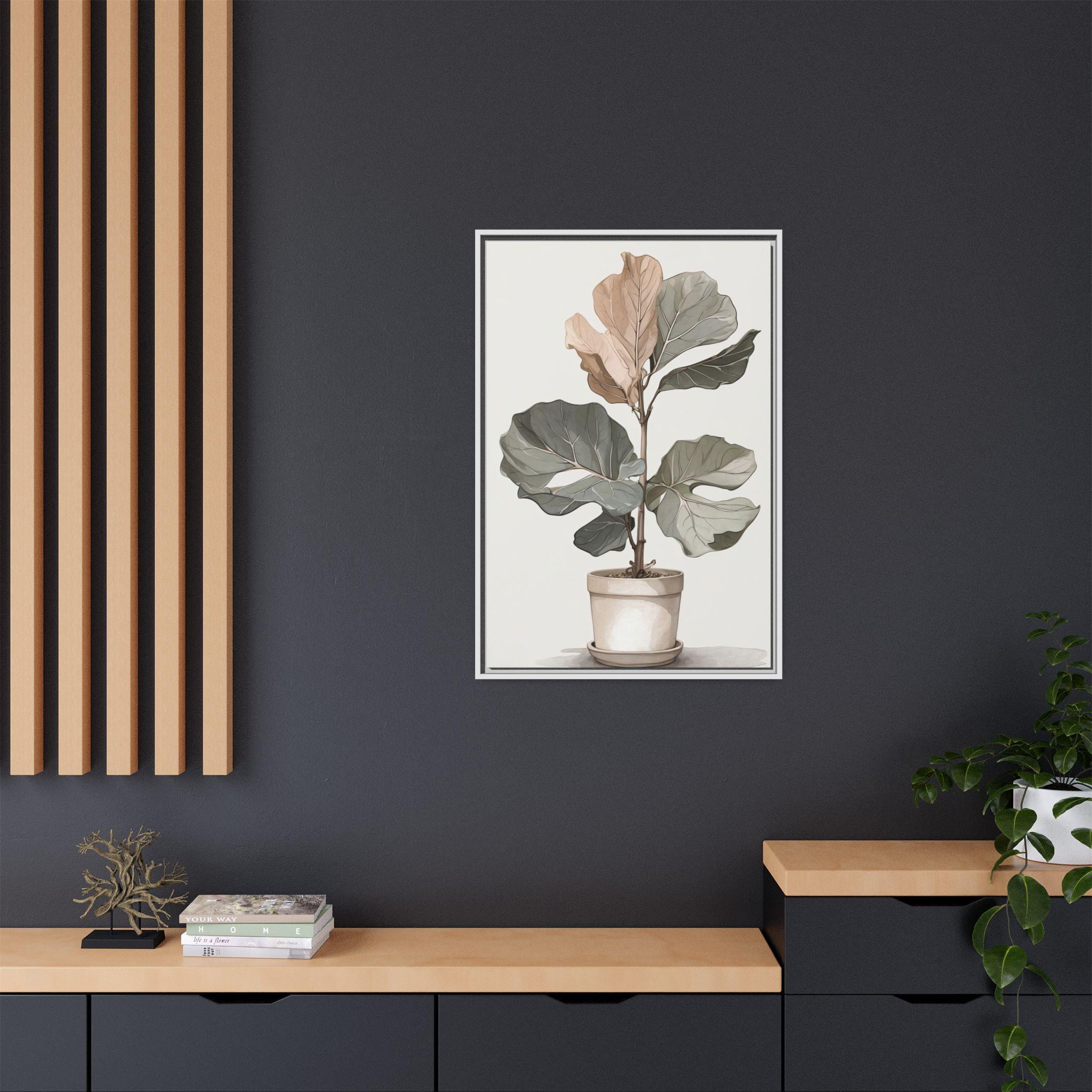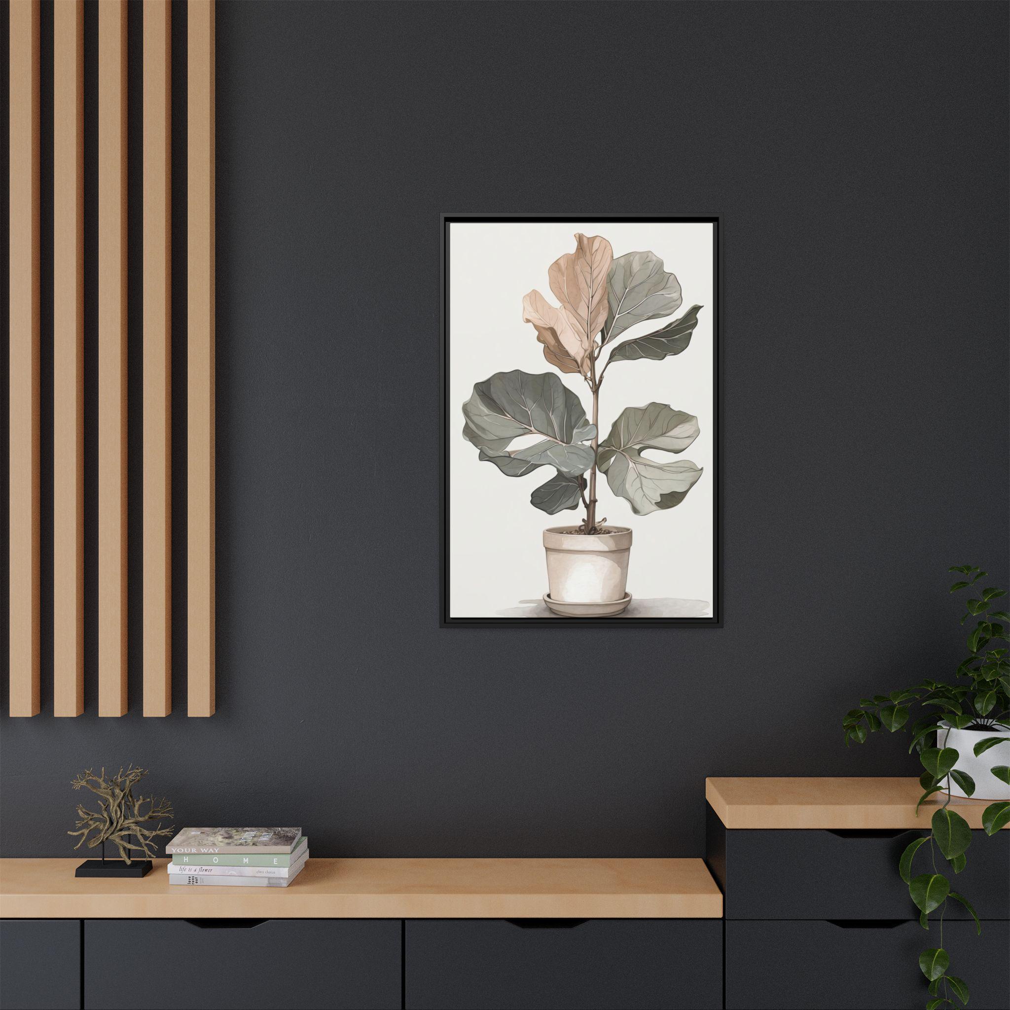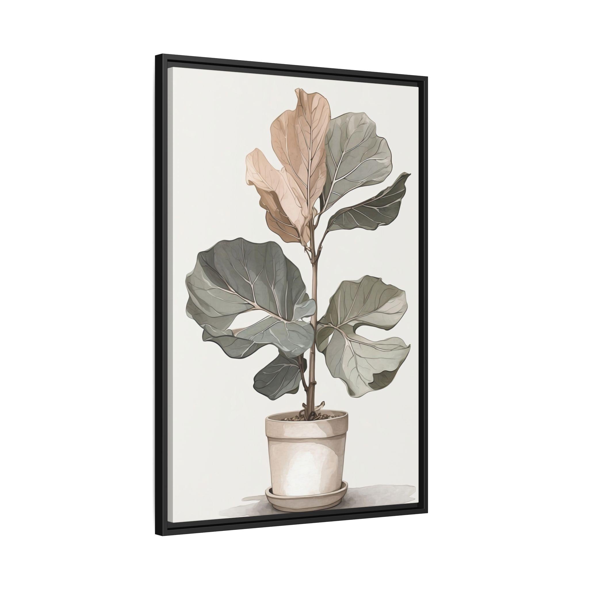 "Fig Reverie" showcases a fiddle-leaf fig rendered in muted neutral tones, combining delicate line drawing with soft watercolor washes. The minimalist composition highlights the natural elegance of the plant while maintaining modern sophistication.