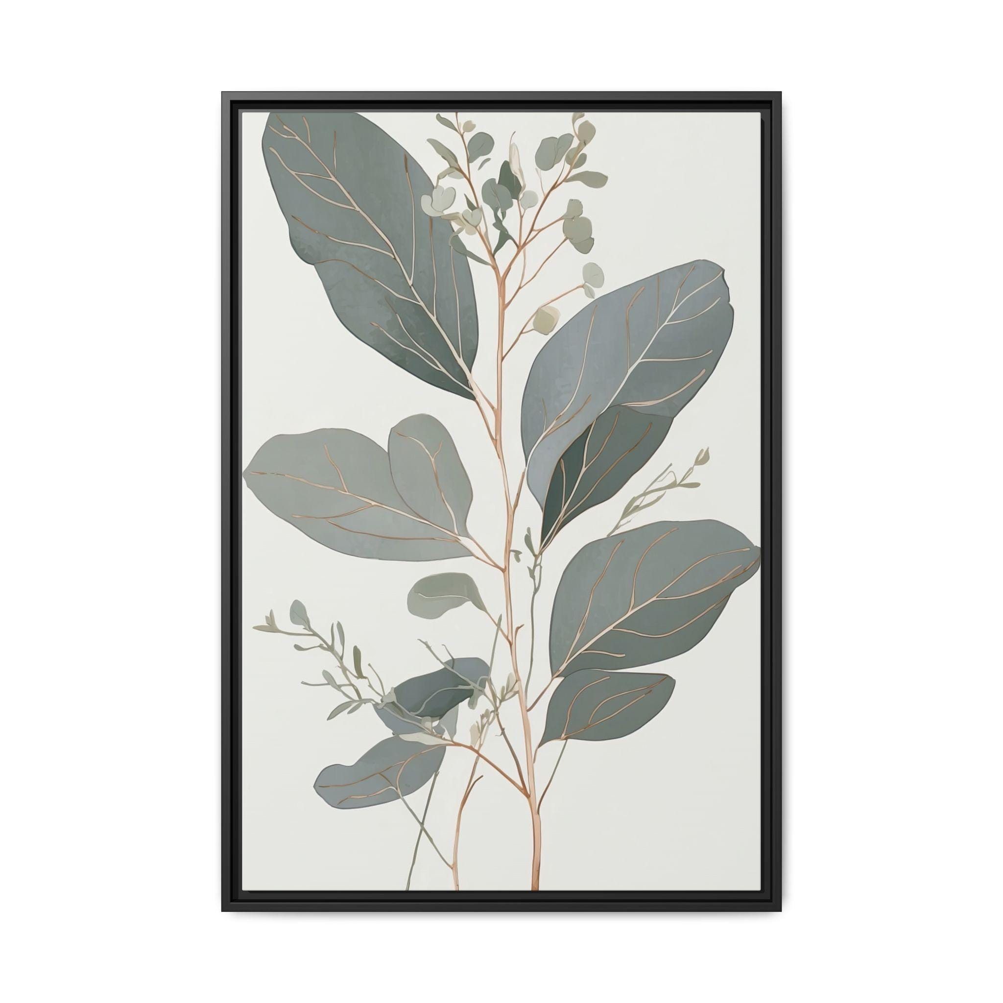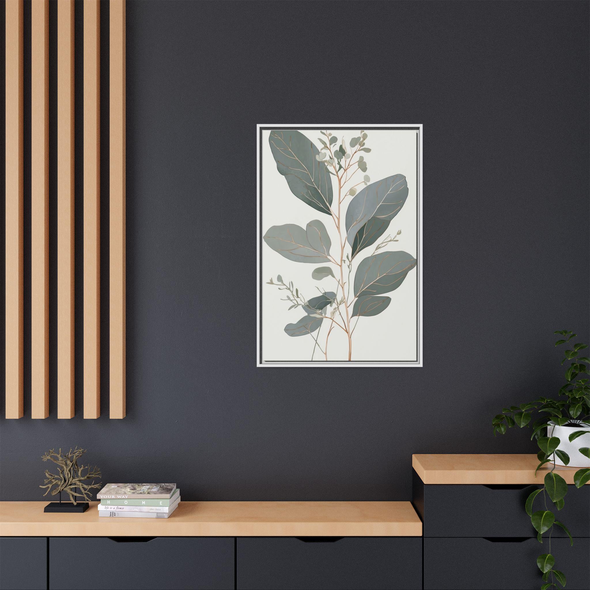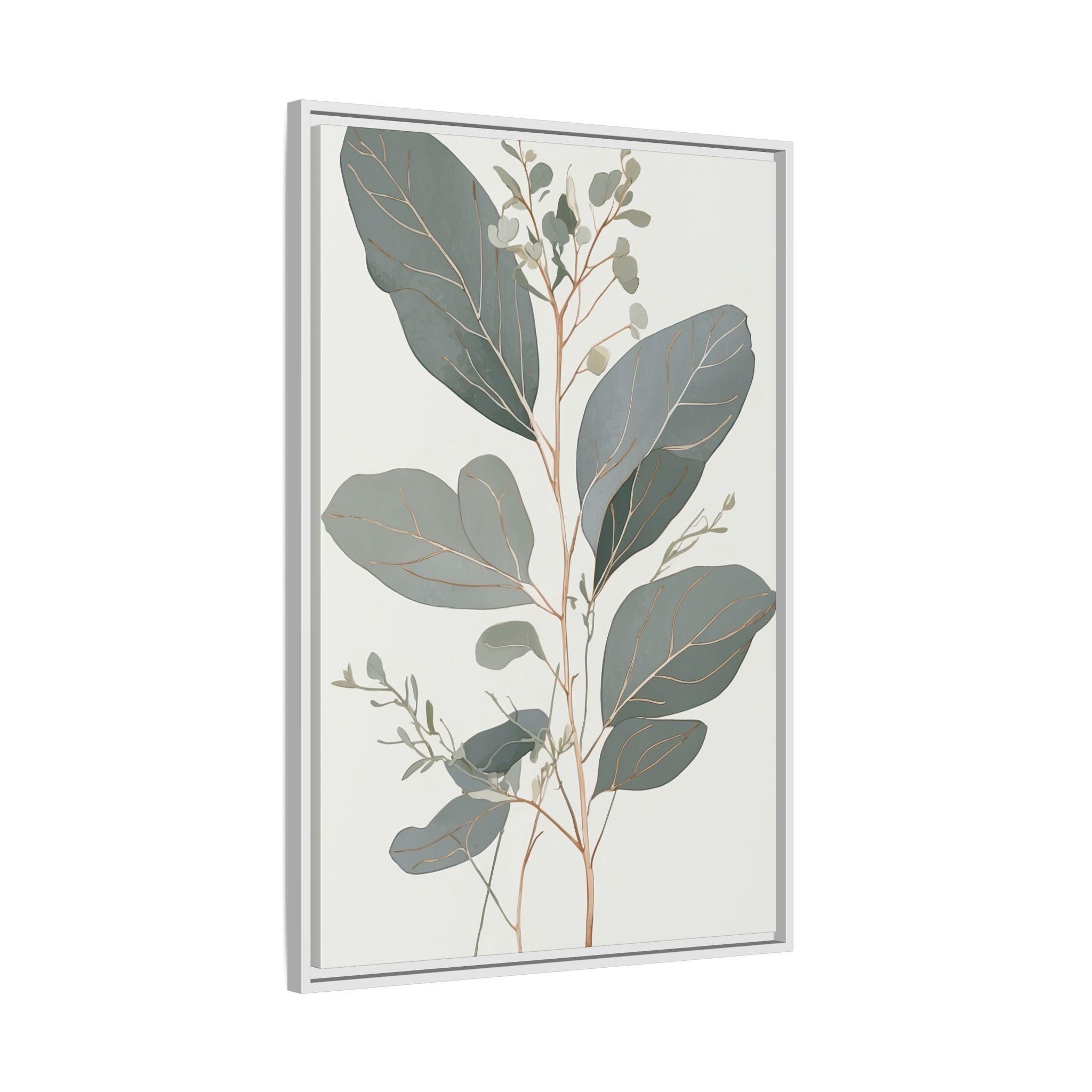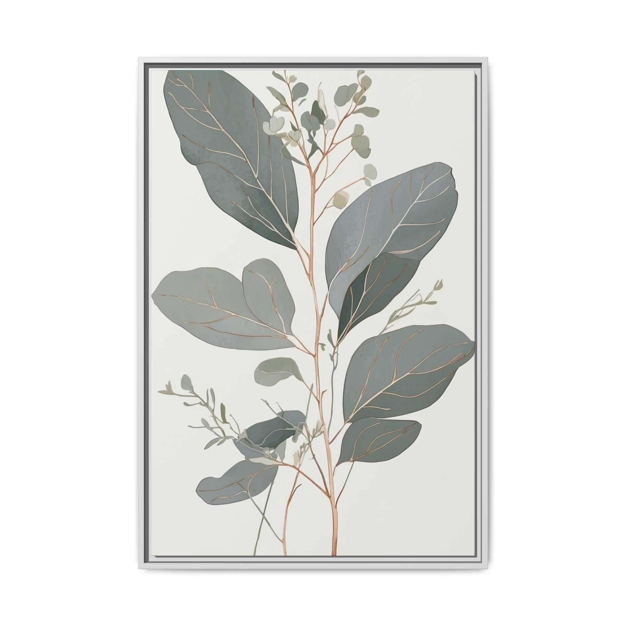 "Eucalyptus Drift" features a graceful eucalyptus branch in muted sage and cream, highlighted with delicate watercolor accents. The minimalist line art emphasizes modern sophistication while evoking a calm, airy botanical feel.