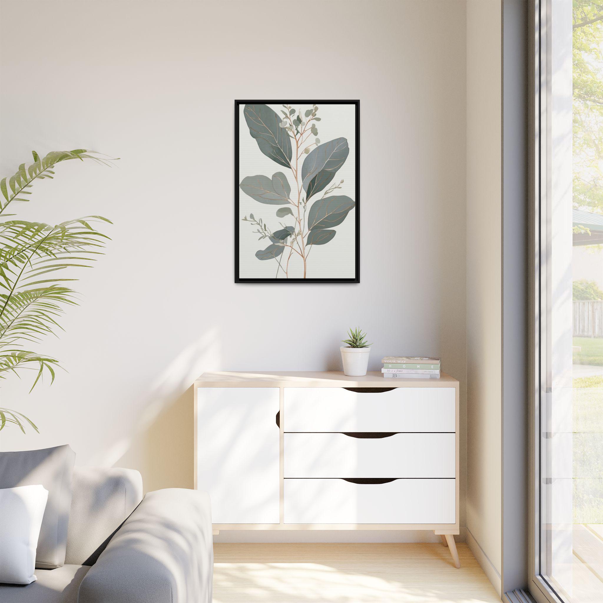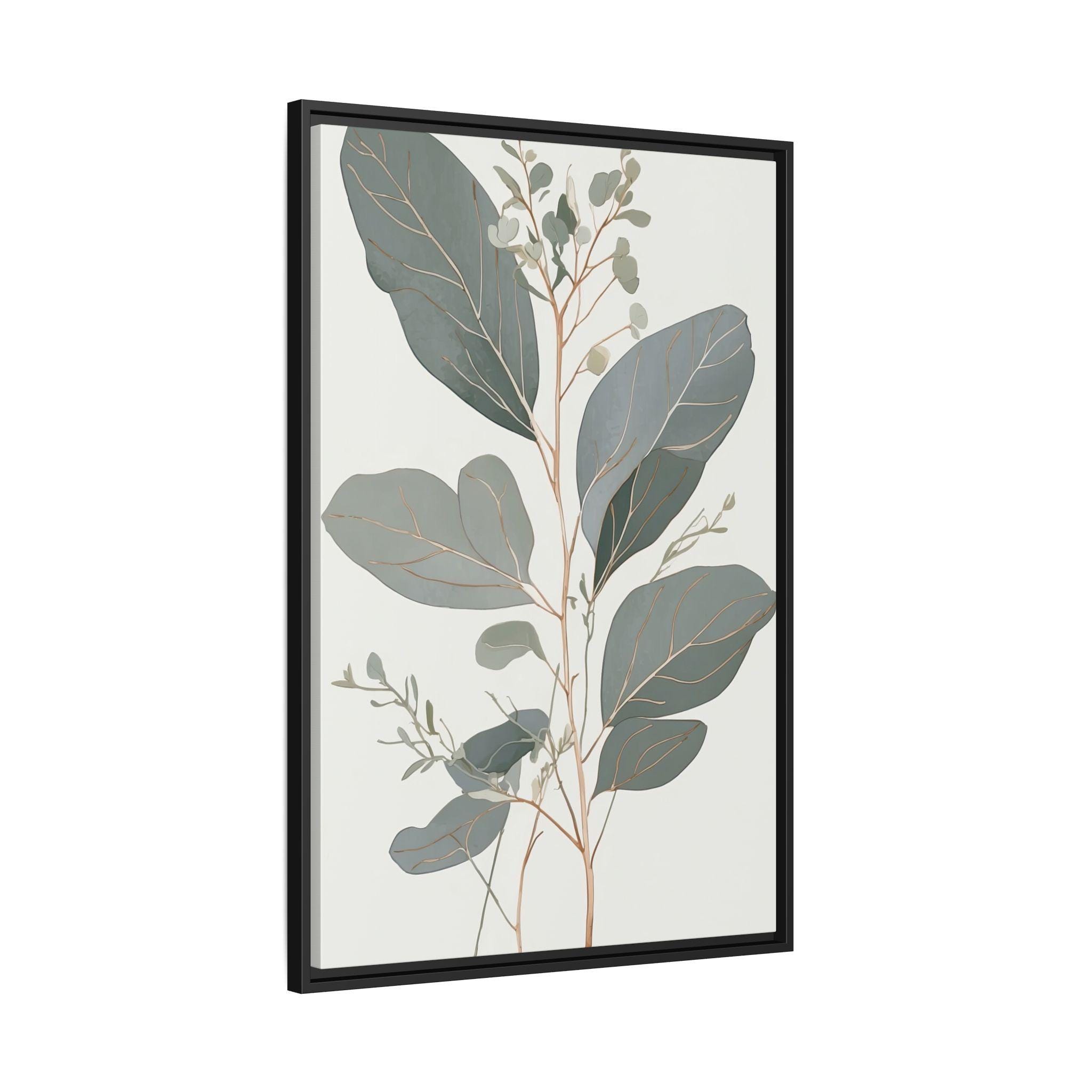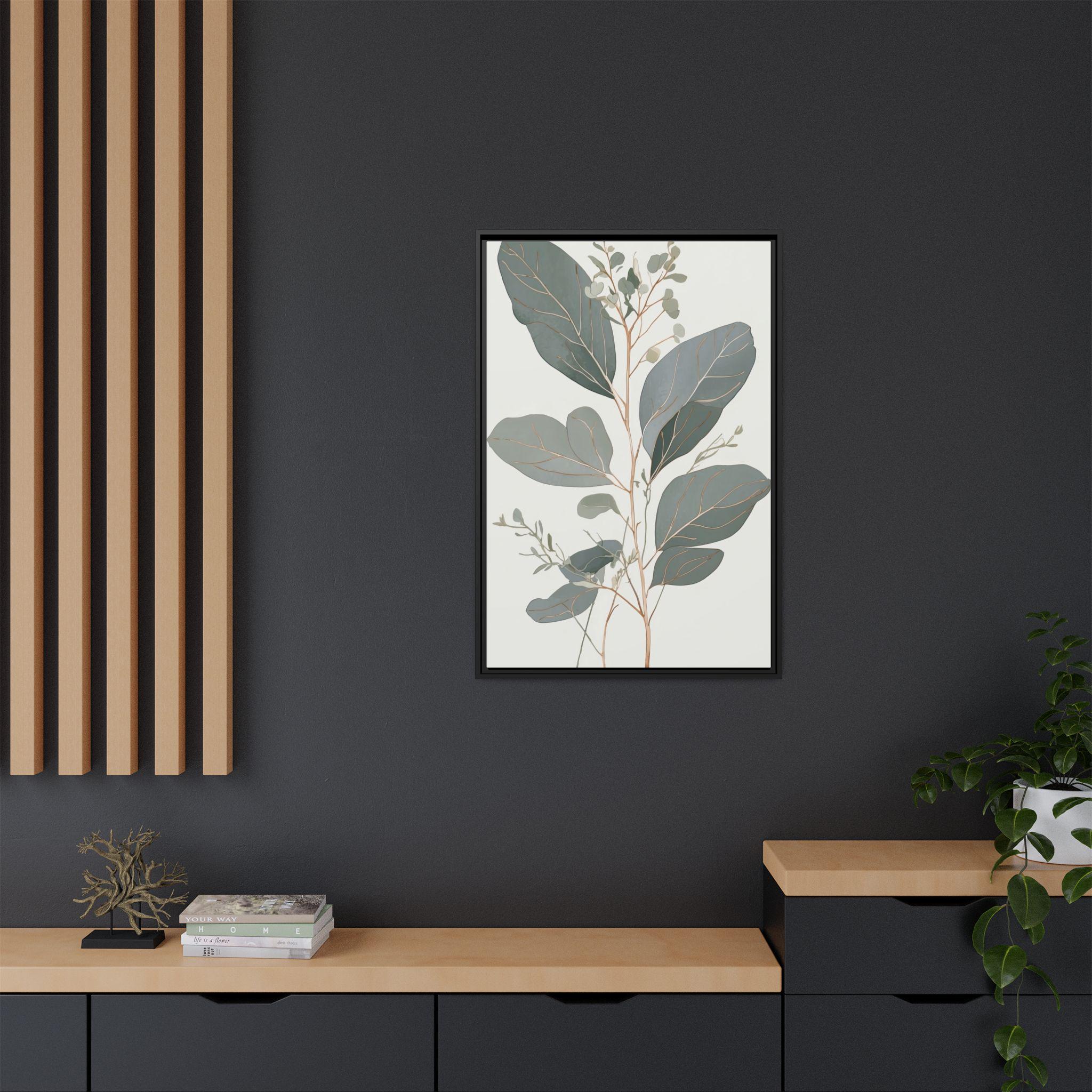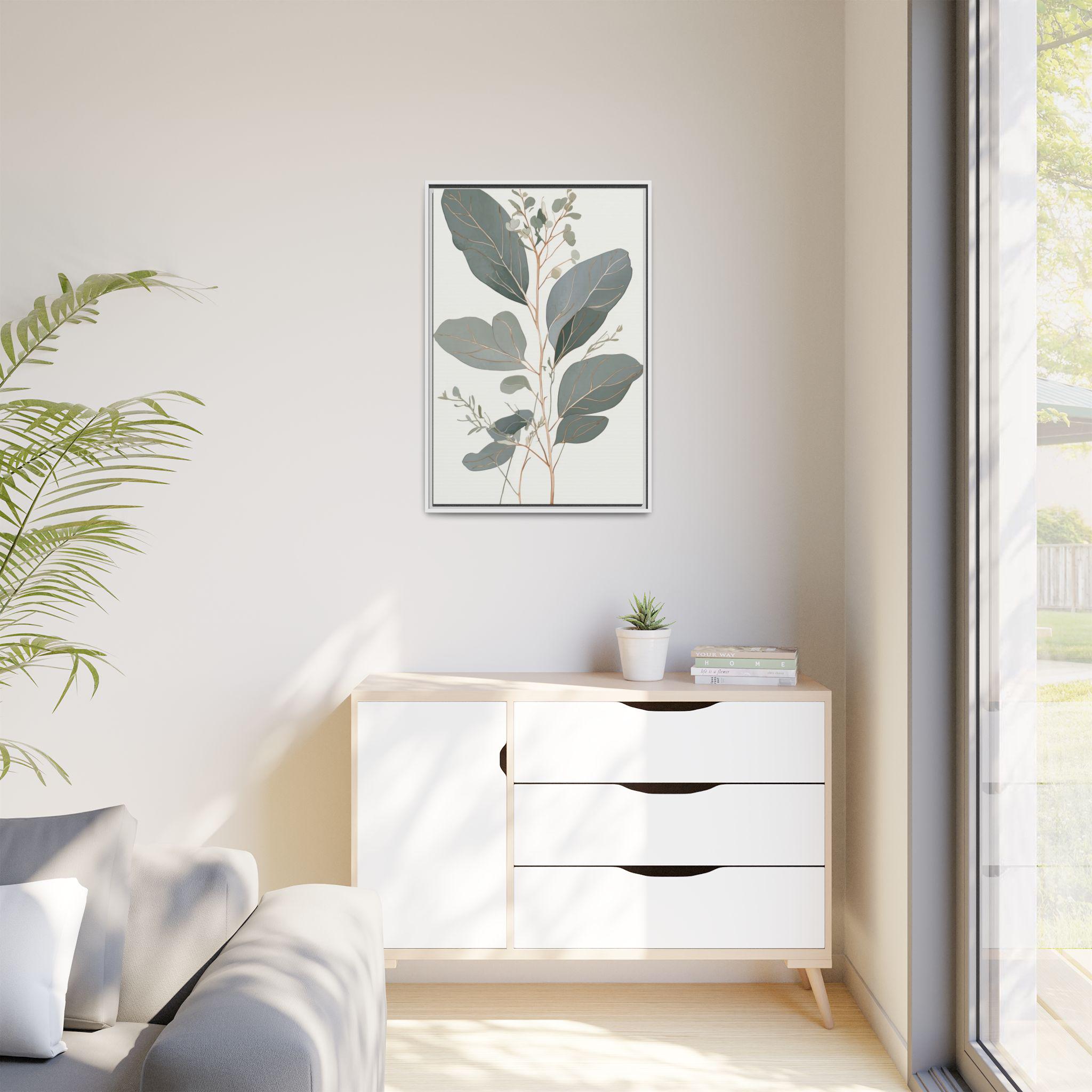 "Eucalyptus Drift" features a graceful eucalyptus branch in muted sage and cream, highlighted with delicate watercolor accents. The minimalist line art emphasizes modern sophistication while evoking a calm, airy botanical feel.