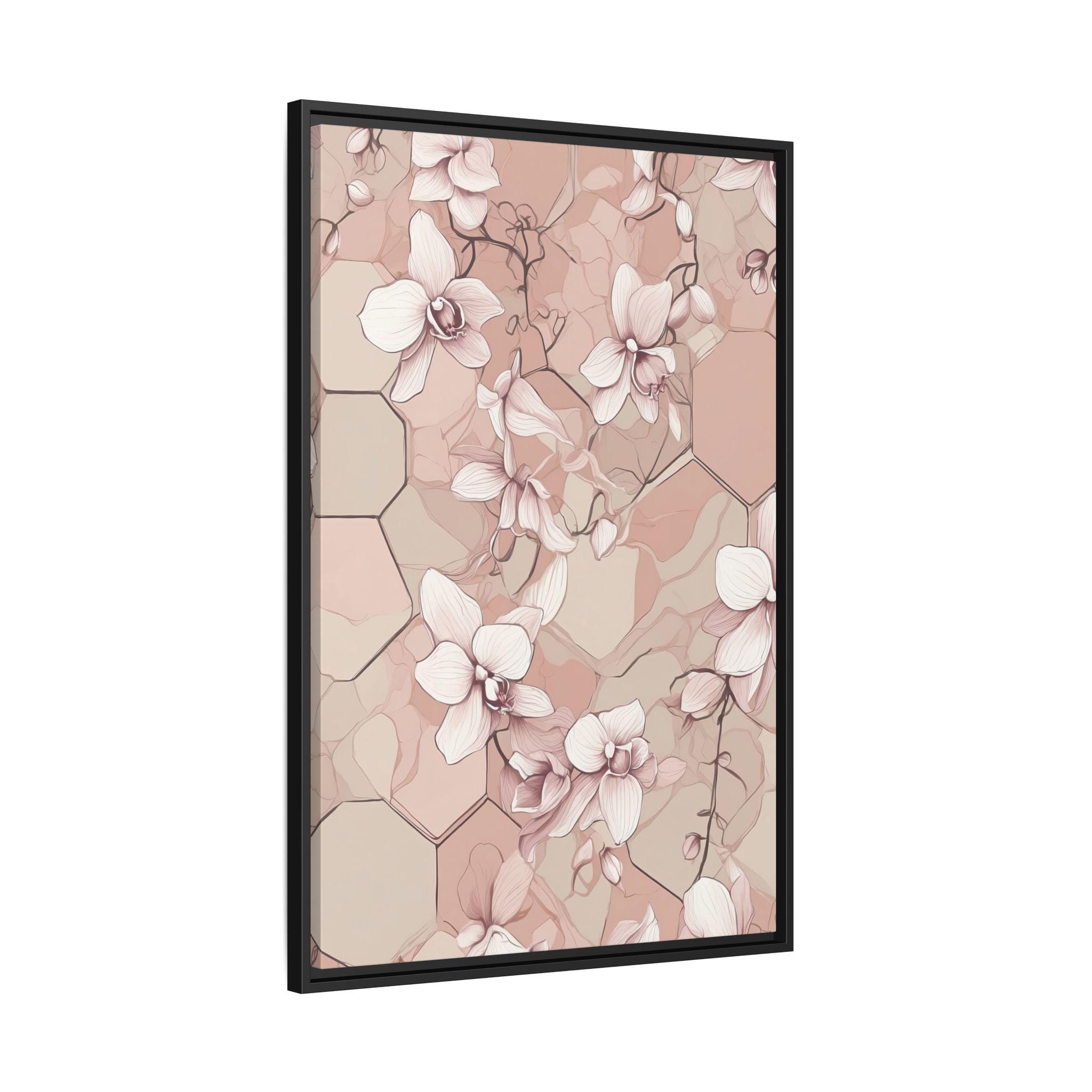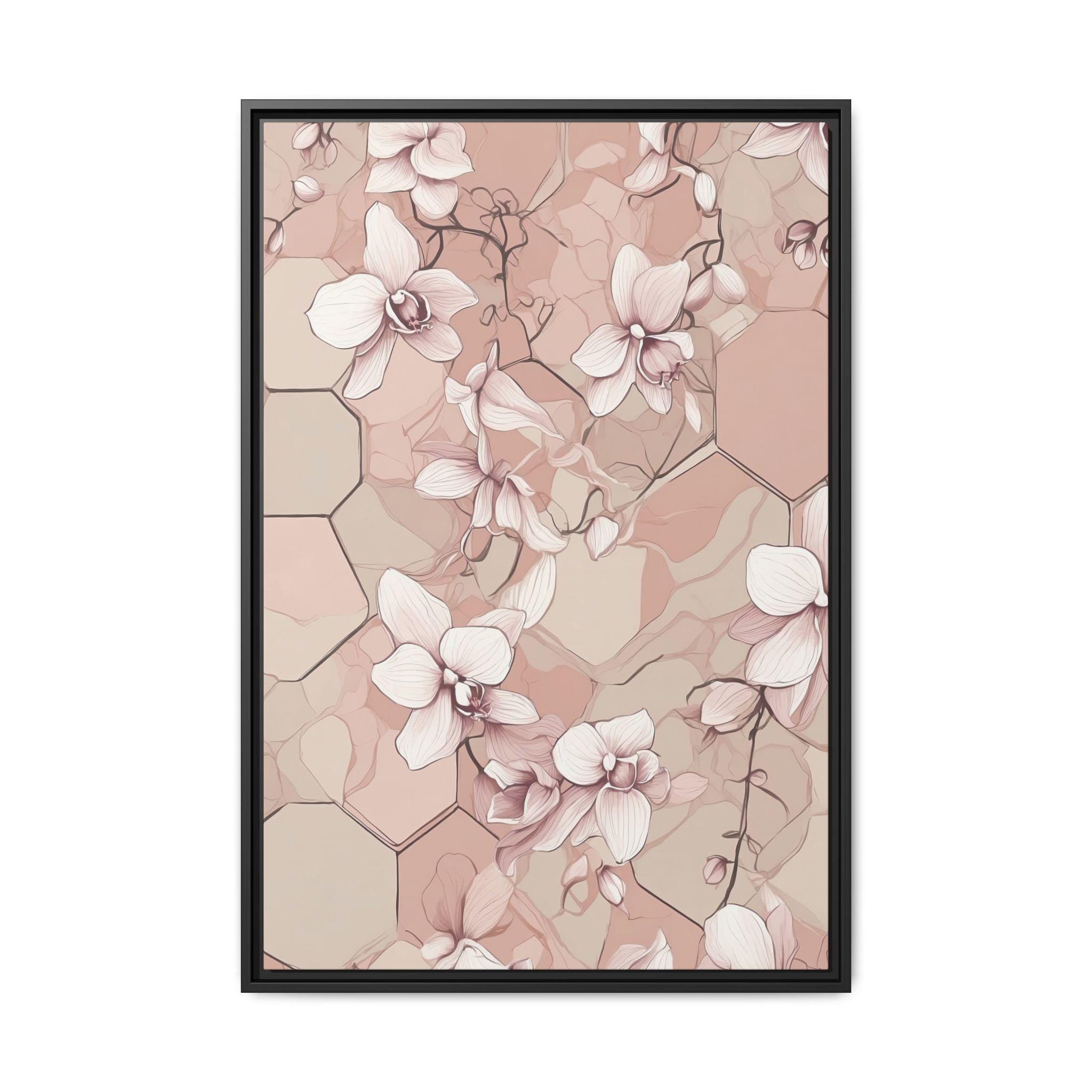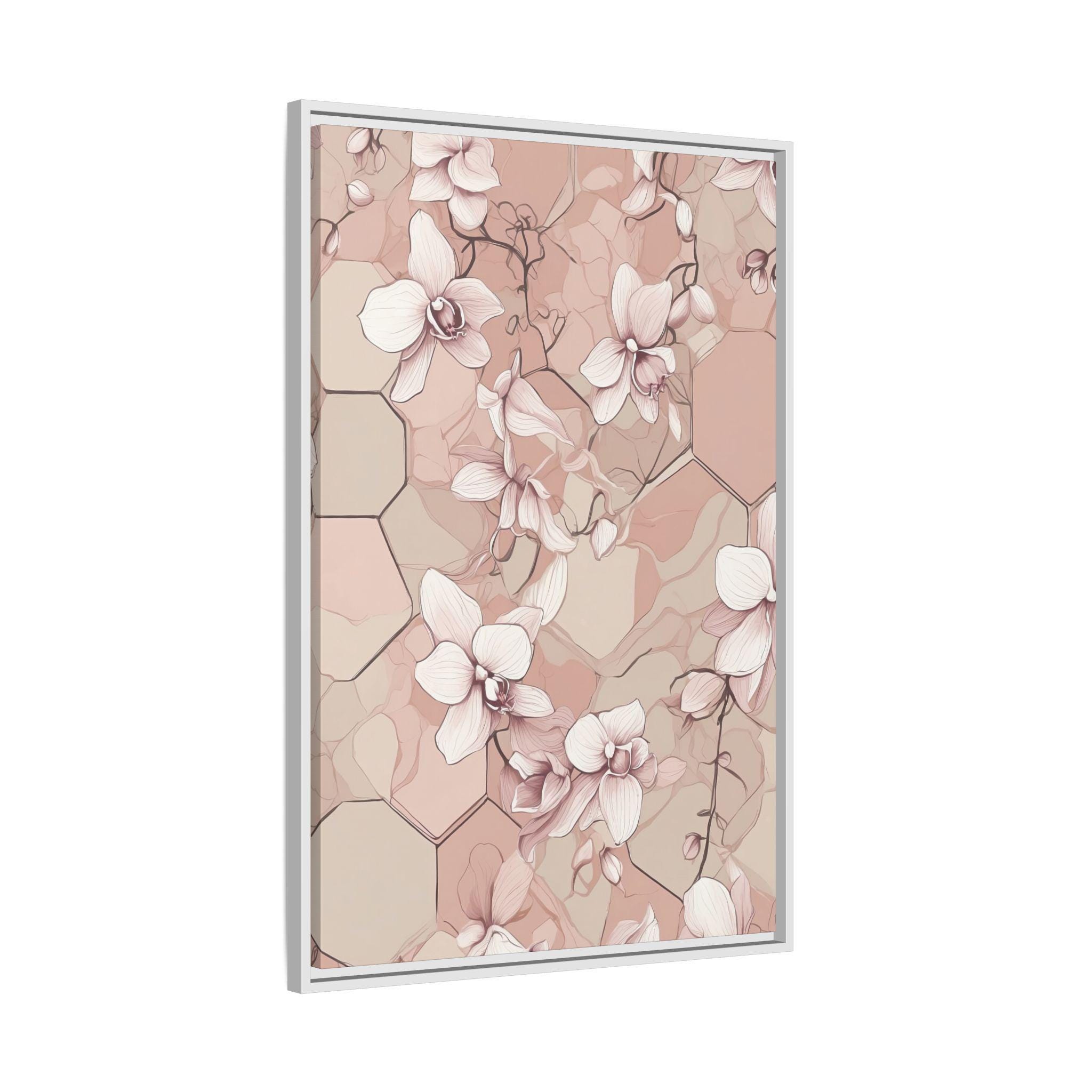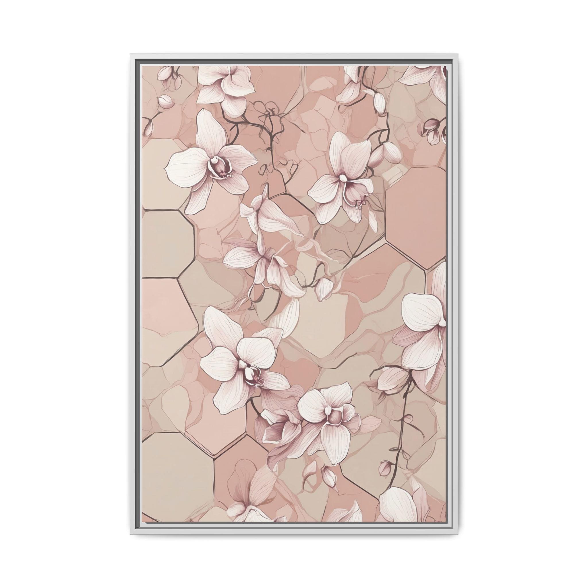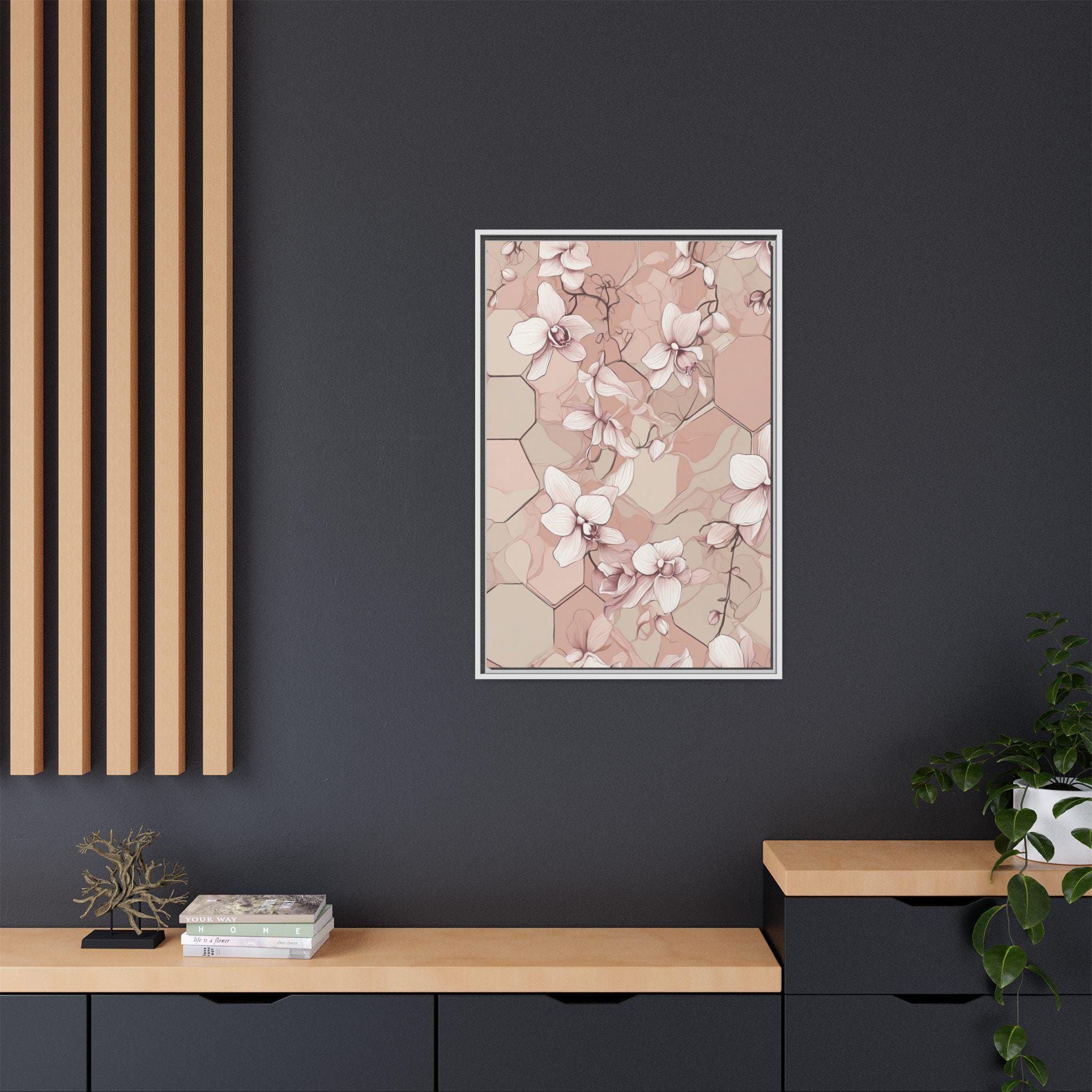 "Orchid Hex" features delicate orchid line art arranged within repeating hexagonal patterns, blending soft pastel blush and beige tones. The geometric structure combined with organic botanical details creates a sophisticated and modern minimalist composition. Its subtle elegance makes it a luxurious addition to any interior space.