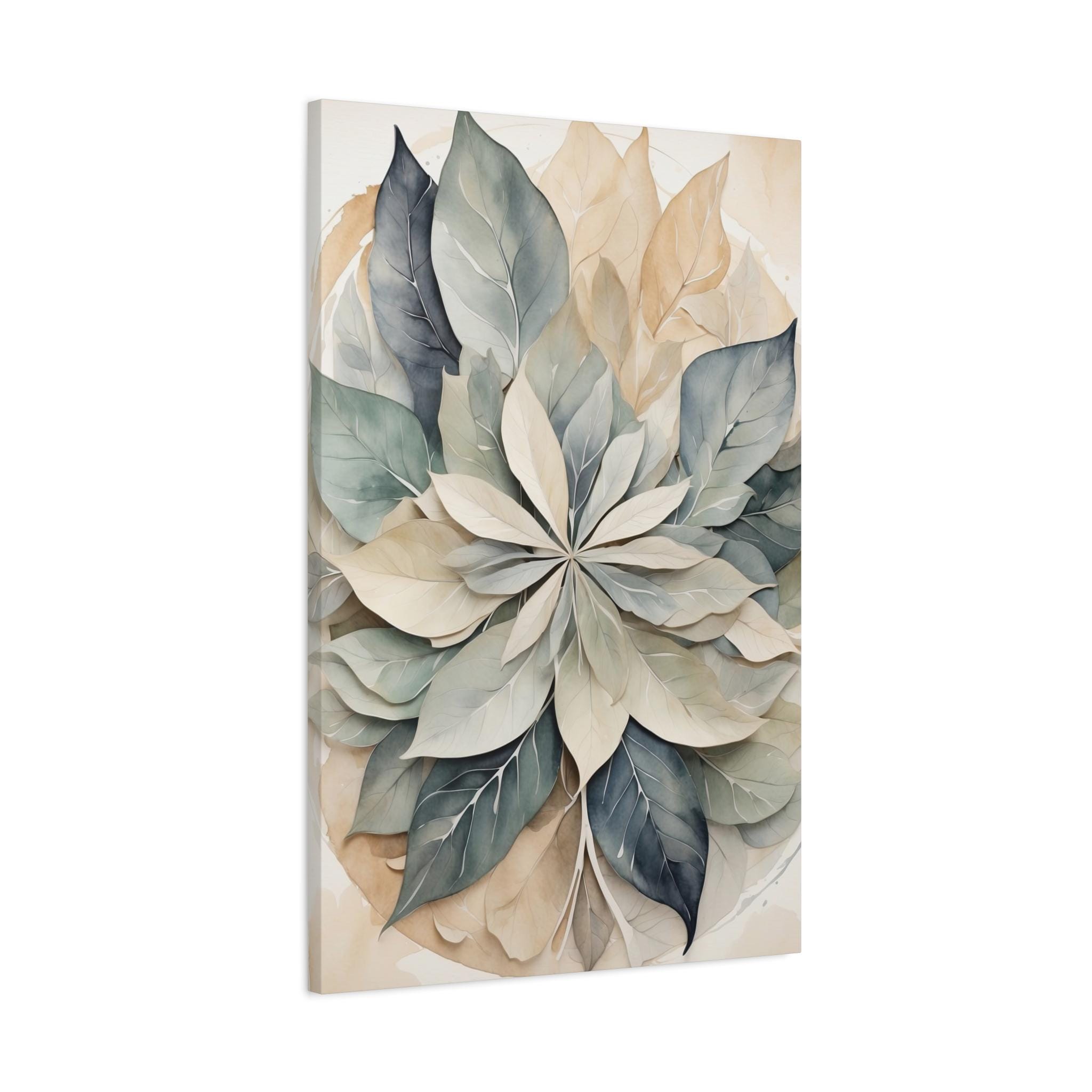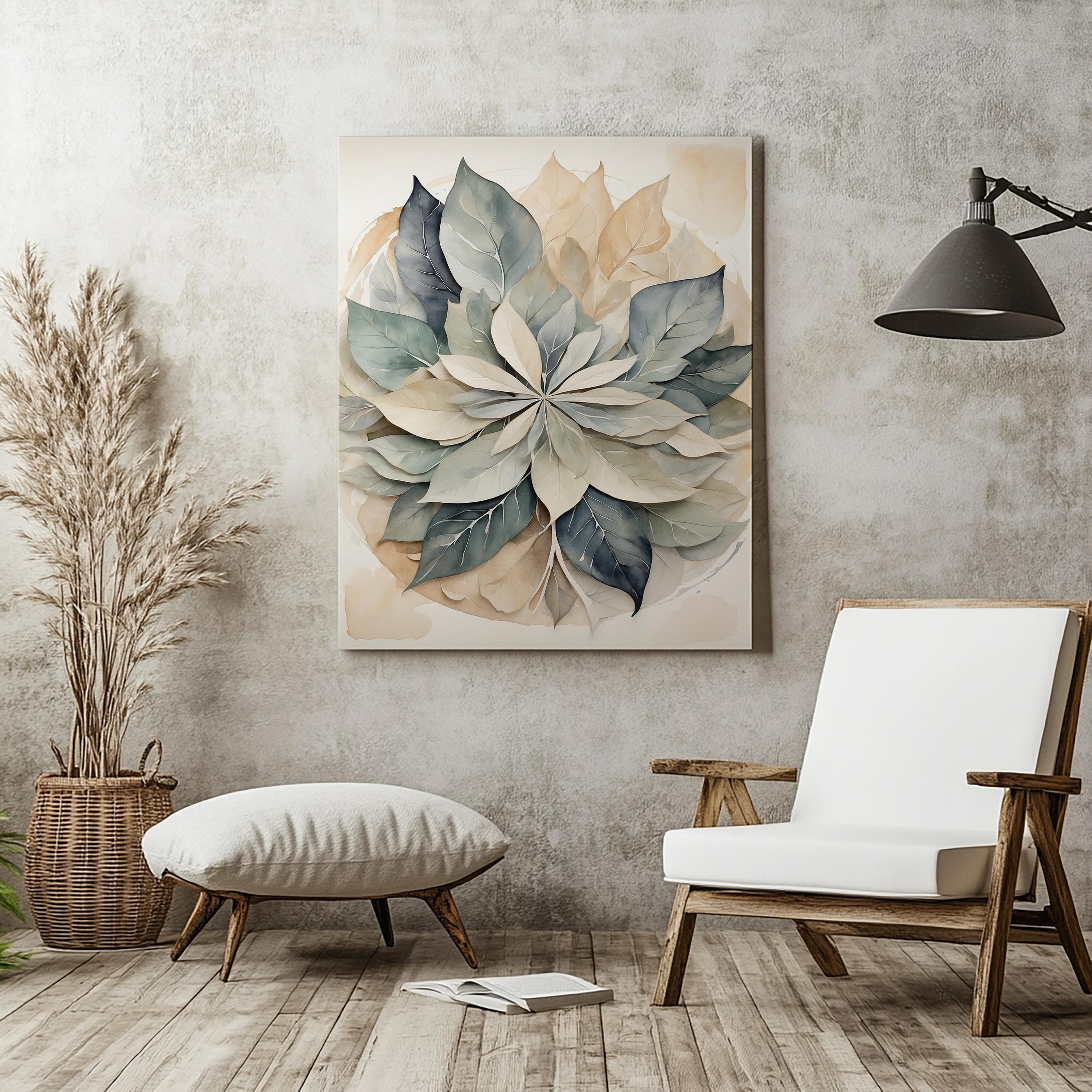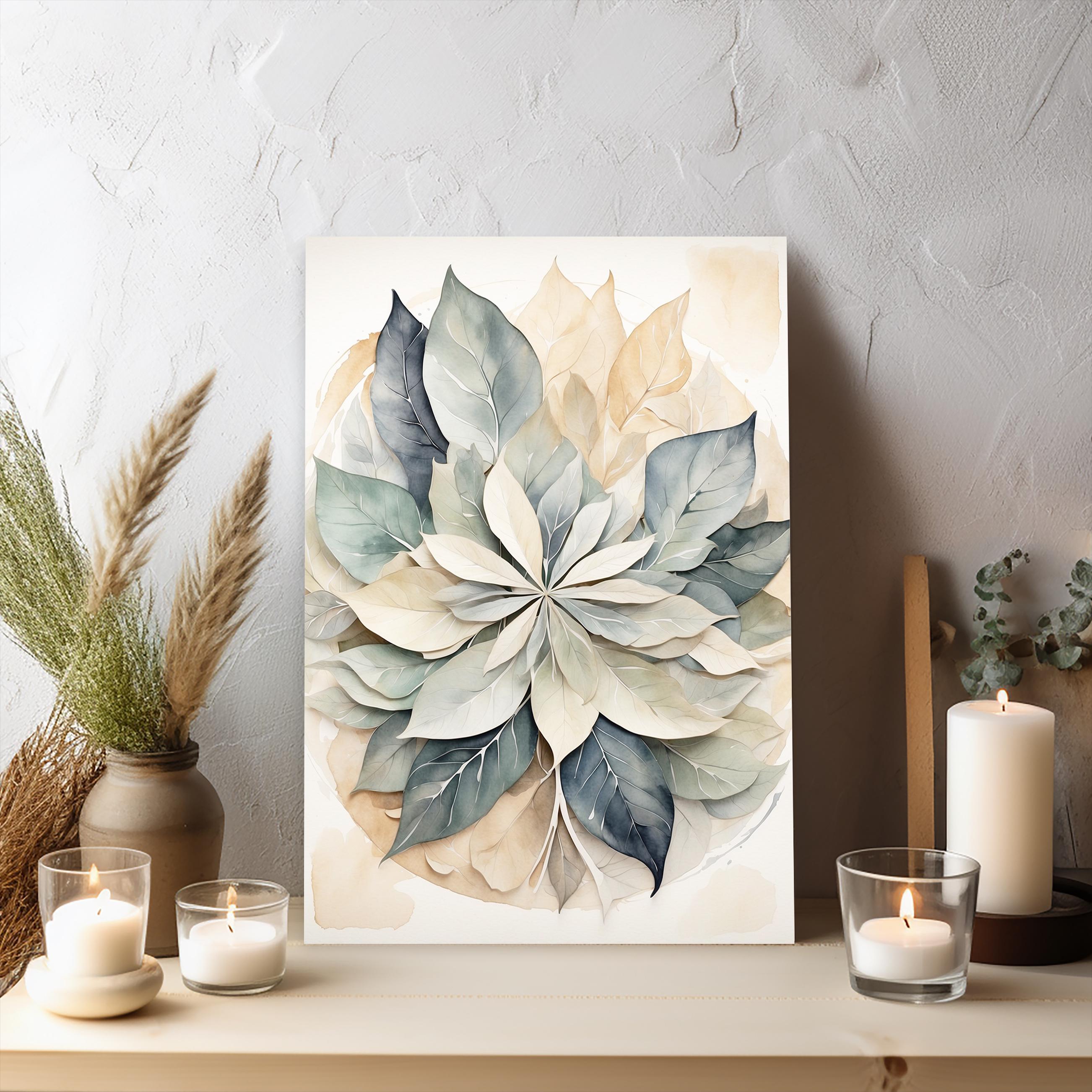 "Lumen Leaf" brings a serene balance to any space through its gentle interplay of form, texture, and color. Overlapping translucent leaves form a subtle mandala, rendered in a soft neutral palette with delicate watercolor texture. The result is an elegant, calming composition that embodies simplicity, harmony, and understated sophistication.