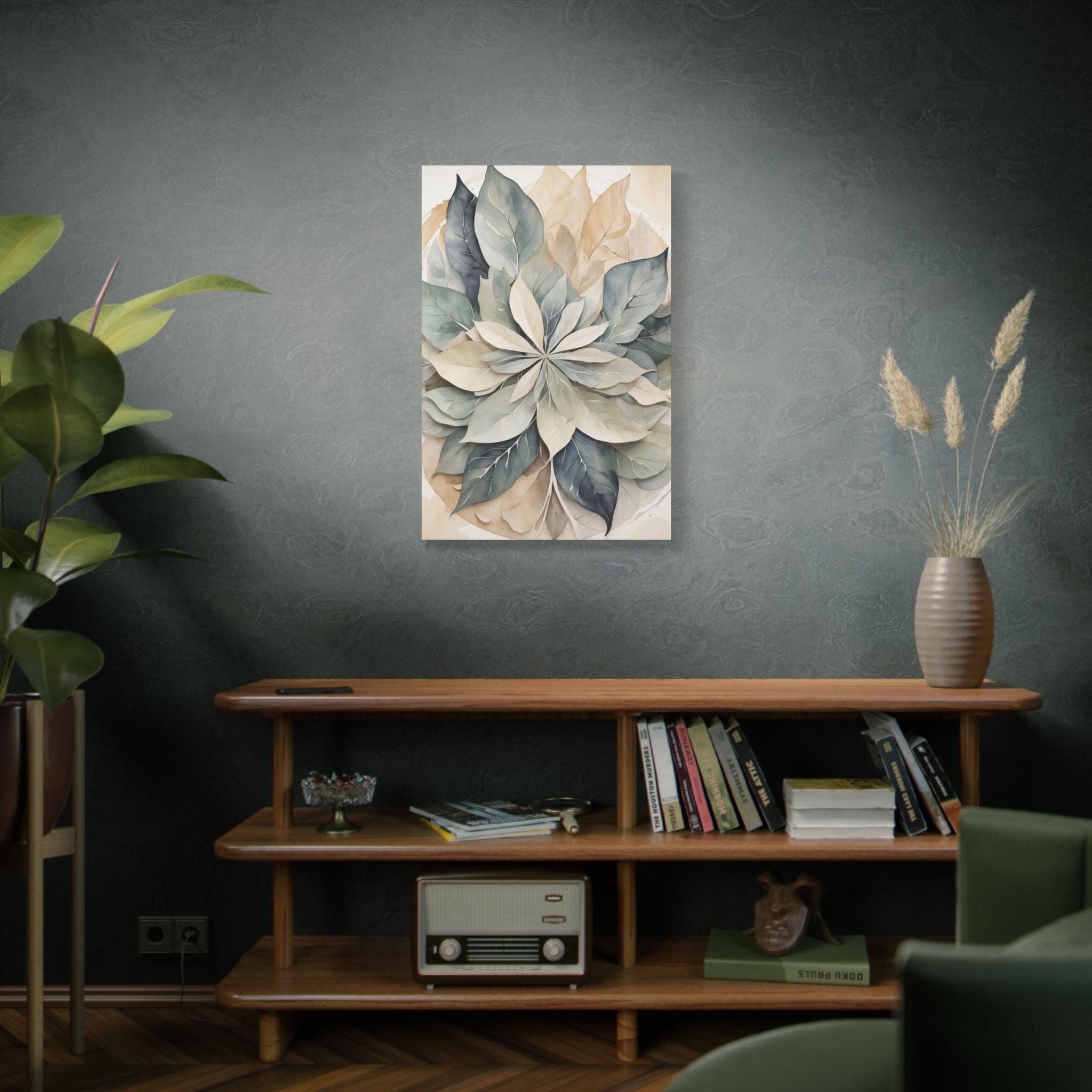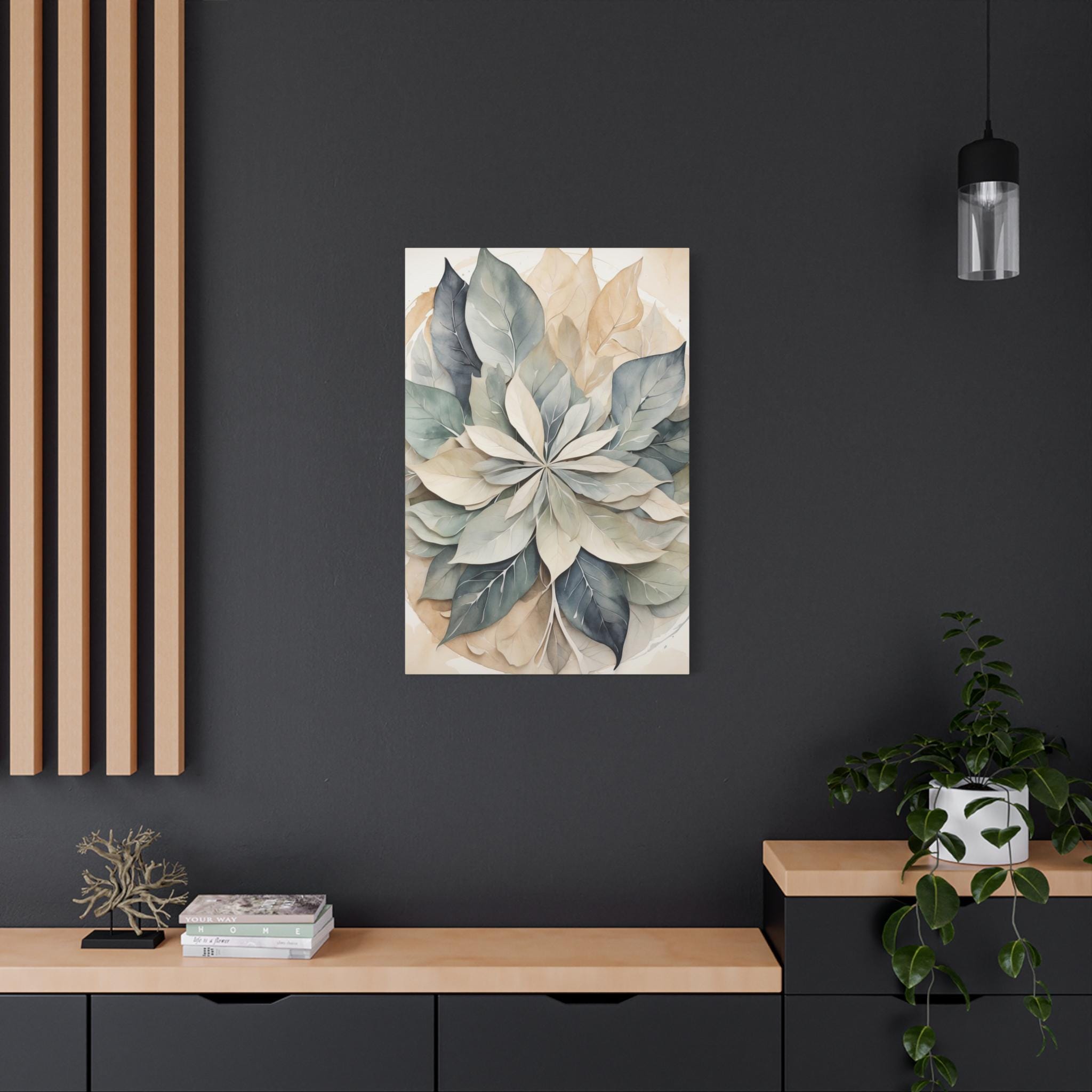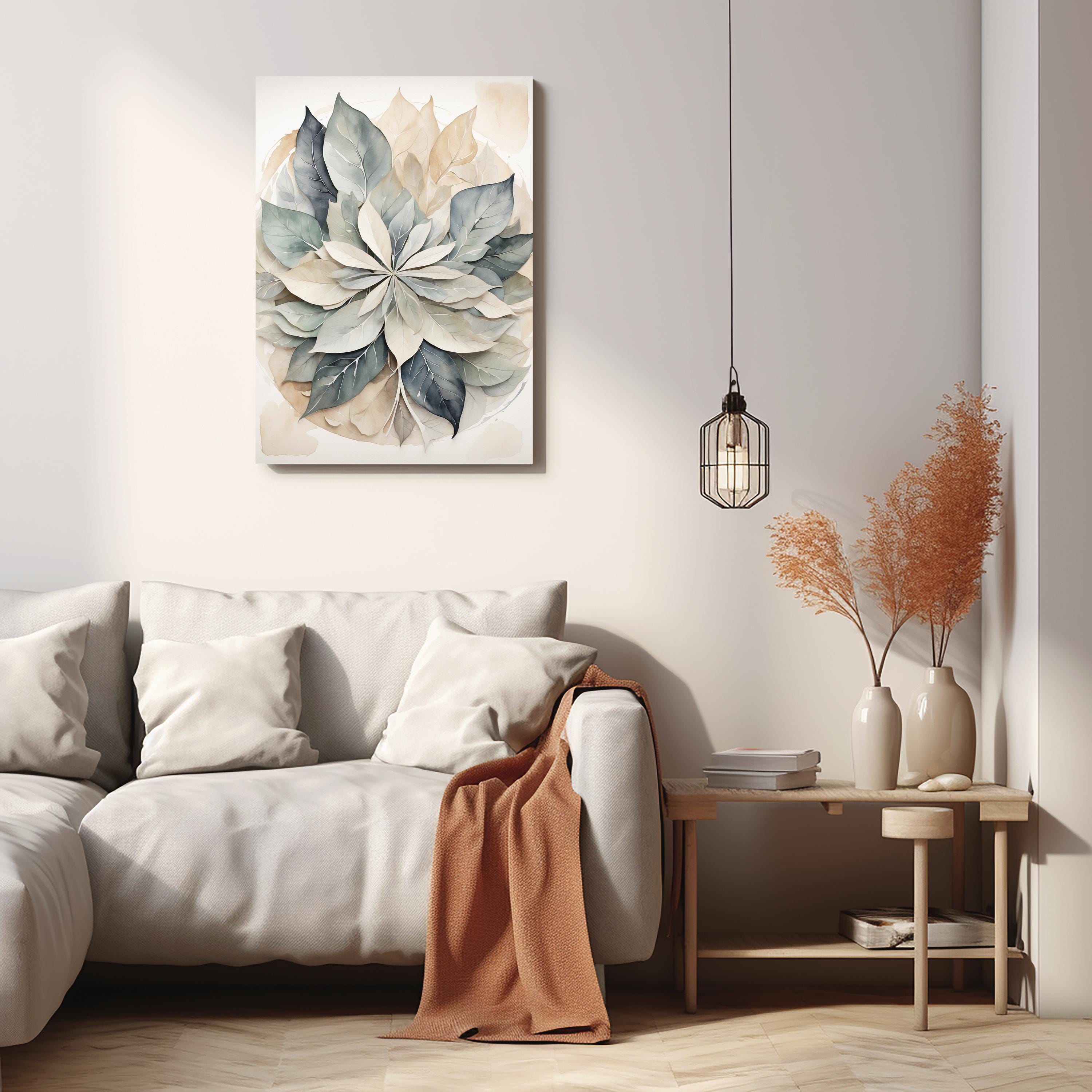 "Lumen Leaf" brings a serene balance to any space through its gentle interplay of form, texture, and color. Overlapping translucent leaves form a subtle mandala, rendered in a soft neutral palette with delicate watercolor texture. The result is an elegant, calming composition that embodies simplicity, harmony, and understated sophistication.