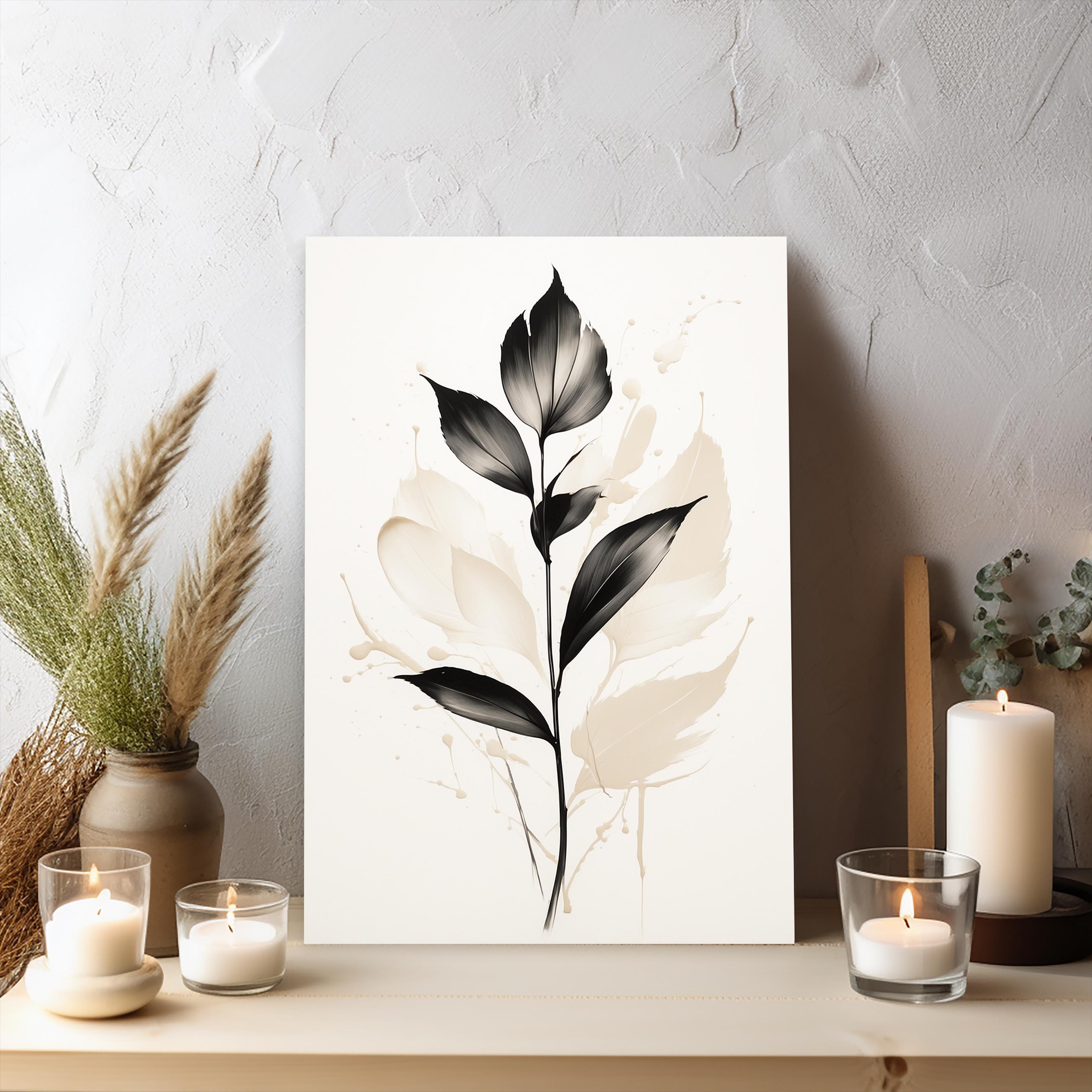 "Zen Leaf" embodies the quiet beauty of simplicity. A single leaf is rendered in expressive monochrome ink brushstrokes against a light cream background, capturing the balance, restraint, and subtle elegance of Japanese Zen-inspired design. The minimalist composition evokes calm and refined sophistication.
