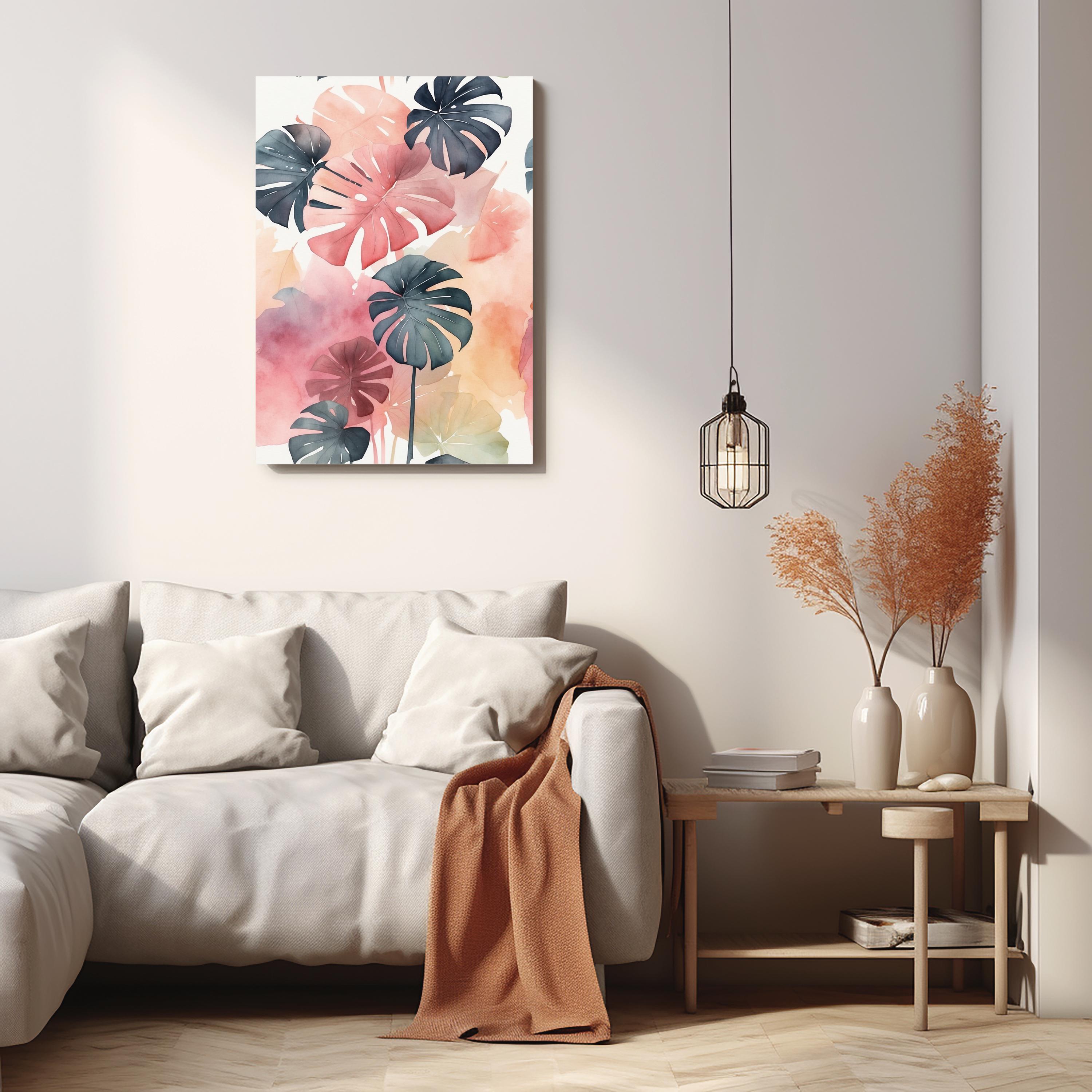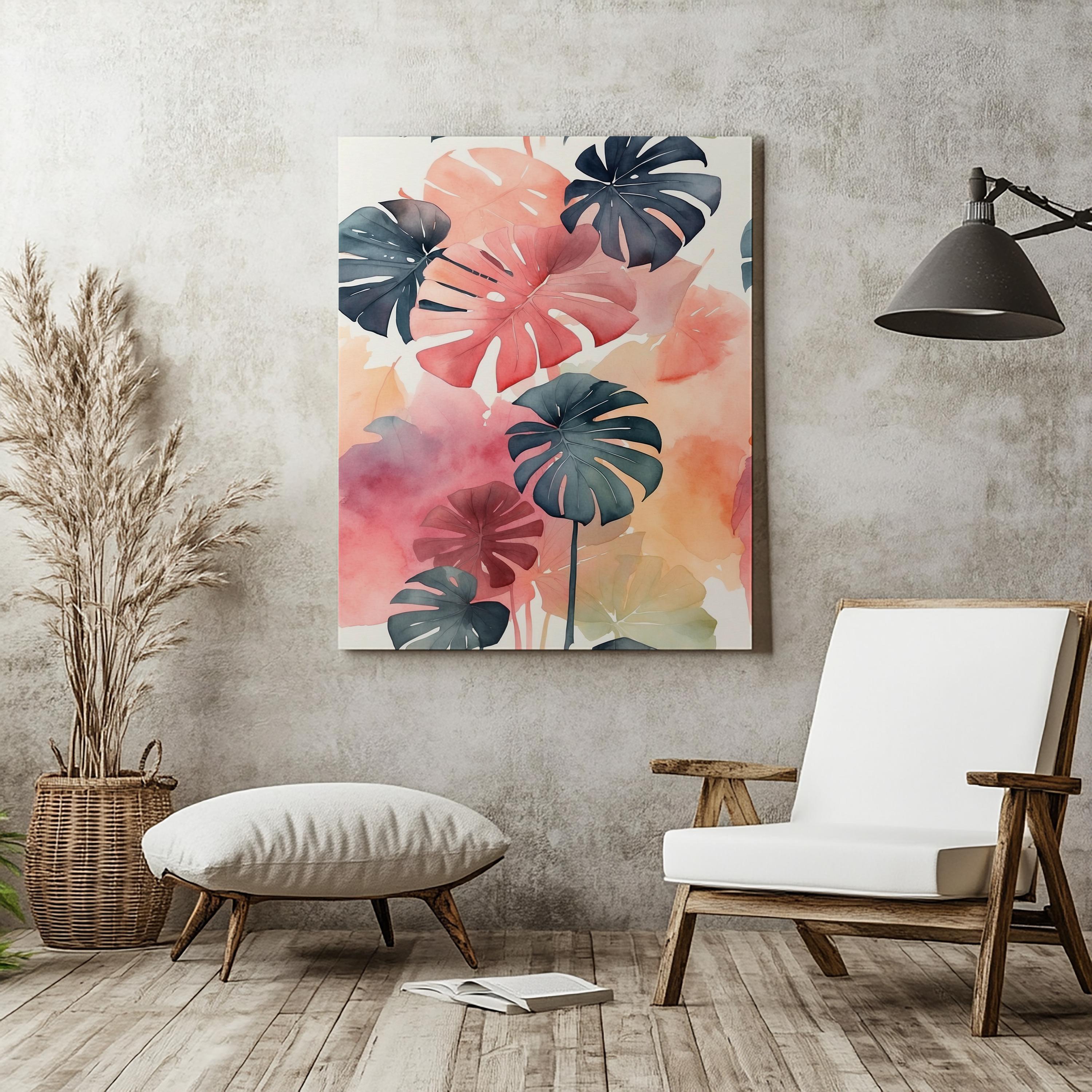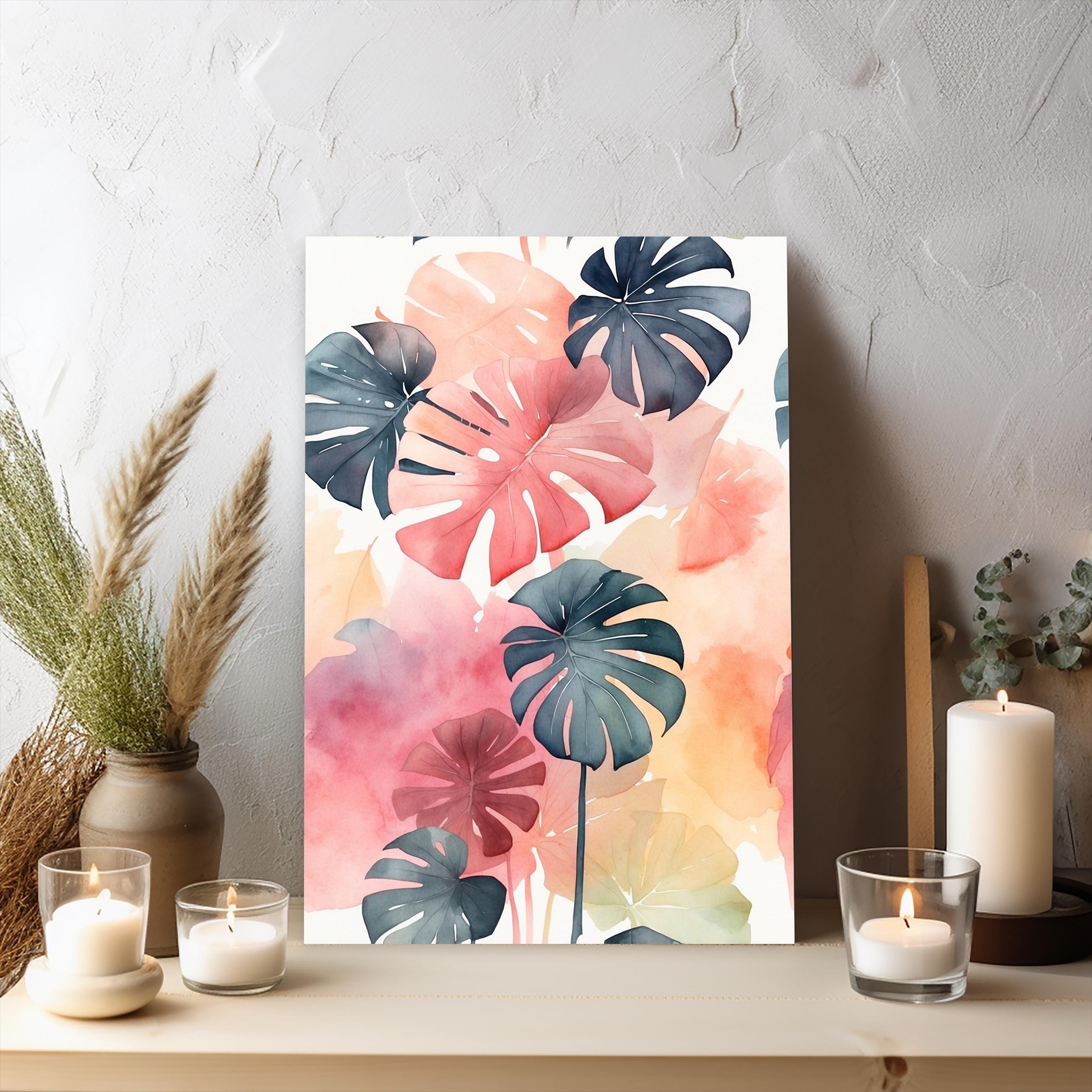 "Verdant Fade" blends fluidity and form in a study of calm contrast. A soft watercolor gradient flows gently across the canvas, providing a dreamy backdrop for a single bold monstera silhouette. The result is a balanced interplay of softness and structure — modern, minimal, and effortlessly elegant.