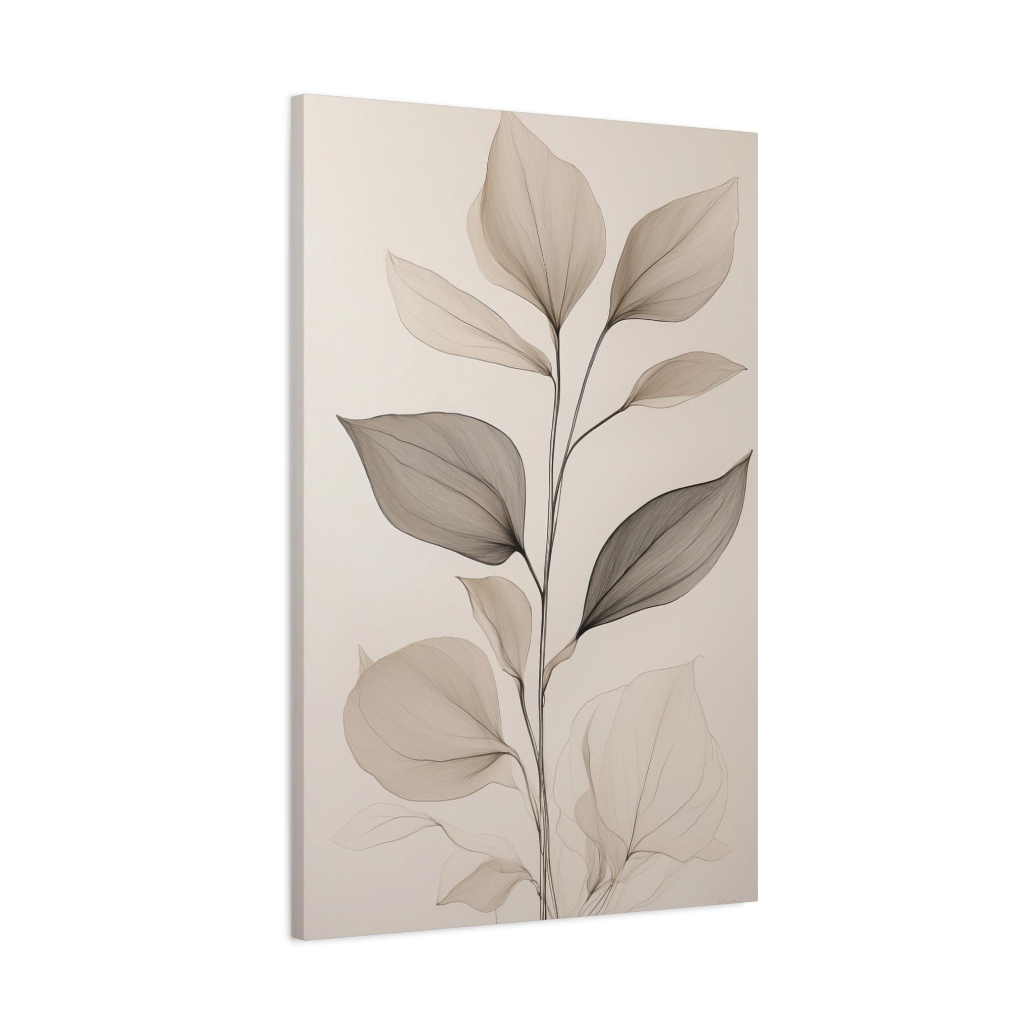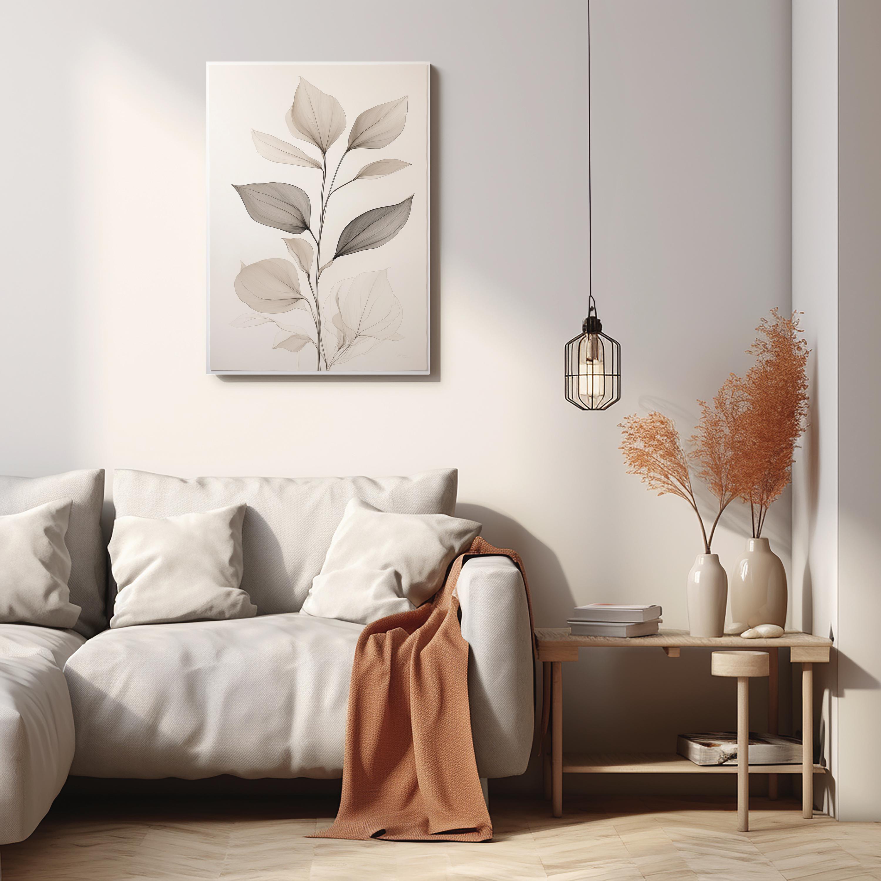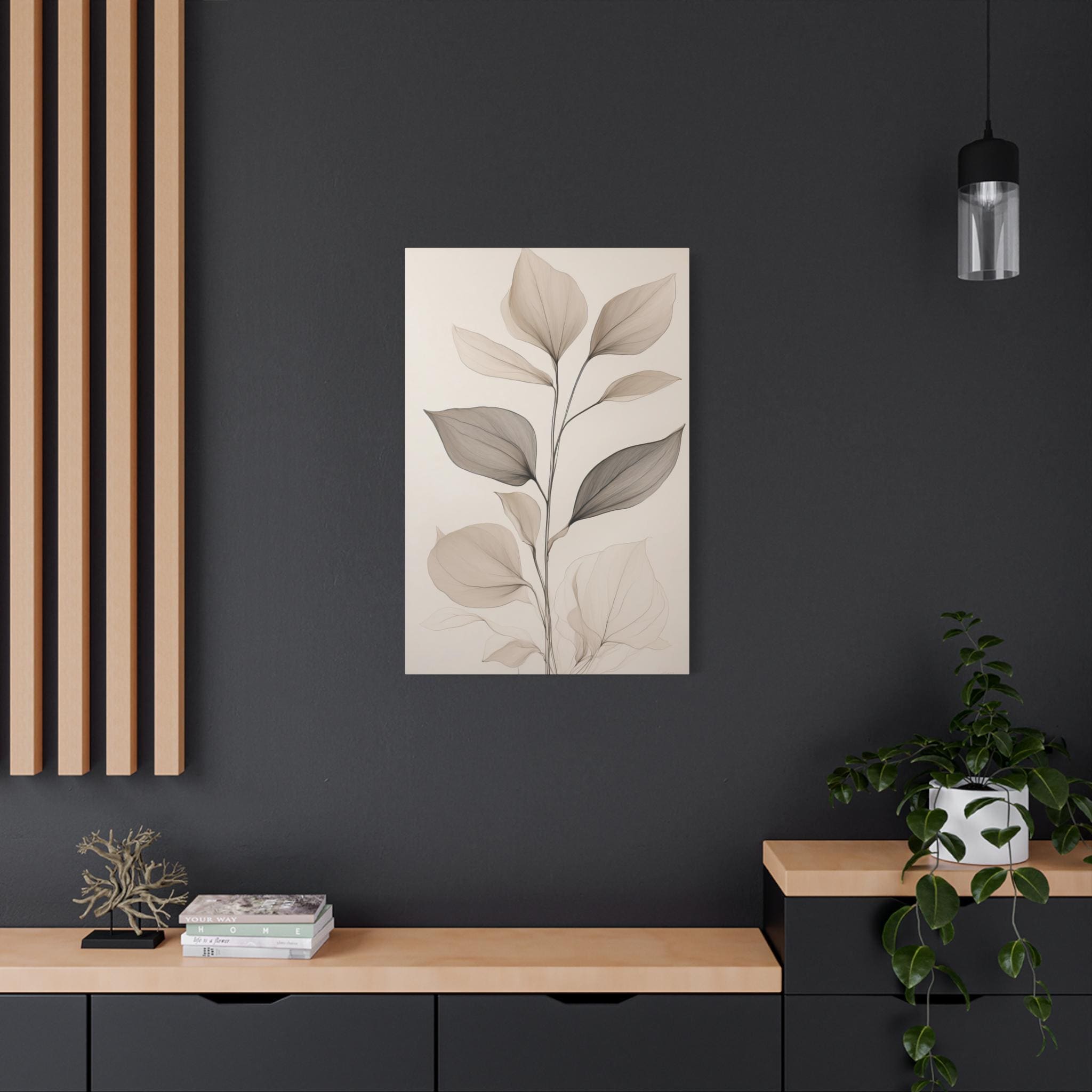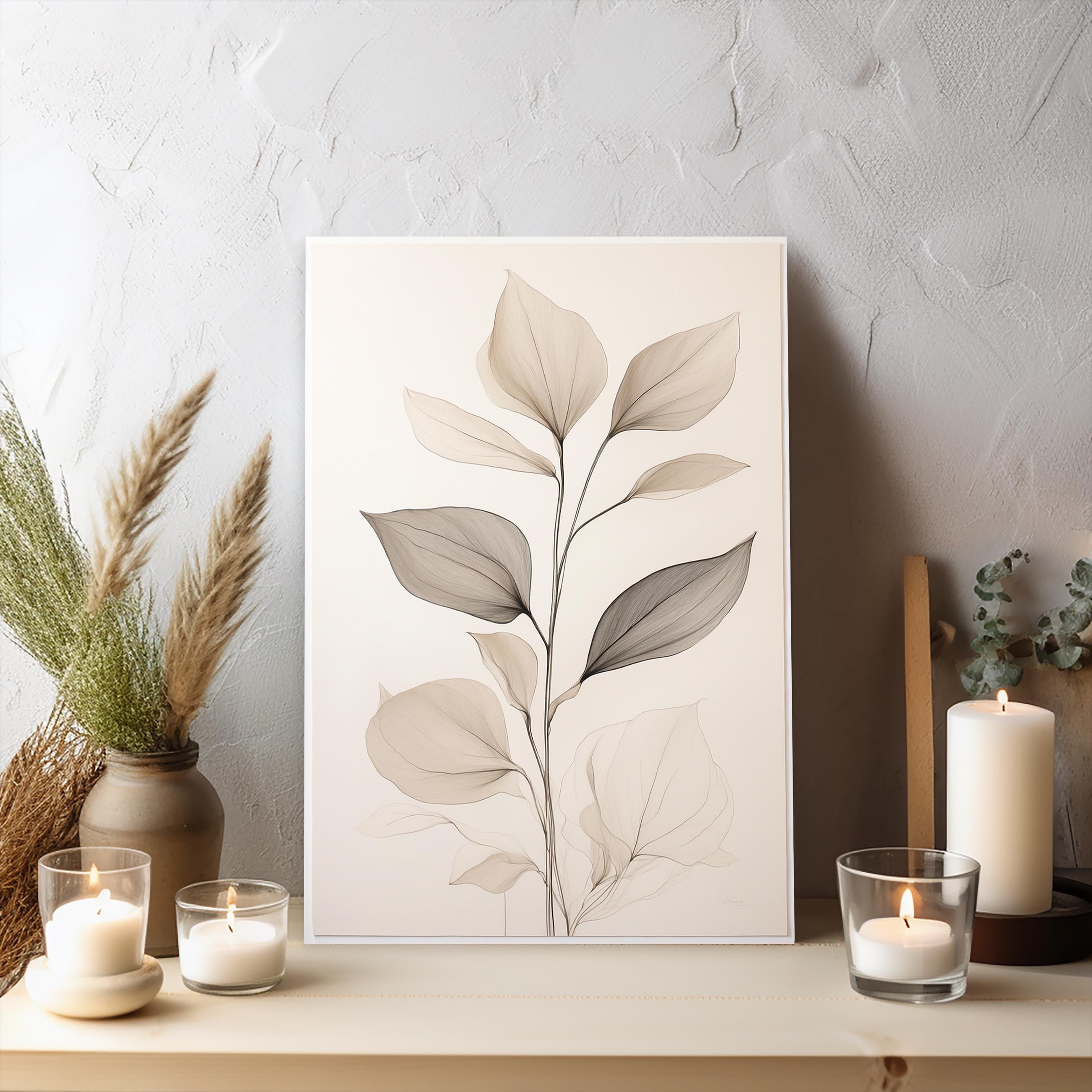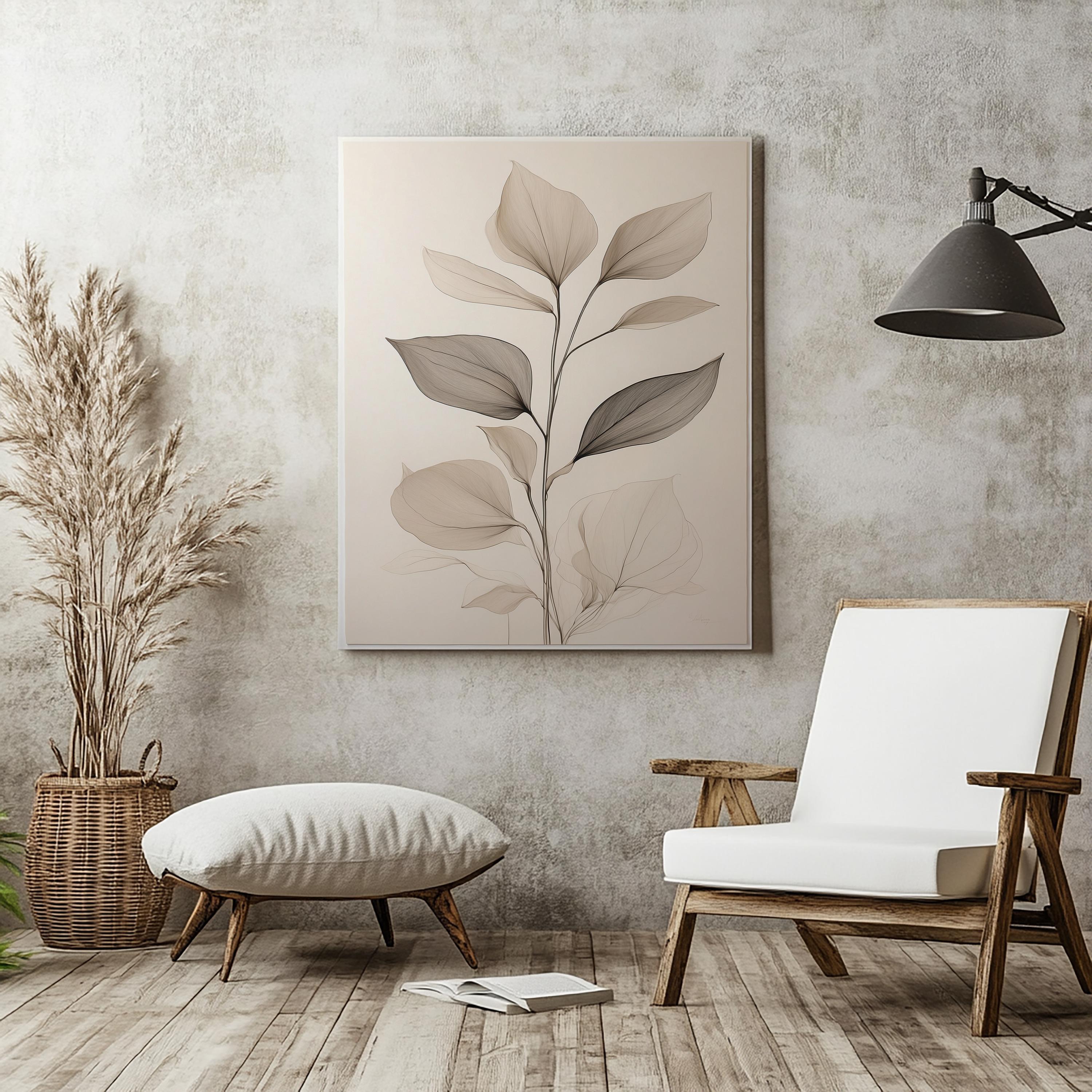 "Whisper Line" celebrates the elegance of restraint — a single botanical form rendered in soft charcoal lines against a subtle pale taupe backdrop. With its intentional use of negative space and gentle texture, this piece embodies modern calm and timeless simplicity.