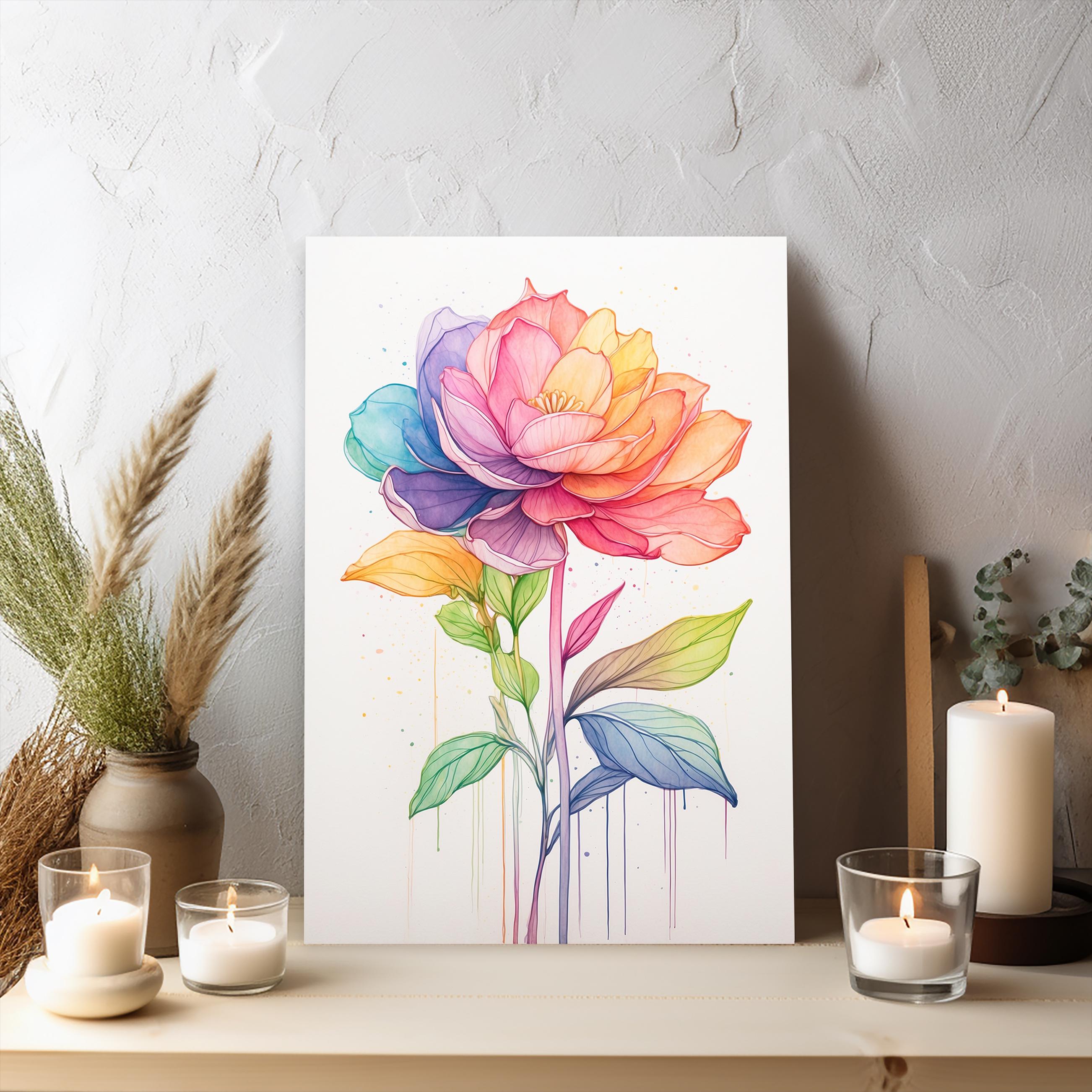"Rainbow Bloom" celebrates the harmony of simplicity and color. A continuous line flower is softly filled with gentle watercolor rainbow gradients, creating a modern, uplifting botanical composition. The minimalist yet vibrant design brings elegance and visual interest without overwhelming the space.