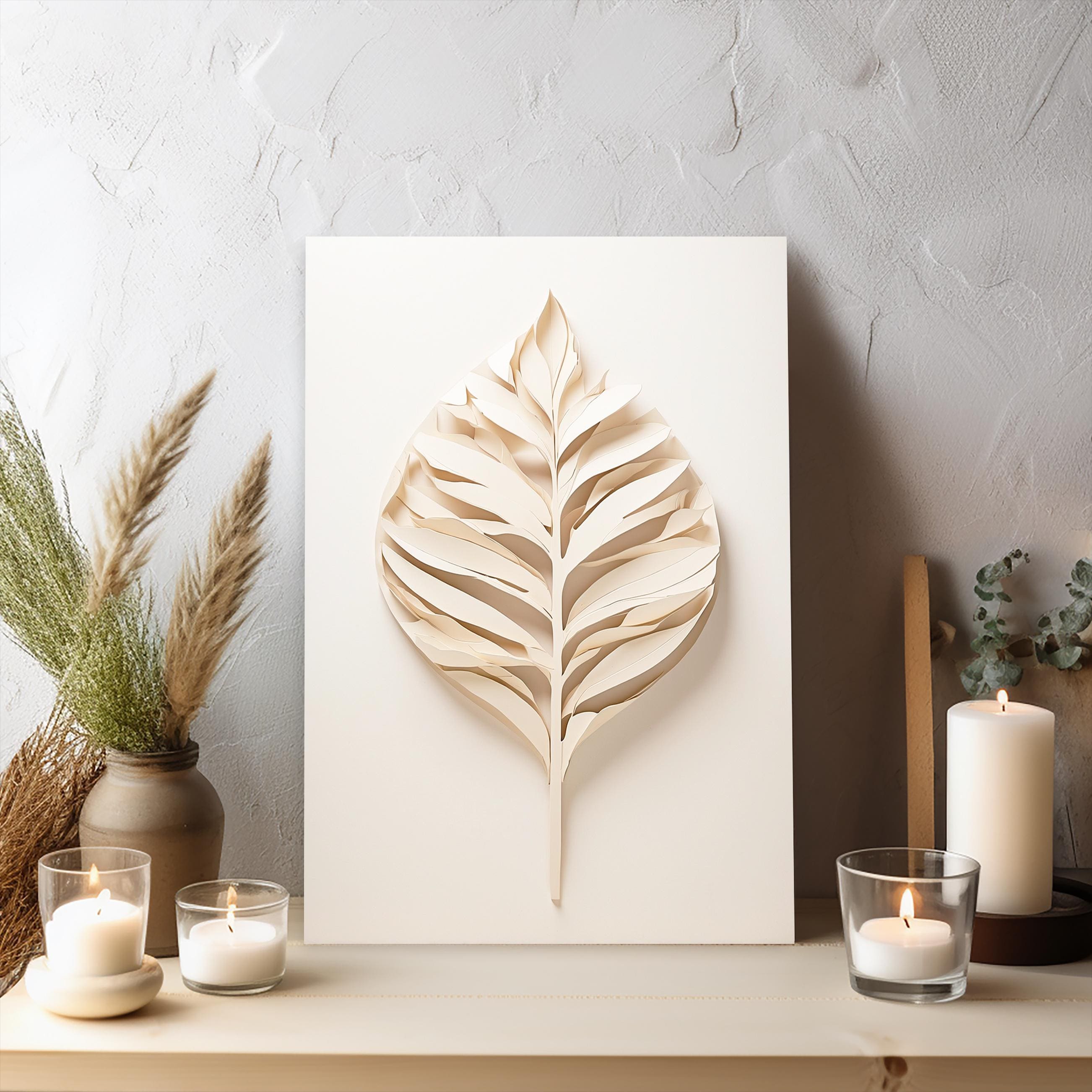 "Sol Leaf" embodies the art of simplicity through absence and form. A single abstract leaf shape, cut from soft muted beige, rests against a tranquil ivory backdrop — creating an elegant balance of contrast and calm. The clean composition and gentle tones highlight the beauty of negative space, resulting in a timeless piece that feels effortlessly refined.