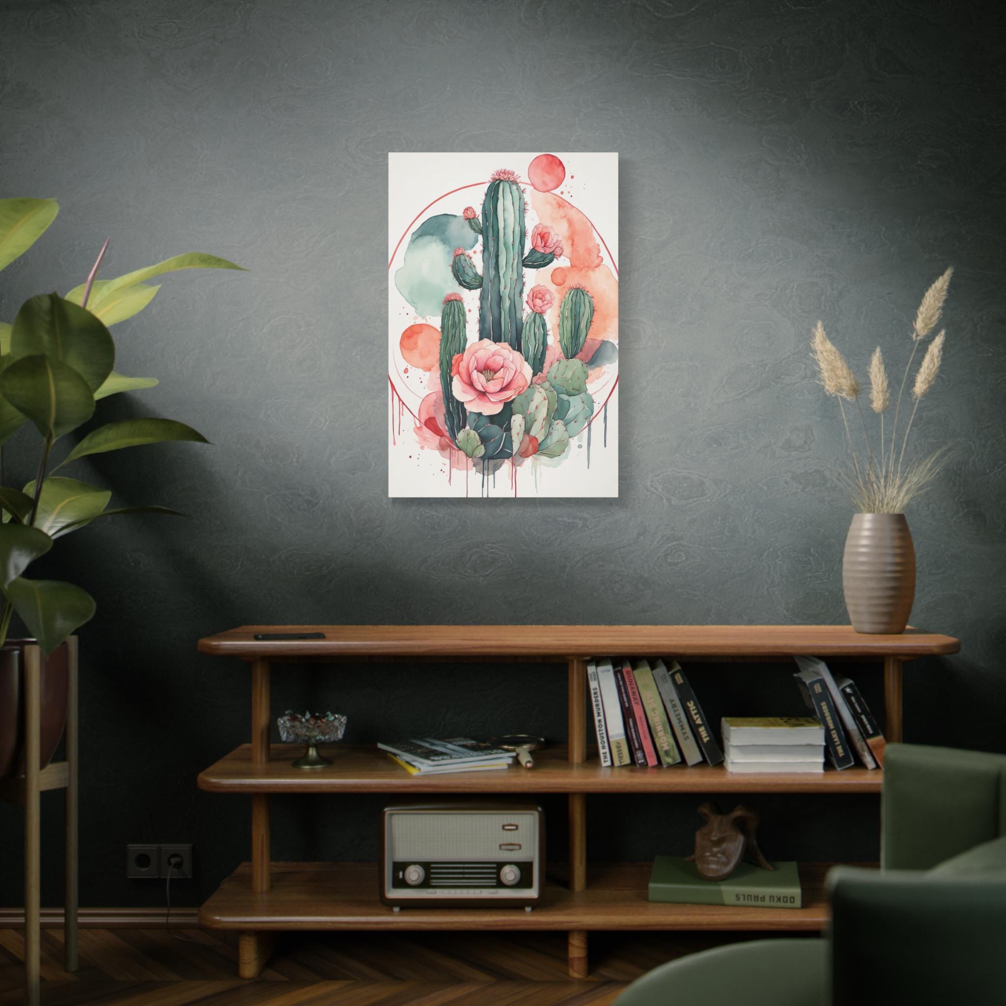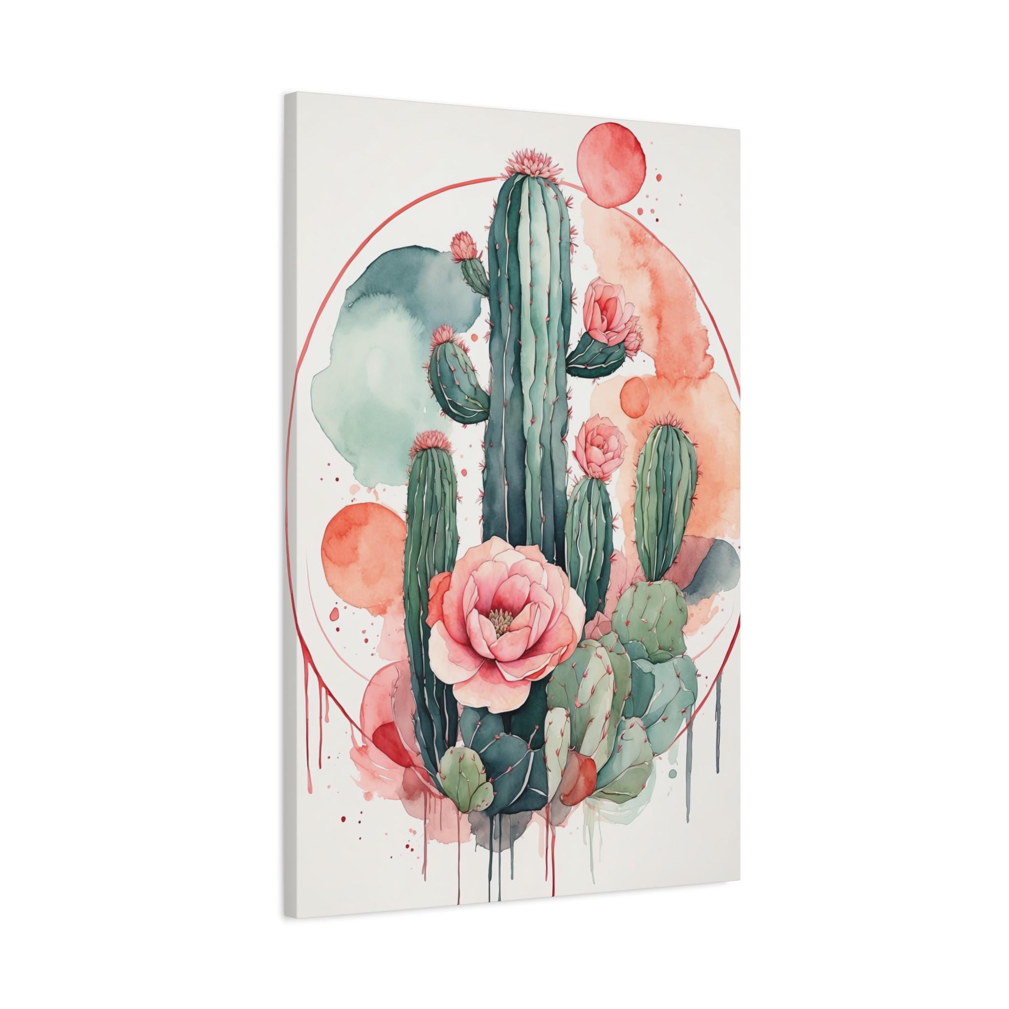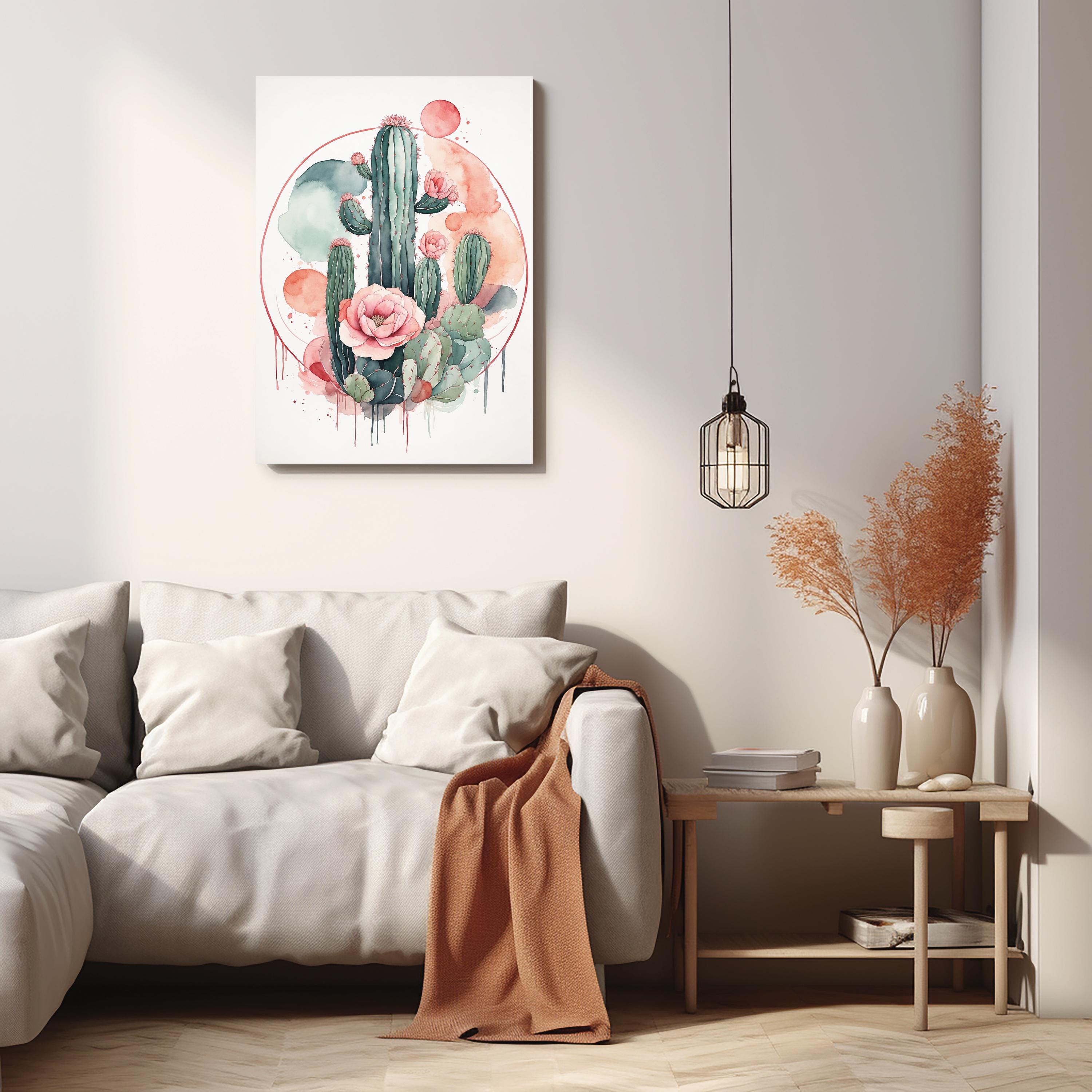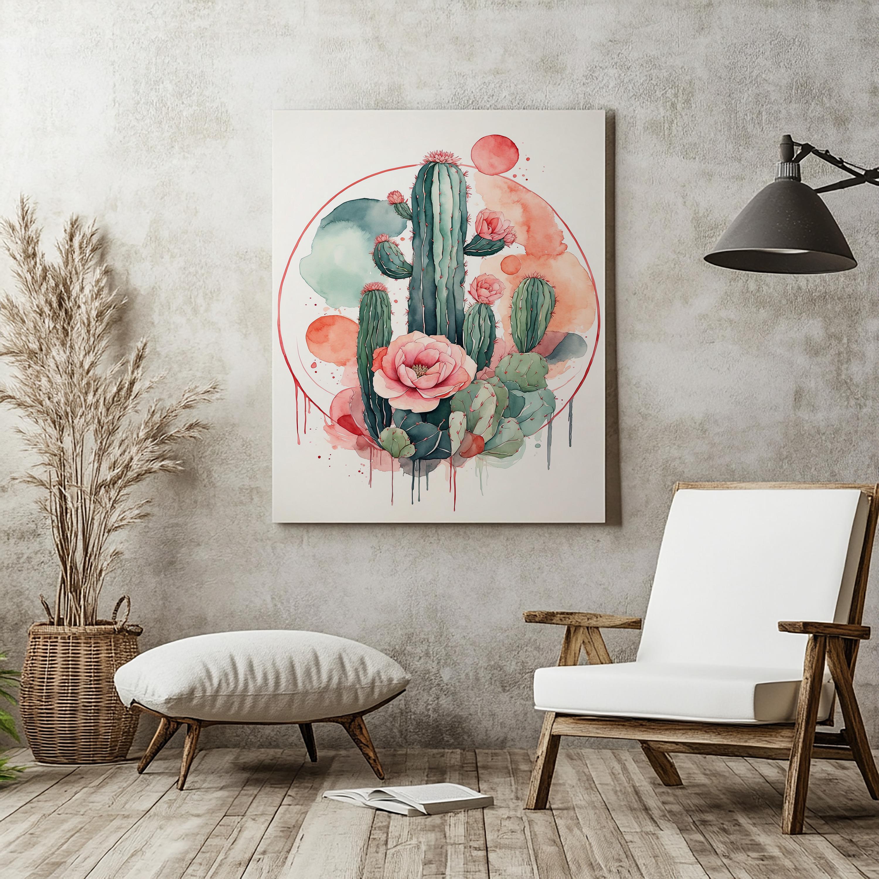 "Desert Bloom" distills the quiet beauty of desert landscapes into elegant simplicity. A delicate cactus outline flows effortlessly across soft circular pastel forms, painted in muted watercolor tones that bring calm and warmth to any interior. The balance of organic lines and geometric shapes embodies modern minimalism with a serene, bohemian twist.