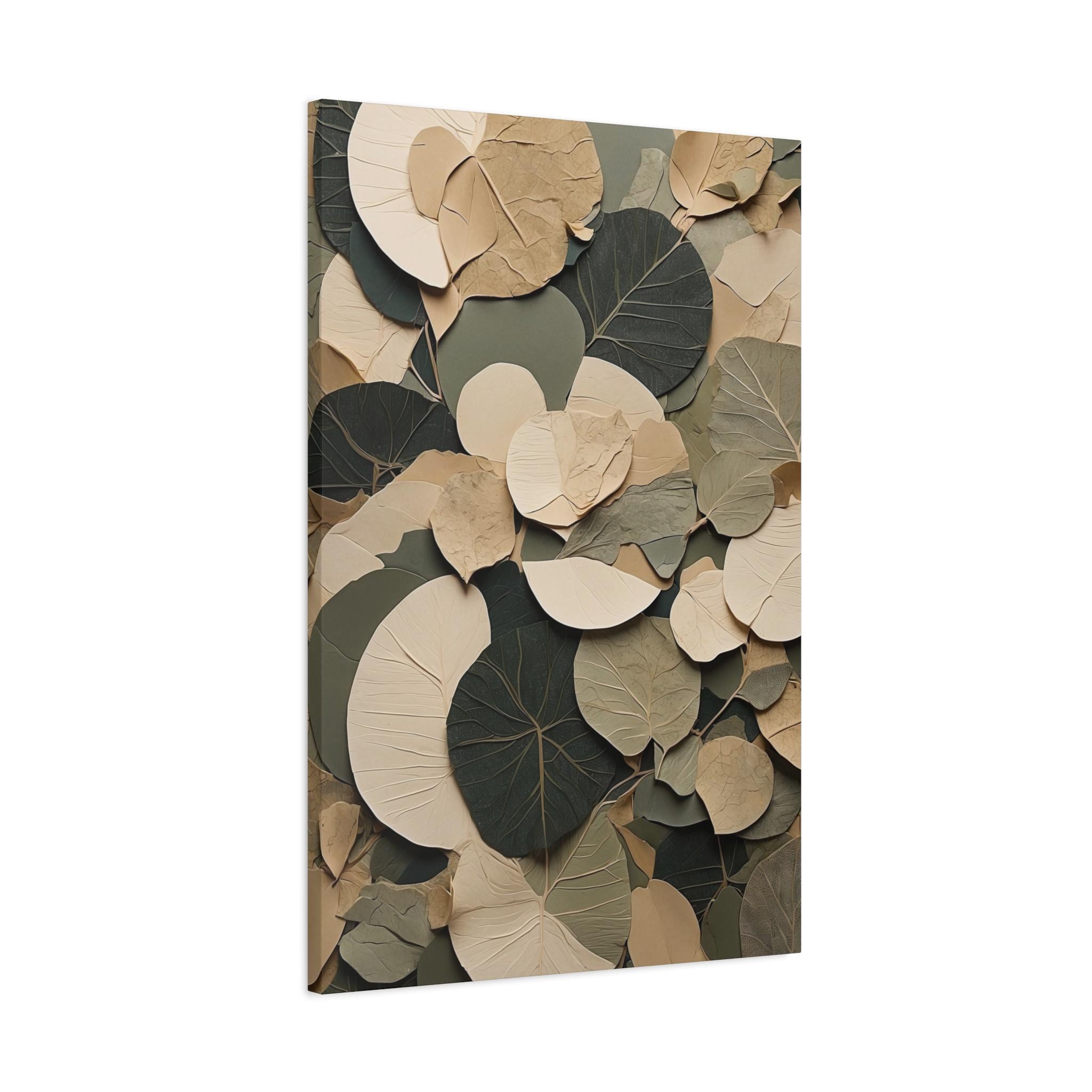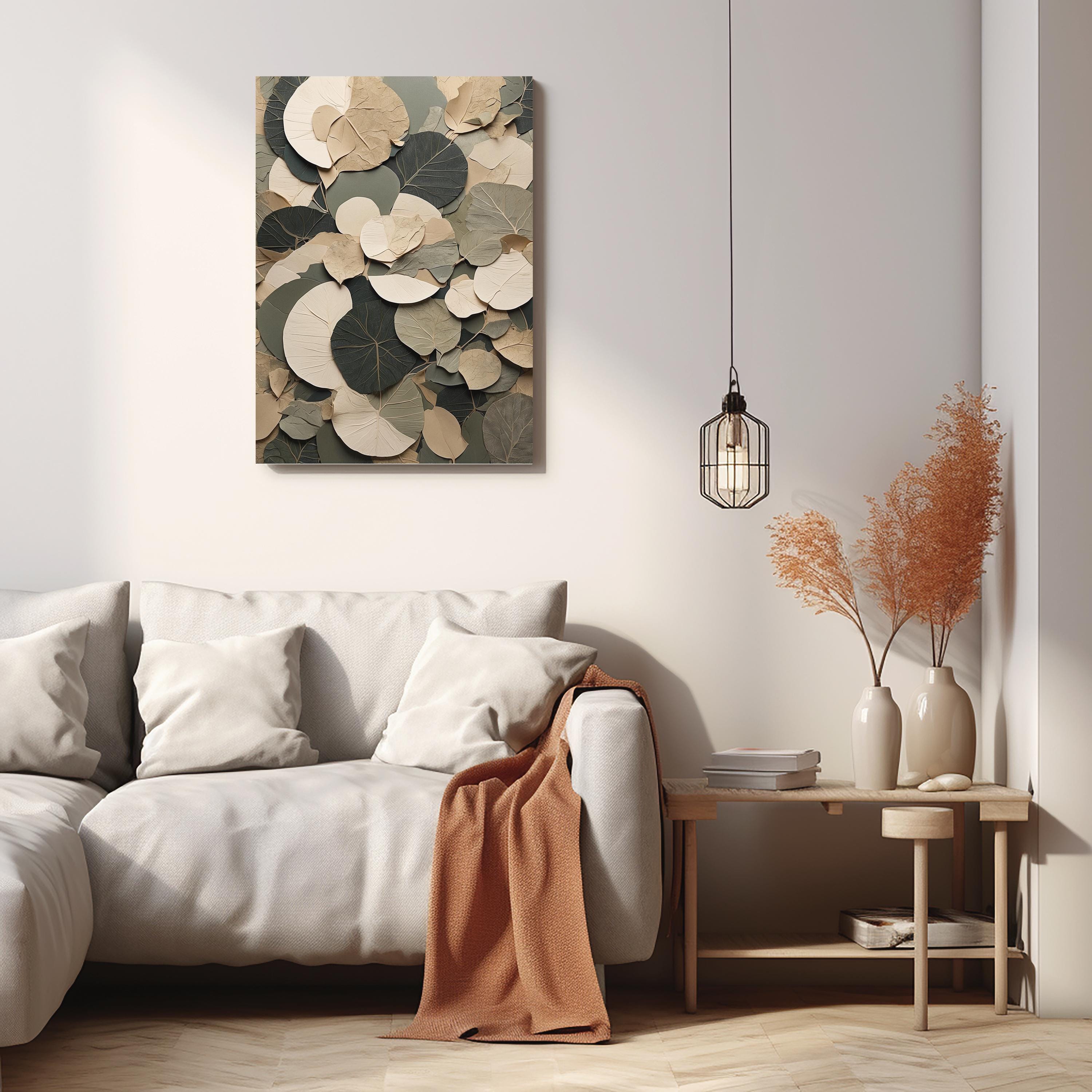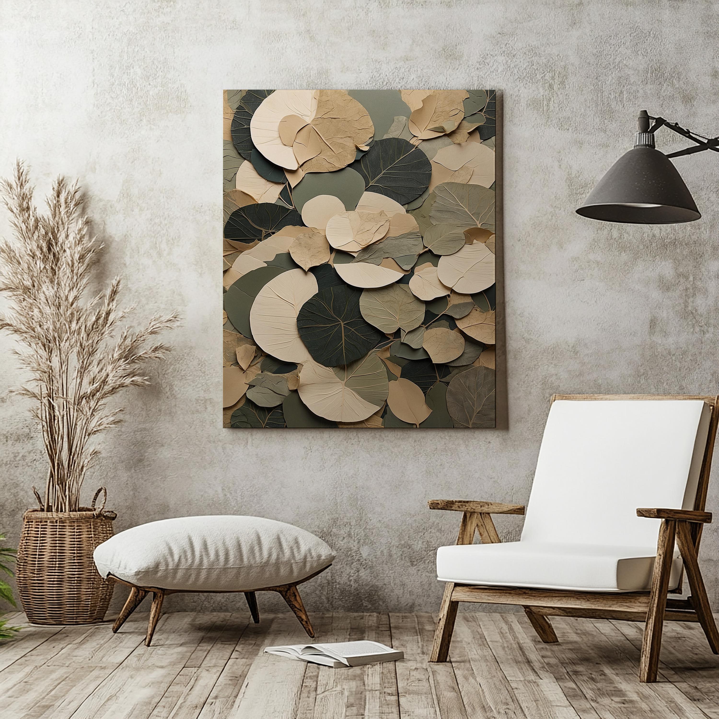 "Olive Aura" captures the quiet harmony between geometry and nature. Soft overlapping circles are filled with delicate botanical leaf textures, layered in calming hues of muted olive and sand. This minimalist yet artful composition brings depth and tranquility to any space — perfectly balanced between structure and organic warmth.