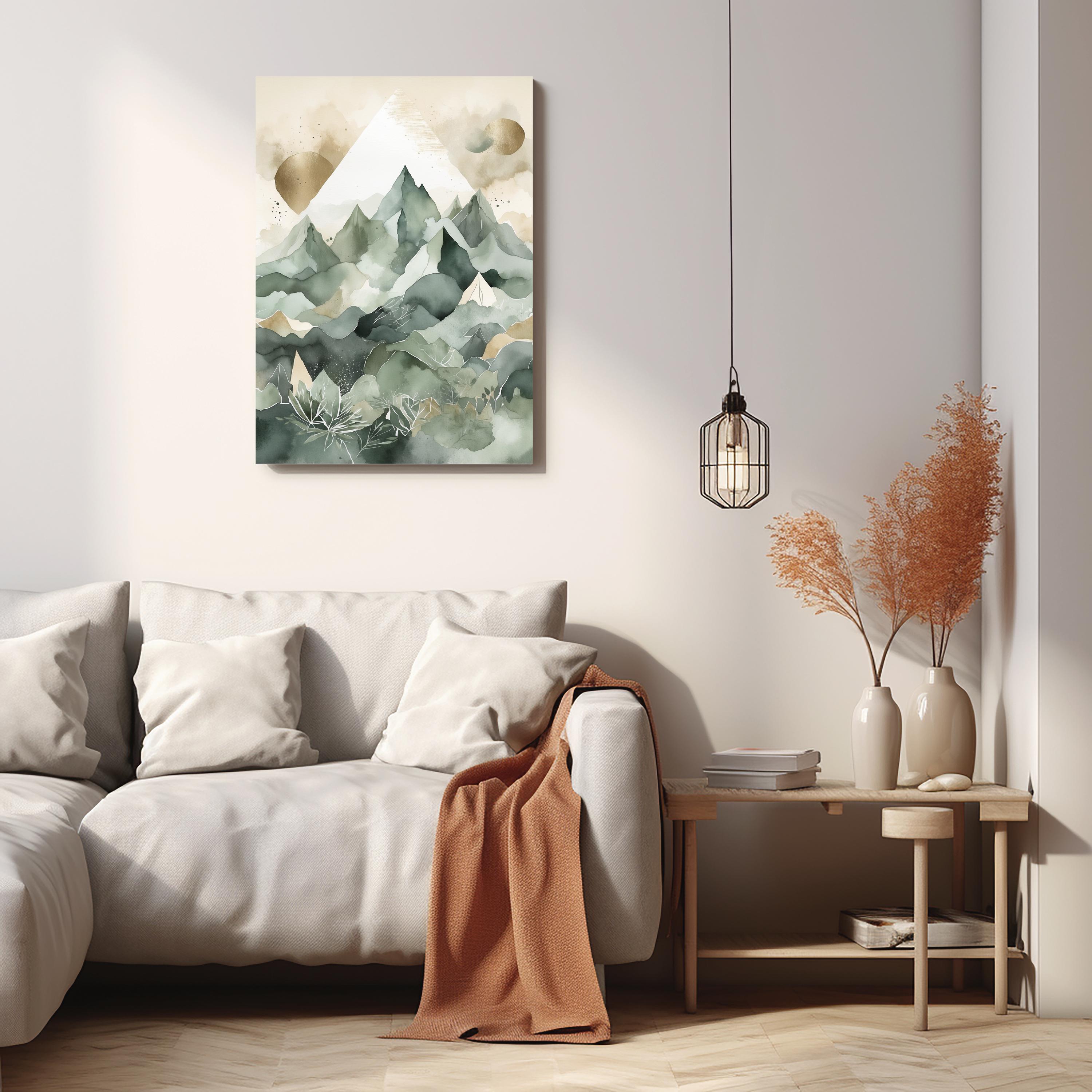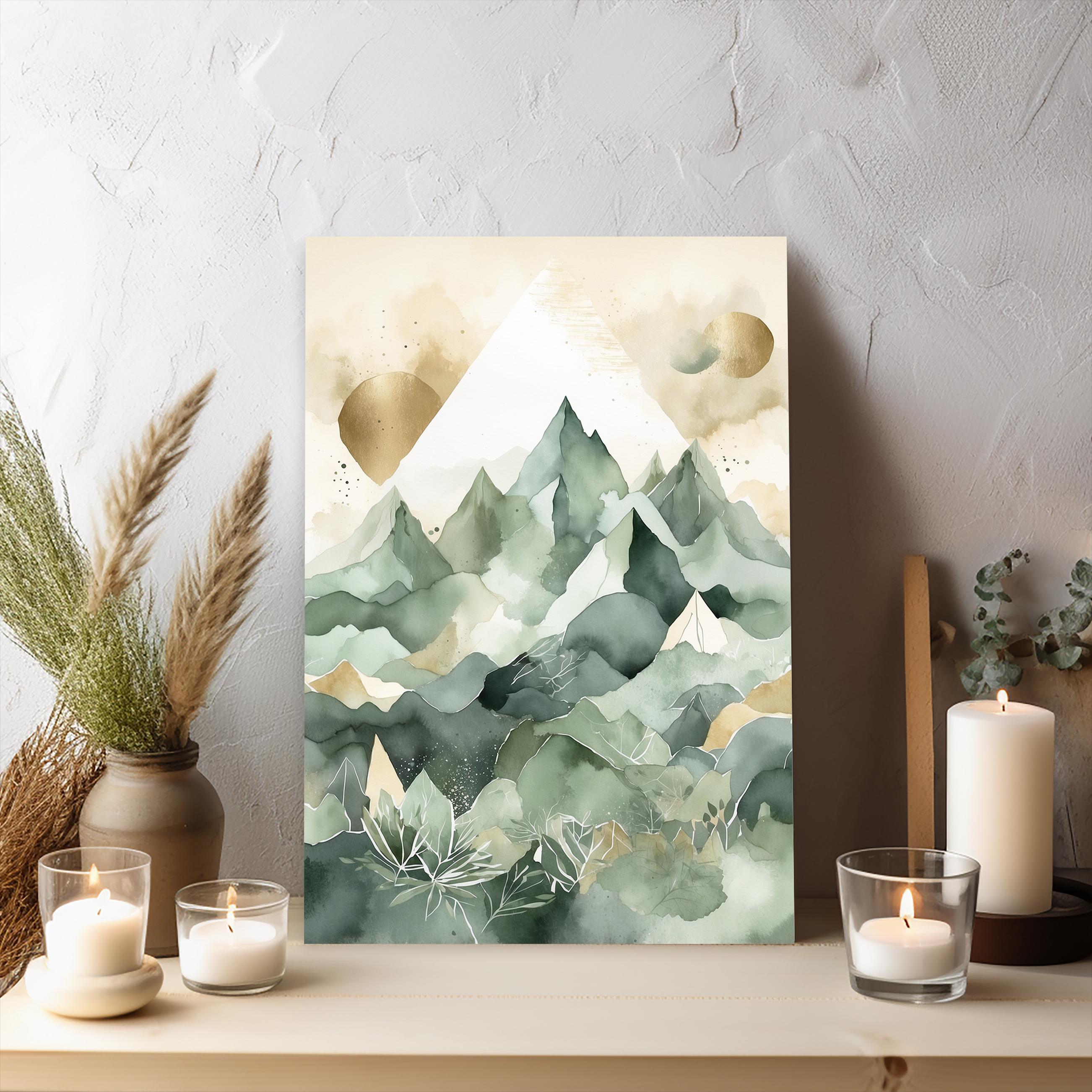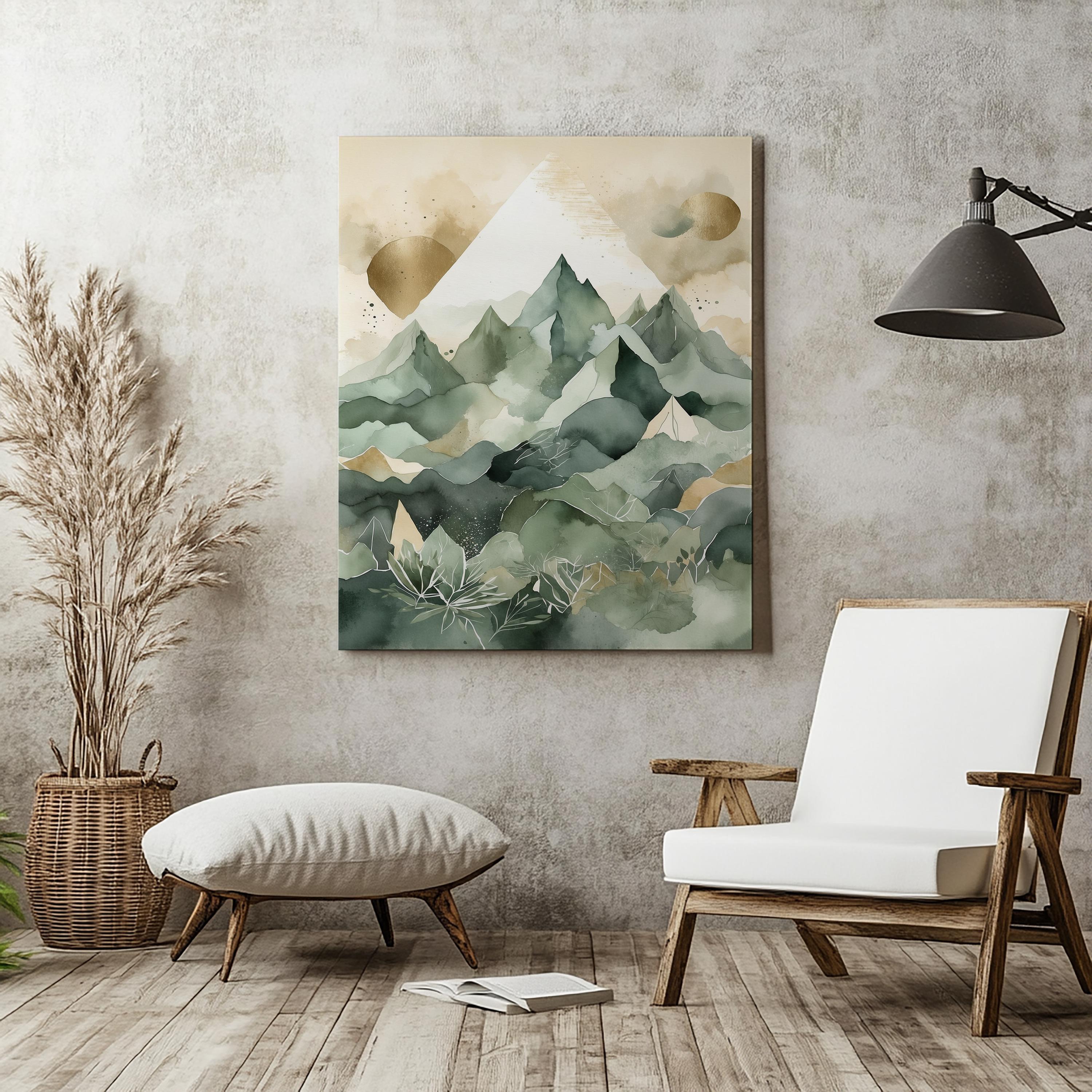 "Verdant Peaks" blends the strength of structure with the softness of nature. This abstract geometric mountain composition features delicate leaf overlays and gentle watercolor washes in soothing neutral and sage green tones. The result is a balanced harmony of modern design and organic beauty - serene yet visually captivating.