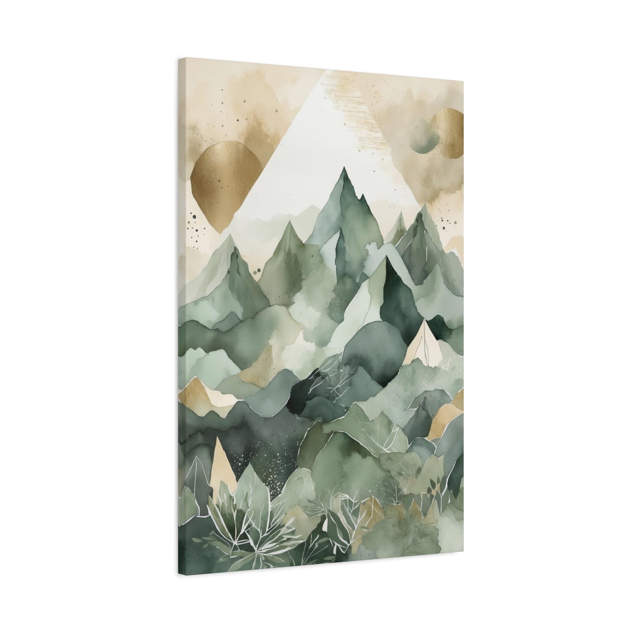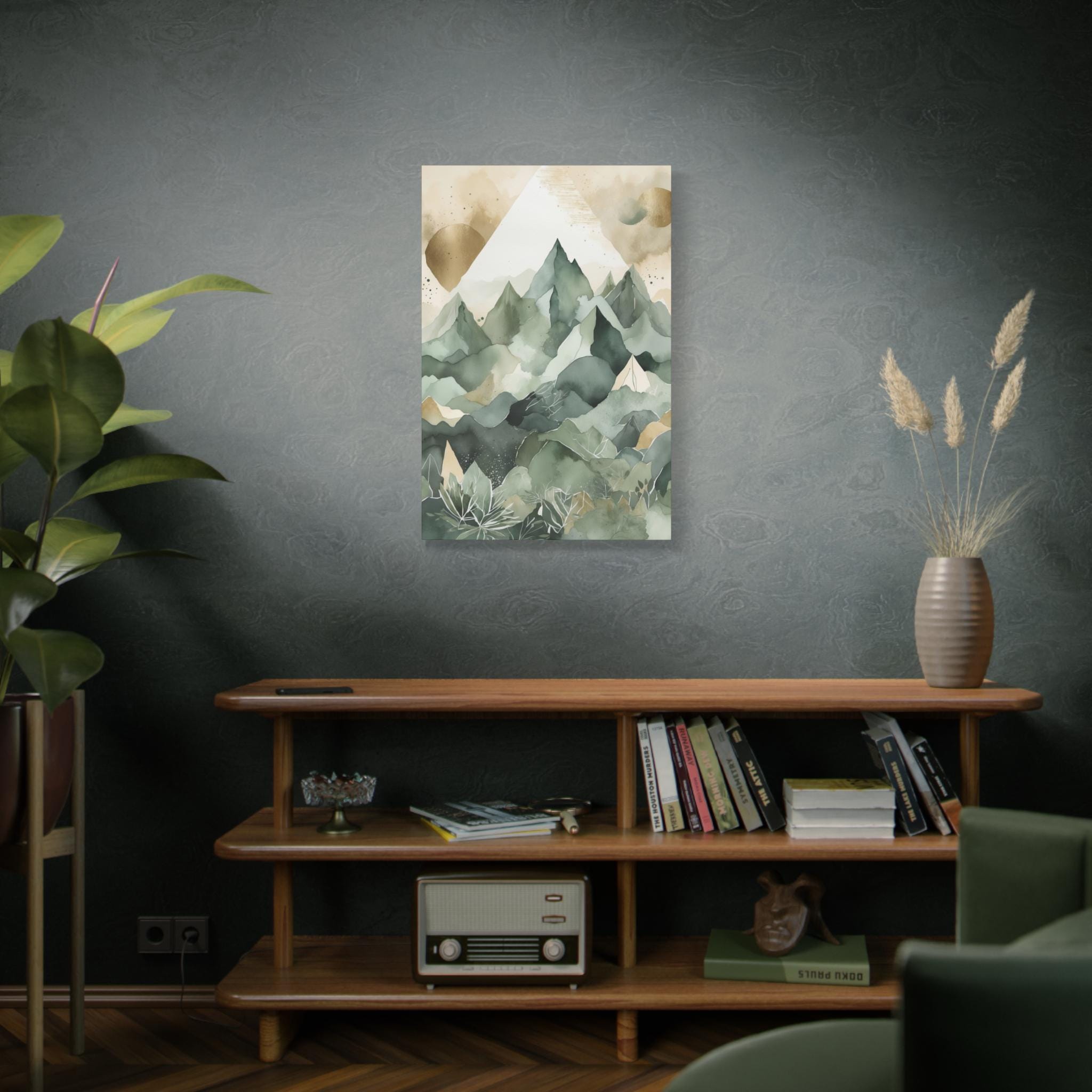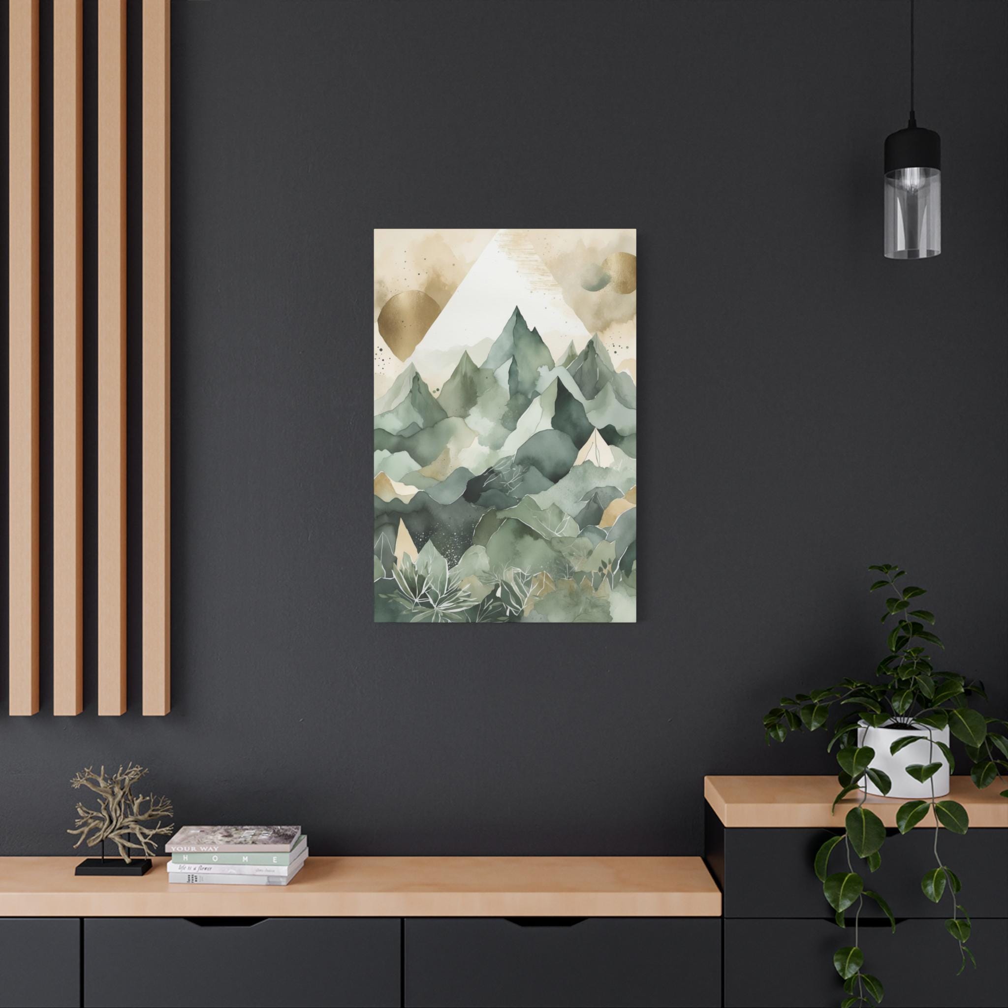 "Verdant Peaks" blends the strength of structure with the softness of nature. This abstract geometric mountain composition features delicate leaf overlays and gentle watercolor washes in soothing neutral and sage green tones. The result is a balanced harmony of modern design and organic beauty - serene yet visually captivating.